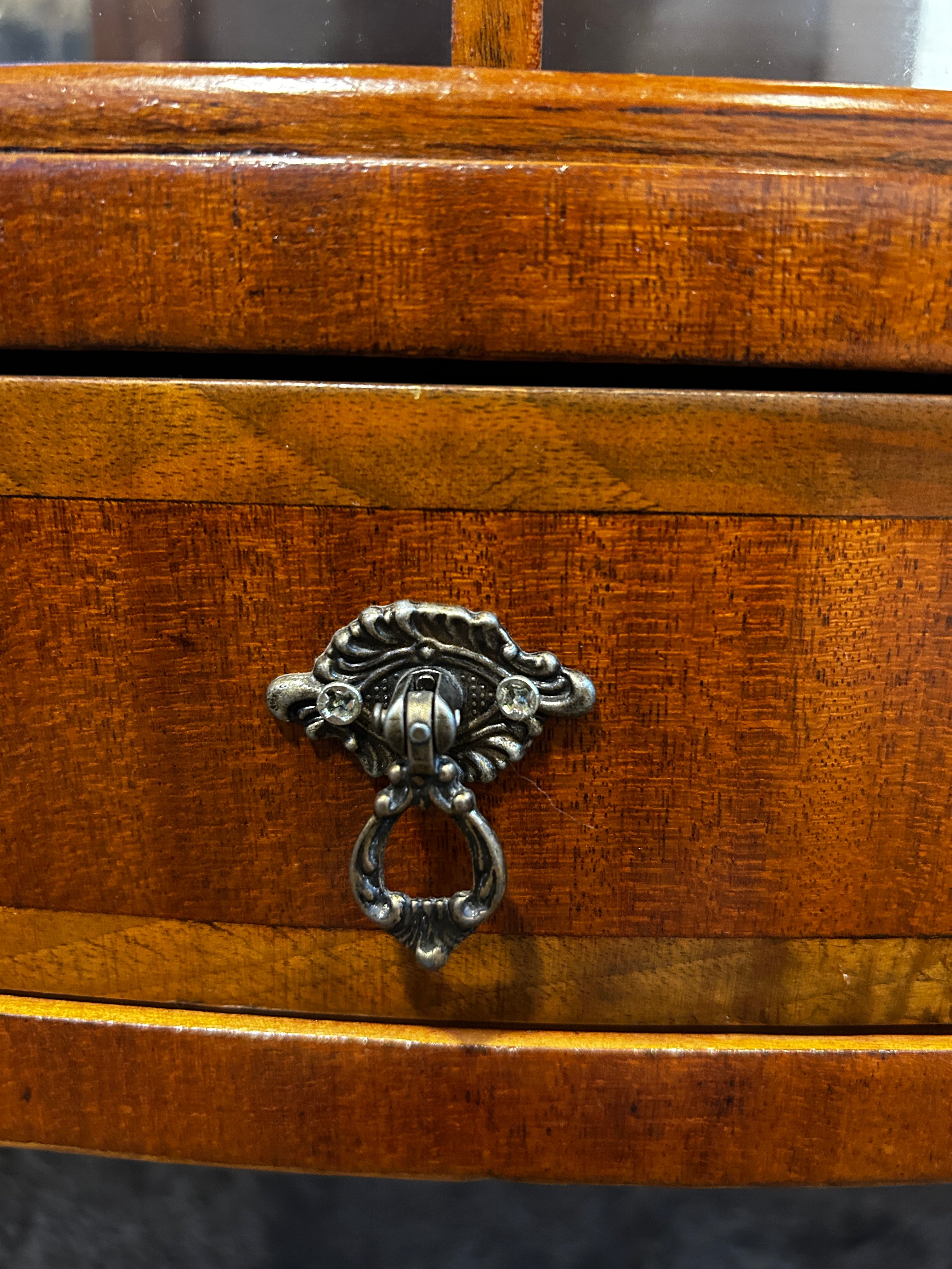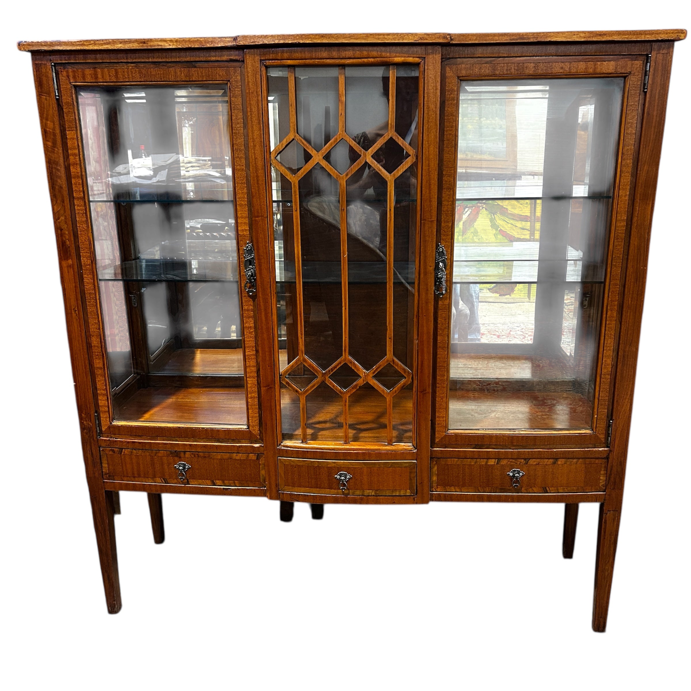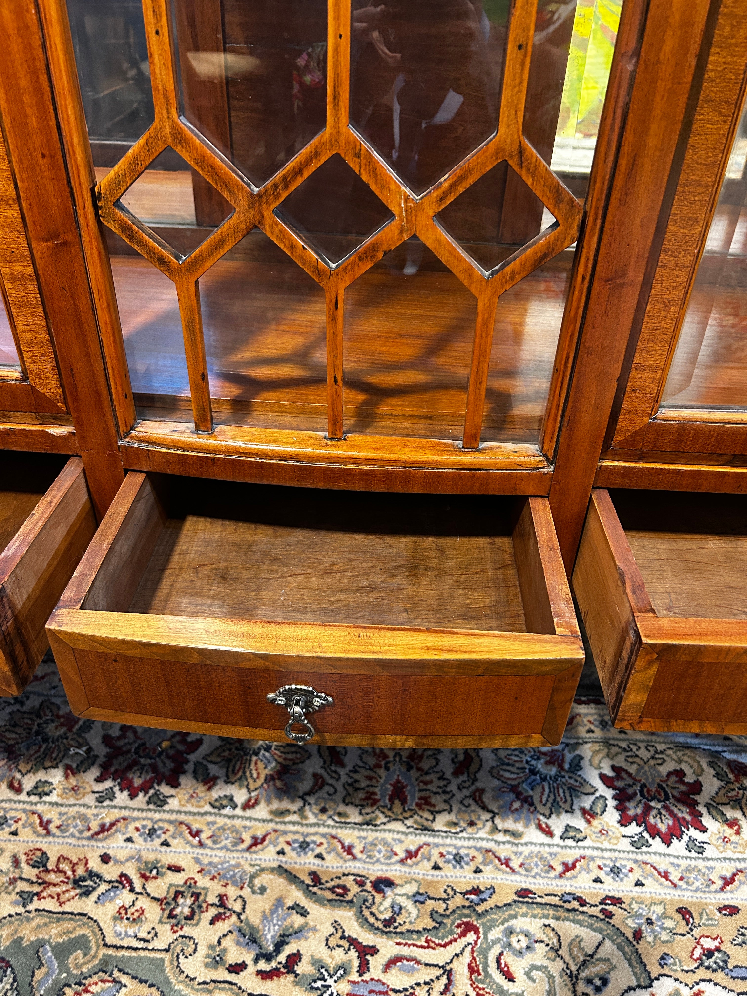 Exclusiva vitrina cristalera baja, chilena, estilo inglés, de los años cincuenta, de madera de lingue. Tiene unas hermosas puertas frontales de vidrio biselado, con preciosa palillería estilo edwardian, tres cajoneras frontales en perfectas condiciones. En su interior cuenta con dos repisas de vidrio y espejo también biselados.