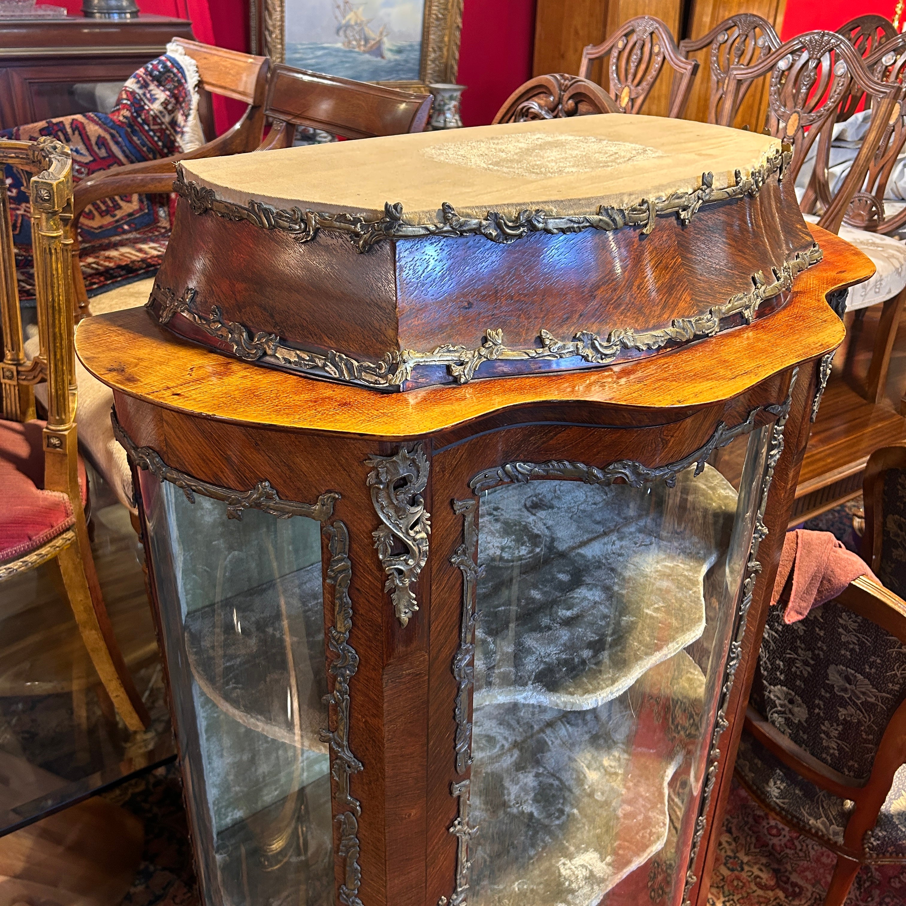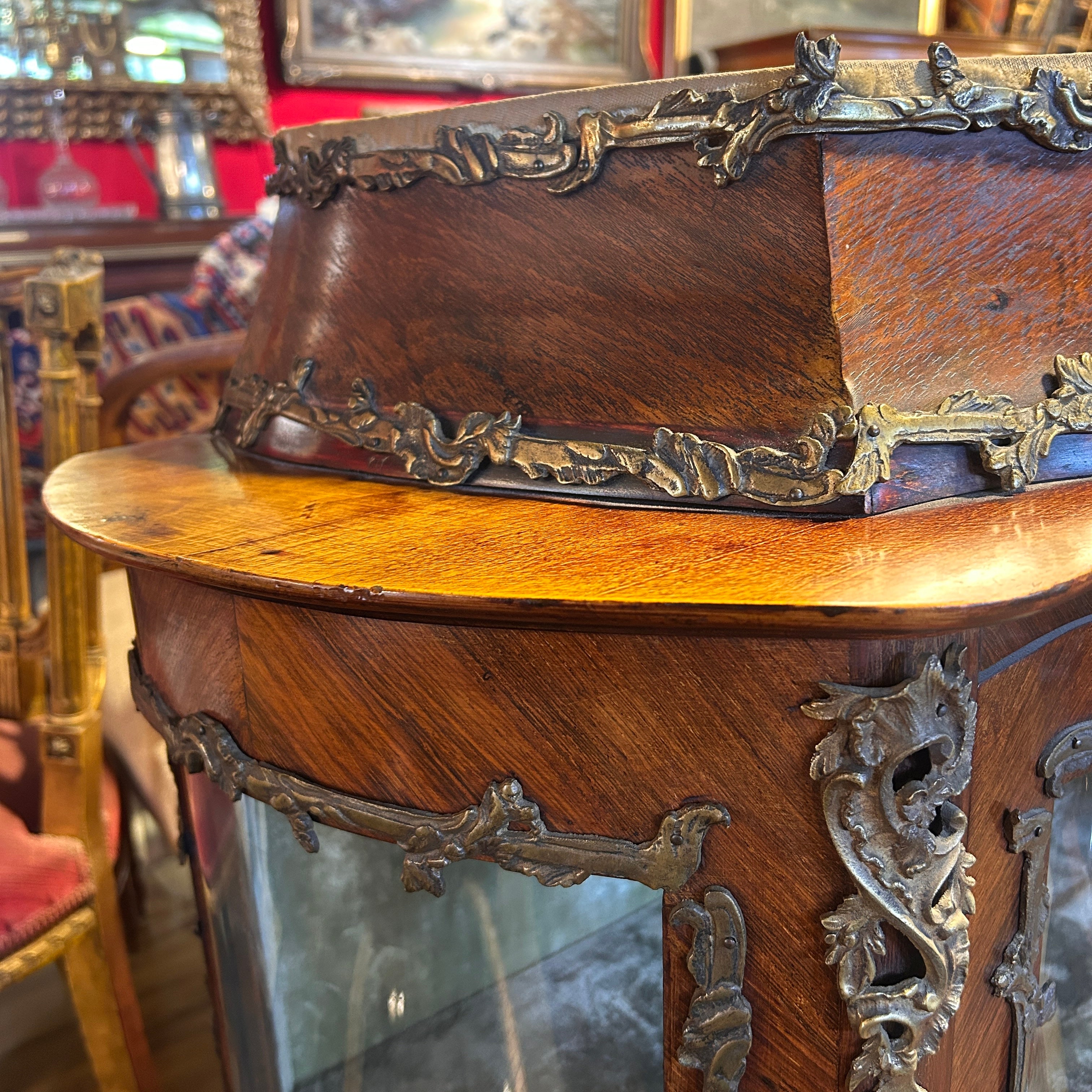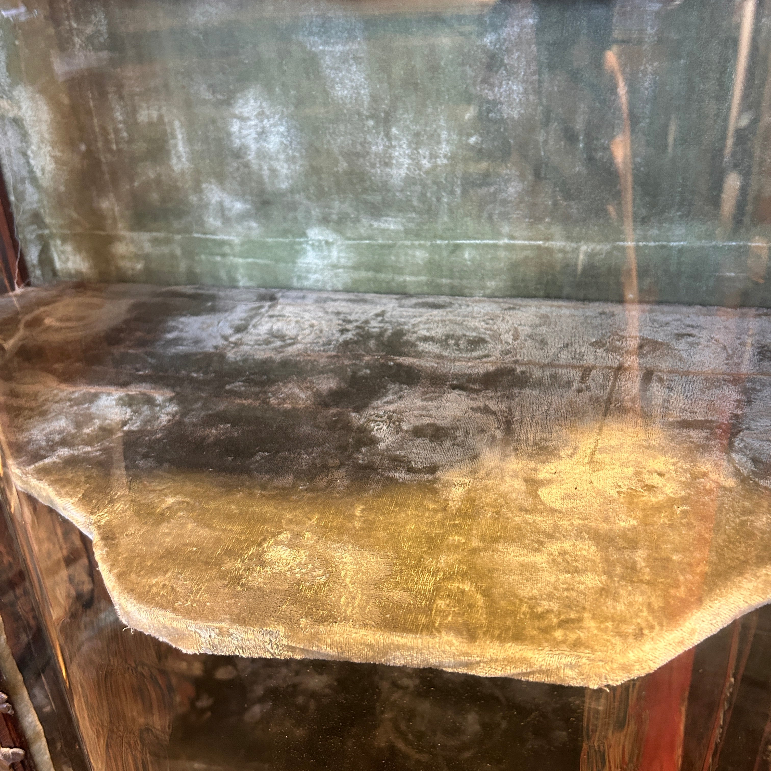Pine wood display cabinet with flowers, glass top and Italian tableware; Napoleon III style; 166×83×40 cm.