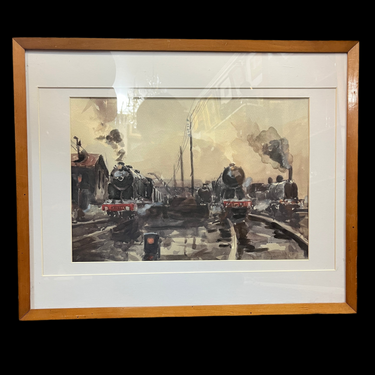 Acuarela sobre papel del artista chileno Ricardo Anwandter. representando unas locomotoras en movimiento, resaltando rojos en un entorno en tonos grises. La obra está enmarcada en madera delgada y vidrio.