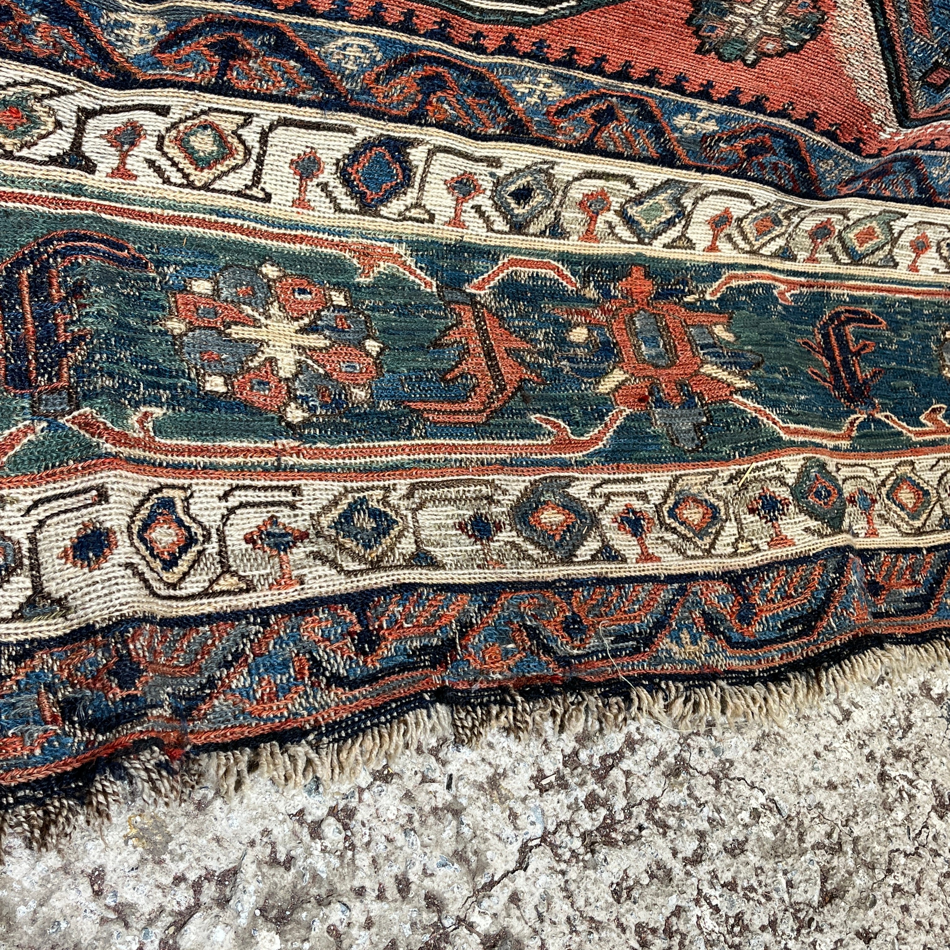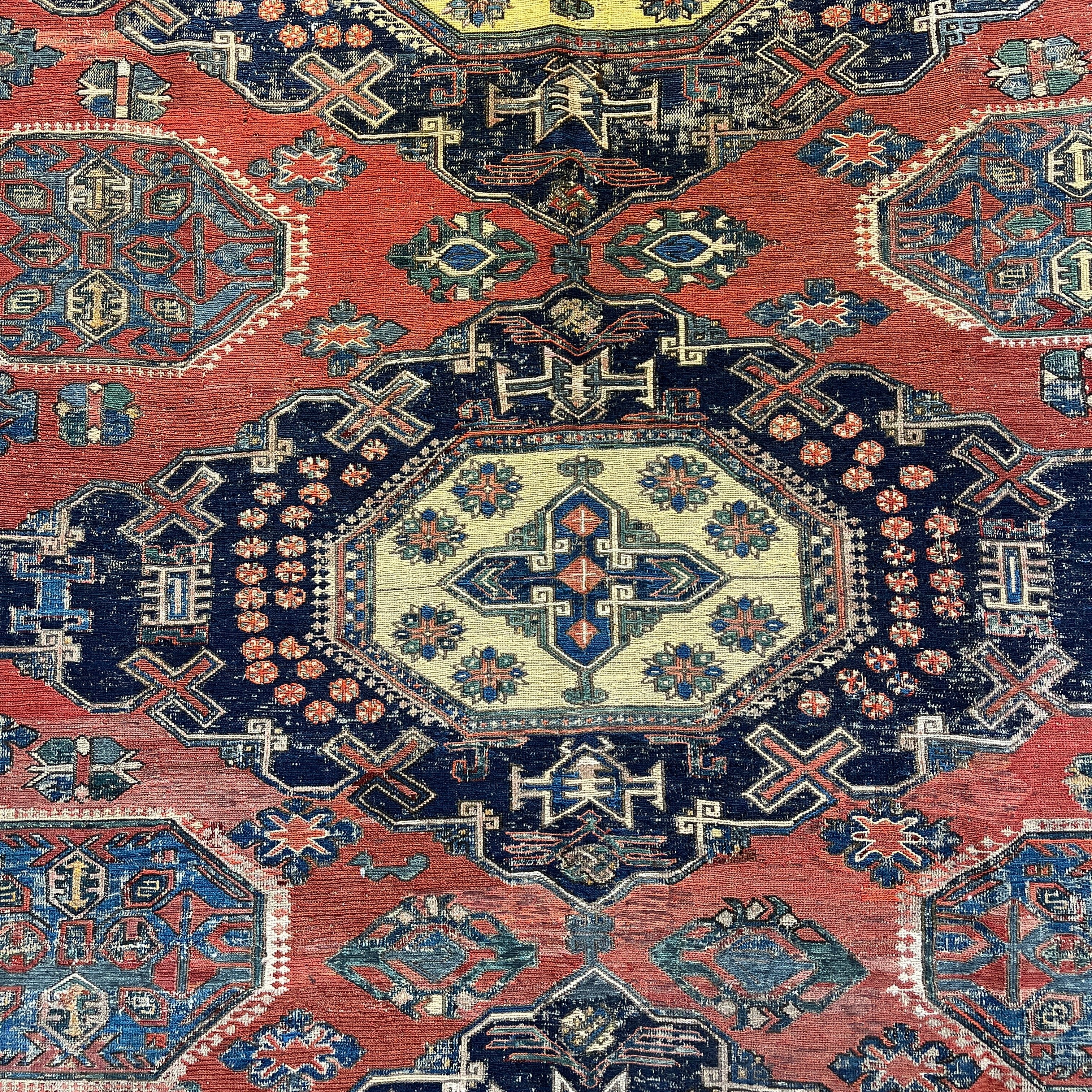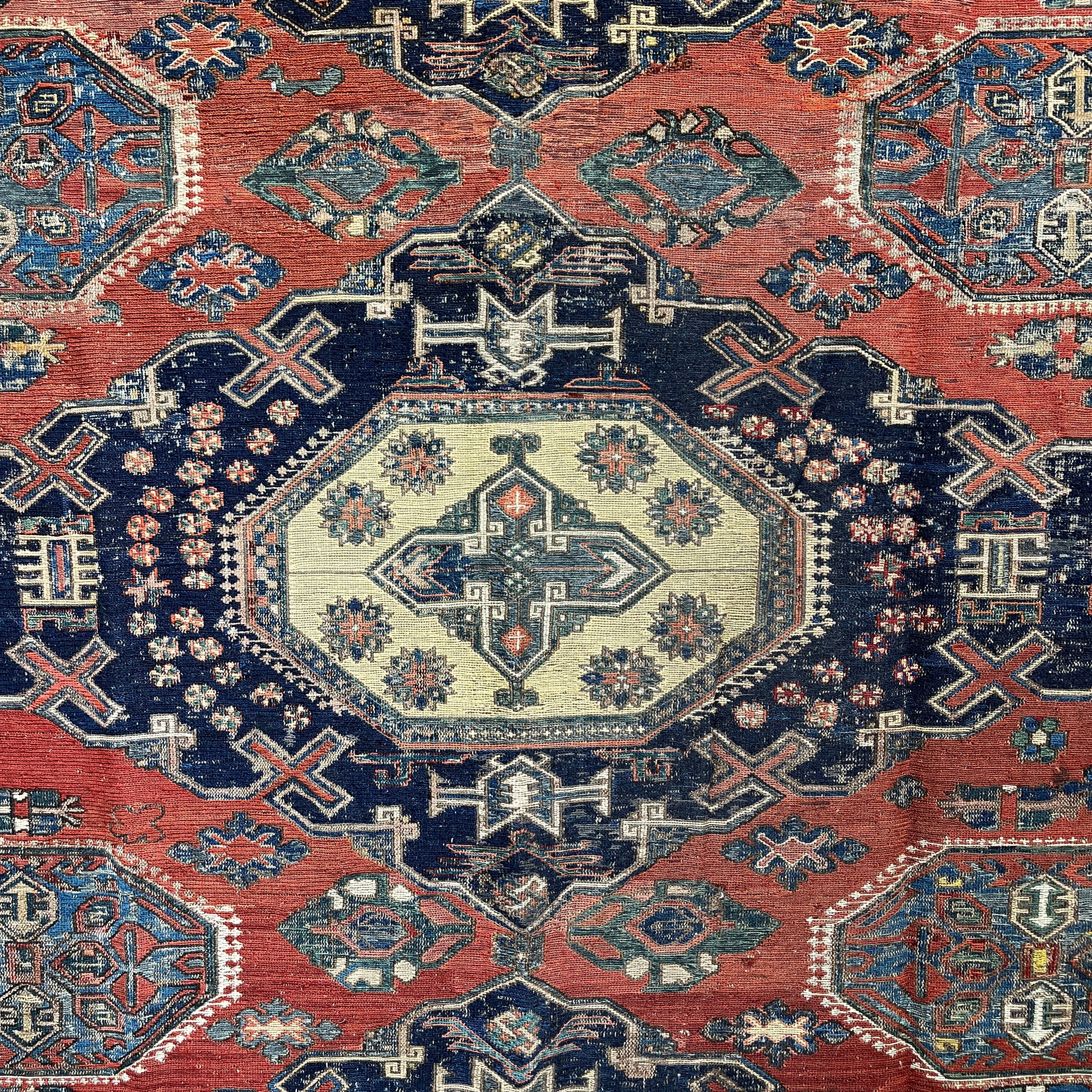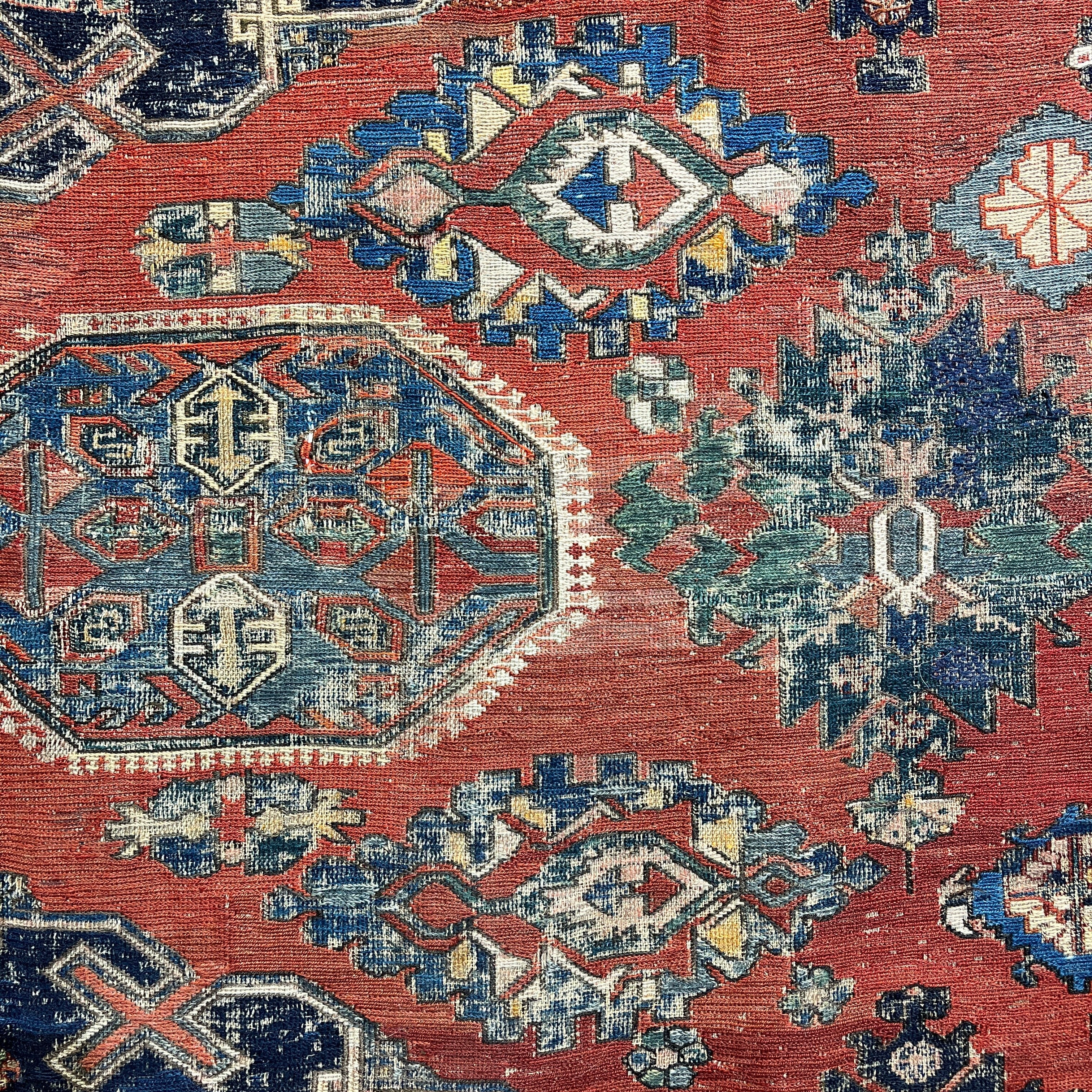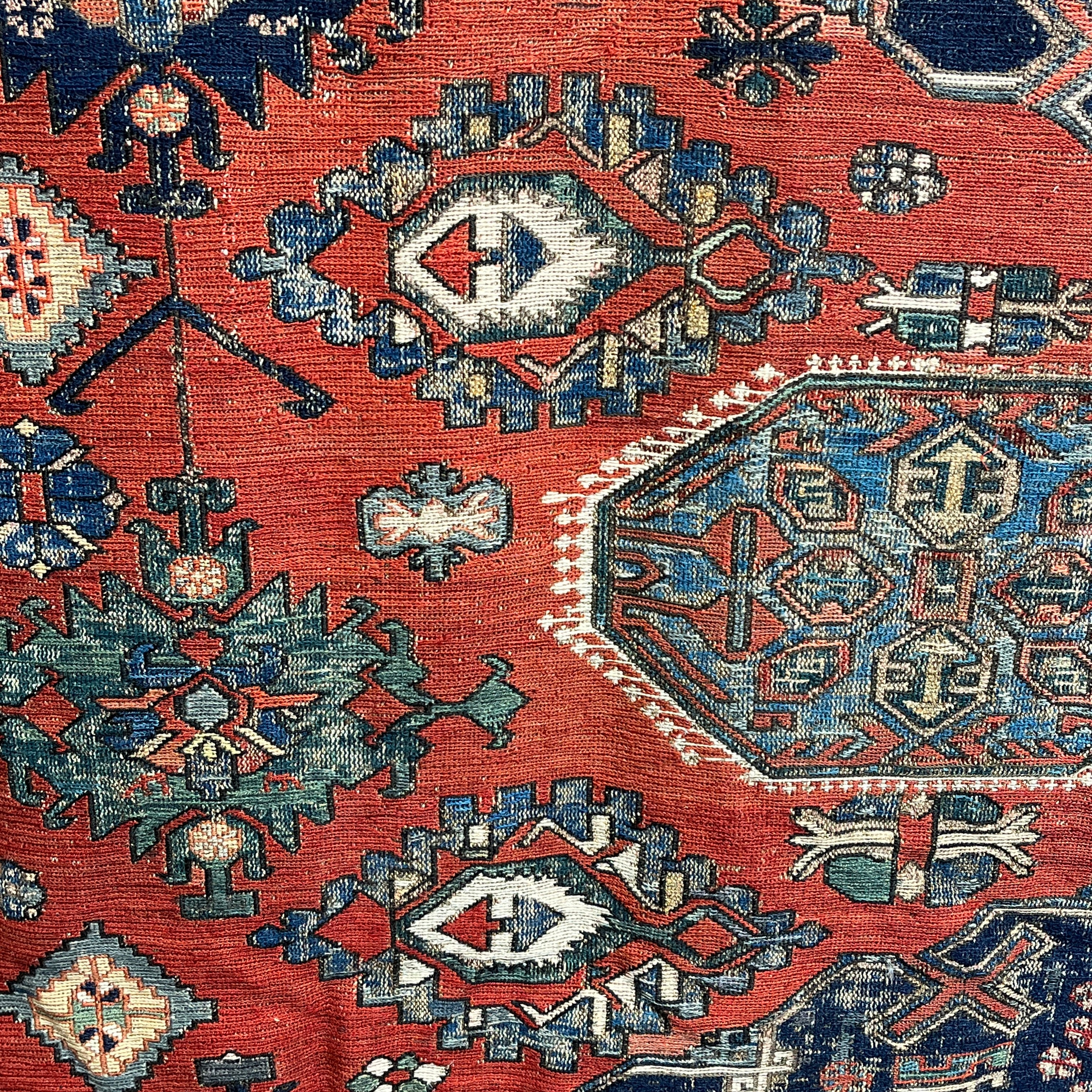 Antiquísima alfombra Kelim Sumak Kasak, hecha de lana tejida y teñida a mano con tintes de origen vegetal. Creadas originalmente por aldeanos en el oeste de Azerbaiyán, al norte de Armenia y al sur de Georgia, las alfombras Kazak surgieron a principios del siglo XVIII. Los mejores ejemplares de sumak también provienen del Cáucaso, el noroeste de Irán y Asia Central. Su diseño se distingue por su combinación de motivos geométricos, con cuatro medallones en forma de diamantes, octágonos con decorados abstractos, rosetas y rombos. La alfombra está teñida con detalles en azul, verde y amarillos pálidos, sobre un fondo rojo. Sus cenefas tienen patrones geométricos, principalmente en azul e índigo.
