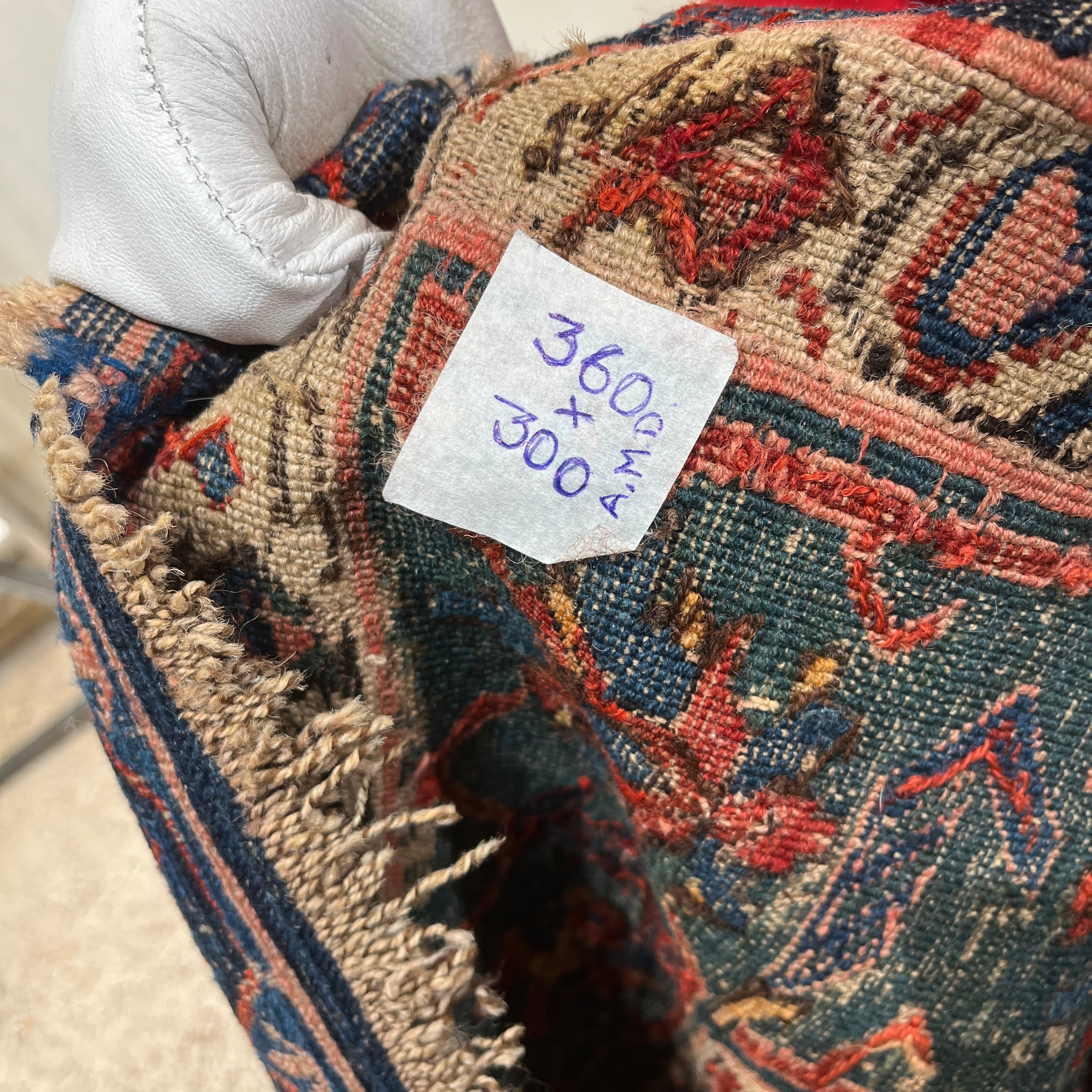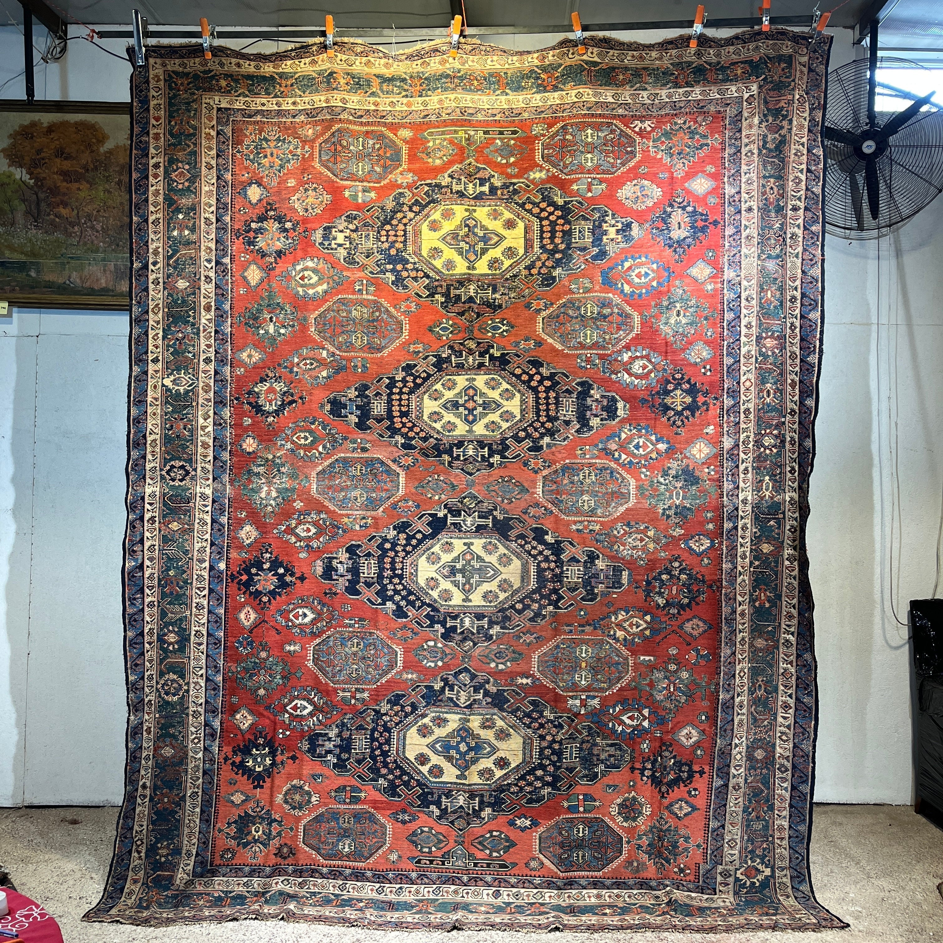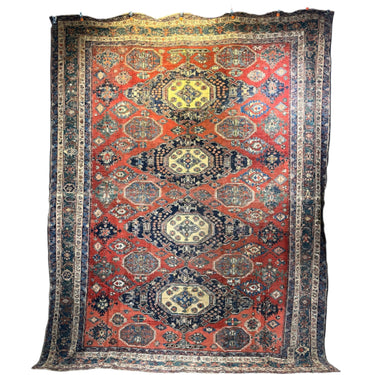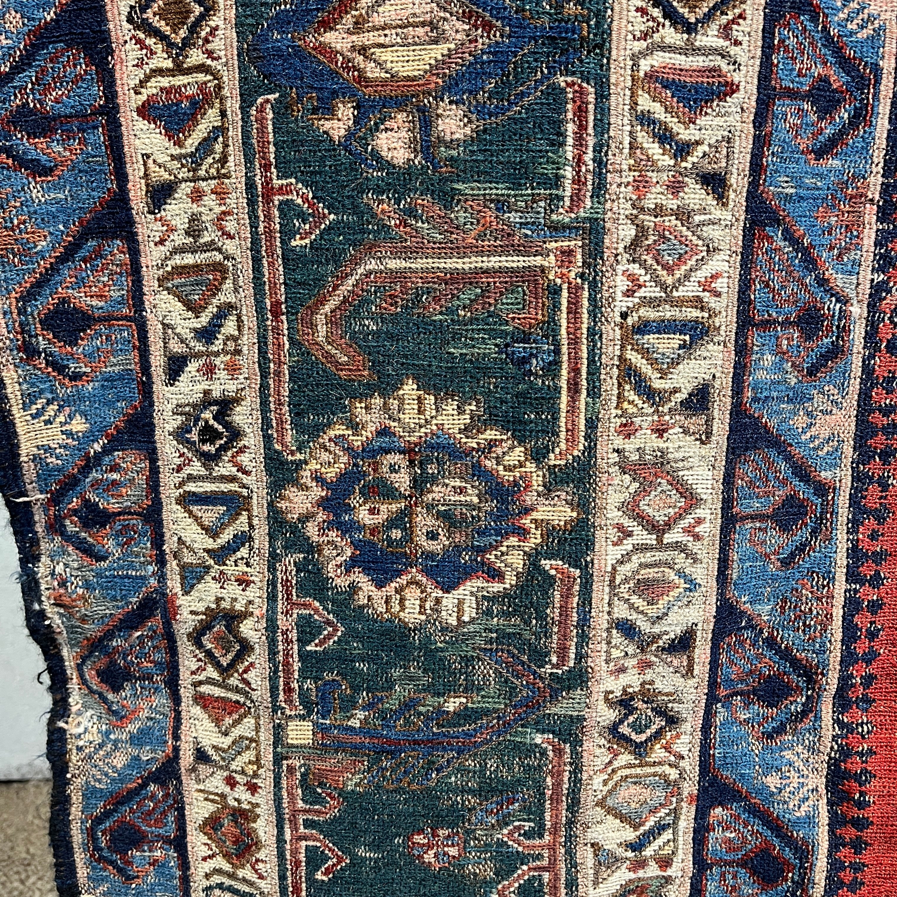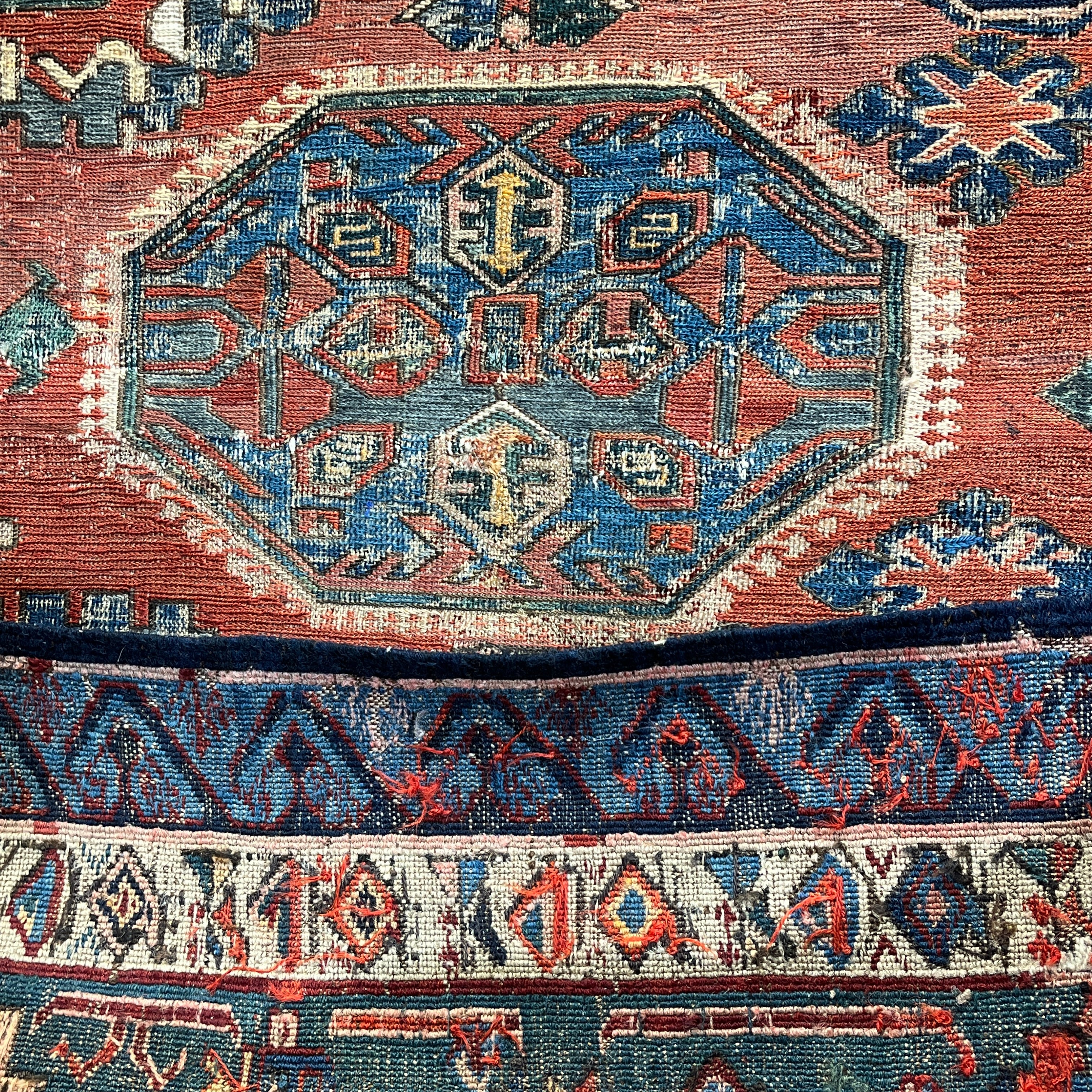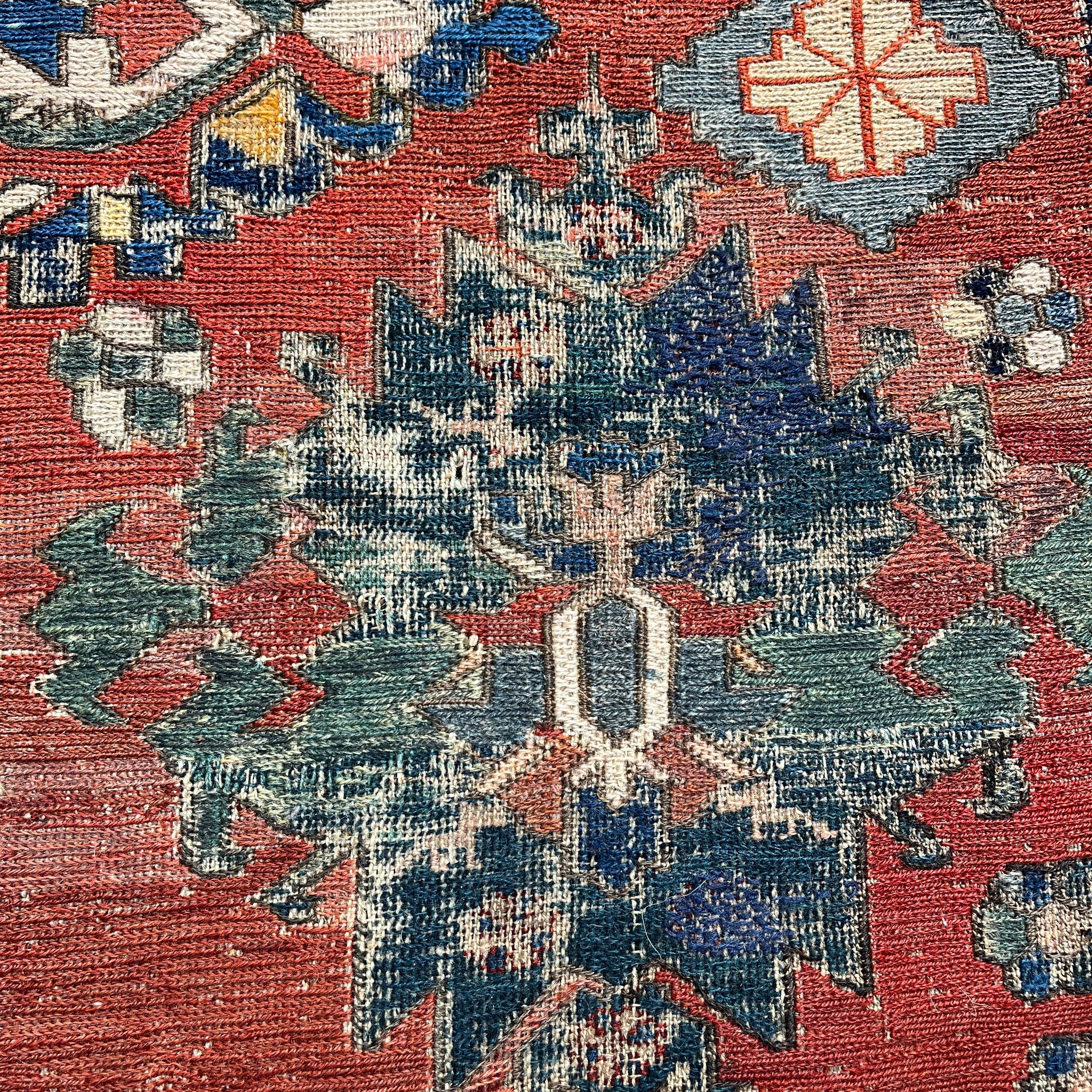 Antiquísima alfombra Kelim Sumak Kasak, hecha de lana tejida y teñida a mano con tintes de origen vegetal. Creadas originalmente por aldeanos en el oeste de Azerbaiyán, al norte de Armenia y al sur de Georgia, las alfombras Kazak surgieron a principios del siglo XVIII. Los mejores ejemplares de sumak también provienen del Cáucaso, el noroeste de Irán y Asia Central. Su diseño se distingue por su combinación de motivos geométricos, con cuatro medallones en forma de diamantes, octágonos con decorados abstractos, rosetas y rombos. La alfombra está teñida con detalles en azul, verde y amarillos pálidos, sobre un fondo rojo. Sus cenefas tienen patrones geométricos, principalmente en azul e índigo.