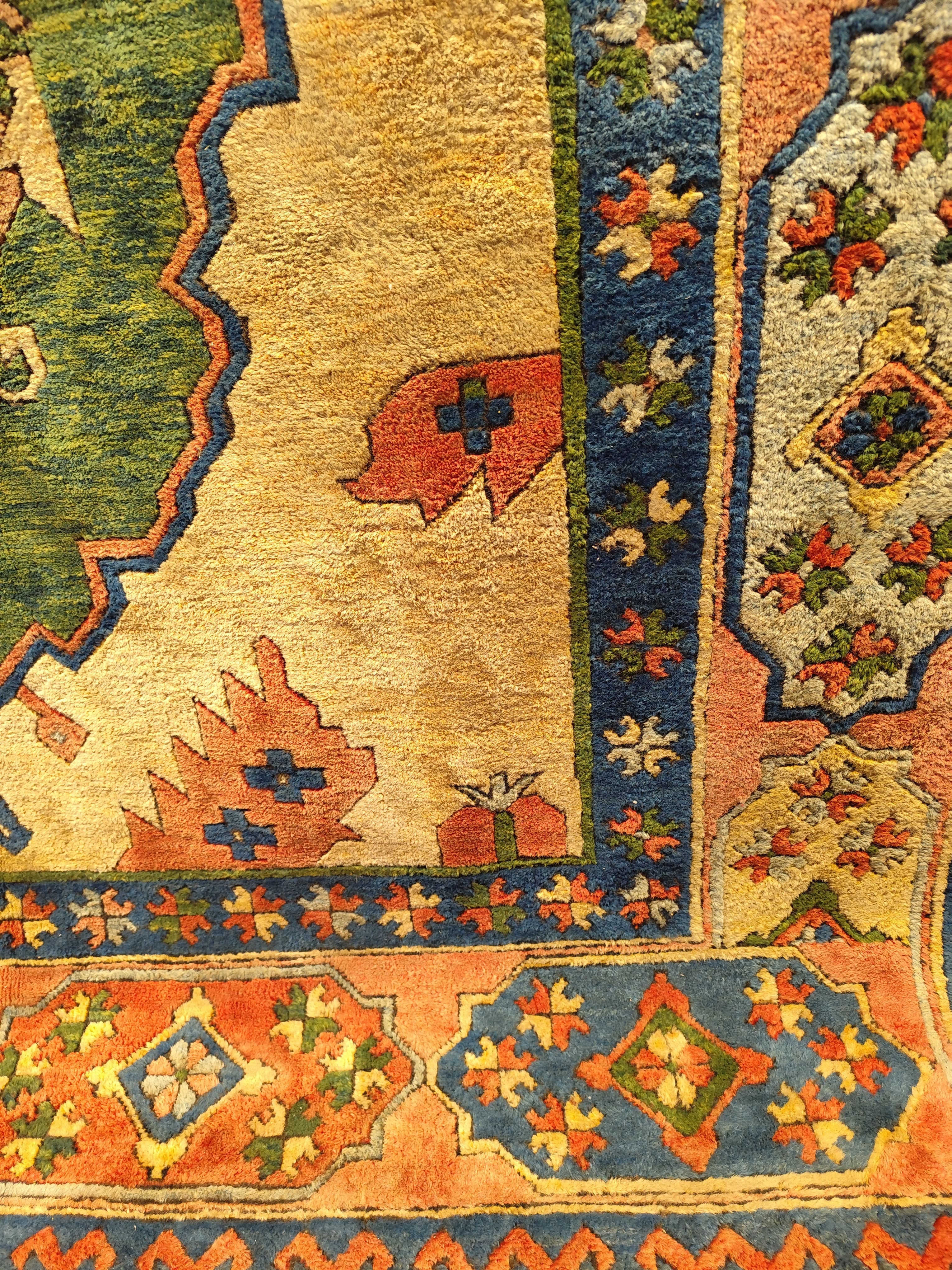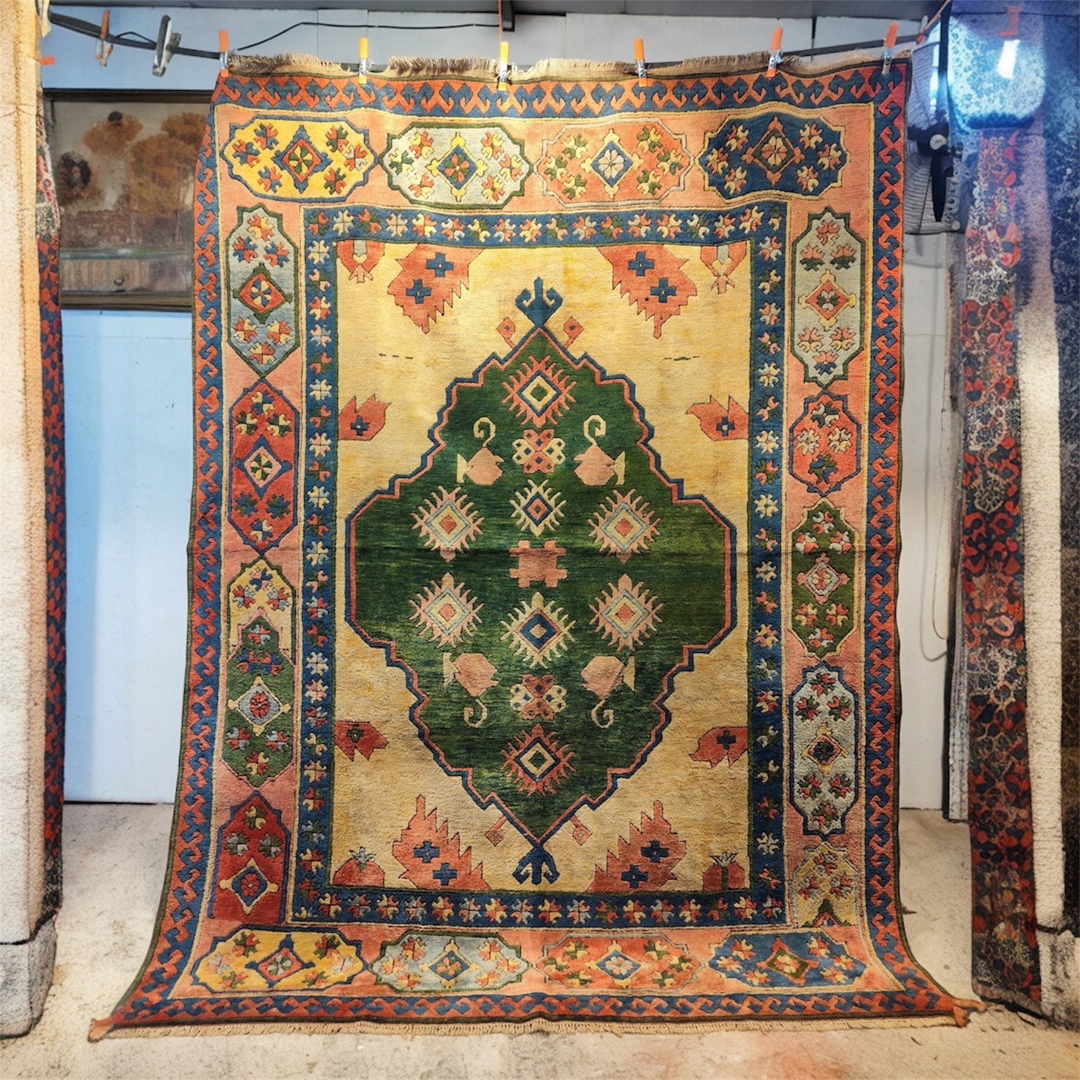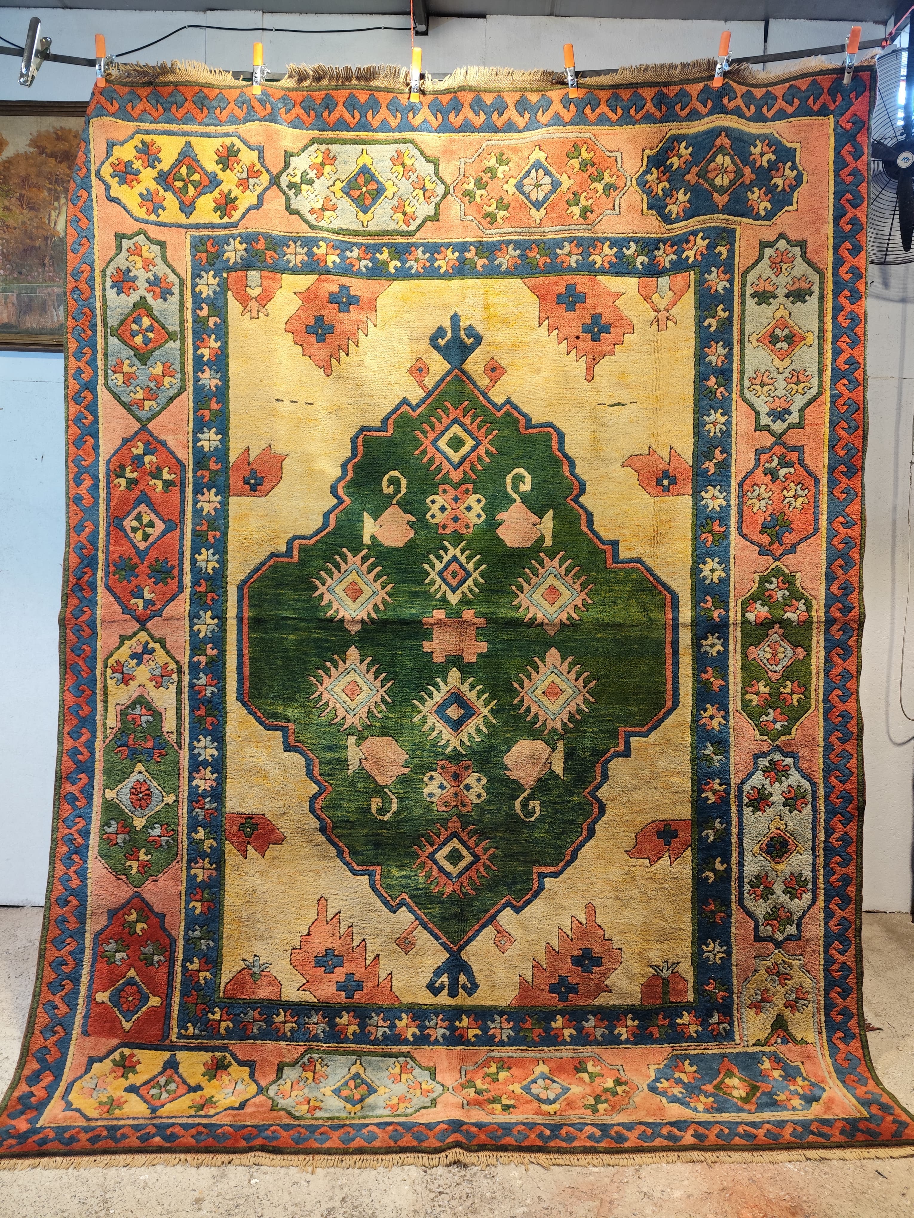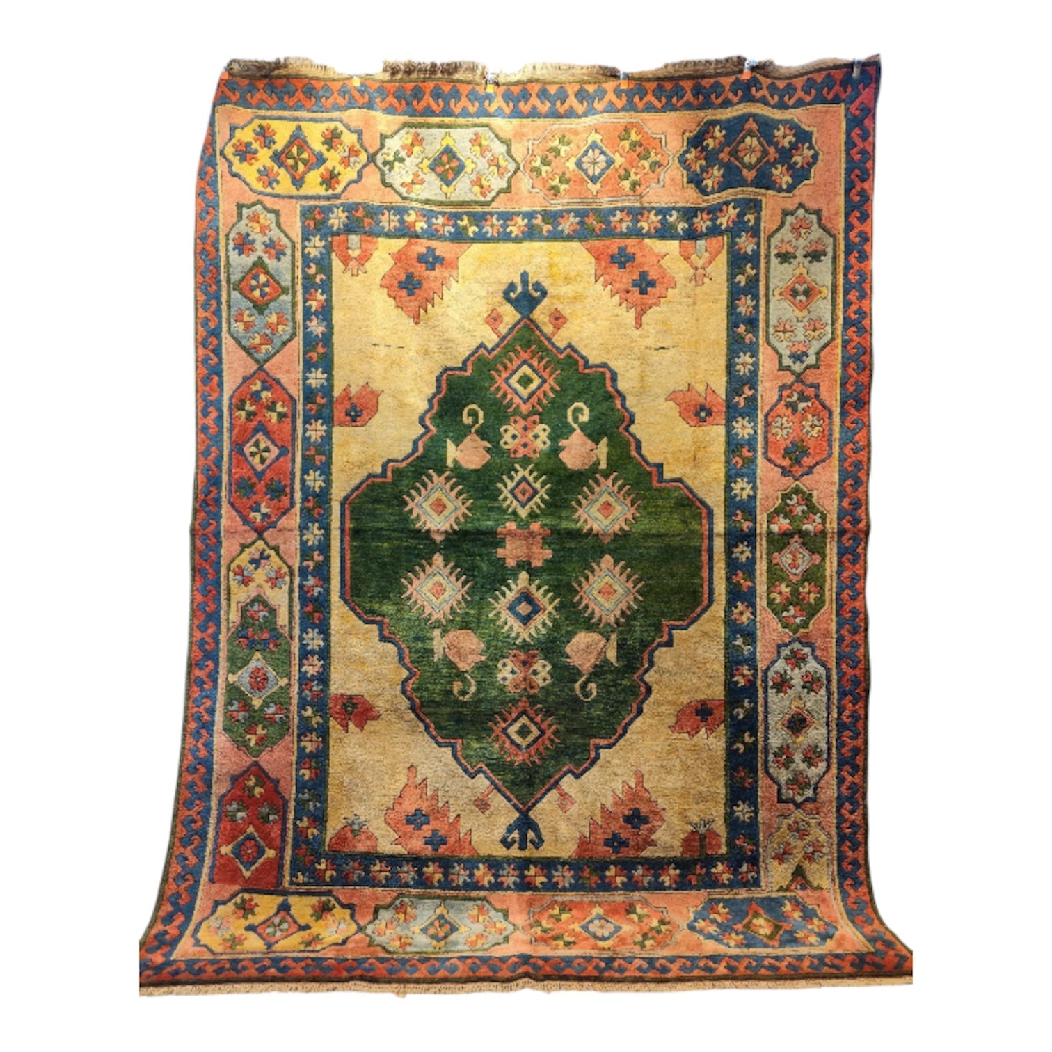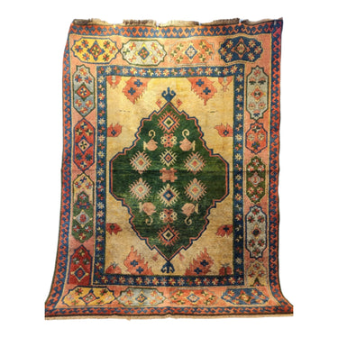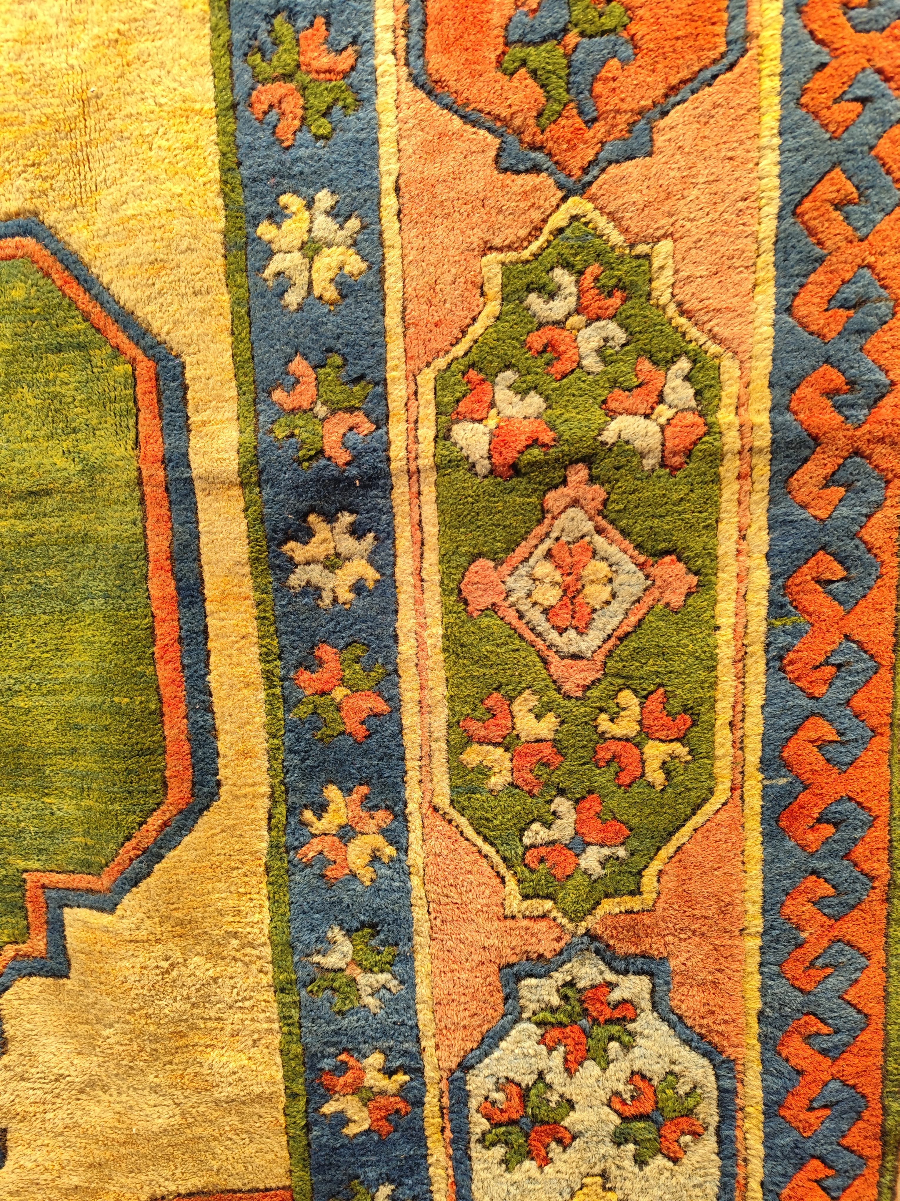 Maravillosa alfombra de origen turco, hecha de lana tejida a mano, con un precioso diseño de medallón central en verde con dibujos geométricos, rodeado de una zona amarilla y franjas exteriores, también con motivos geométricos en naranjo, azul, verde y celeste.