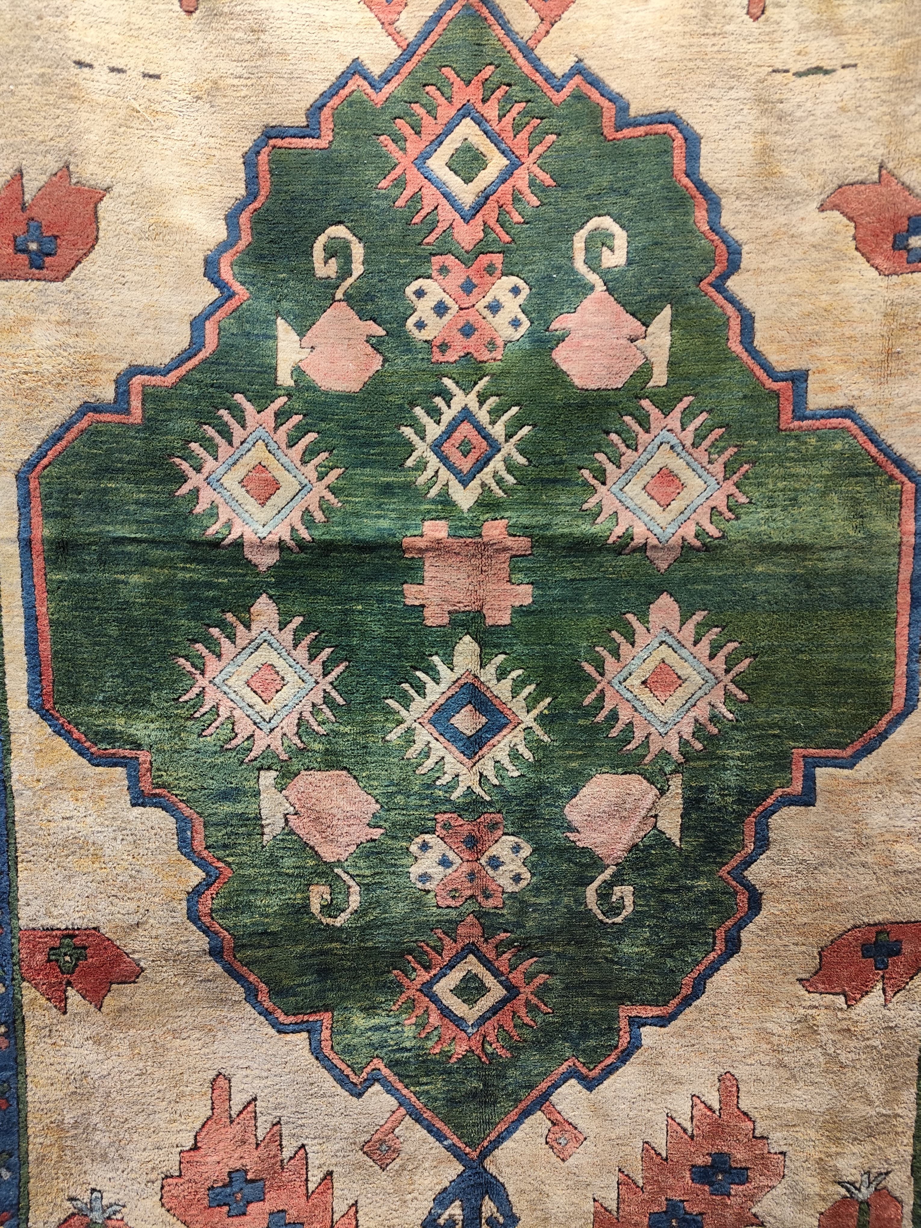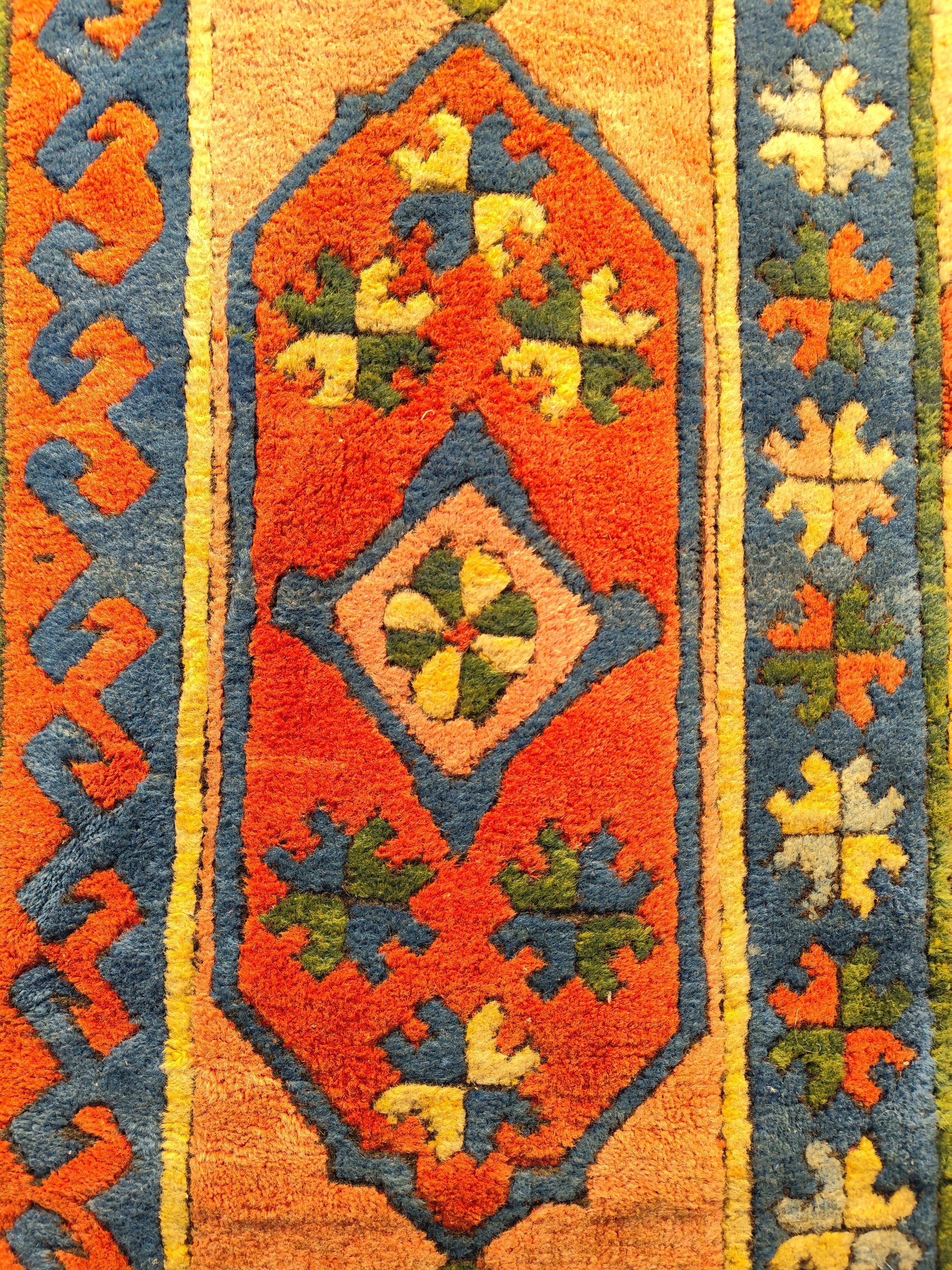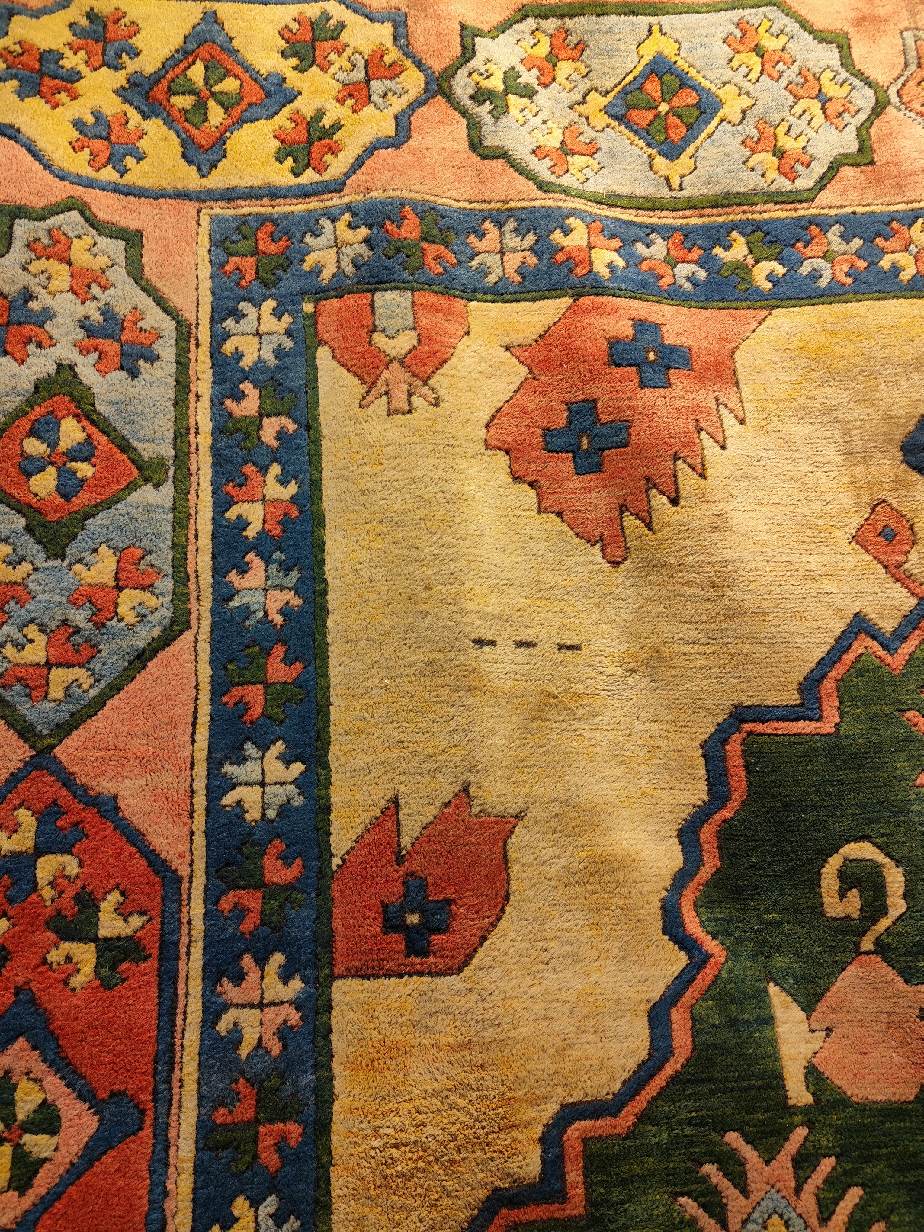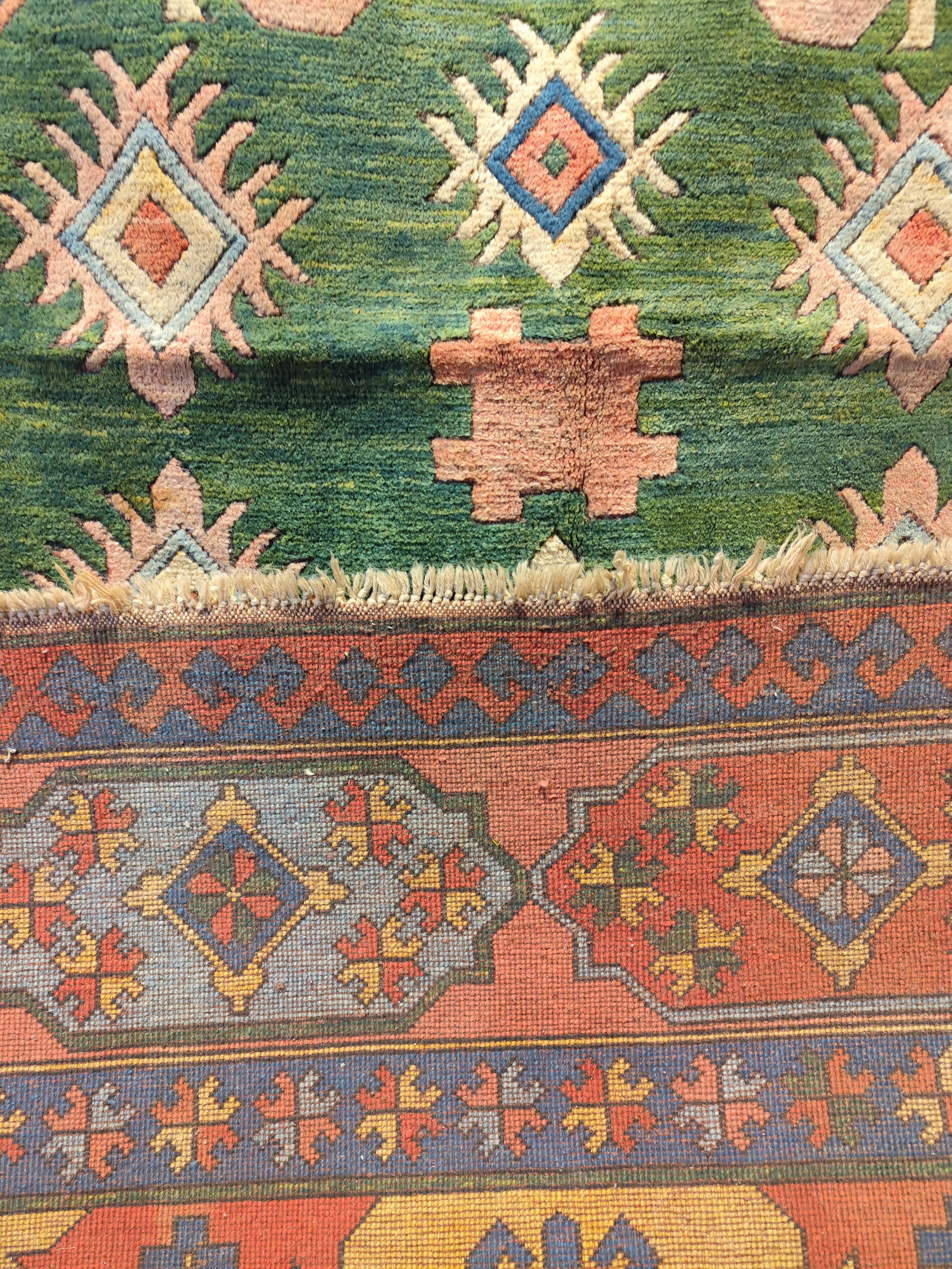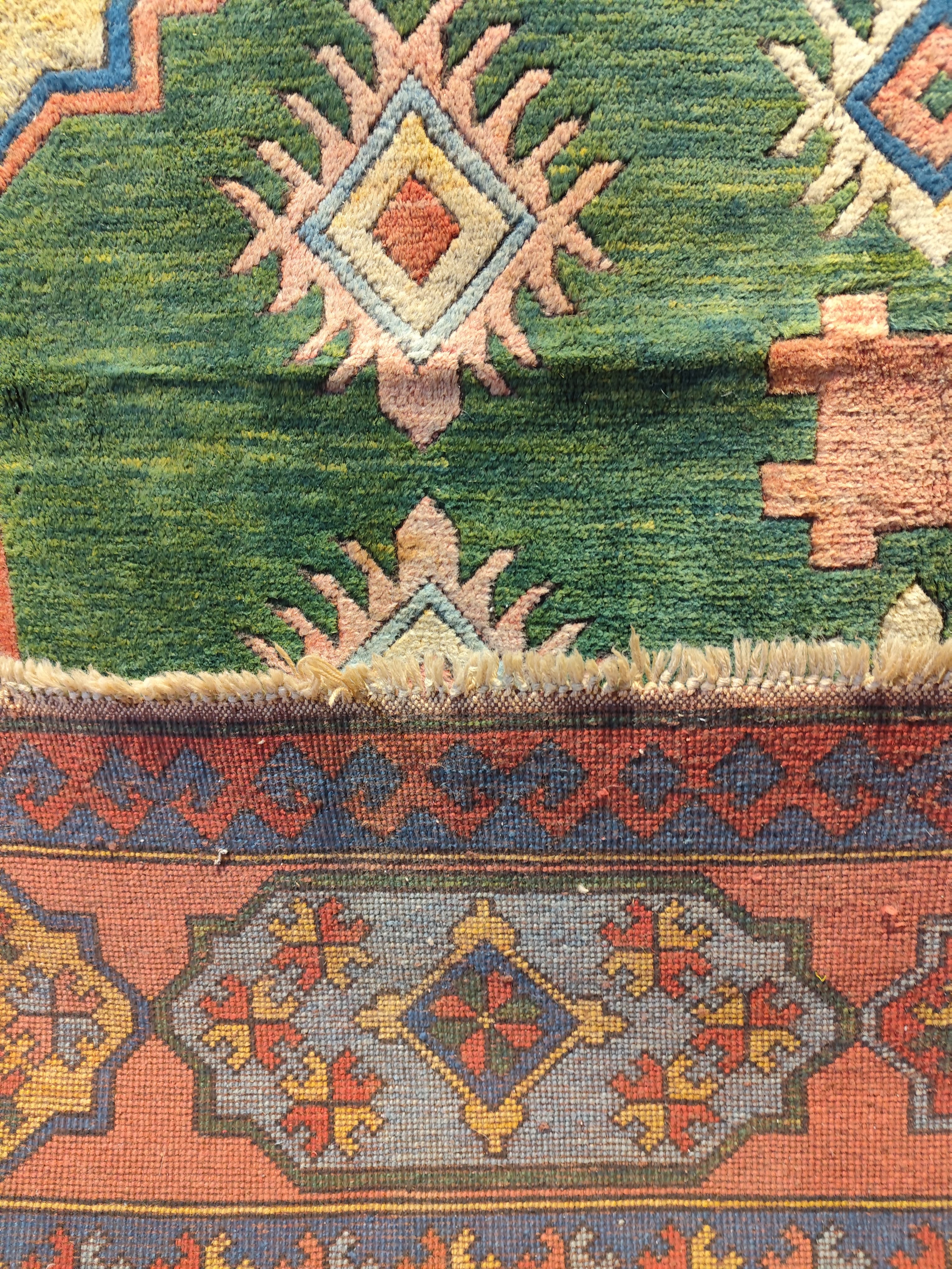 Maravillosa alfombra de origen turco, hecha de lana tejida a mano, con un precioso diseño de medallón central en verde con dibujos geométricos, rodeado de una zona amarilla y franjas exteriores, también con motivos geométricos en naranjo, azul, verde y celeste.