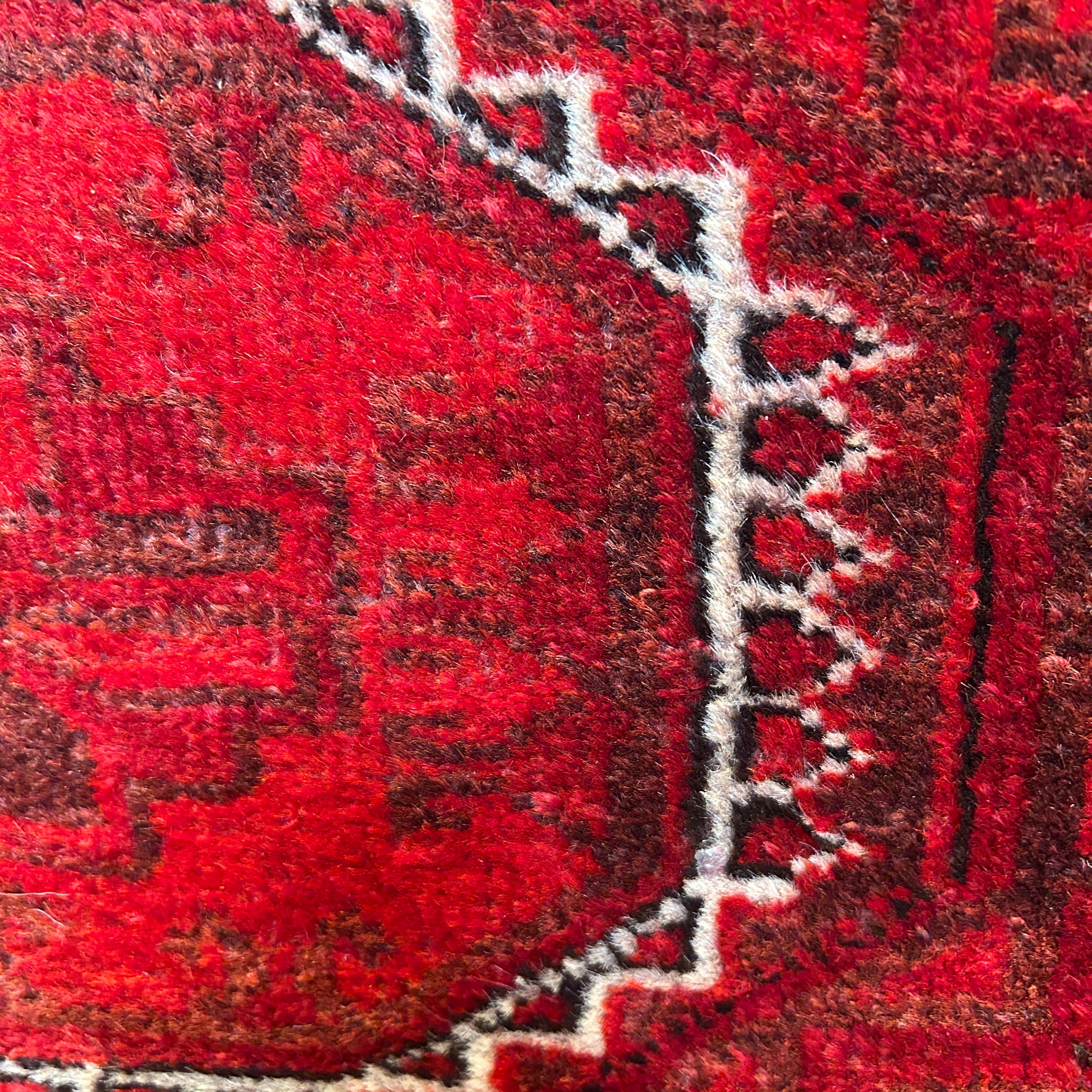 Bellísima alfombra de origen Cáucaso Ruso, tejida a mano en lana y pelo de camello, teñidos de un llamativo e intenso rojo, con detalles en blanco. La pieza tiene tres figuras circulares centrales, con un borde blanco, rodeado de diseños tejidos en negro y bordes en blanco y negro, cerrando la pieza. En sus extremos, a la vista, las fibras de pelo camello, elemento distintivo de esta alfombra.