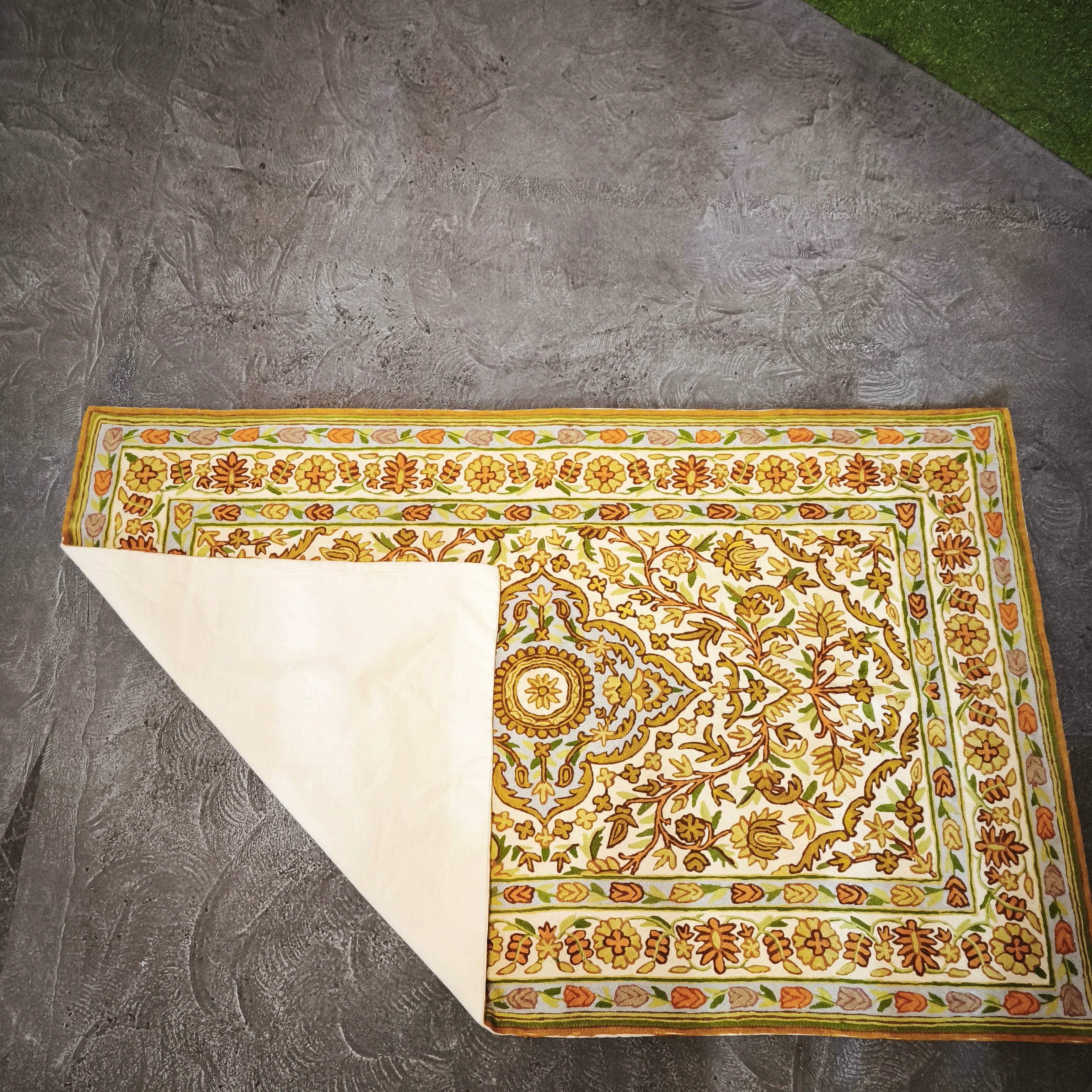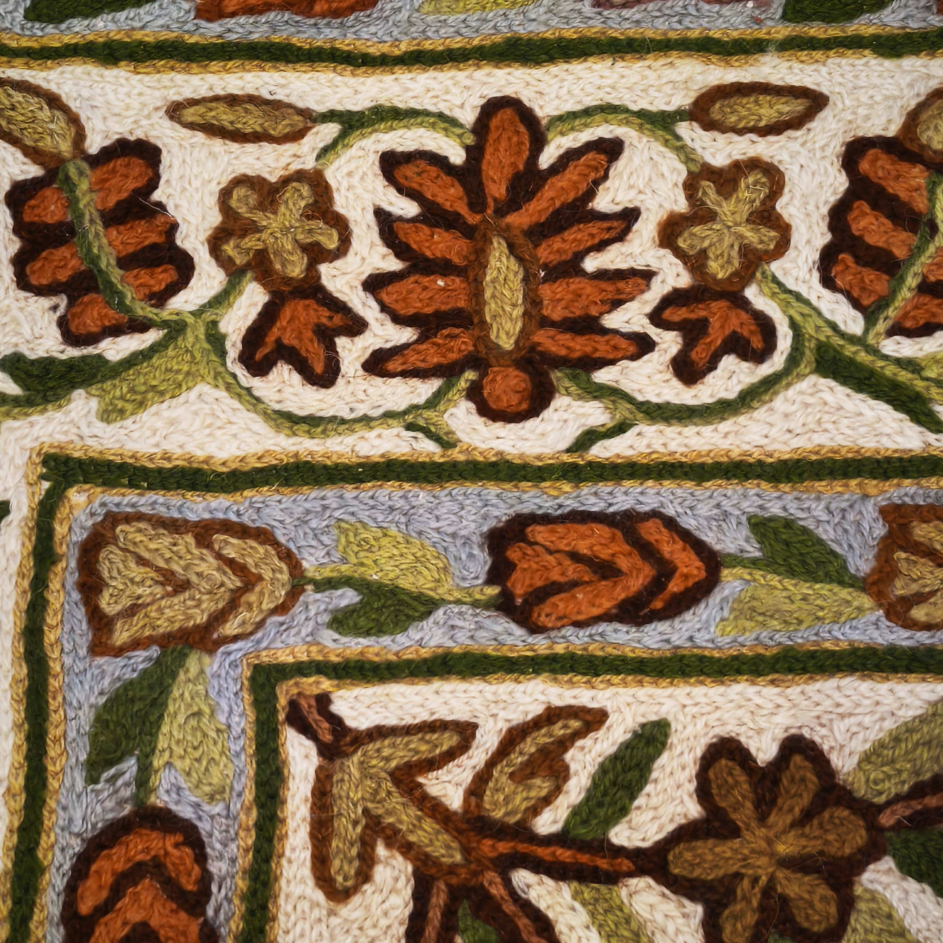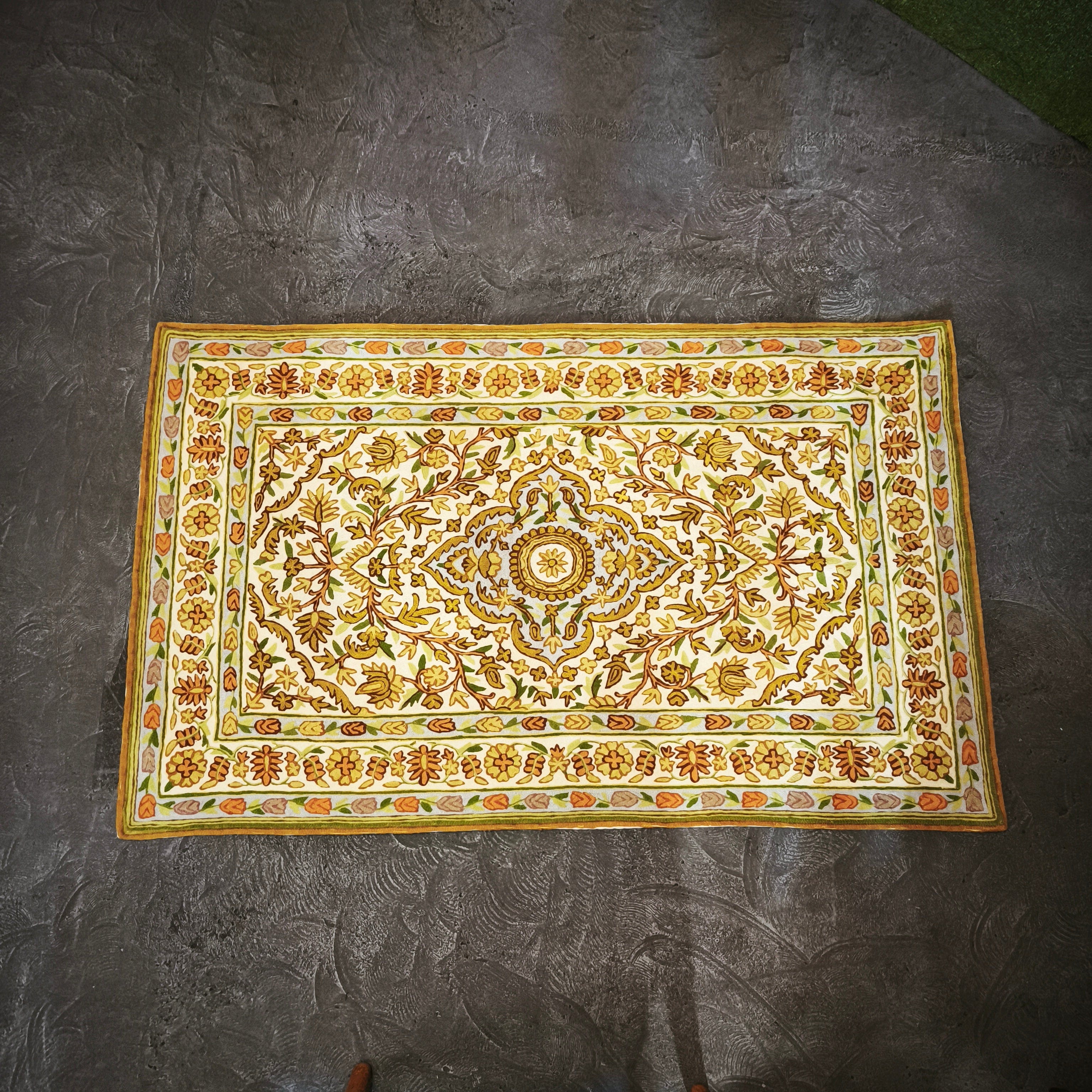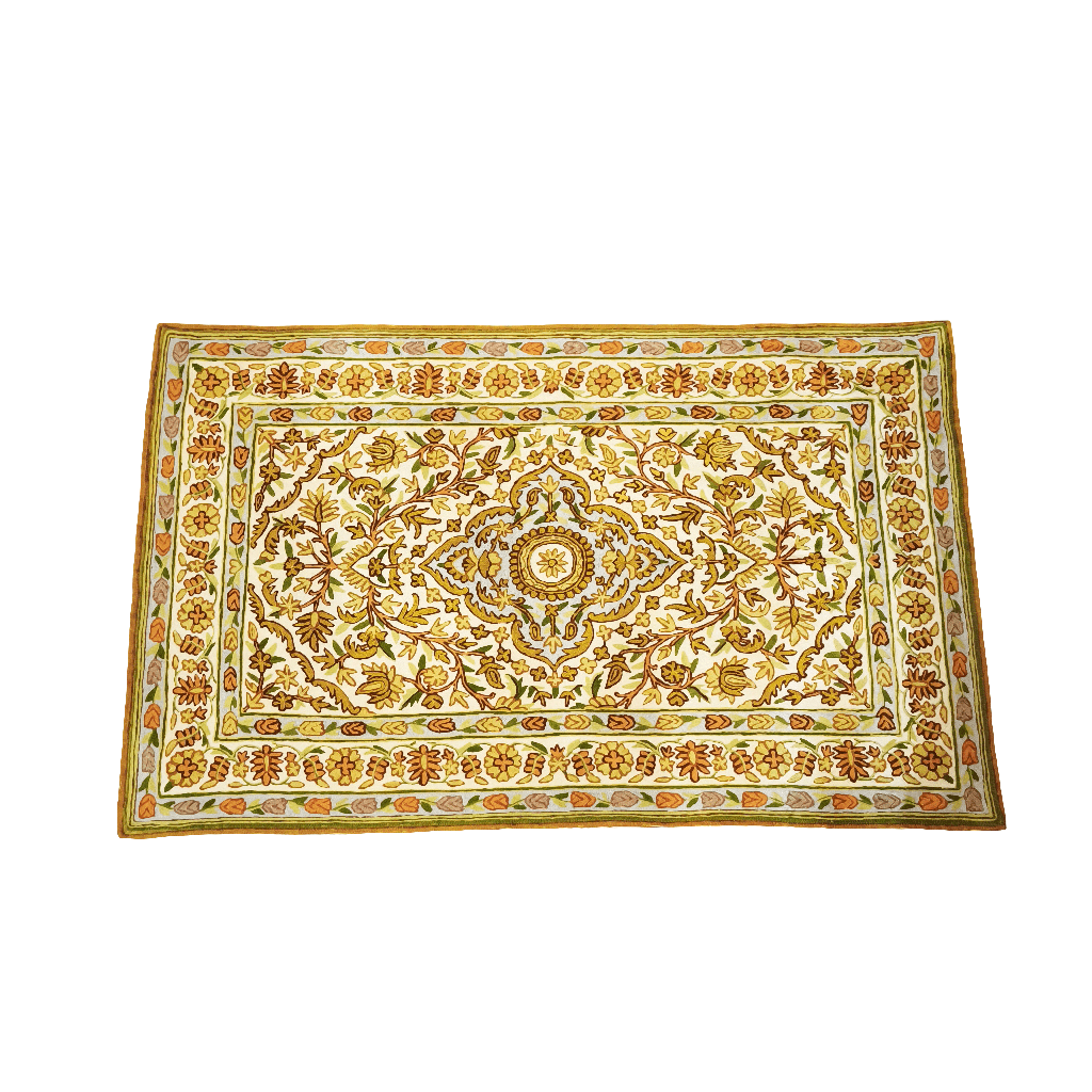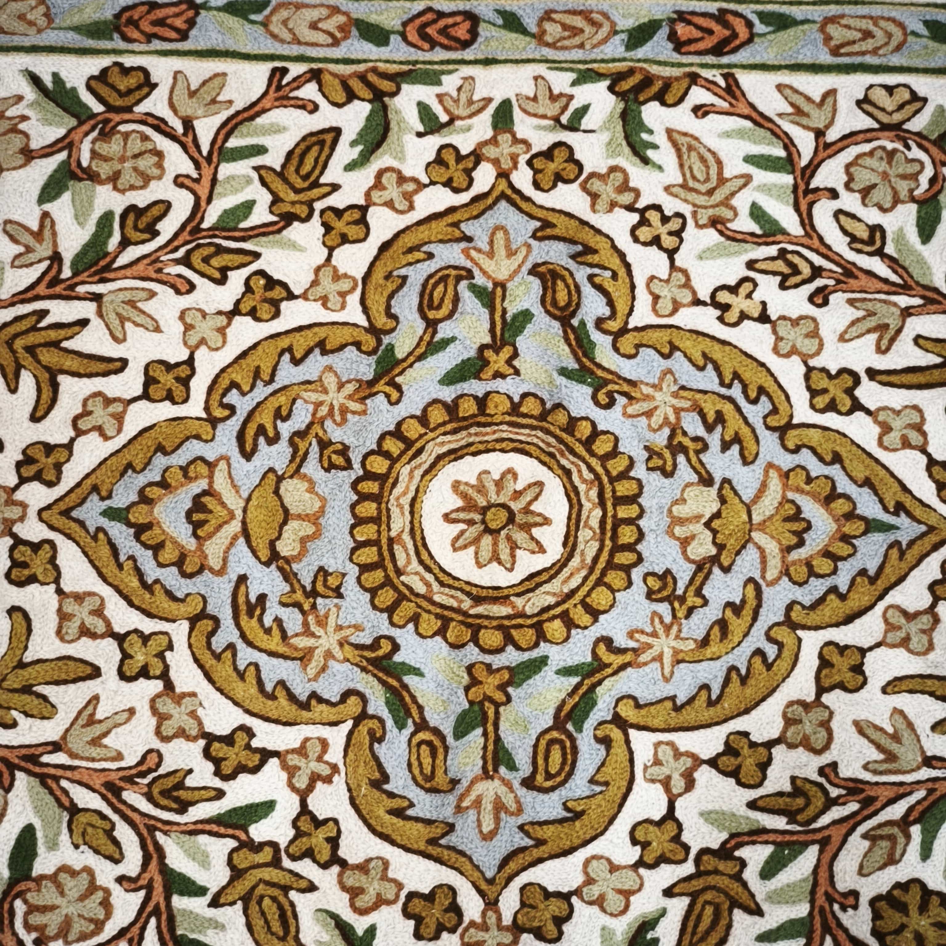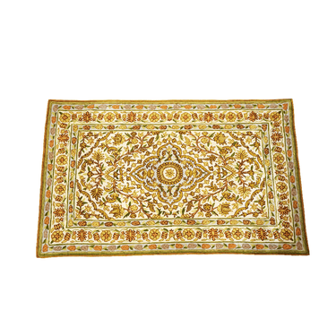 Beautiful hand-embroidered cashmere tapestry with elegant symmetrical floral designs in shades of yellow and gold, with red accents for the flowers.