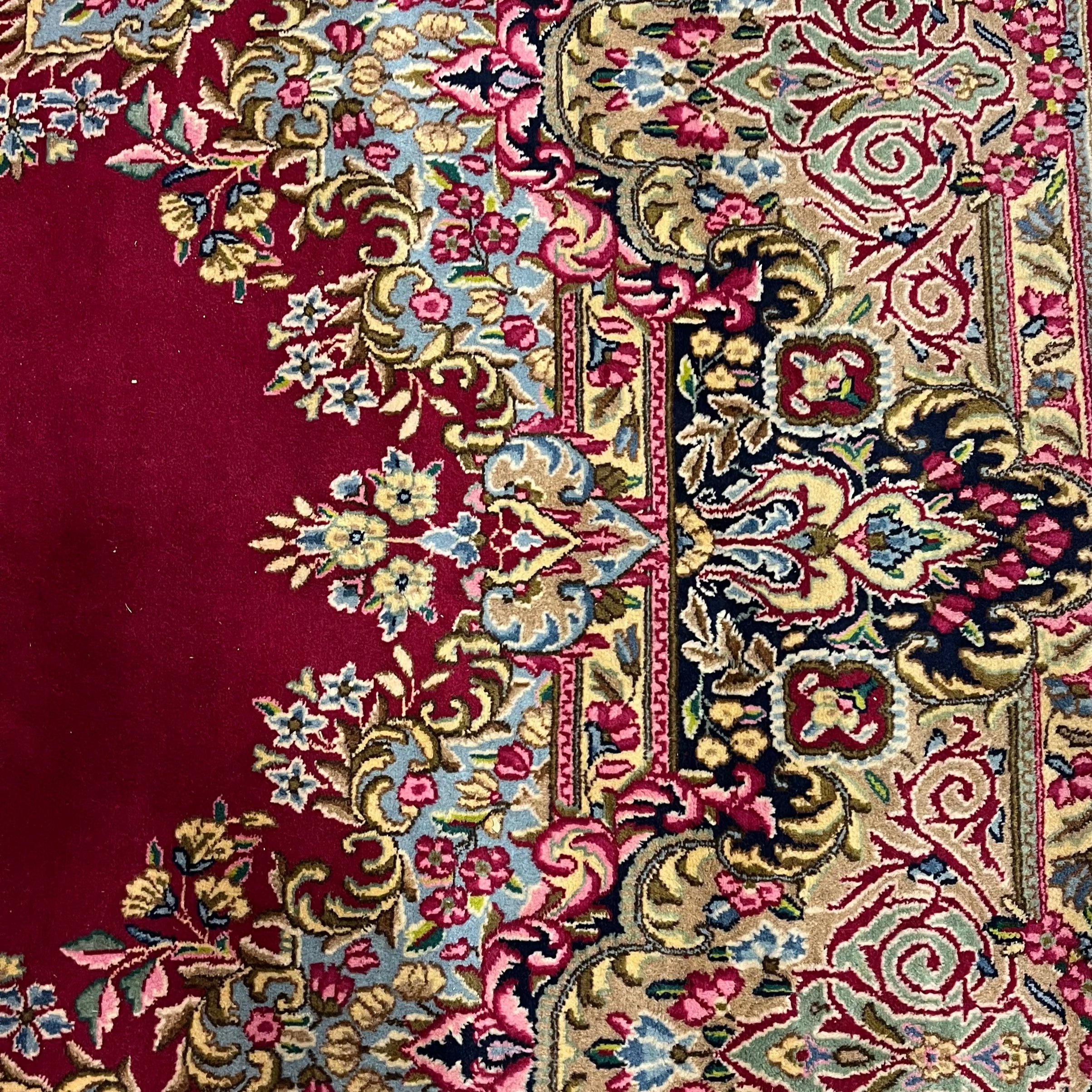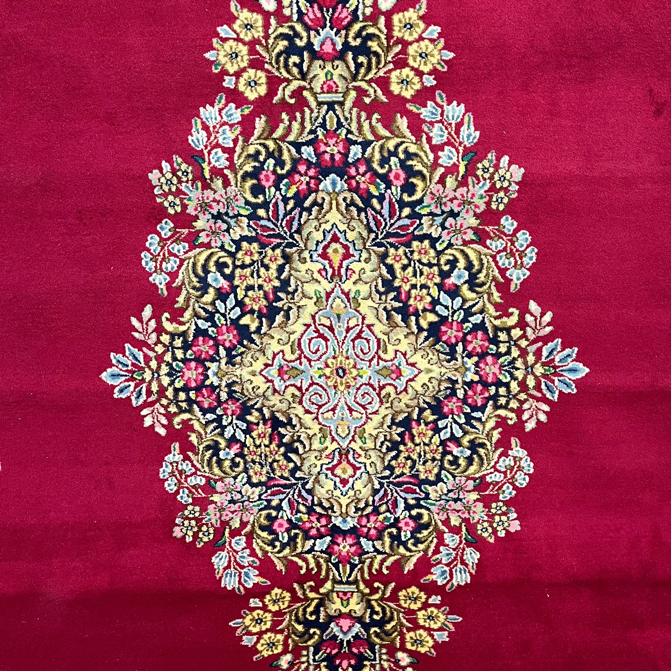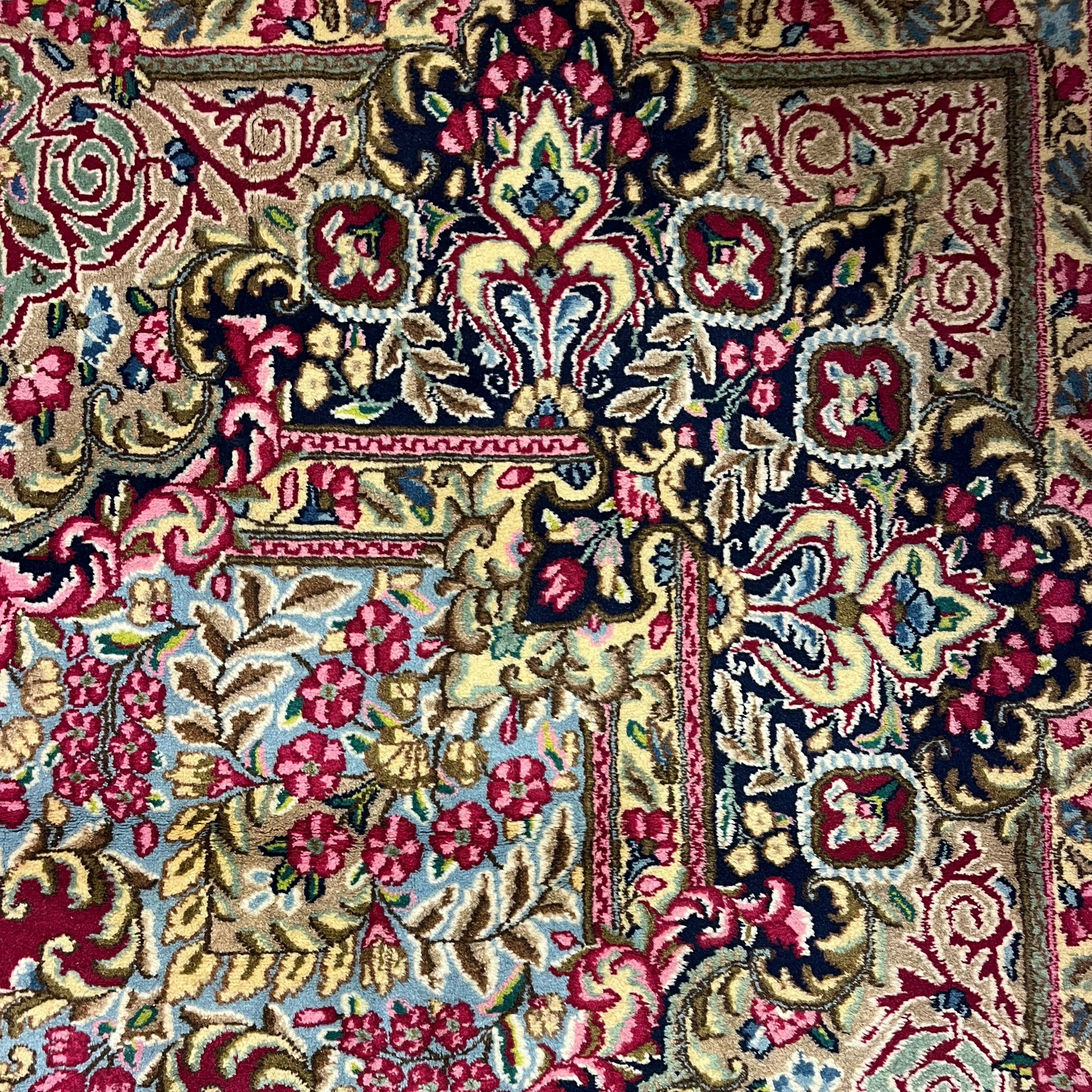 Wonderful mid-20th-century Persian wool and silk Kirman rug. Handmade, it features beautiful floral details and geometric patterns in striking reds, blues, and pinks that enhance the design thanks to the contrast they create. It is in perfect condition.