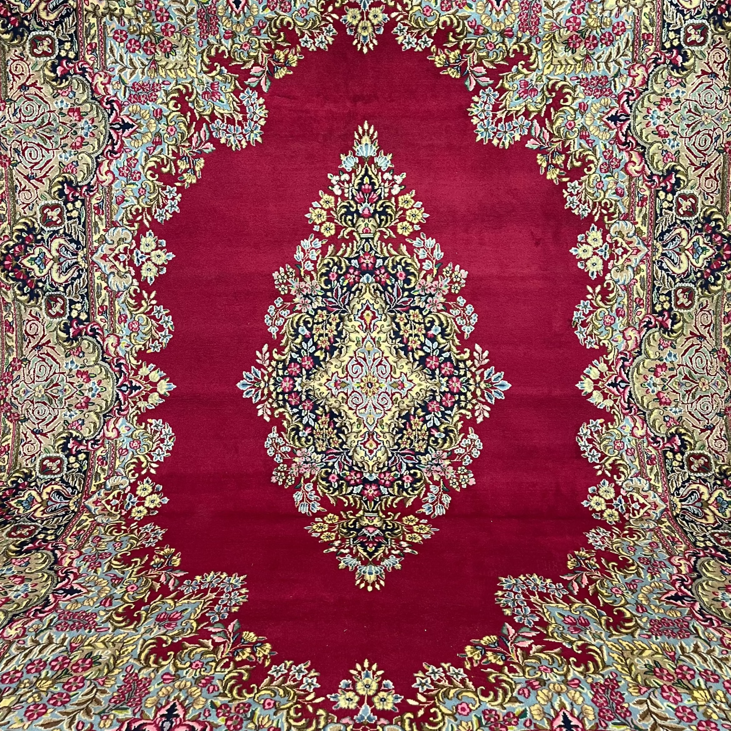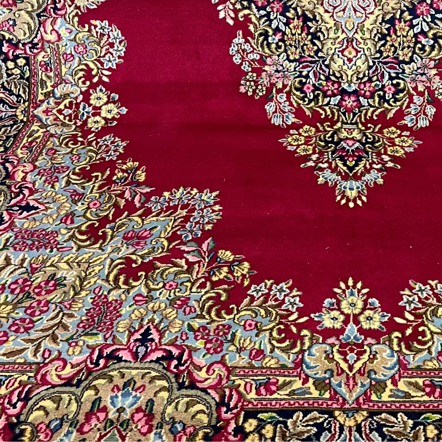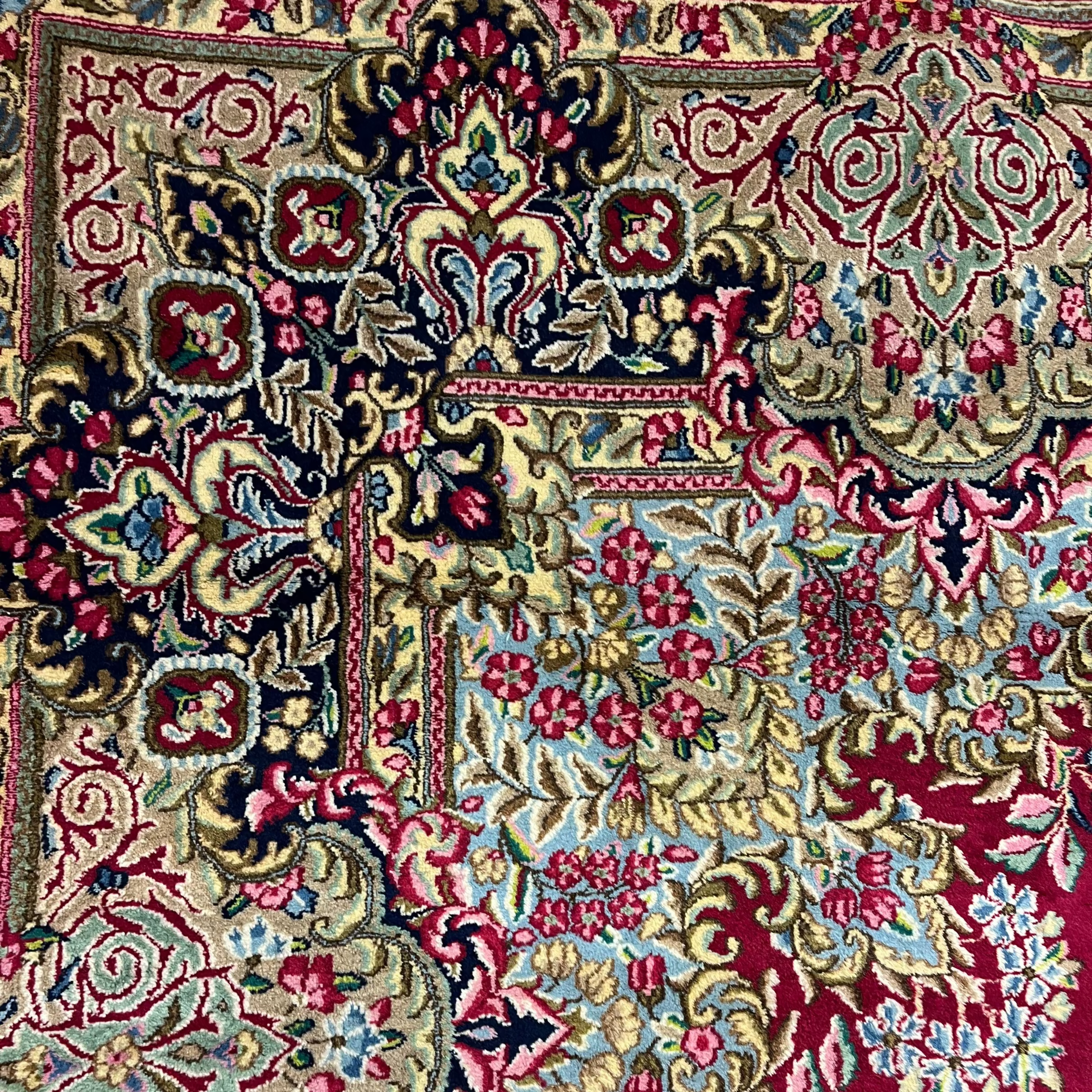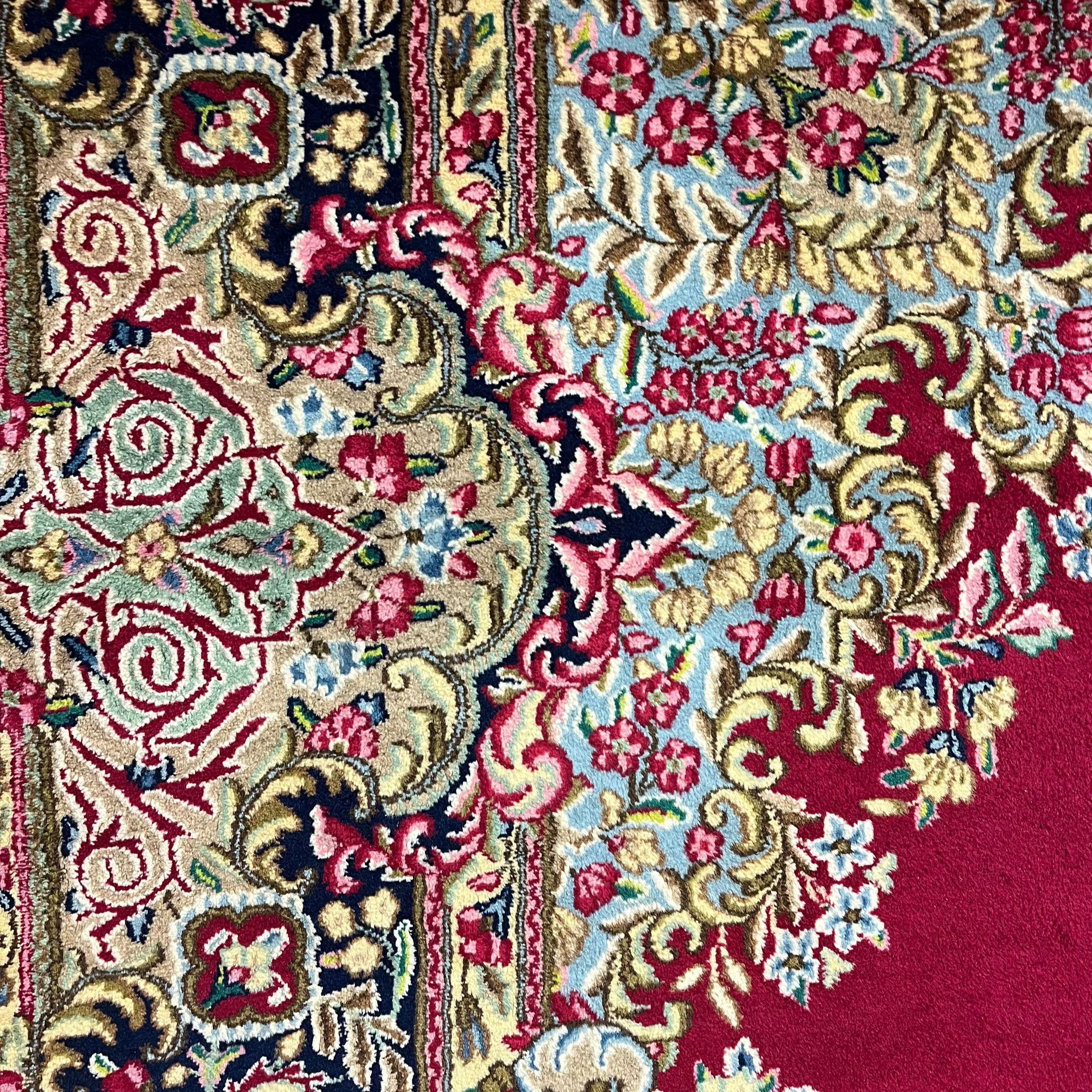 Wonderful mid-20th-century Persian wool and silk Kirman rug. Handmade, it features beautiful floral details and geometric patterns in striking reds, blues, and pinks that enhance the design thanks to the contrast they create. It is in perfect condition.