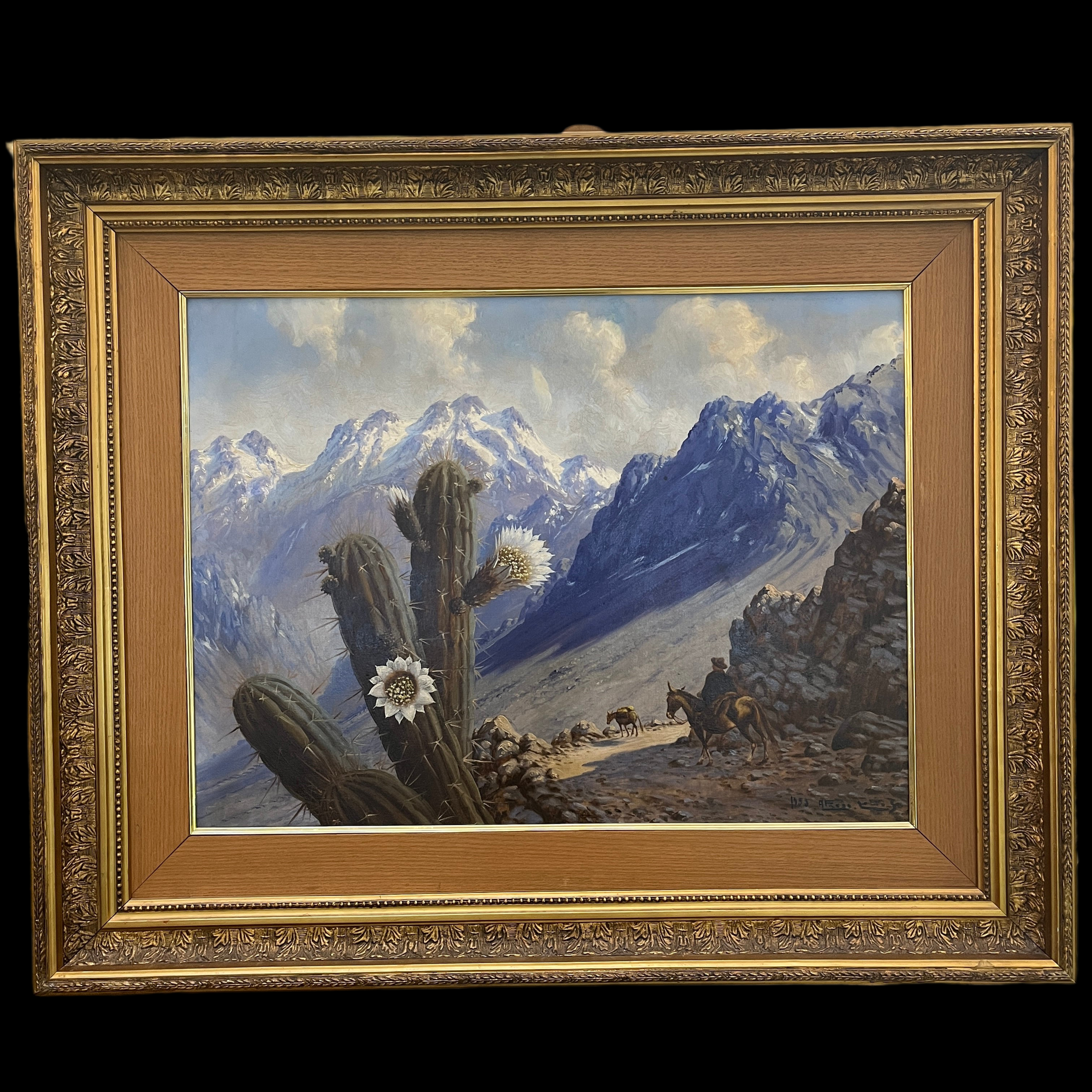 Óleo sobre tela del recocido pintor chileno Alfredo Lobos Aránguiz (1890 - 1918 ), pintado en 1953. La Obra representa un paisaje cordillerano, en el que se ve a un hombre ascendiendo en con sus caballos a la cumbre, que observa desde lejos. En en el lado izquierdo de la composición, en primer plano, toma protagonismo un cactus San Pedro, florecido. La obra captura la majestuosidad del paisaje con detalle y un bello juego de tonos azulados para representar la cordillera.