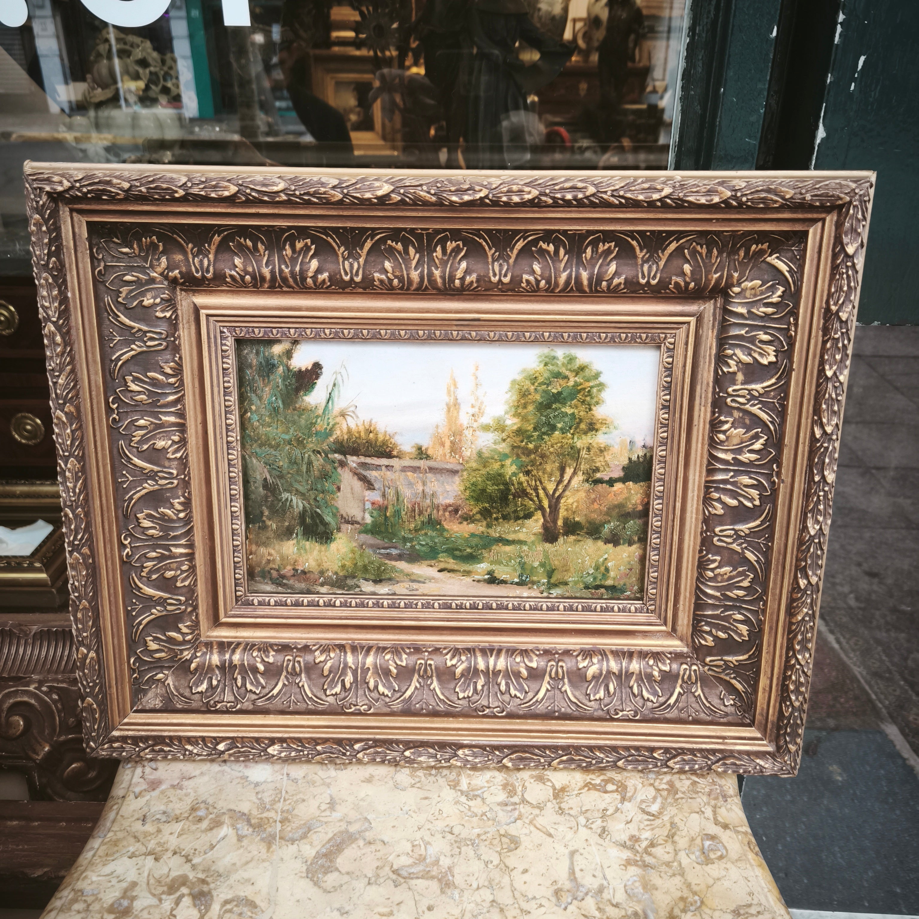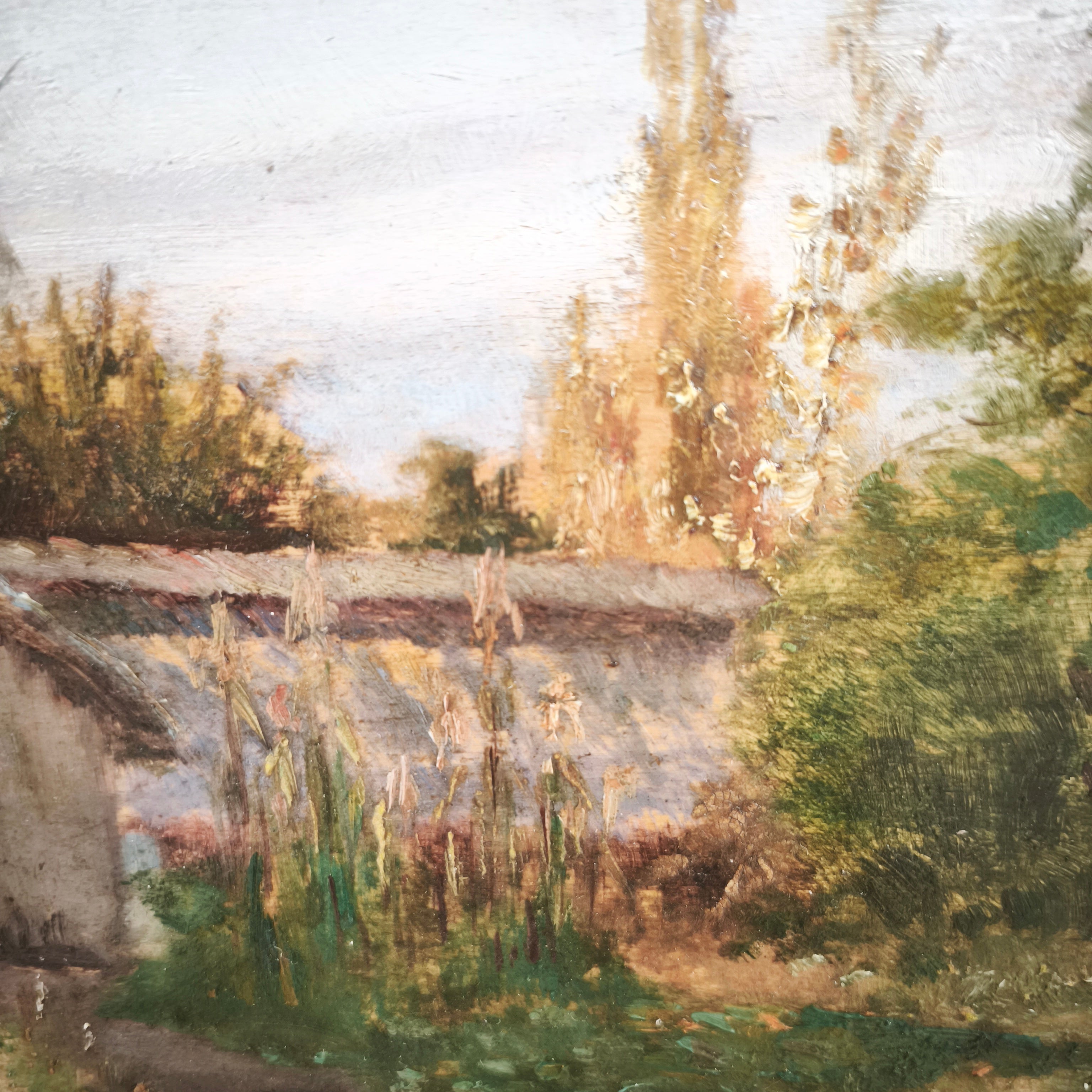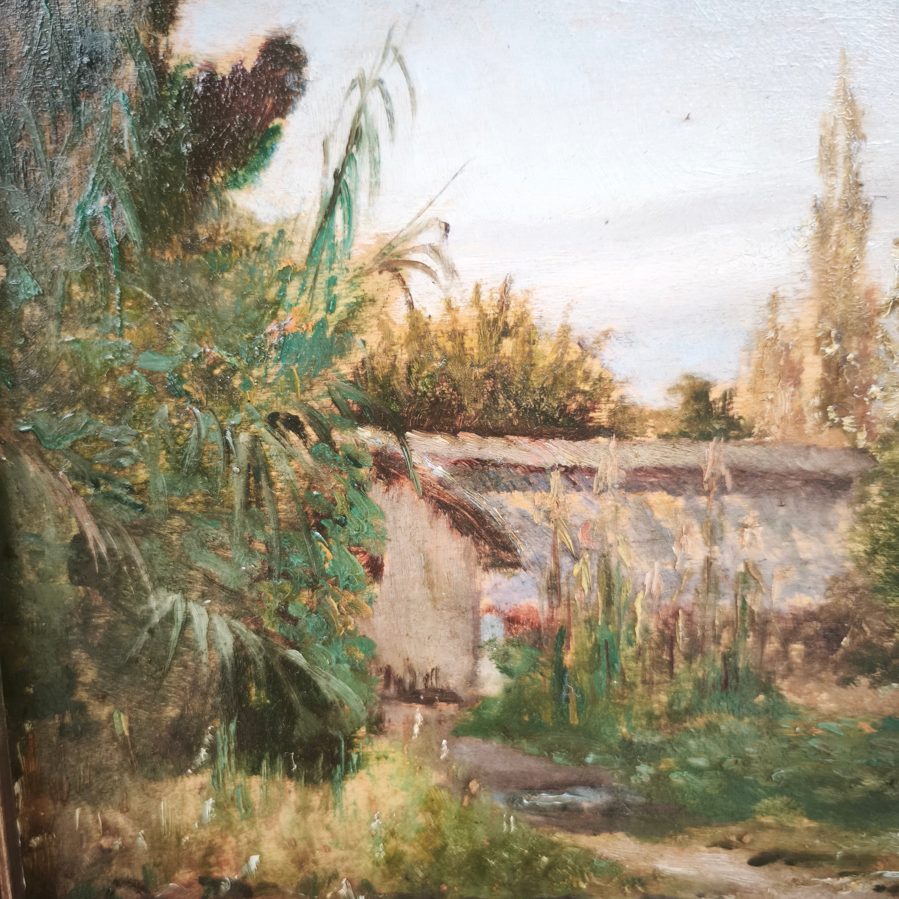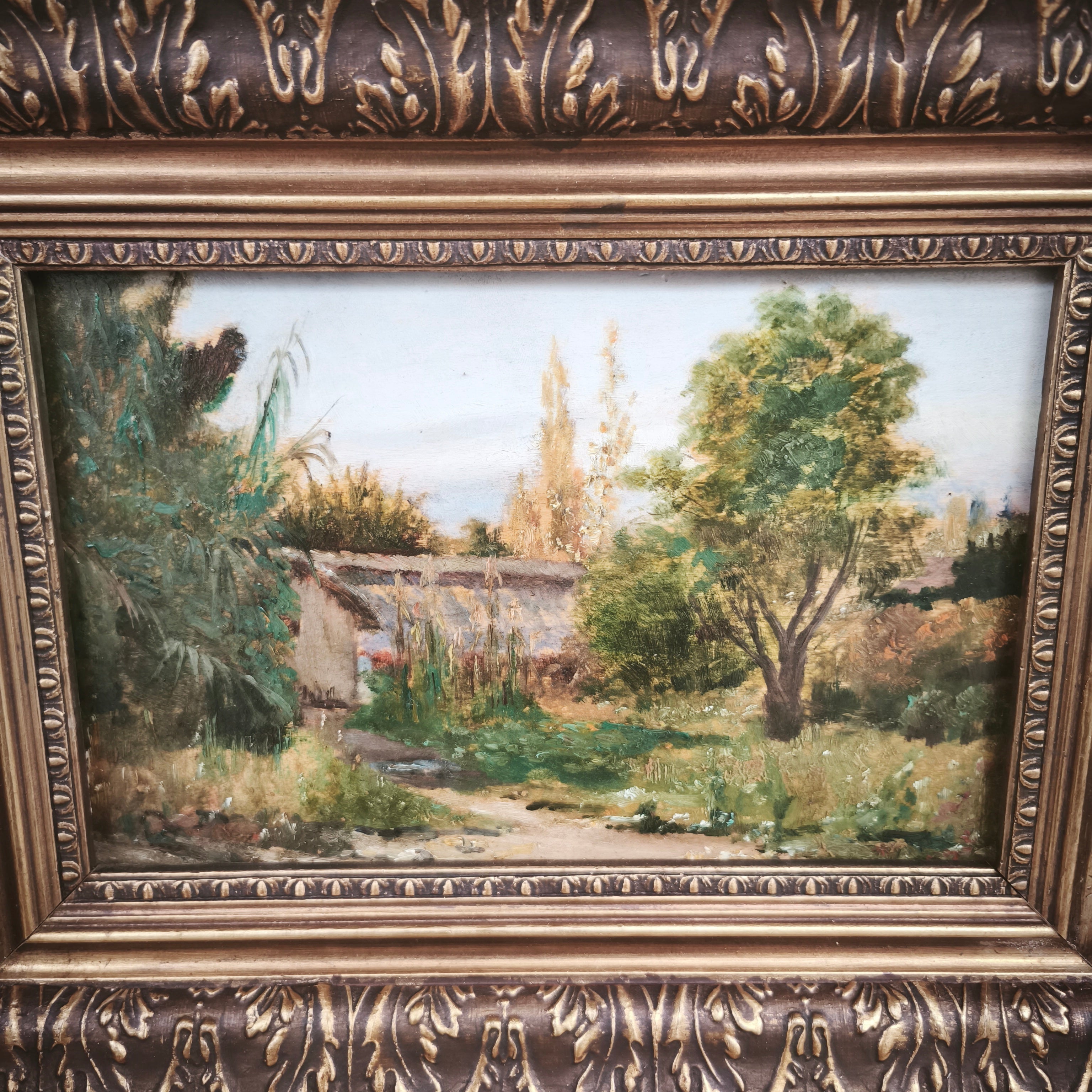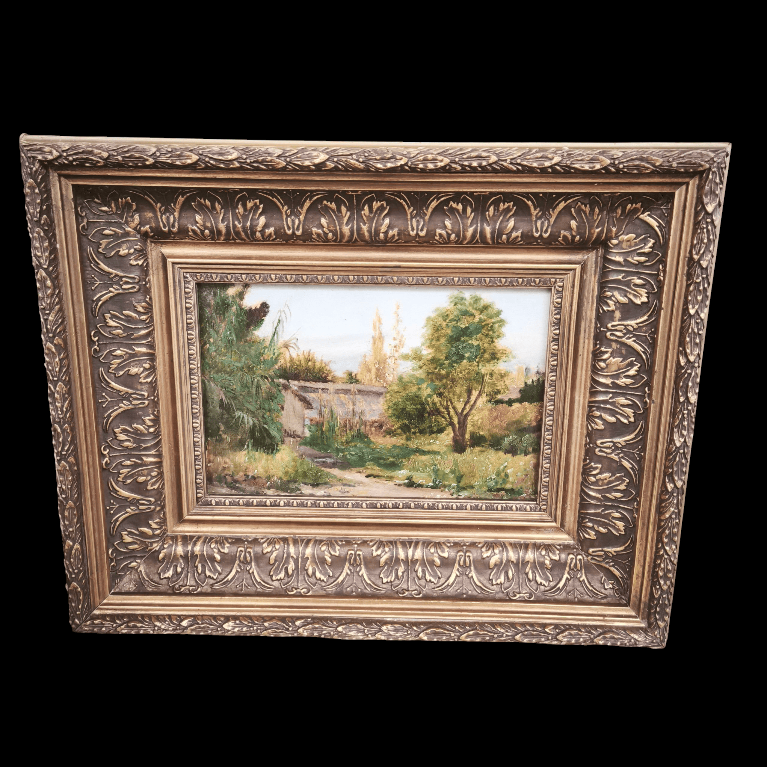 A beautiful oil painting on wood, attributed to the national artist Alfredo Valenzuela Puelma (1856-1909), depicts a rural landscape with a simple house peeking out from wild foliage, likely a landscape of La Reina, like so many others he painted. The intricately painted composition captures a warm sunset atmosphere with a sky tinged with pink and yellow hues. The work has an elegant molded-carved wooden frame with decorated reliefs and a gilt finish.