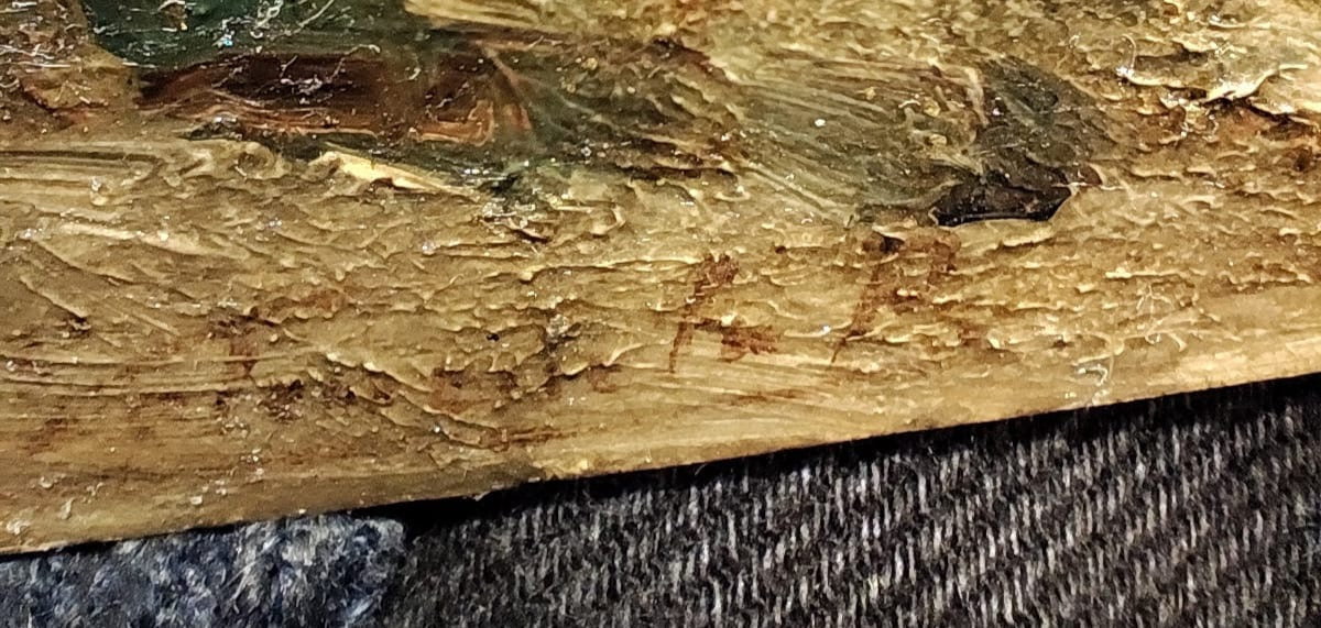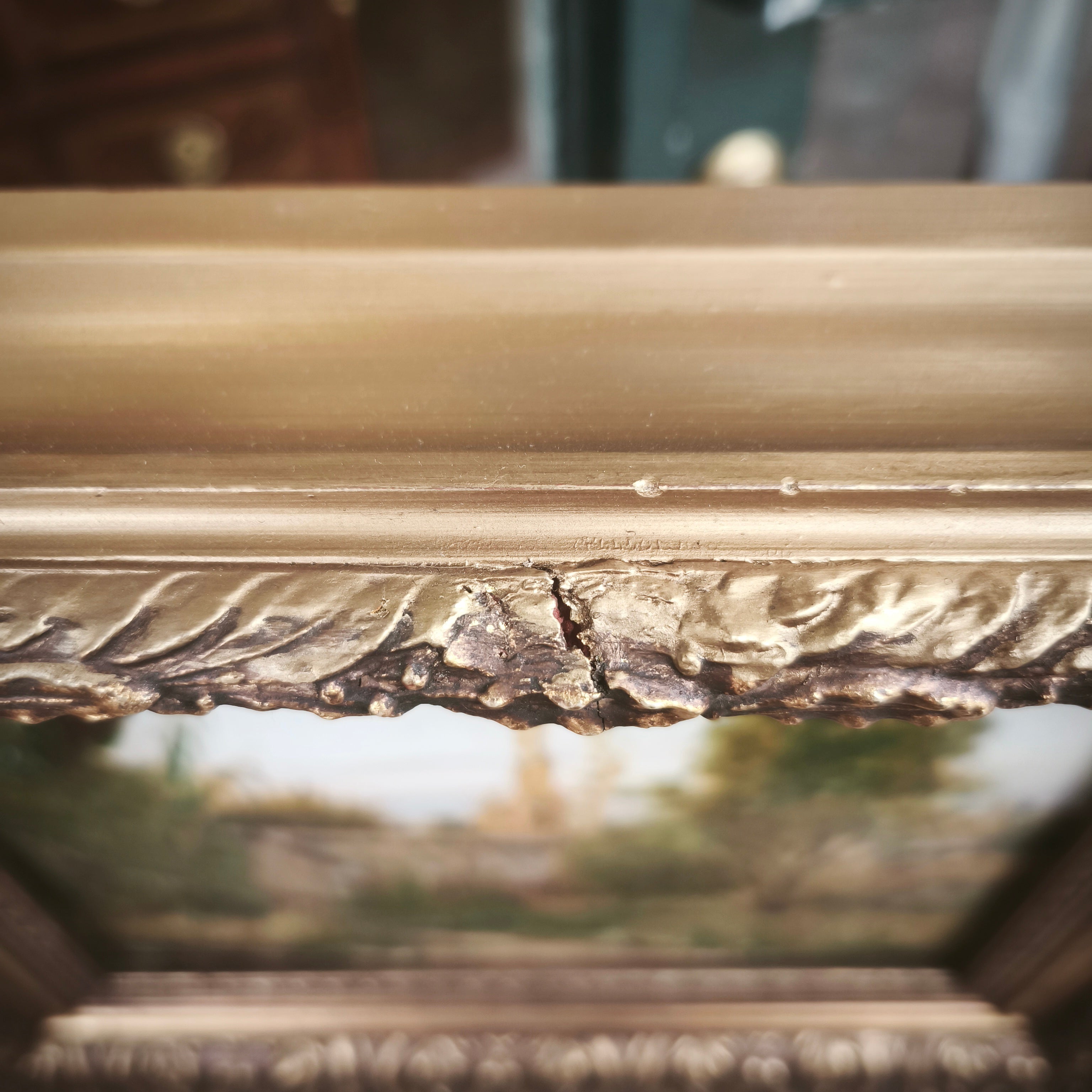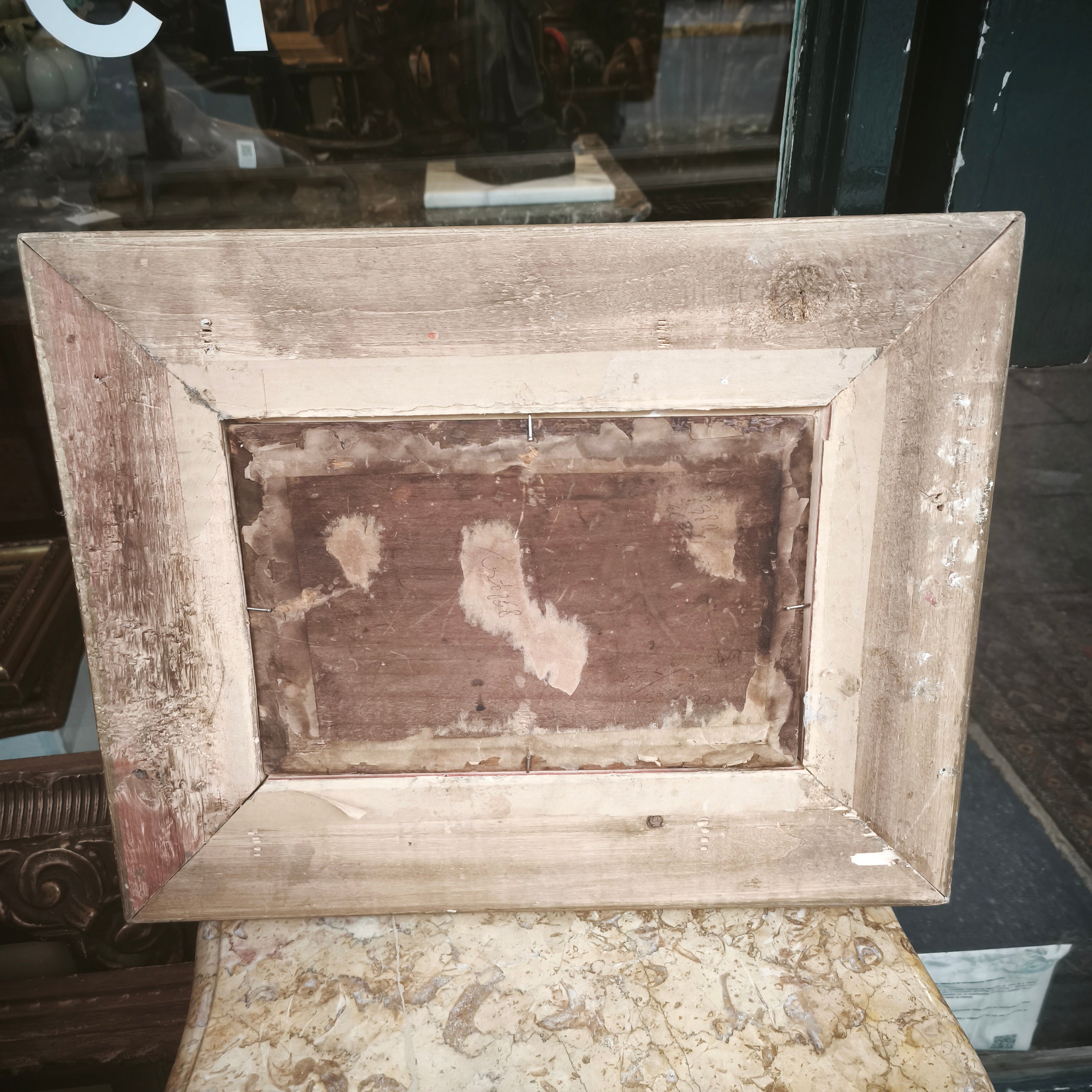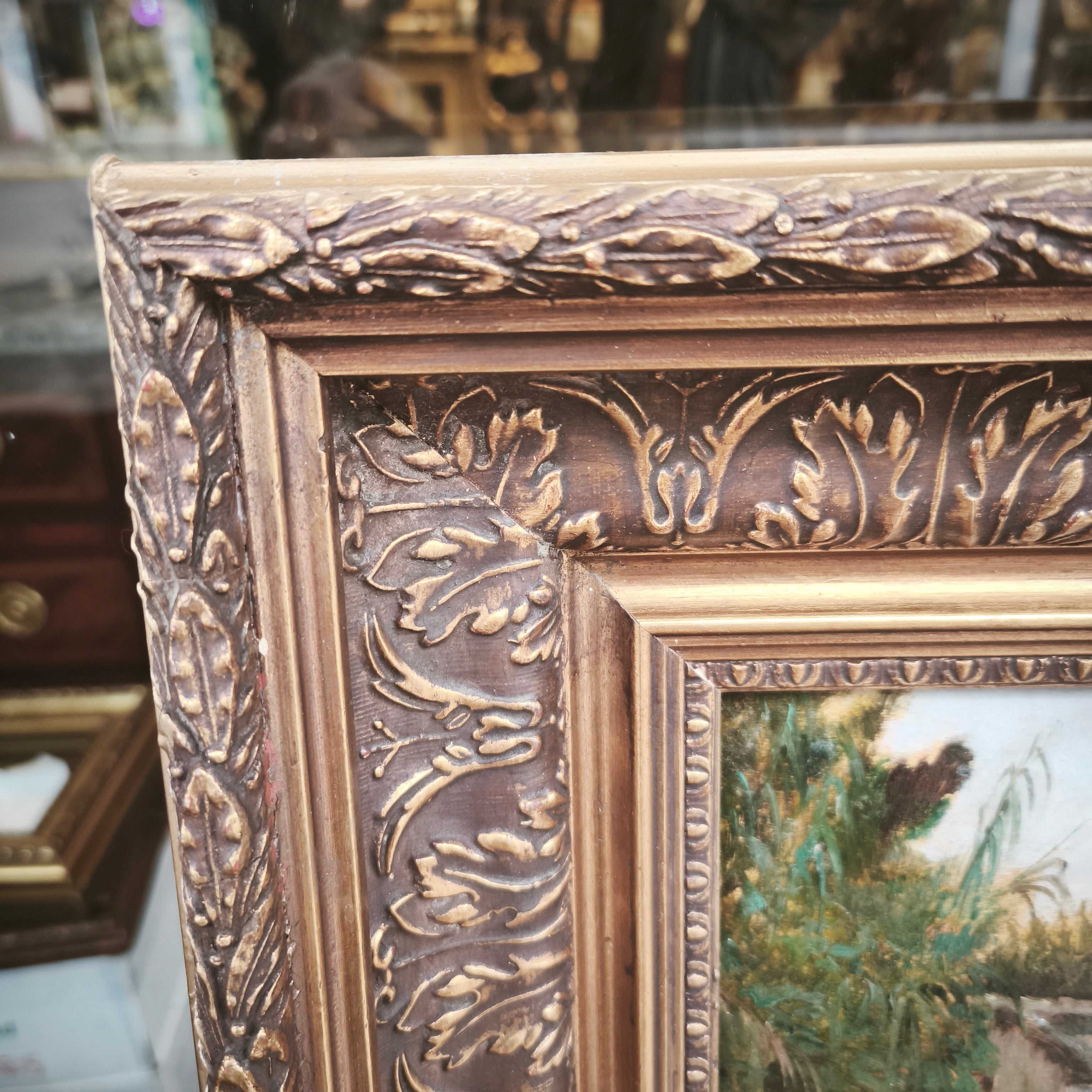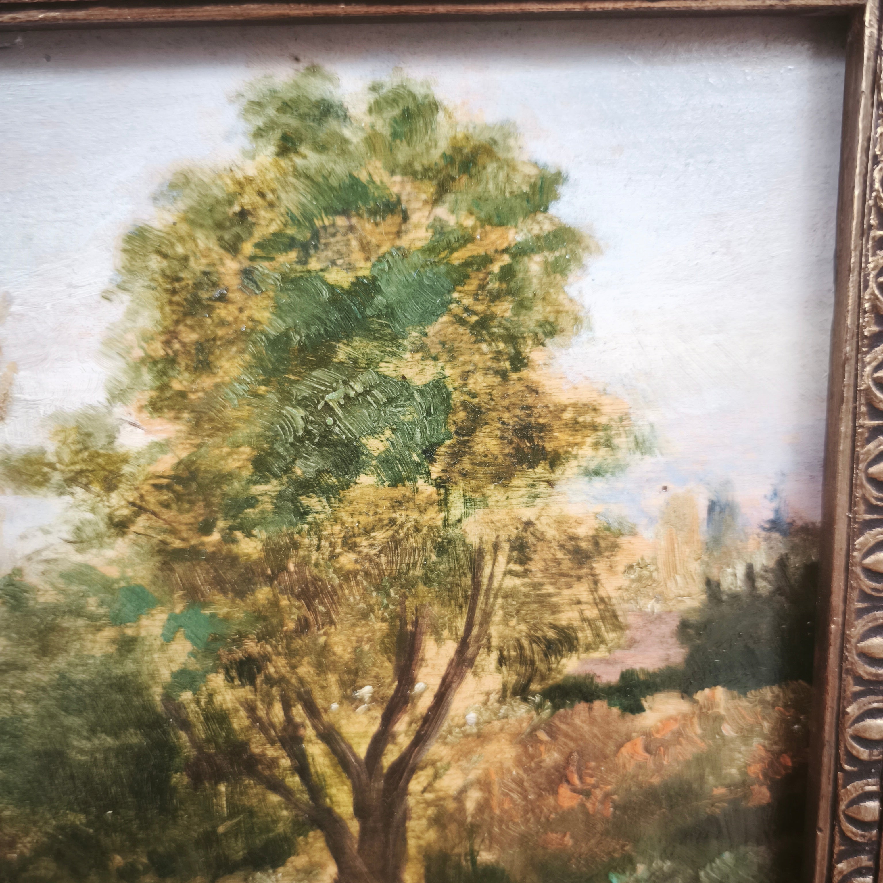 A beautiful oil painting on wood, attributed to the national artist Alfredo Valenzuela Puelma (1856-1909), depicts a rural landscape with a simple house peeking out from wild foliage, likely a landscape of La Reina, like so many others he painted. The intricately painted composition captures a warm sunset atmosphere with a sky tinged with pink and yellow hues. The work has an elegant molded-carved wooden frame with decorated reliefs and a gilt finish.