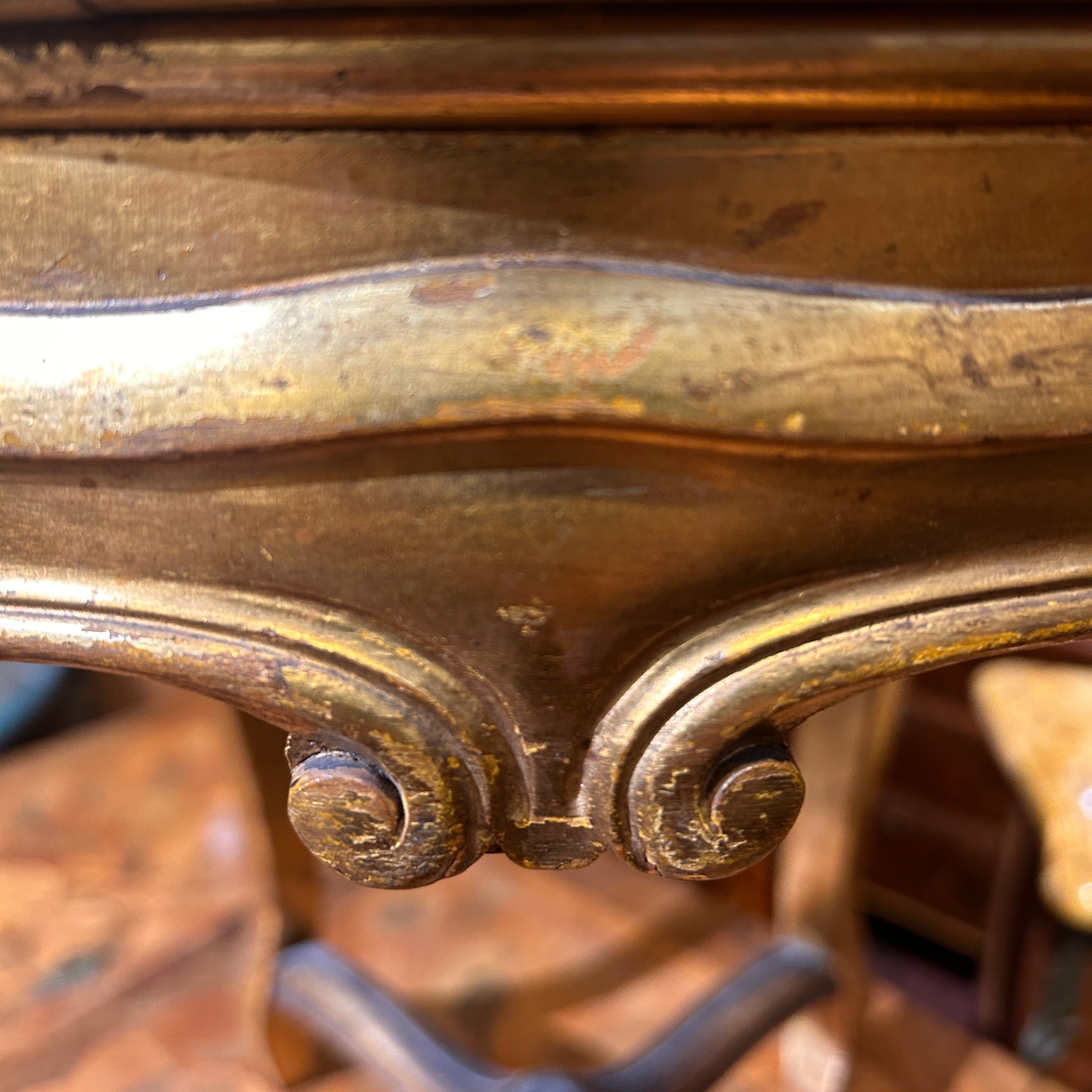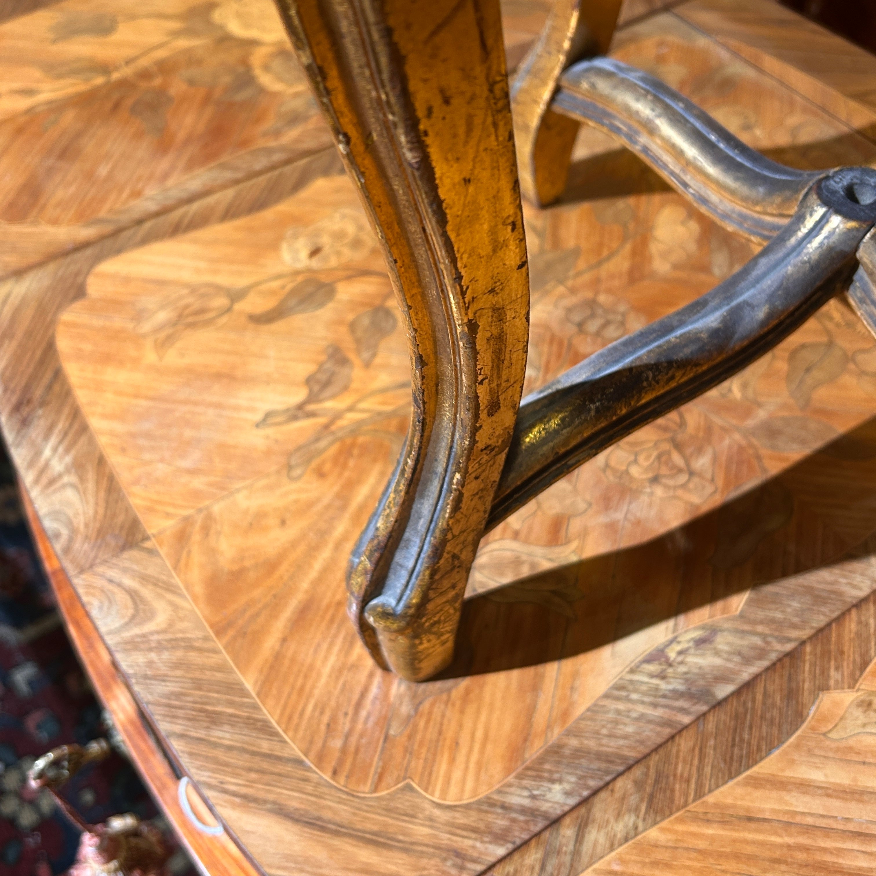 Espectacular banquito francés estilo Luis XV hecho en madera tallada y patas cabriolé, con terminación dorada y tapiz de terciopelo verde, con bella pasamanería.