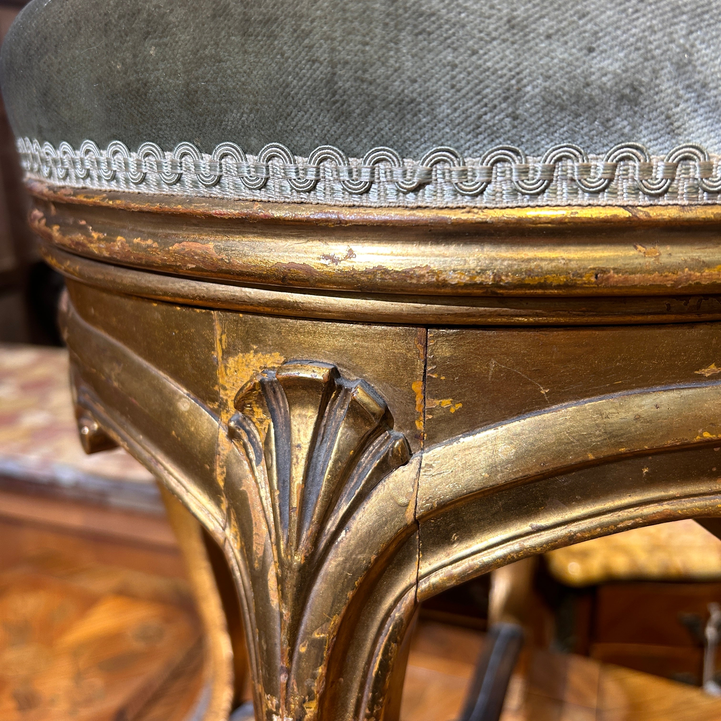 Taburete de madera dorada Luis XV y tapiz terciopelo verde