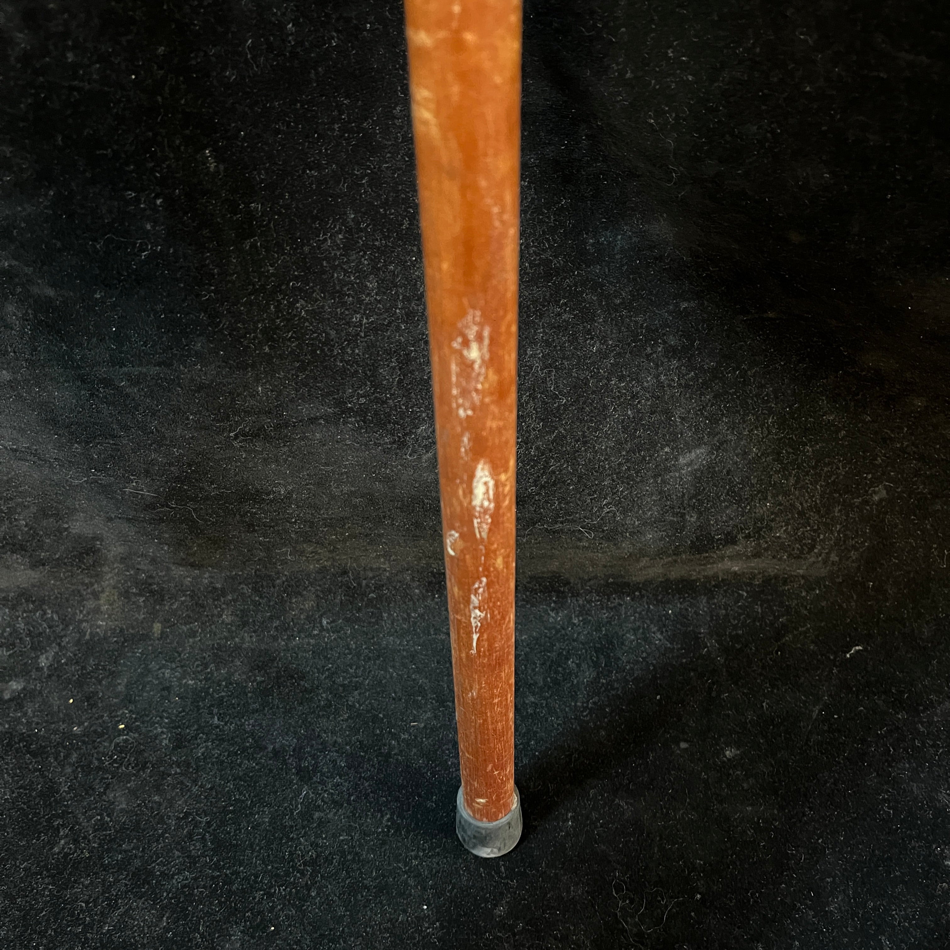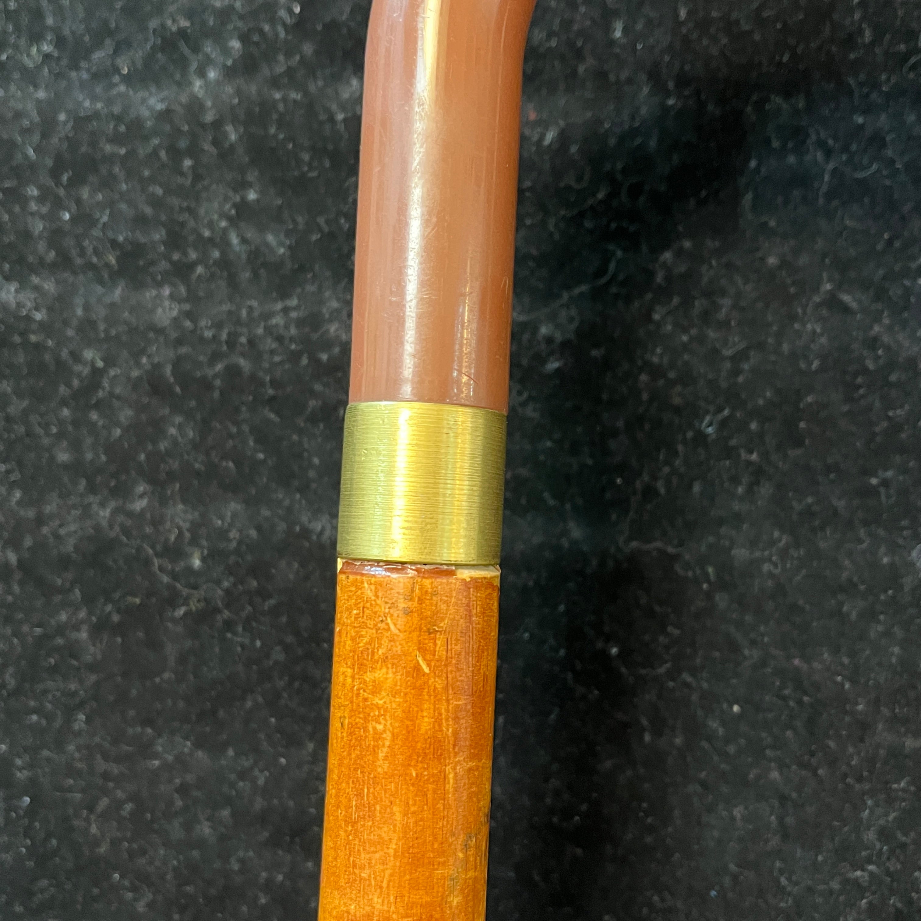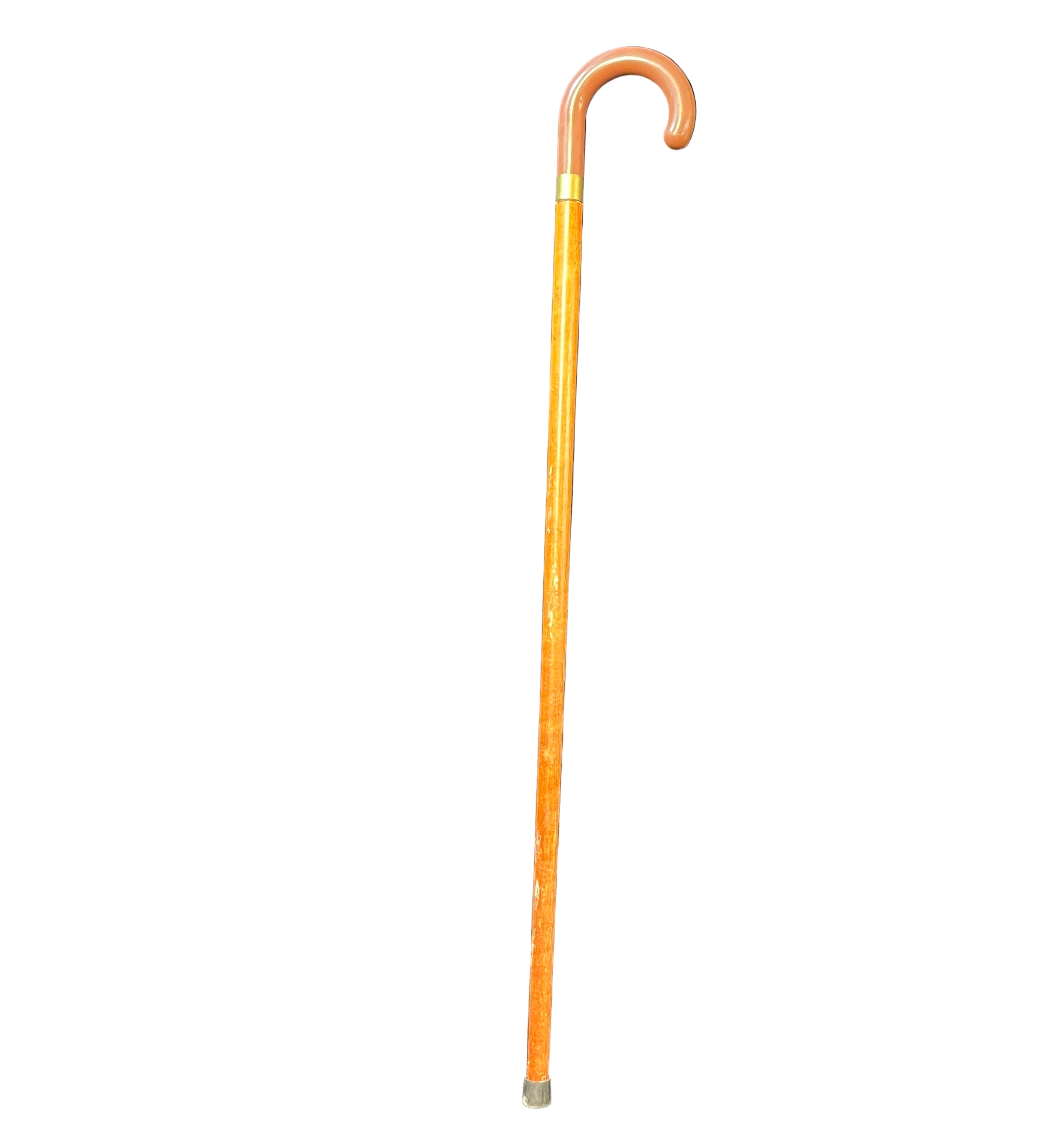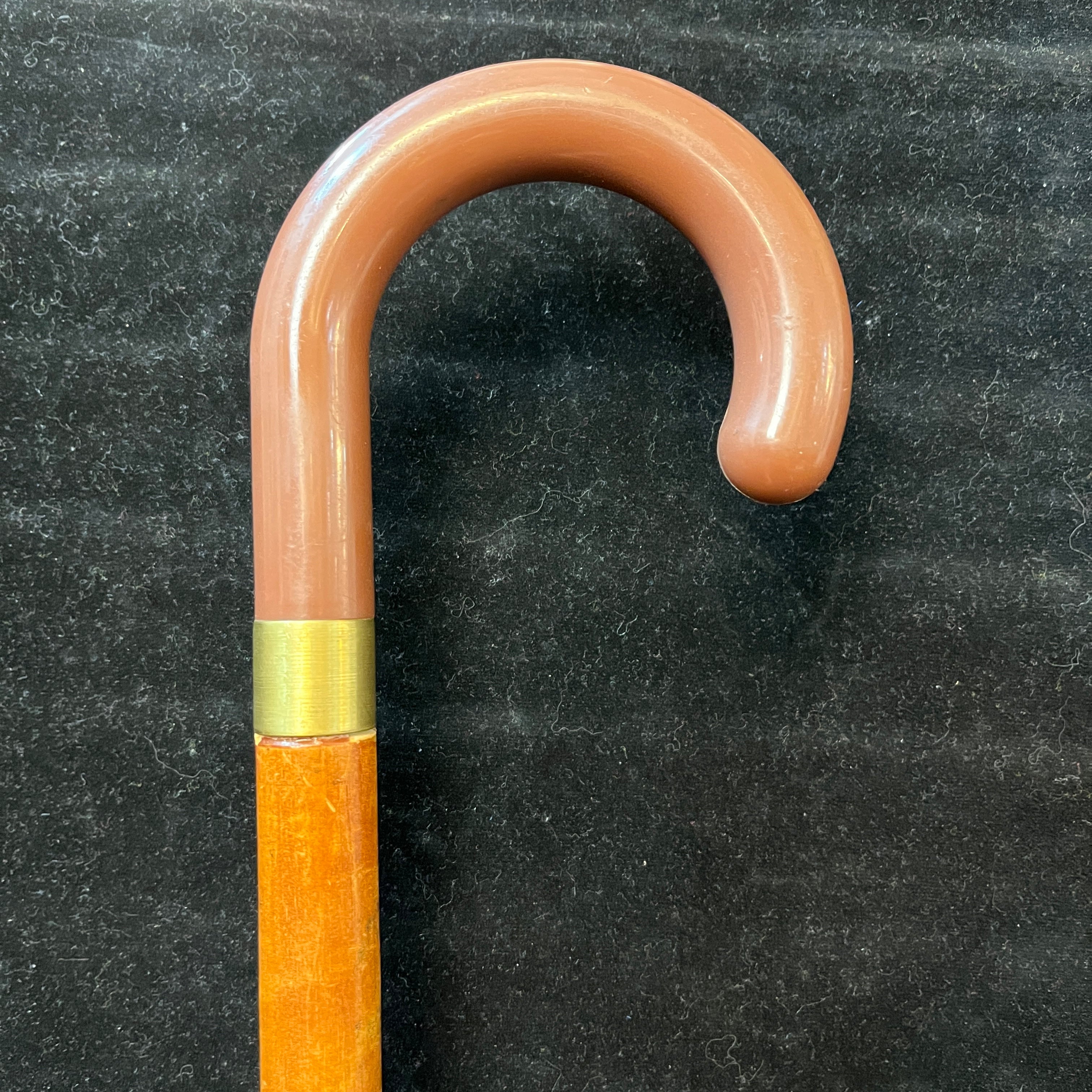 Bastón de madera con mango de plástico café con un tinte rojizo y anillo dorado, que conecta el mango con el cuerpo de madera. Se trata de un bastón de diseño y fabricación sencilla, perfecta para el uso diario.