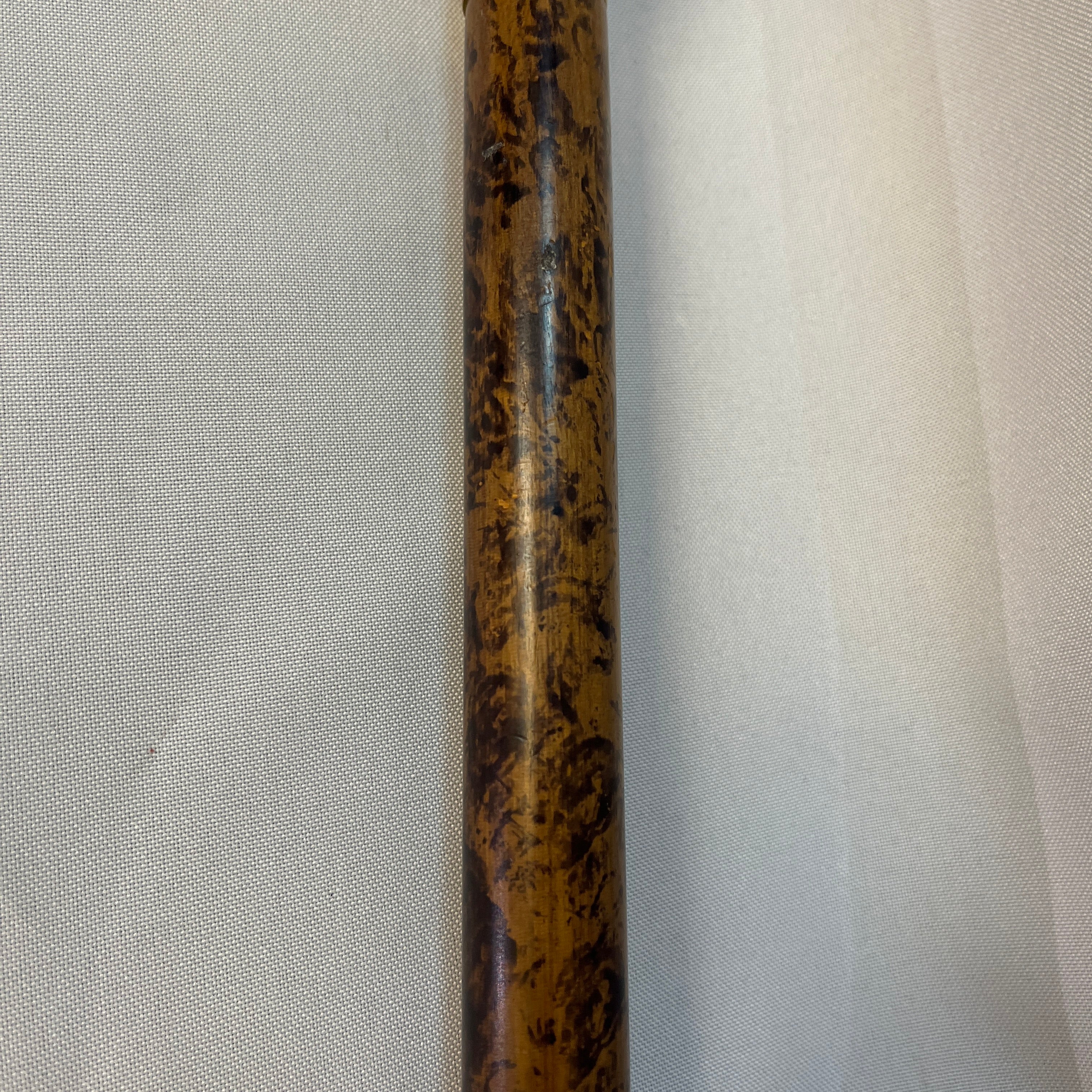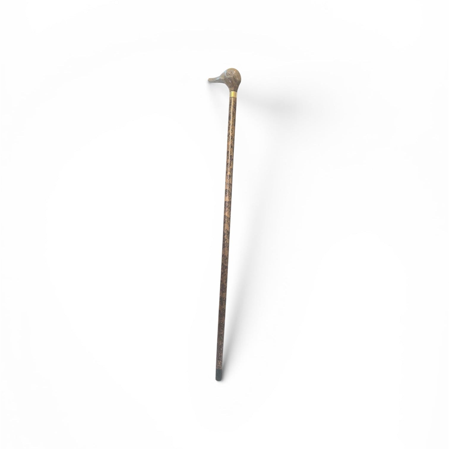 Elegante bastón francés de madera nativa enchapada en veta manchada, lo que le entrega una particular belleza. La empuñadura es una cabeza de pato tallada a mano, cintillo de bronce y su punta con un cinto pintado negro.