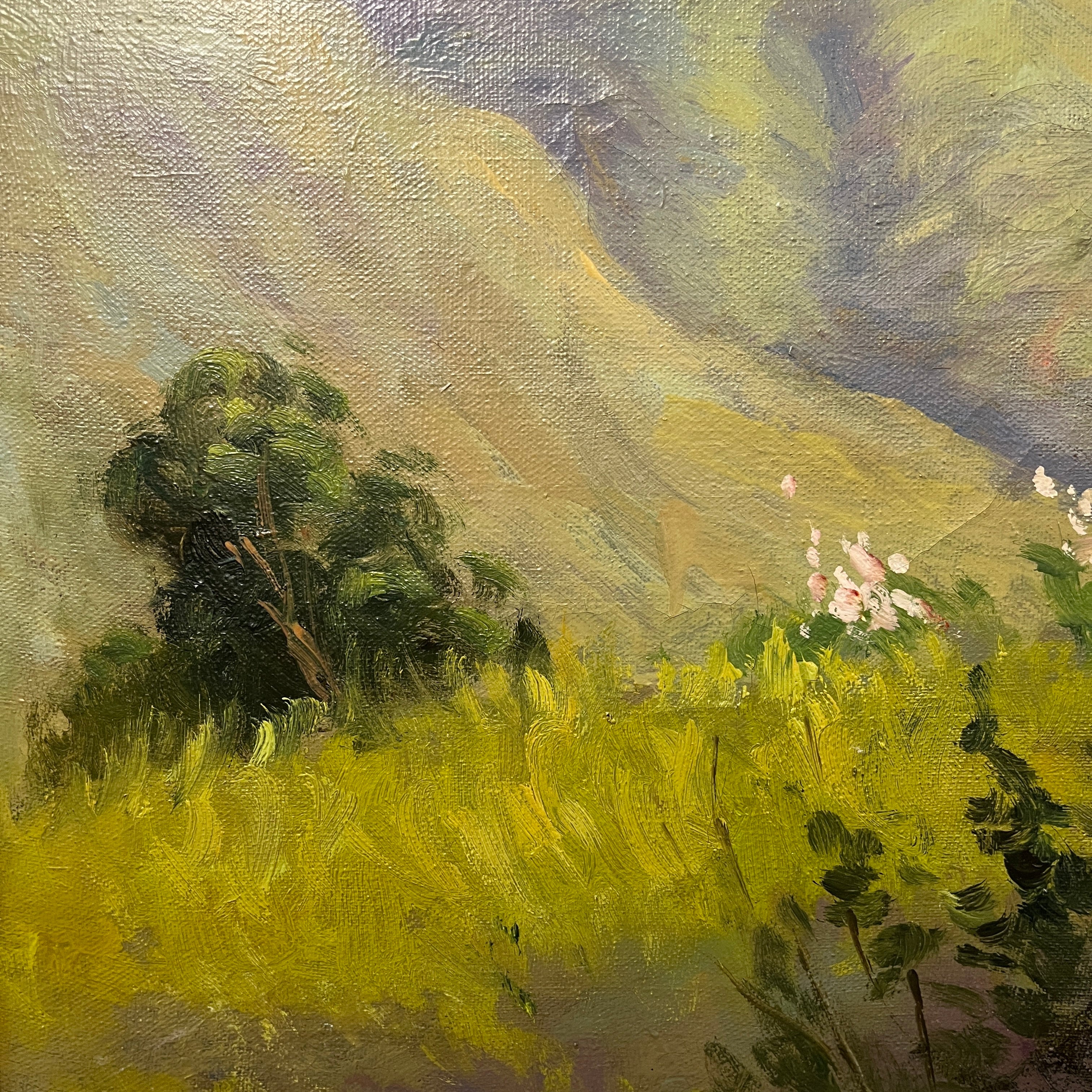 Hermoso óleo del talentoso pintor chileno Ramos Catalán. Su pasión por retratar la cordillera logra imponer un estilo único que se puede apreciar en esta obra. Tenemos un fondo de cordillera verde lo que nos hace inferir en un día primaveral con un cielo celeste y la pradera que acompaña parte de lo que podría ser un bosque esclerófilo.