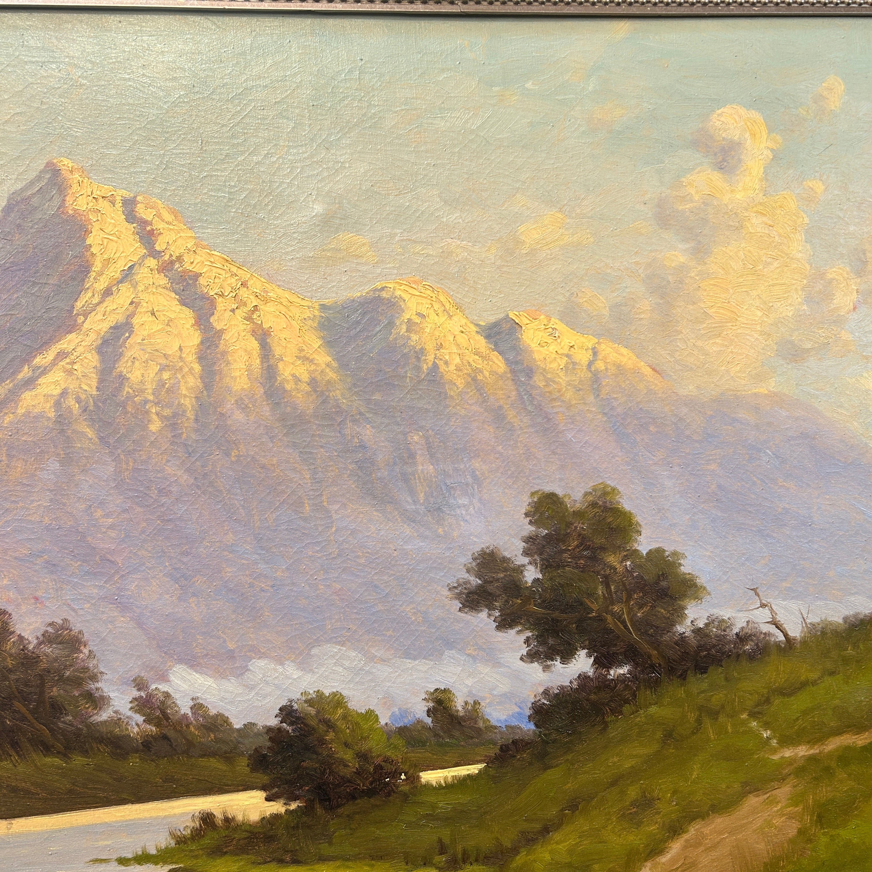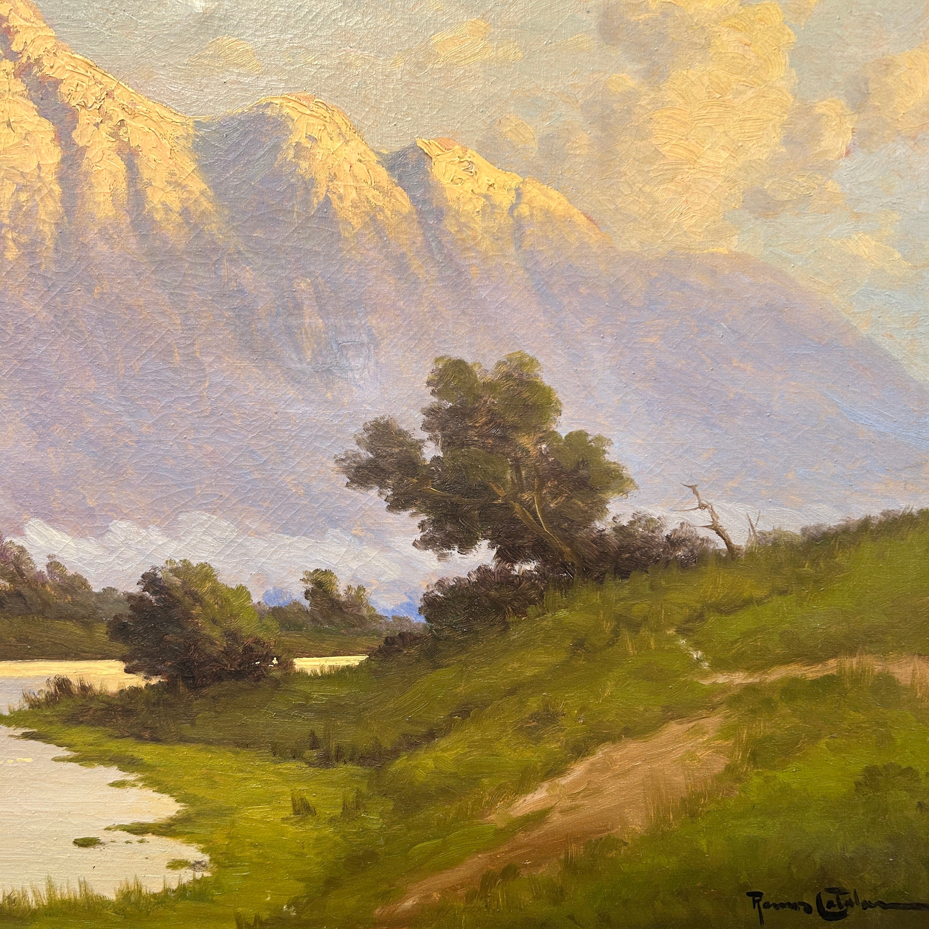 Conmovedora pintura de gran tamaño del artista chileno Benito Ramos Catalán, que retrata un hermoso piedemonte por donde pasa un río y con la cordillera de fondo. Maravillosa mezcla entre tonos cálidos y fríos nos brinda un juego de luces especial.