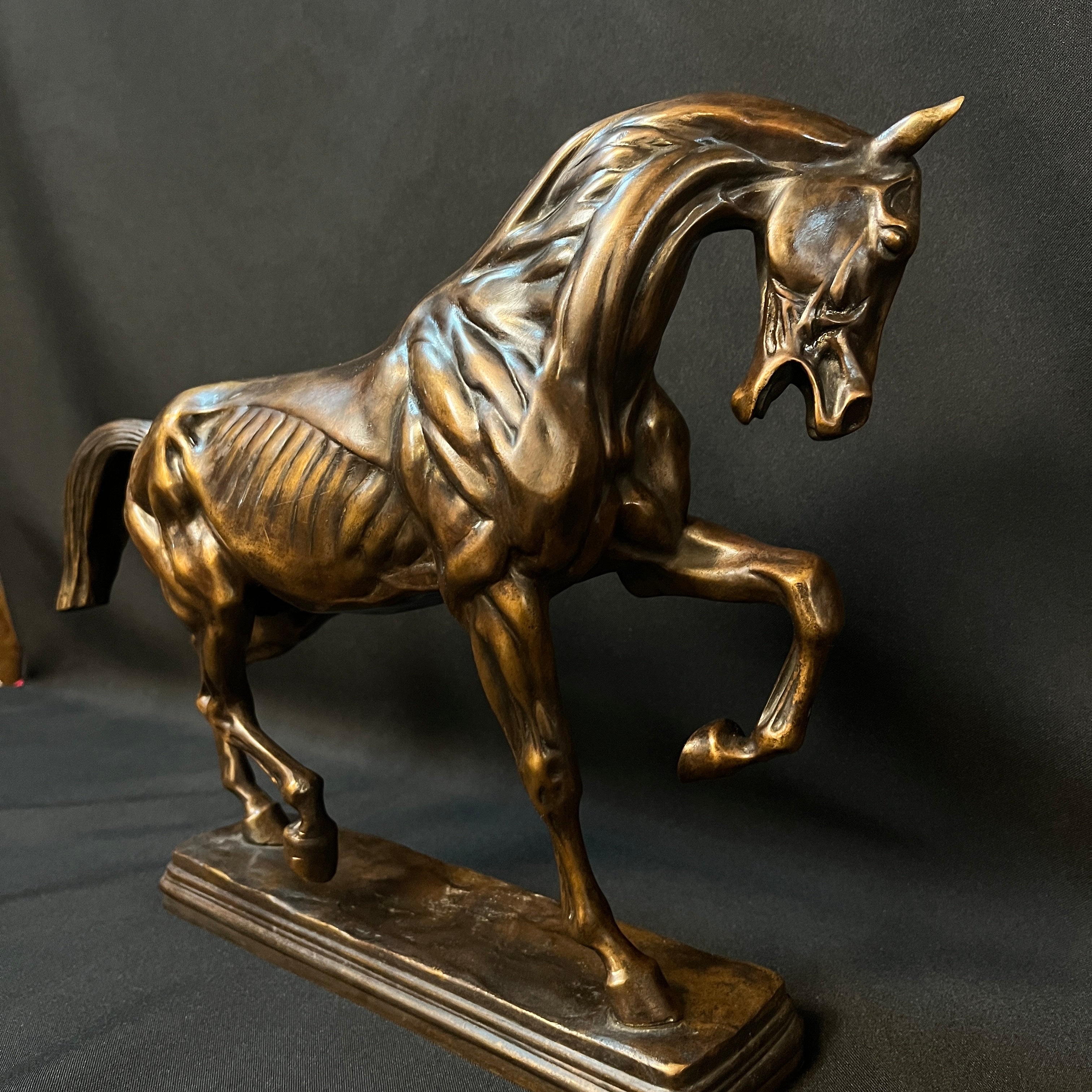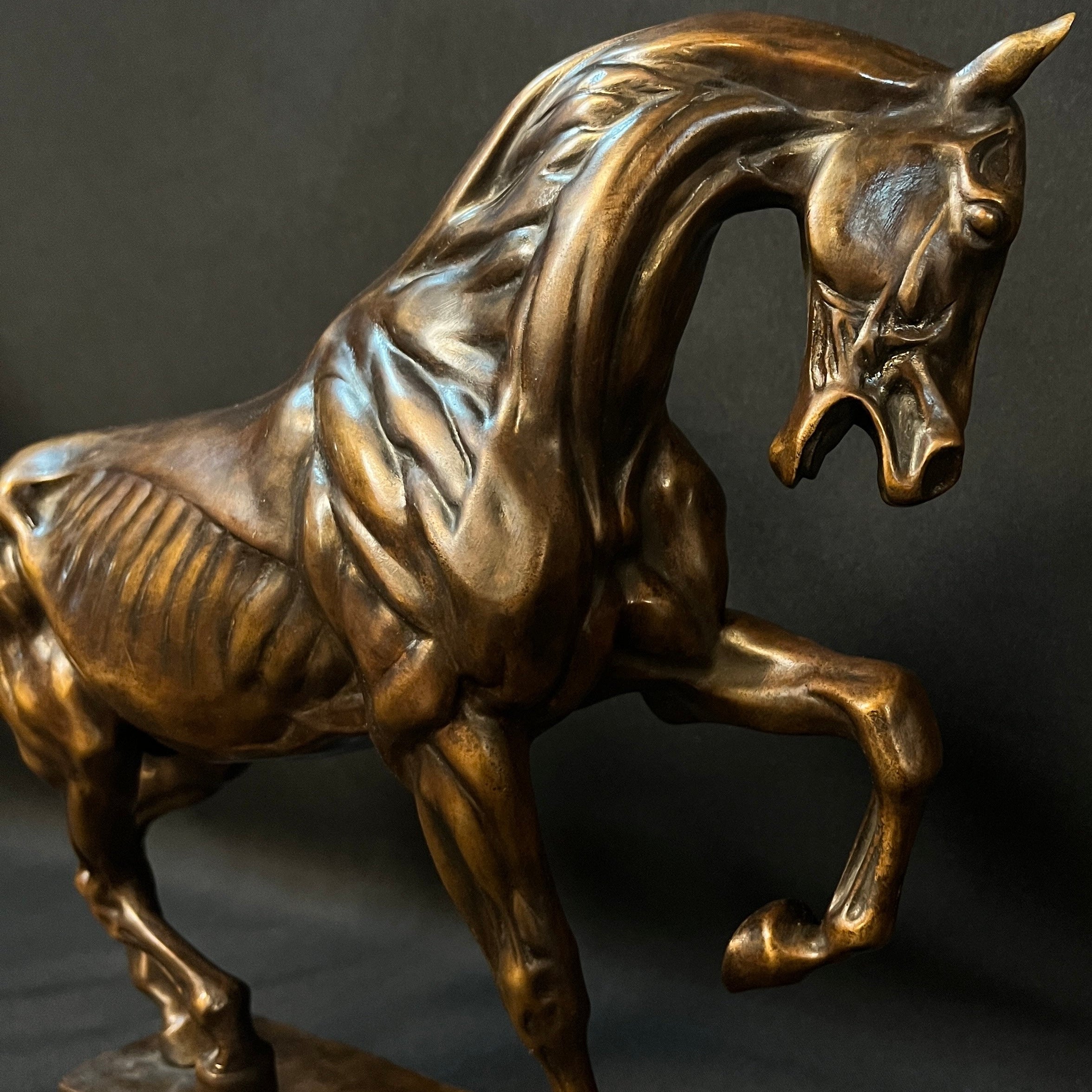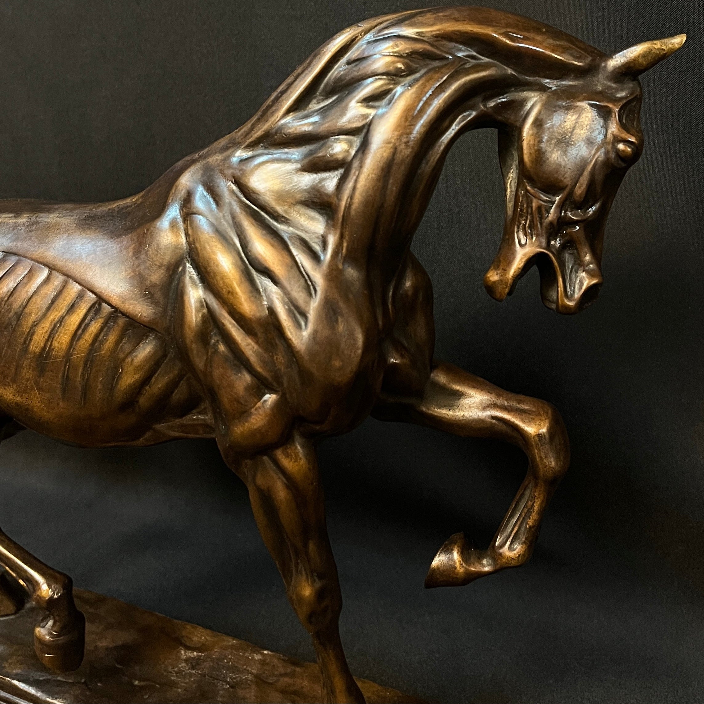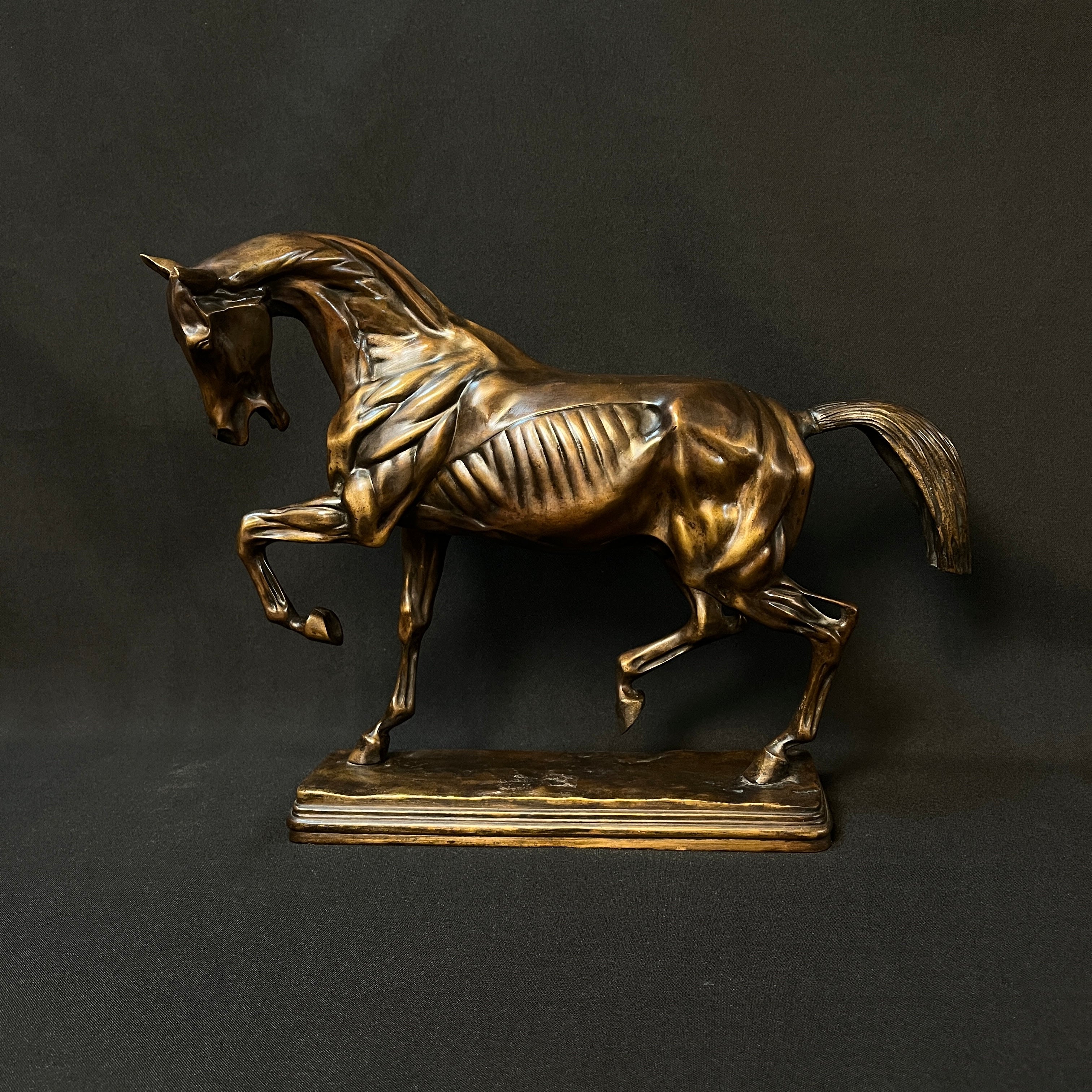 Espectacular escultura en bronce patinado que representa un caballo desollado, realizada con un notable nivel de detalle anatómico y gran realismo. La pieza muestra al animal en actitud de trote, sobre una base rectangular, destacando por la calidad de su modelado y su fuerza expresiva.