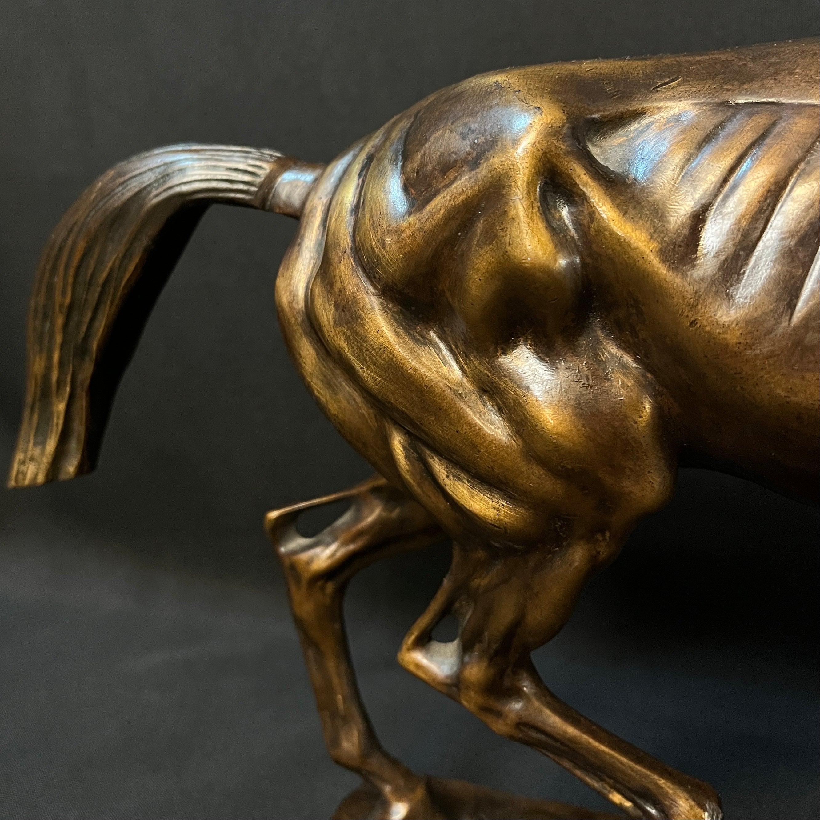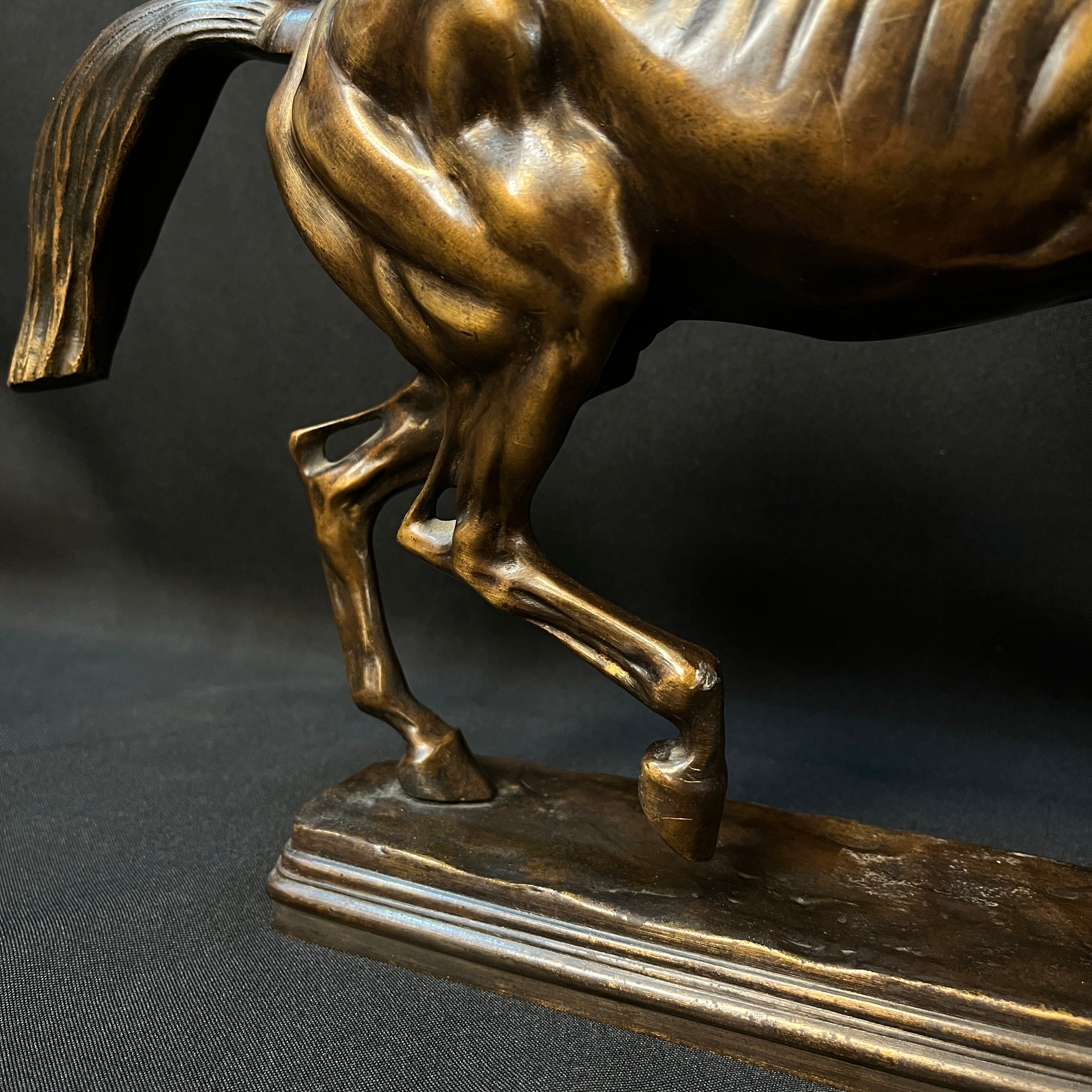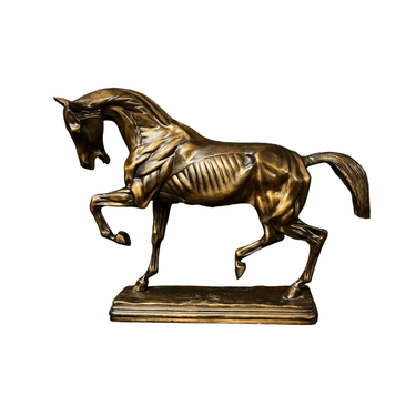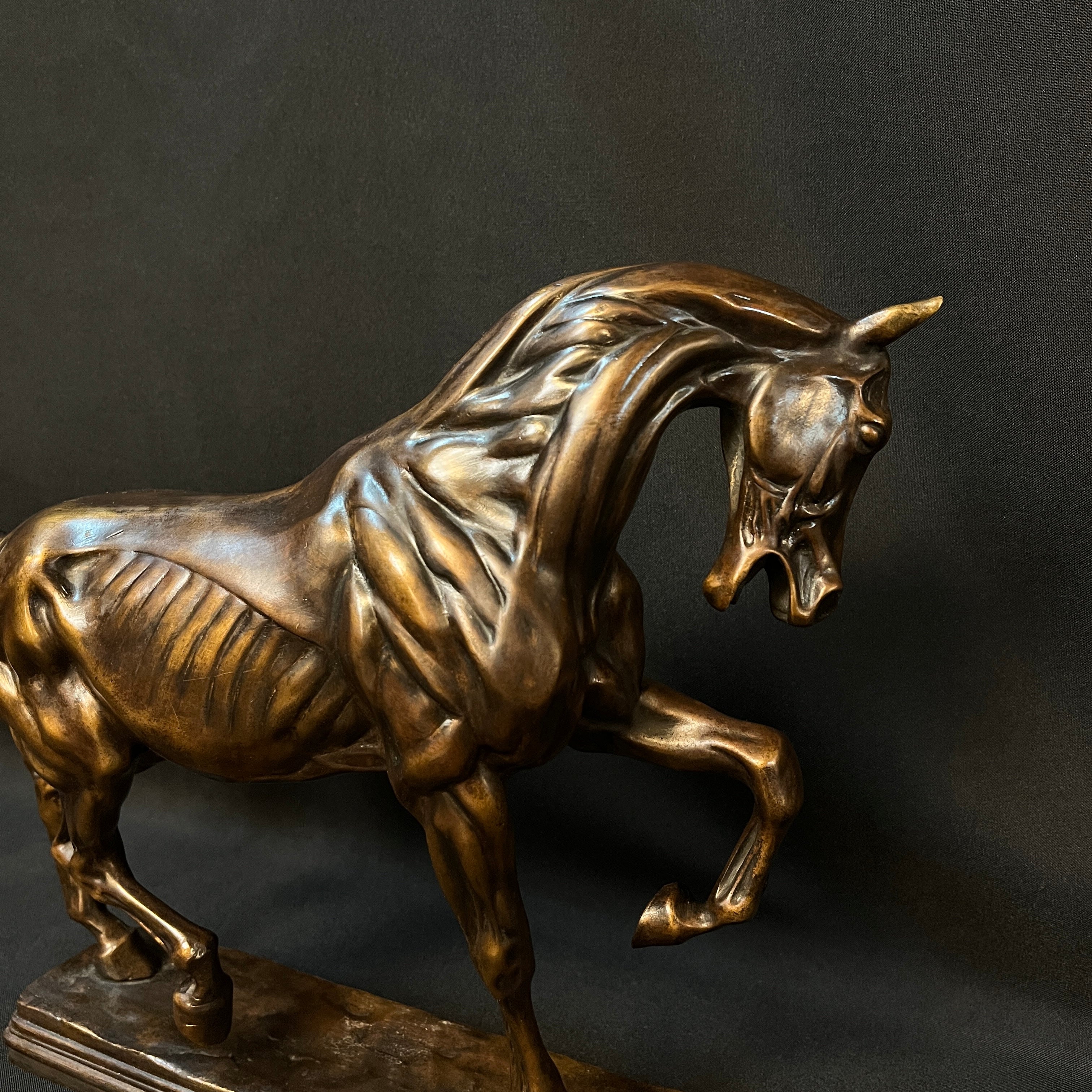 Espectacular escultura en bronce patinado que representa un caballo desollado, realizada con un notable nivel de detalle anatómico y gran realismo. La pieza muestra al animal en actitud de trote, sobre una base rectangular, destacando por la calidad de su modelado y su fuerza expresiva.
