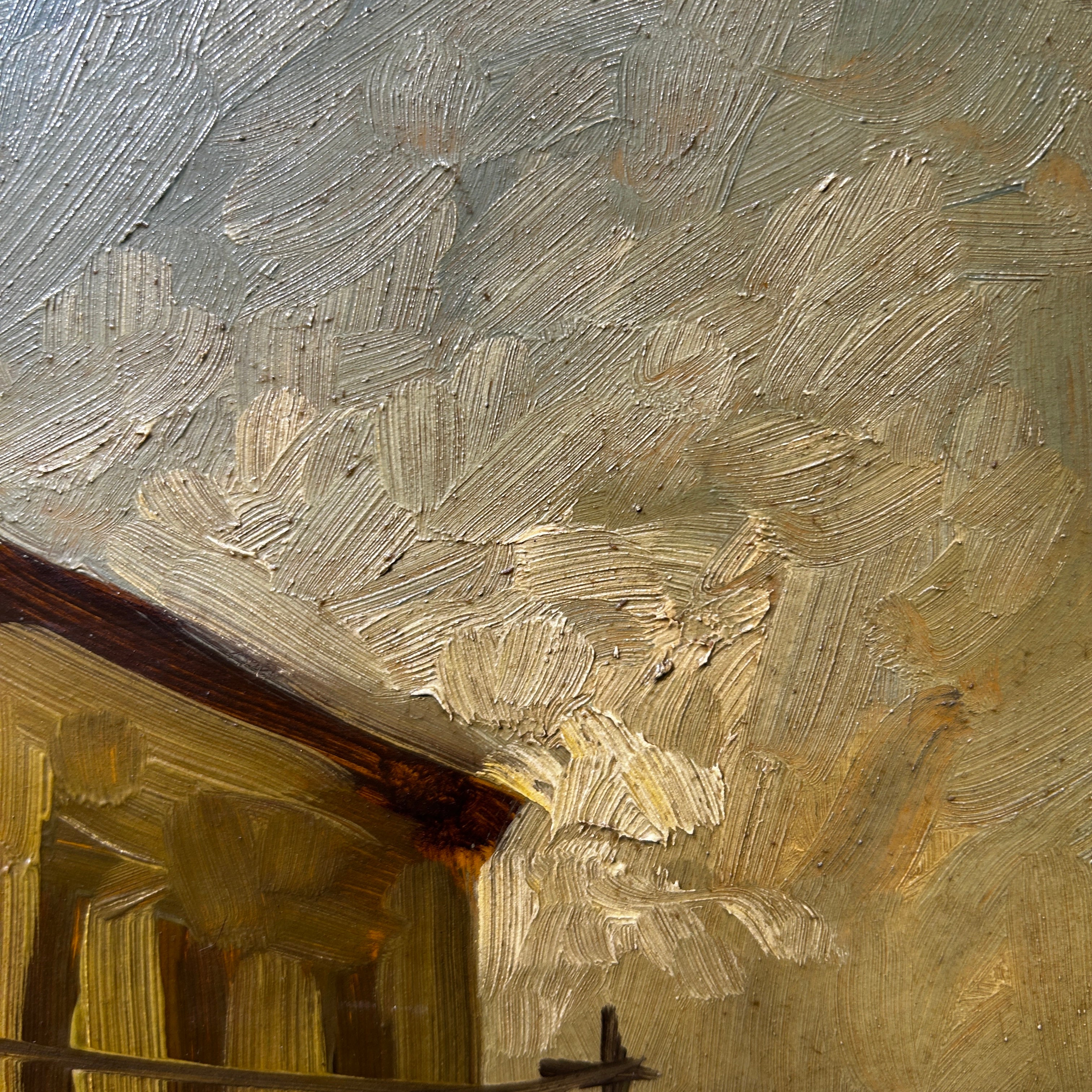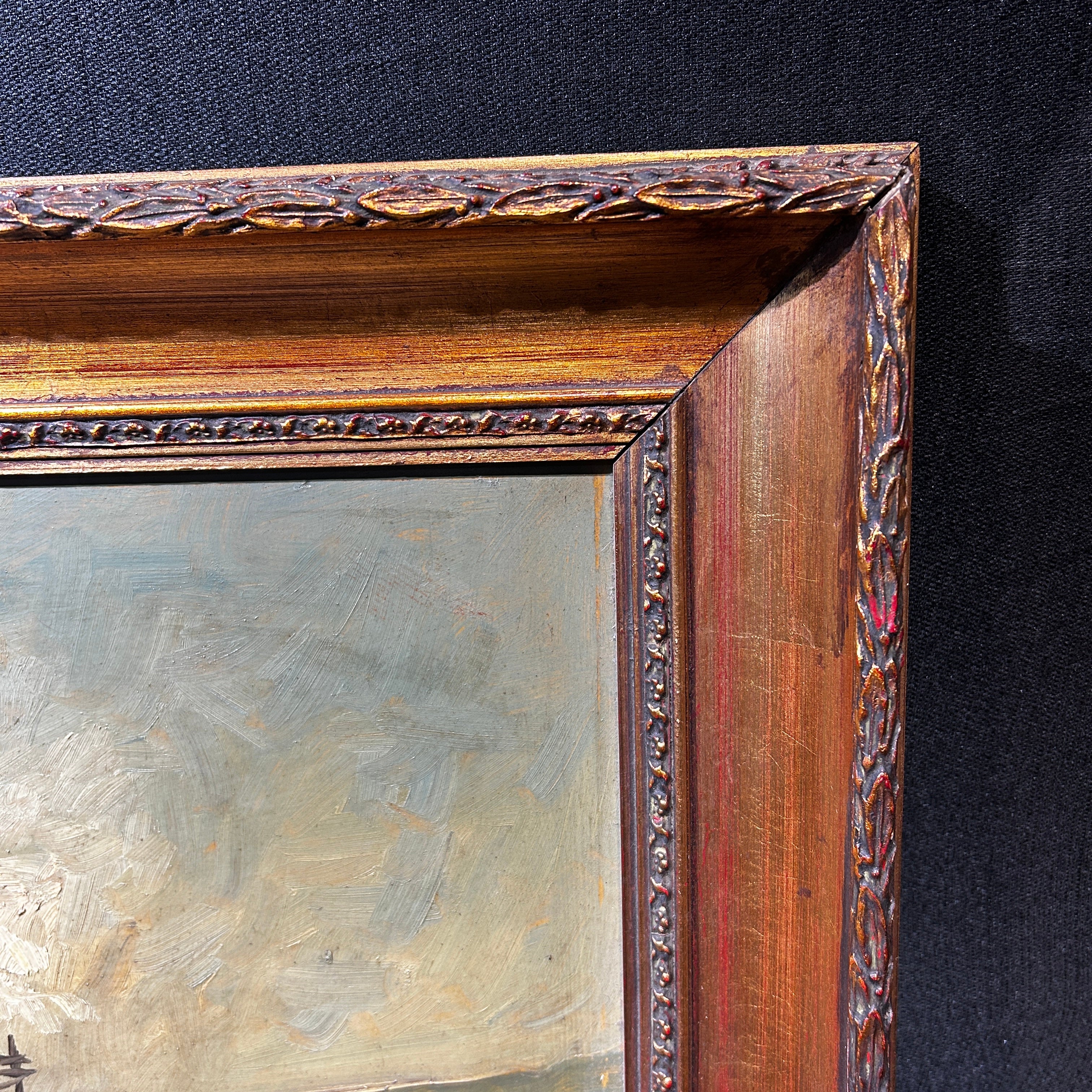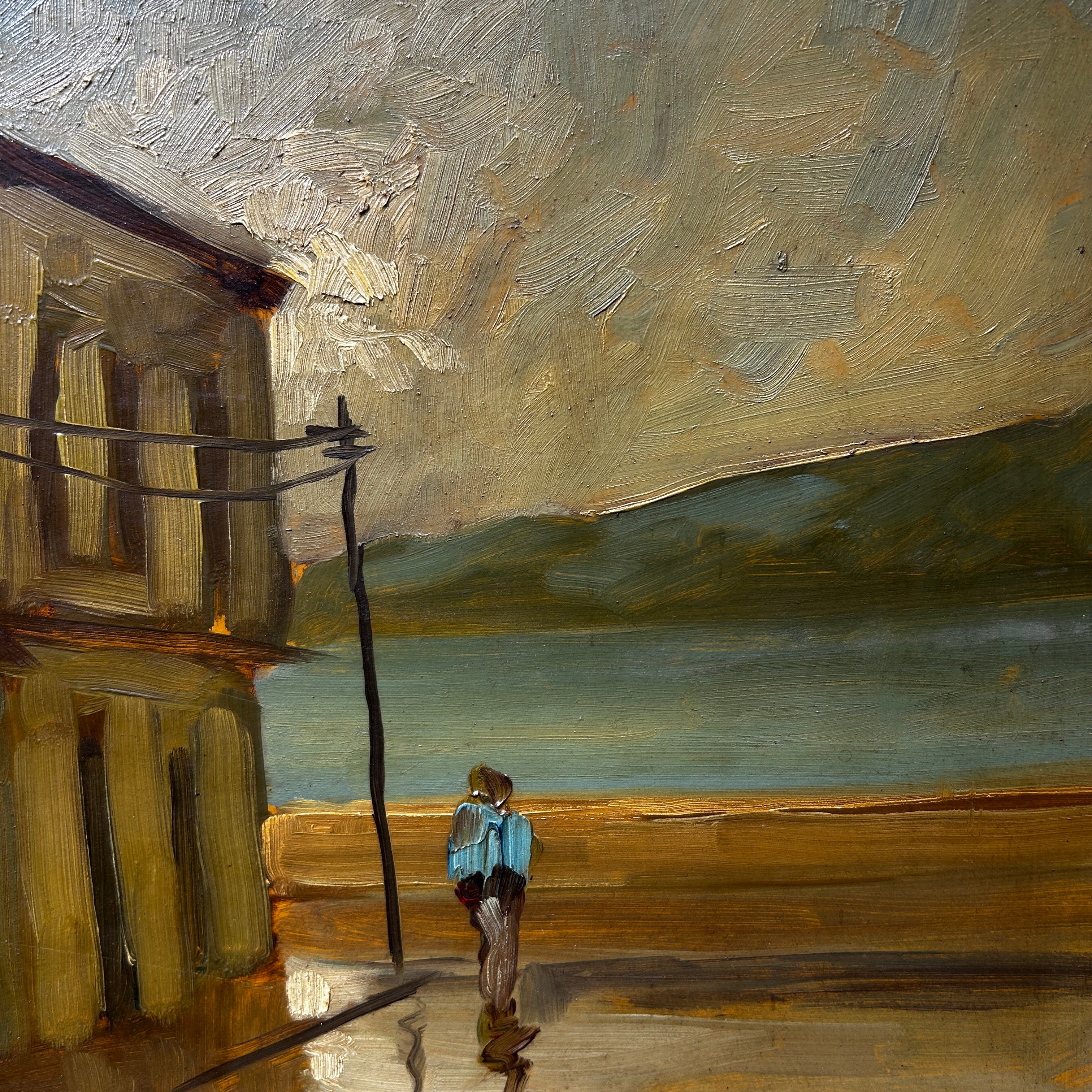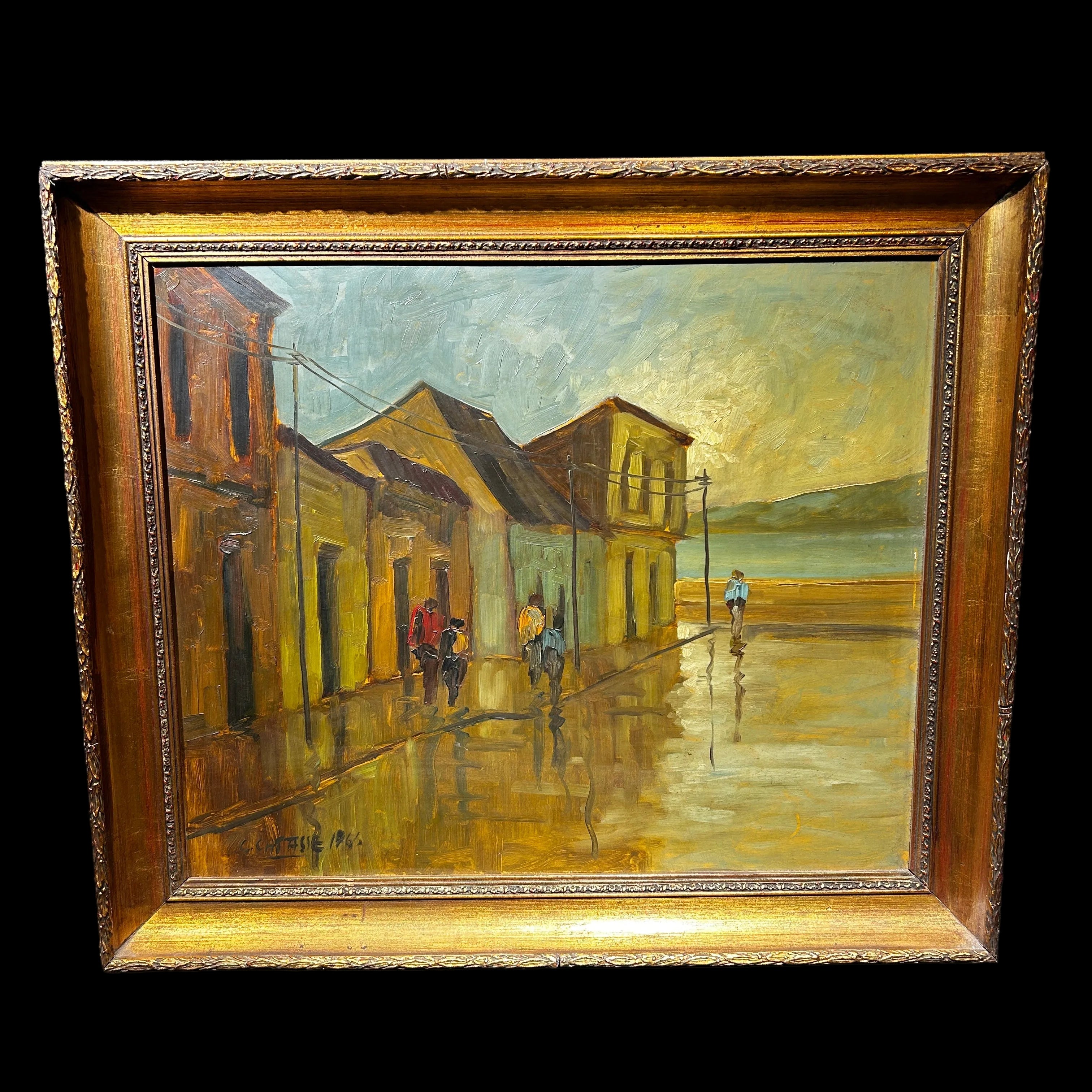 Óleo sobre tela del pintor chileno Carlos Tapia Sepúlveda, conocido como Catasse. Este óleo corresponde a una primera etapa de su obra, antes de radicarse en Ecuador. En ella podemos ver un típico paisaje costero de Chile, probablemente del sur, reconocible por sus casitas coloridas, los días más nublados, y el horizonte abierto. Podemos ver algunos personajes caminando y el reflejo de las calles mojadas. La obra tiene un marco de madera tallada en relieves sutiles y terminada en dorado.