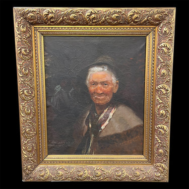 Óleo sobre tela del pintor Carlos Ewerbeck, retratando a un hombre viejo mirando directamente hacia el frente. El hombre que tiene un cigarrillo en su boca y lleva sombrero y poncho, es retratado con detalle, capturando un gesto de cierta dureza, dignidad y profundidad. Detrás se puede apreciar otra figura menos nítida, que da cuenta de un contexto que sugiere que este personaje no está solo, sino que se encuentra inmerso en un ambiente social o en el trabajo, haciendo que el retrato se vuelva un recorte de la realidad en la que se captura un instante cotidiano que nos permite conectar íntimamente con este sujeto. La obra está enmarcada en madera tallada de relieves y terminada en luminoso dorado, haciendo buen contraste con la luz tenue de la obra. En la parte inferior, además de la firma del pintor, se lee: “Hombre sano de 78 años, Leñador de la cordillera.”