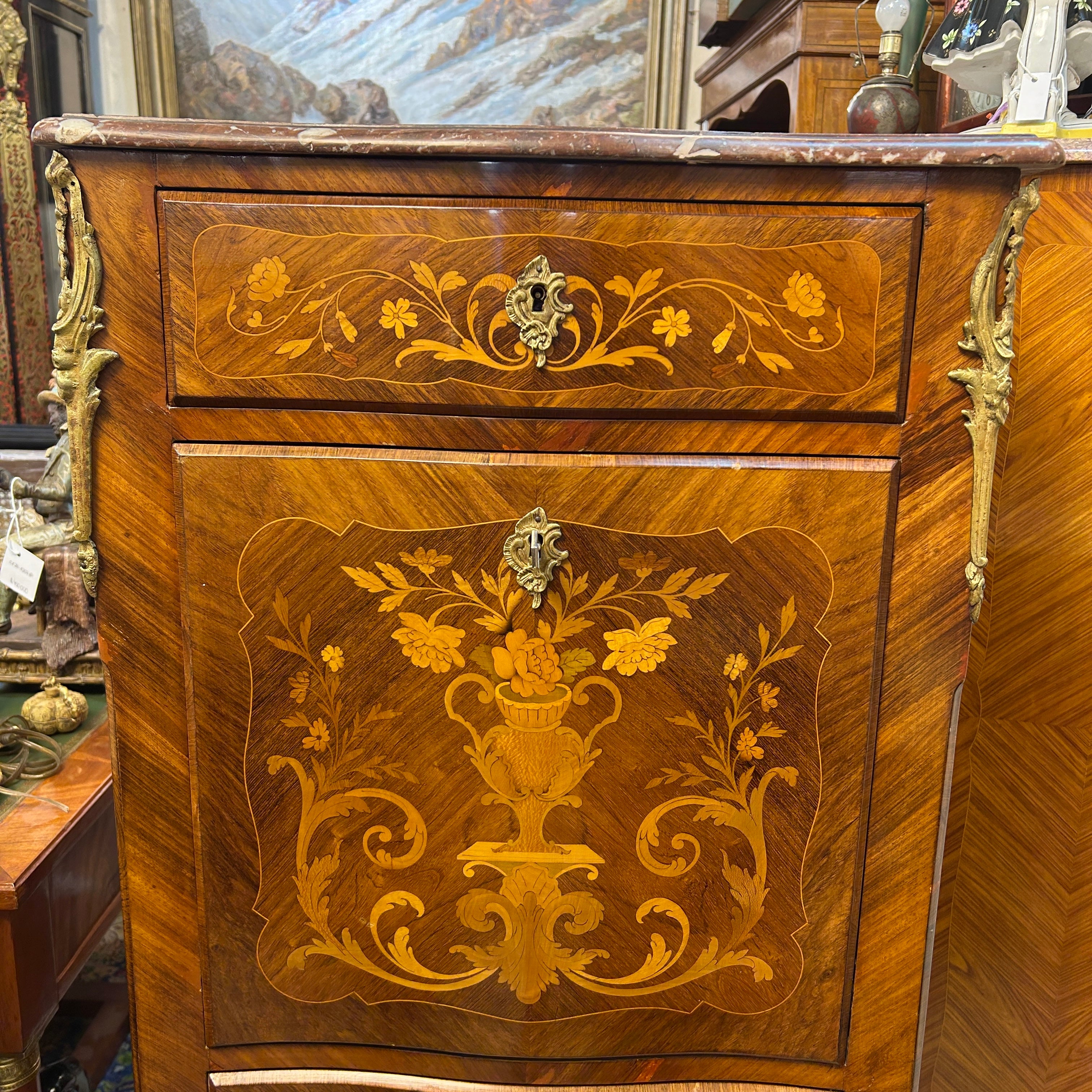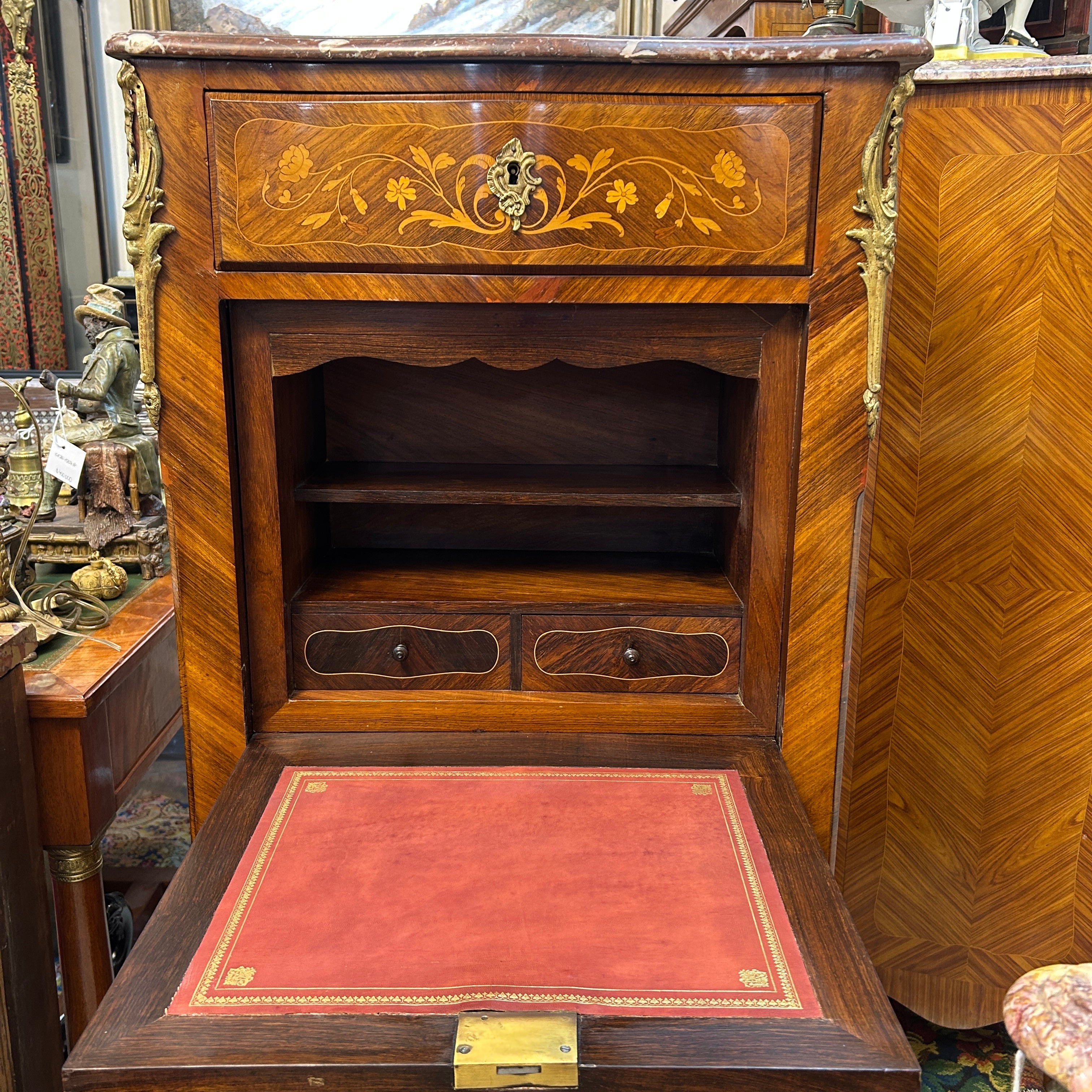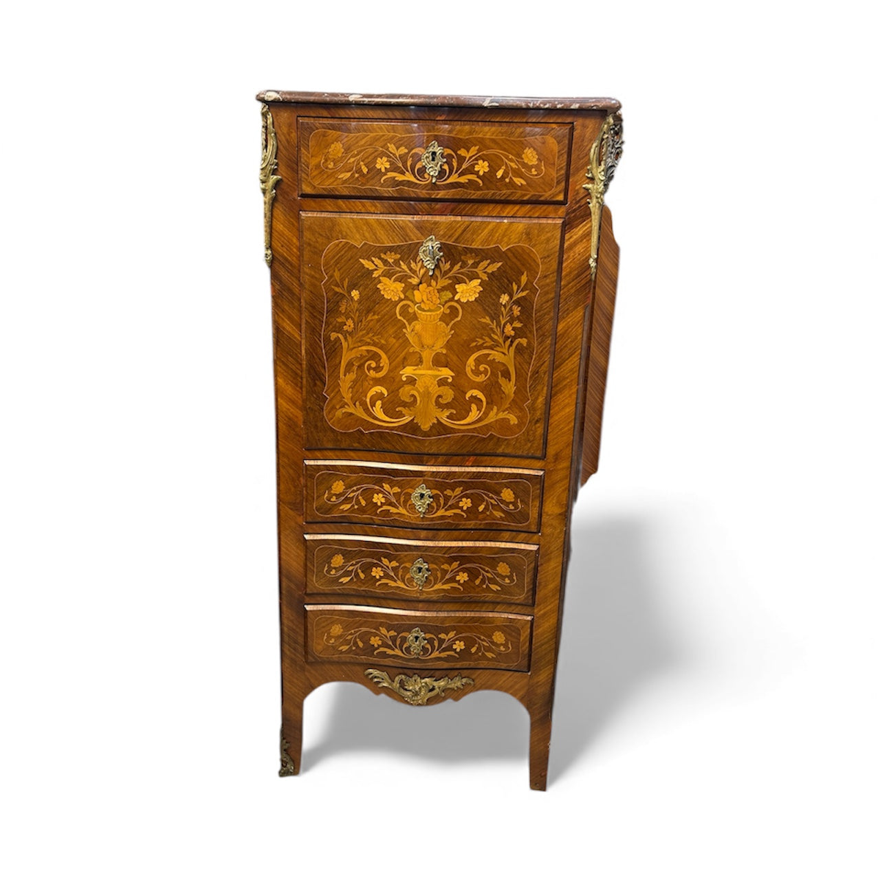 Chiffonier estilo Luis XVI, alto y estrecho. Contiene cuatro cajones, una mesa plegable con superficie de cuero con dos cajones pequeños en su interior y cubierta superior de mármol. Detallado diseño central en marquetería y detalles en bronce. Viene con el mármol original restaurado.