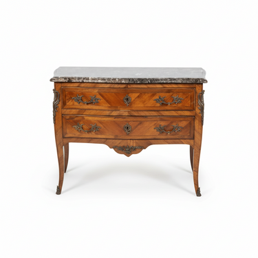 Cómoda estilo Luis XV en madera de placaje, dos cajones, cuatro patas cabriolé, cubierta de mármol.