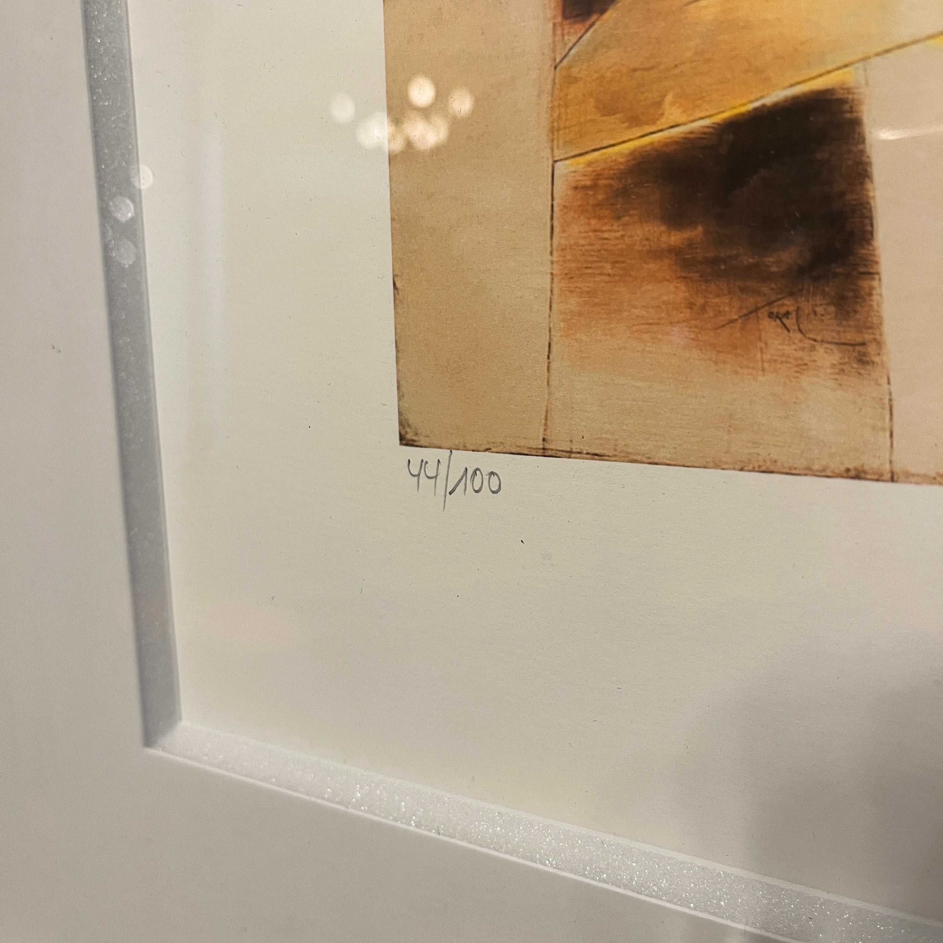 Impresión digital en técnica Glicleé del reconocido artista chileno Mario Toral. La obra, firmada y numerada con el ejemplar 44/100, representa un cuerpo recostado frente a 4 figuras que hacen una descomposición formal de una columna, yendo desde una figura abstracta y geométrica, hasta la representación reconocible de una columna de estilo clásico. Se trata de un estudio de una figura fundamental en la historia del arte y la arquitectura, atravesada por el cuerpo humano, tema recurrente en la obra de Toral.