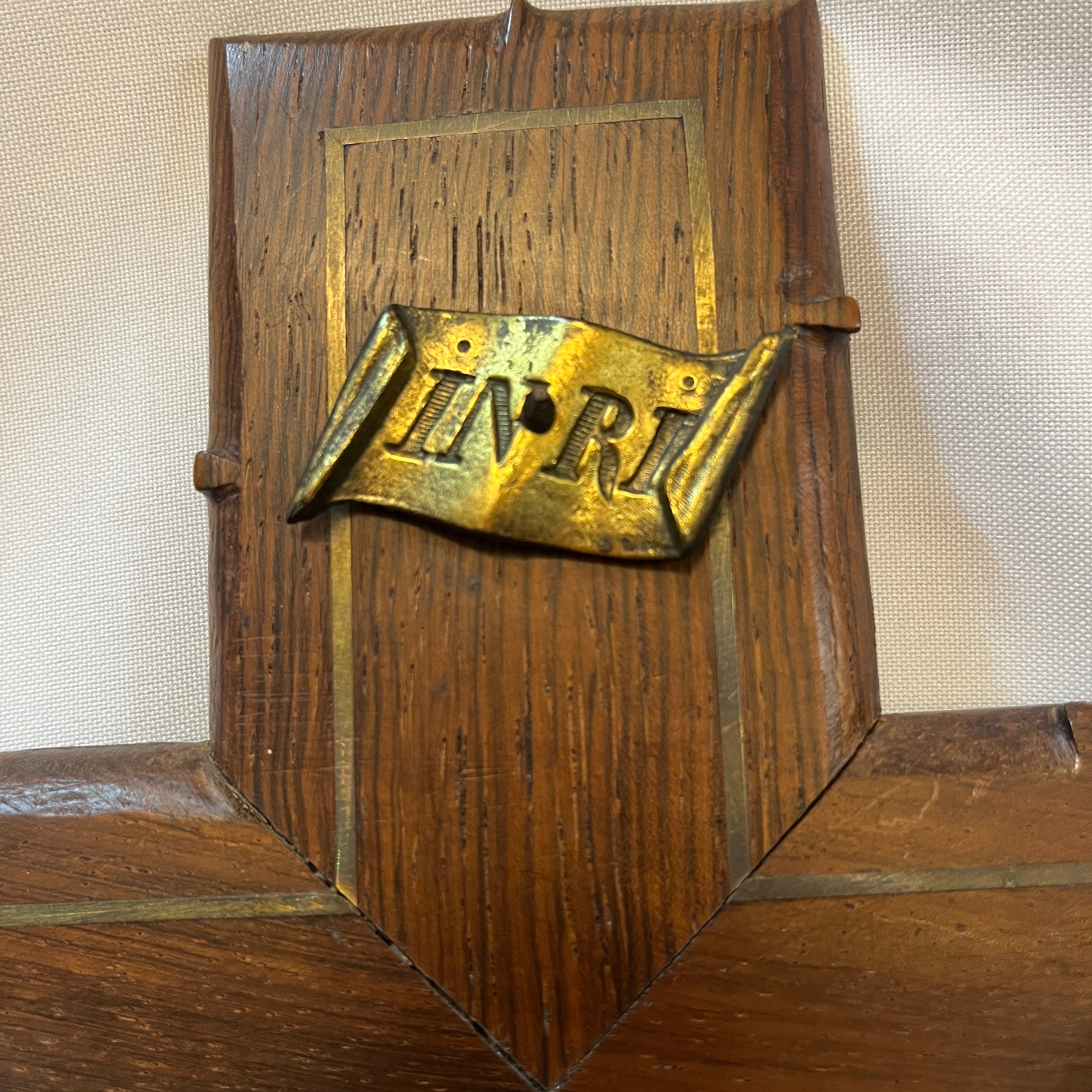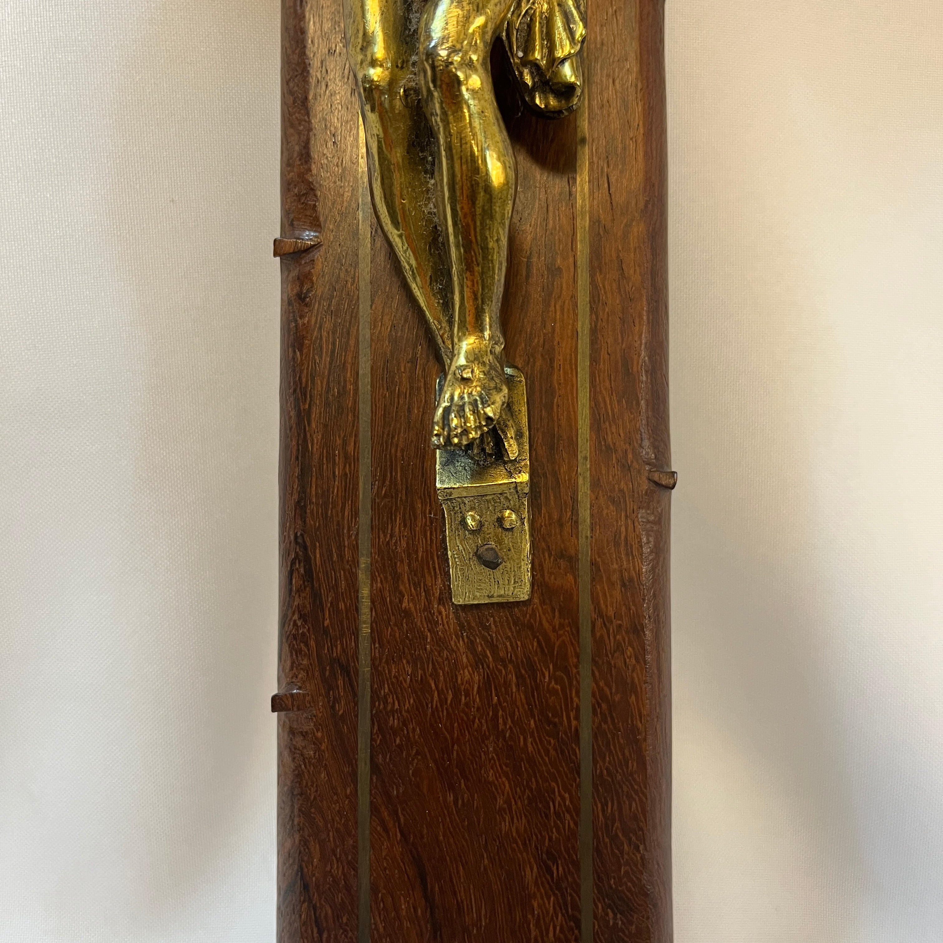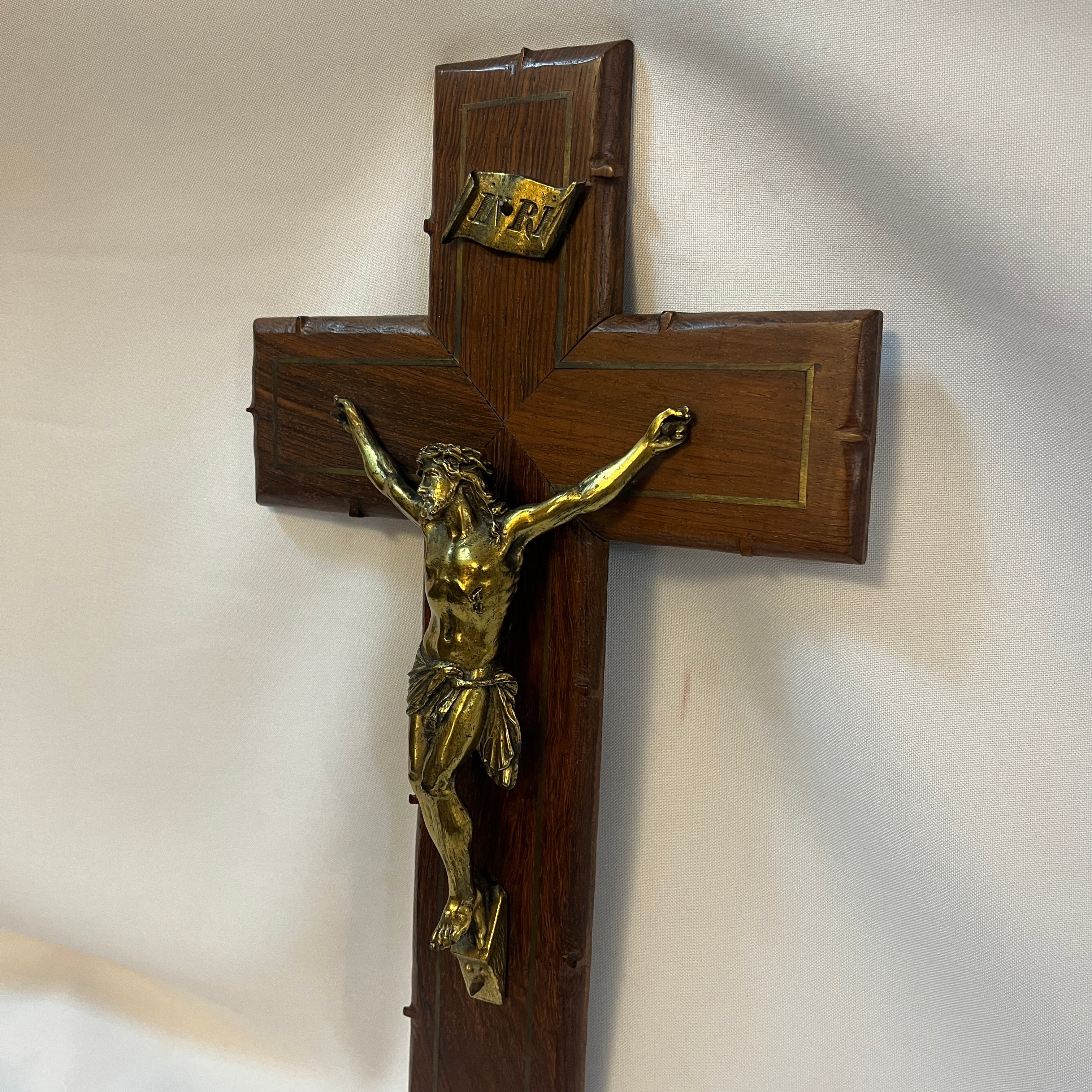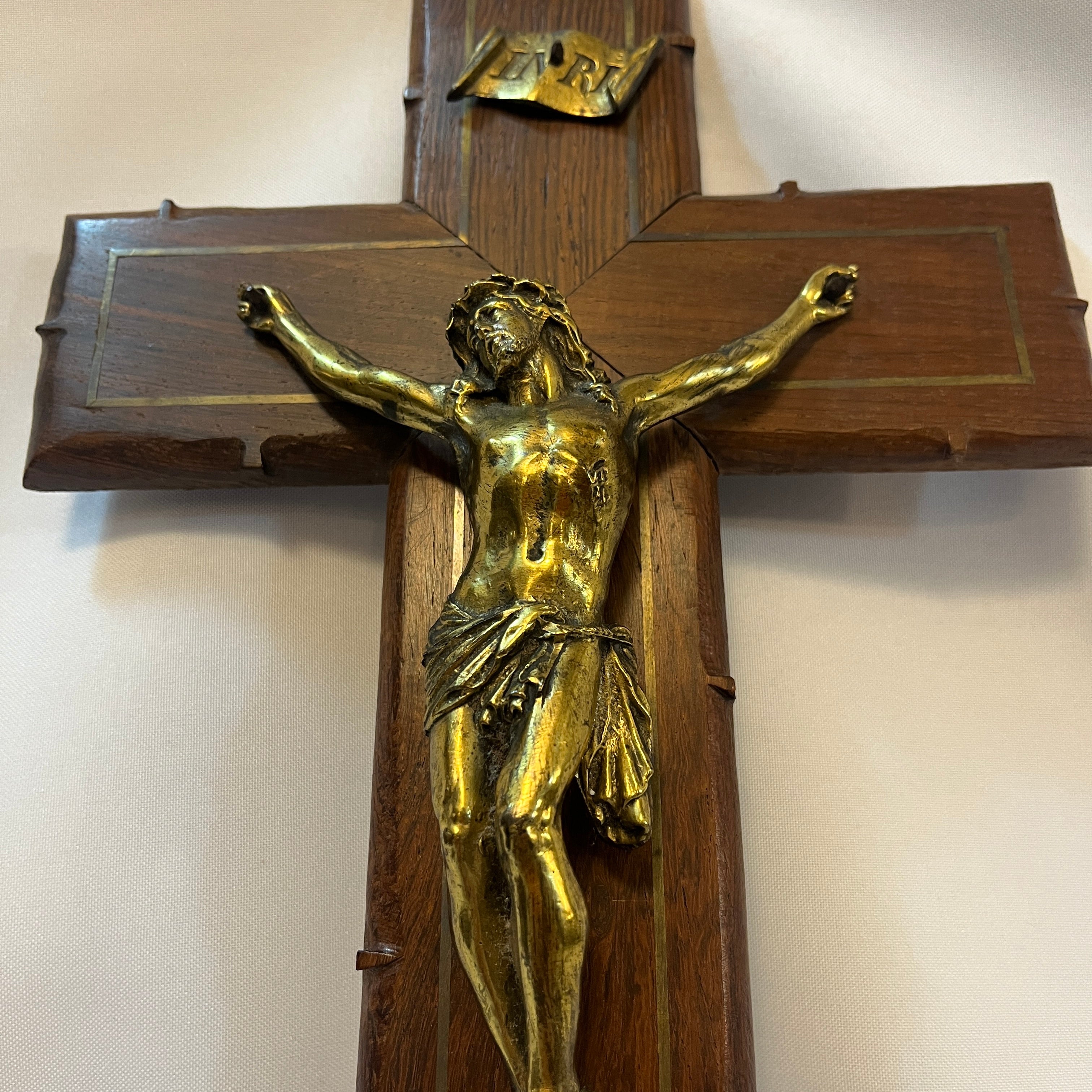 Crucifijo francés de pared, realizado en fina madera caoba maciza con borde decorativo. Figura de Cristo imponente y símbolo de “INRI” fundida en bronce dorado y trabajado con notable detalle anatómico y expresivo, responde a la sensibilidad devocional propia del arte religioso francés del período.