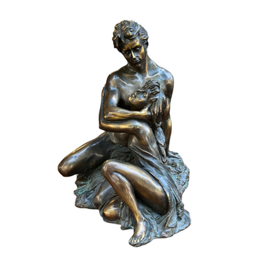 Bellísima escultura en bronce de origen europeo, representando a una pareja abrazándose, con un gesto tierno y entregado. La figura cincelada captura las texturas de la roca sobre la que están sentados, la tela que los cubre, su pelo y su figura, dando cuenta de un fino y detallado trabajo en el esculpido.