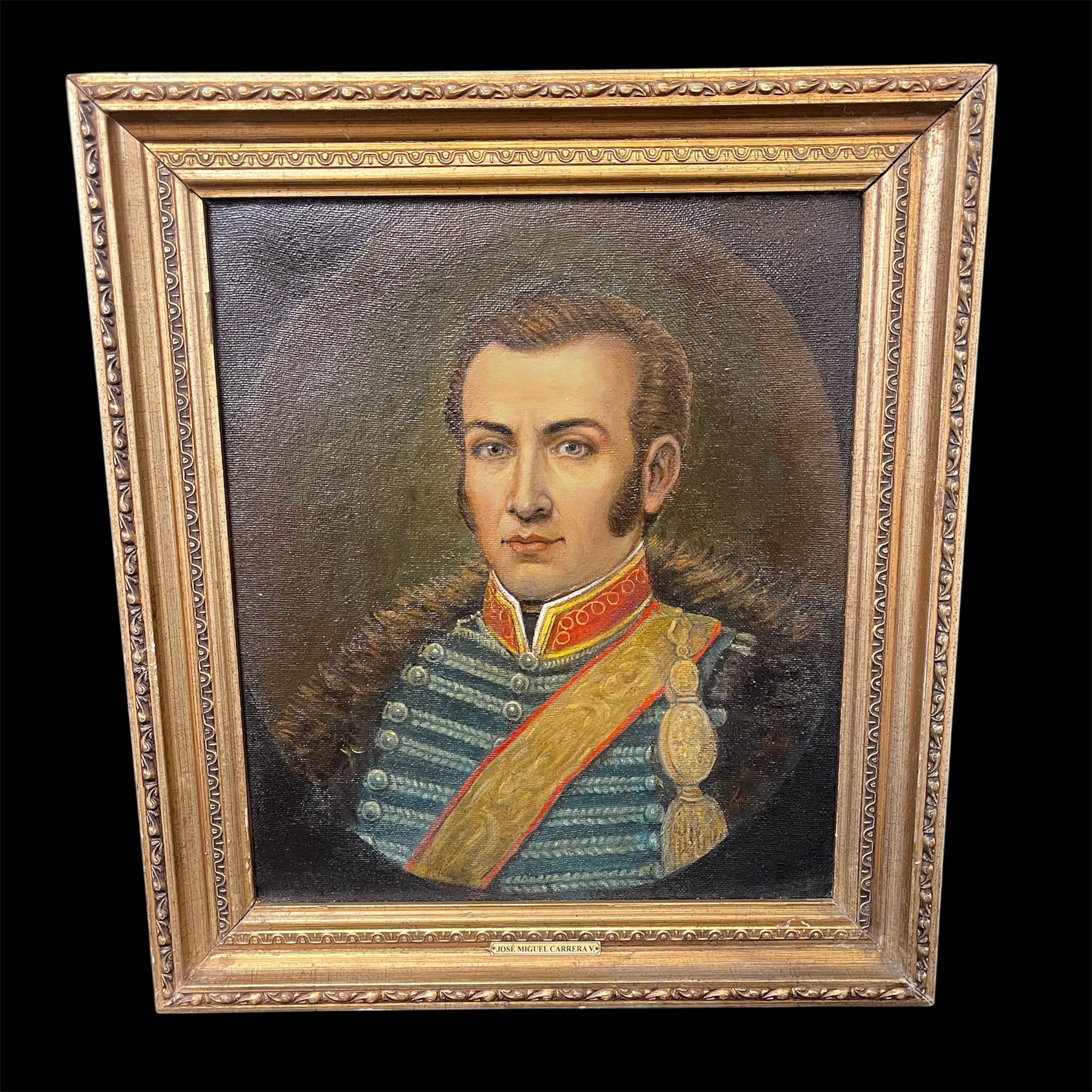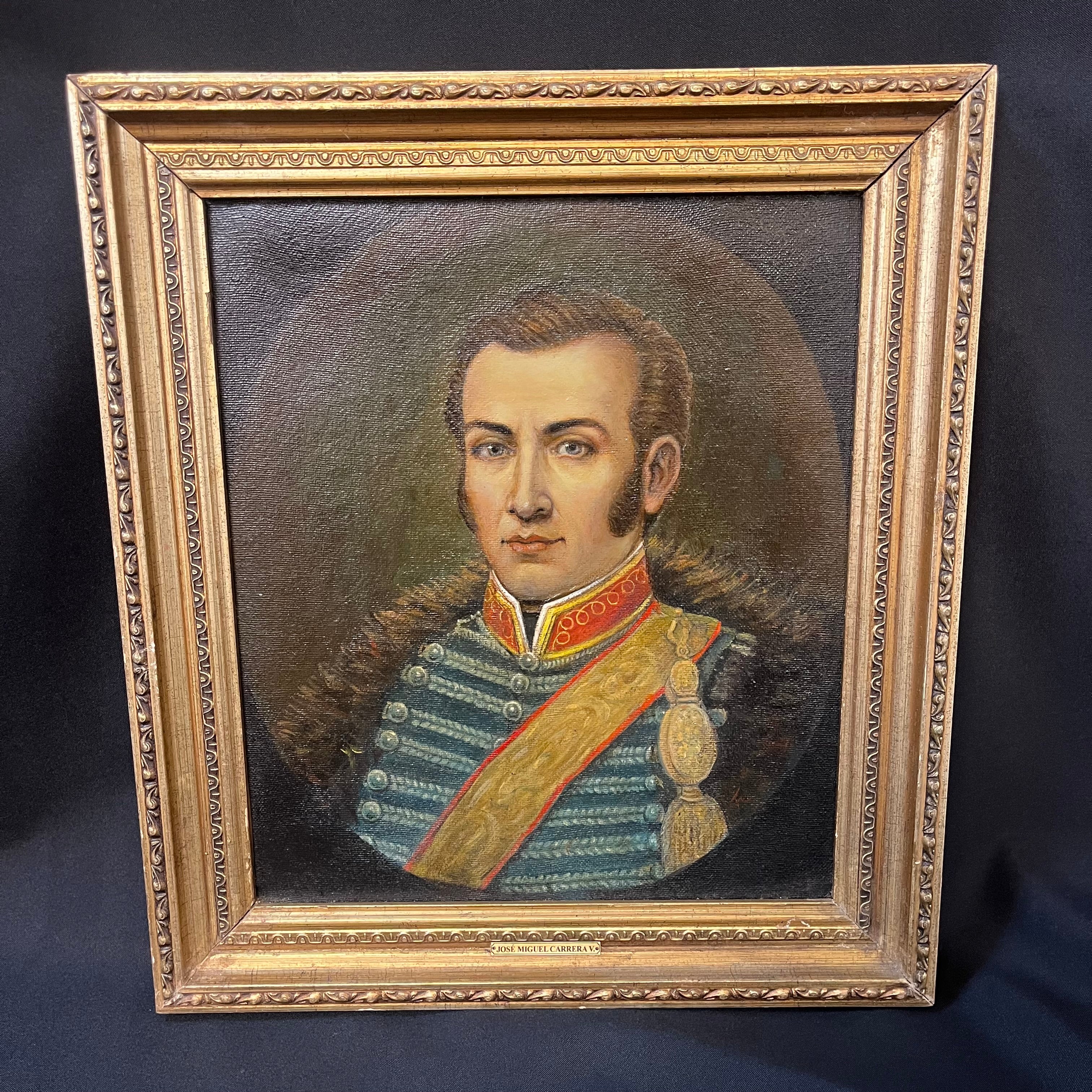 Óleo sobre tela del pintor chileno Fernando Ruiz, retratando a José Miguel Carrera. La obra tiene un marco de madera dorada, tallada en relieves decorativos.
