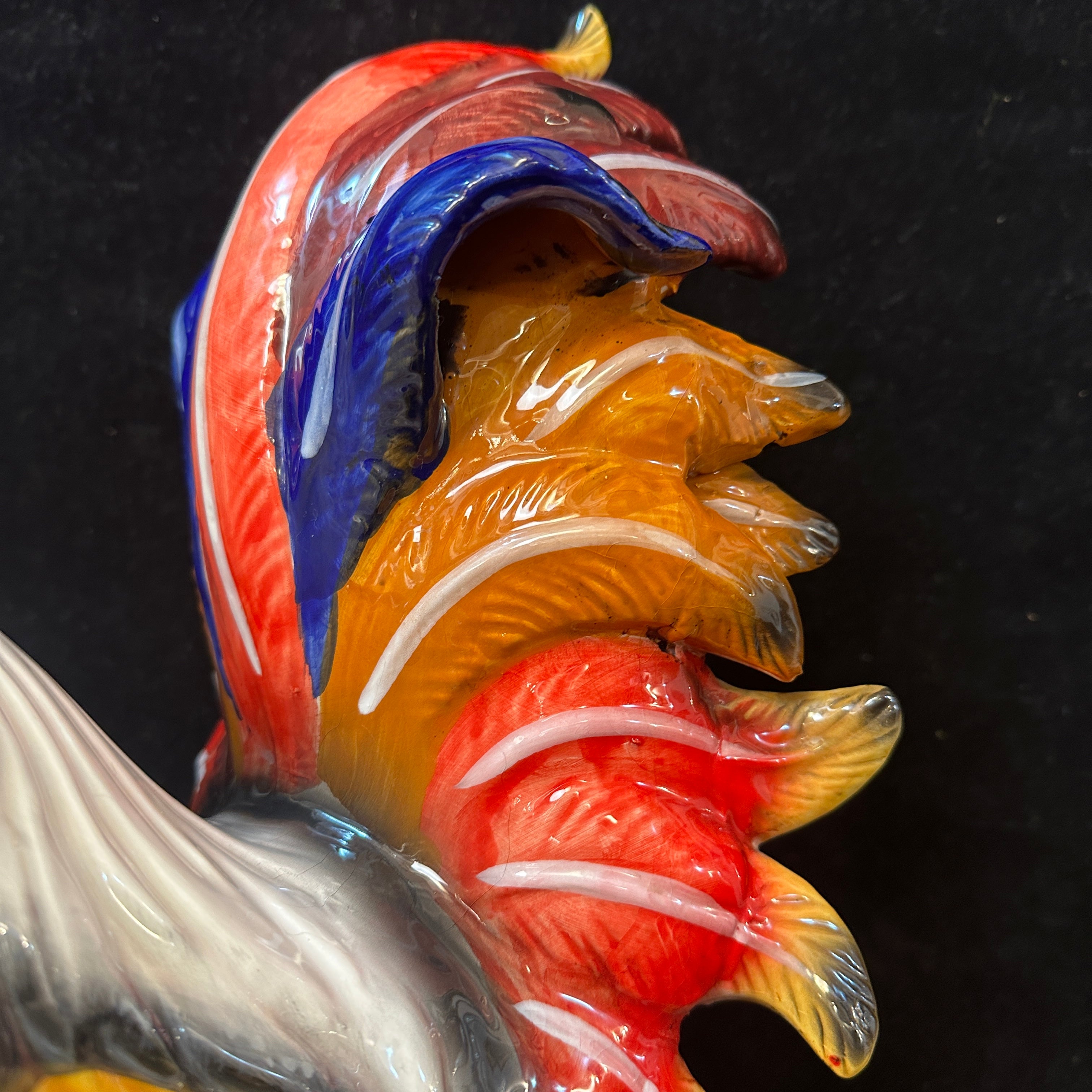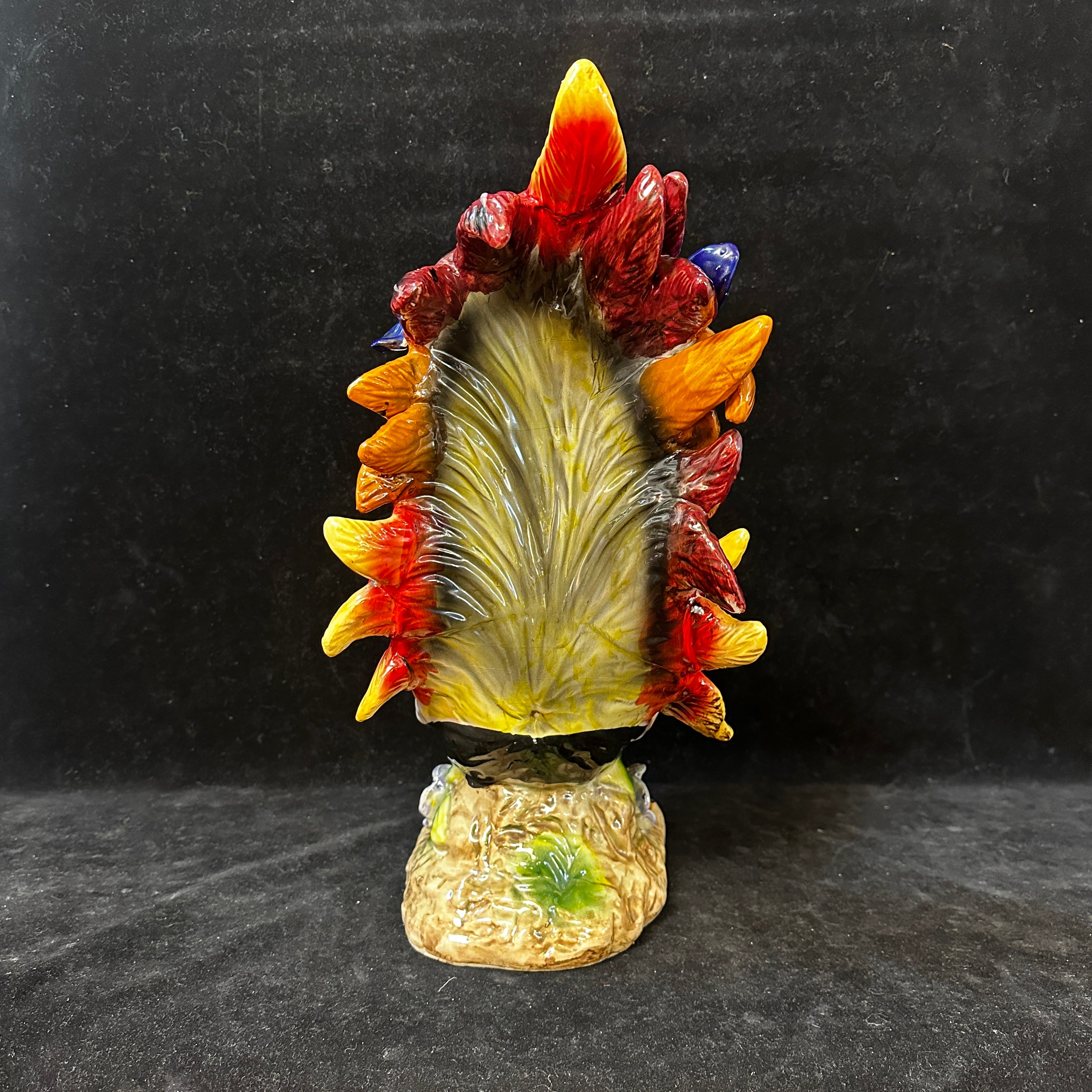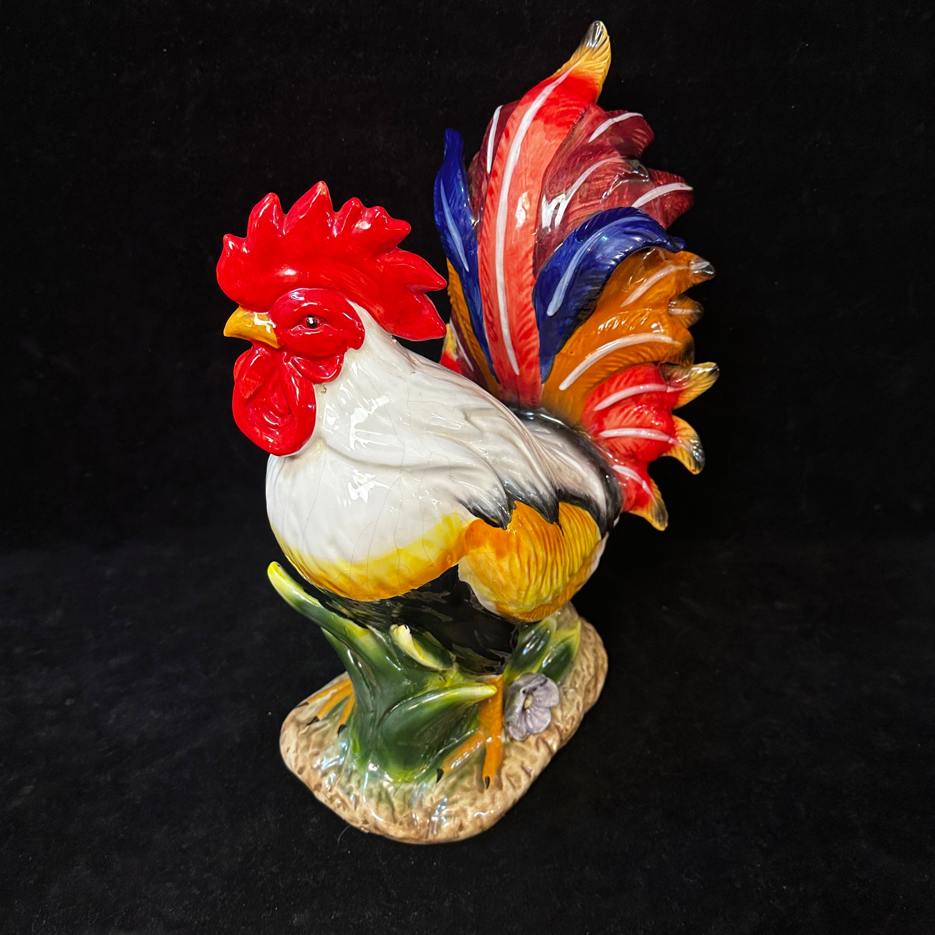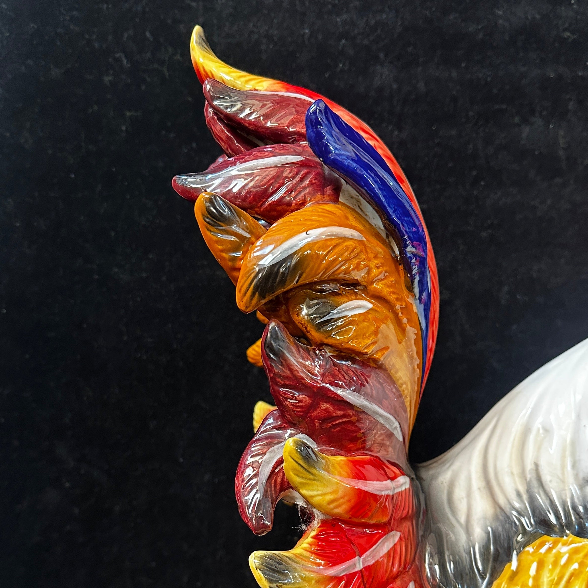 Hermosa figura de porcelana mayólica francesa representando una Gallo. El plumaje de la cola presenta intensos y variados colores, además del vivo rojo de la cresta.