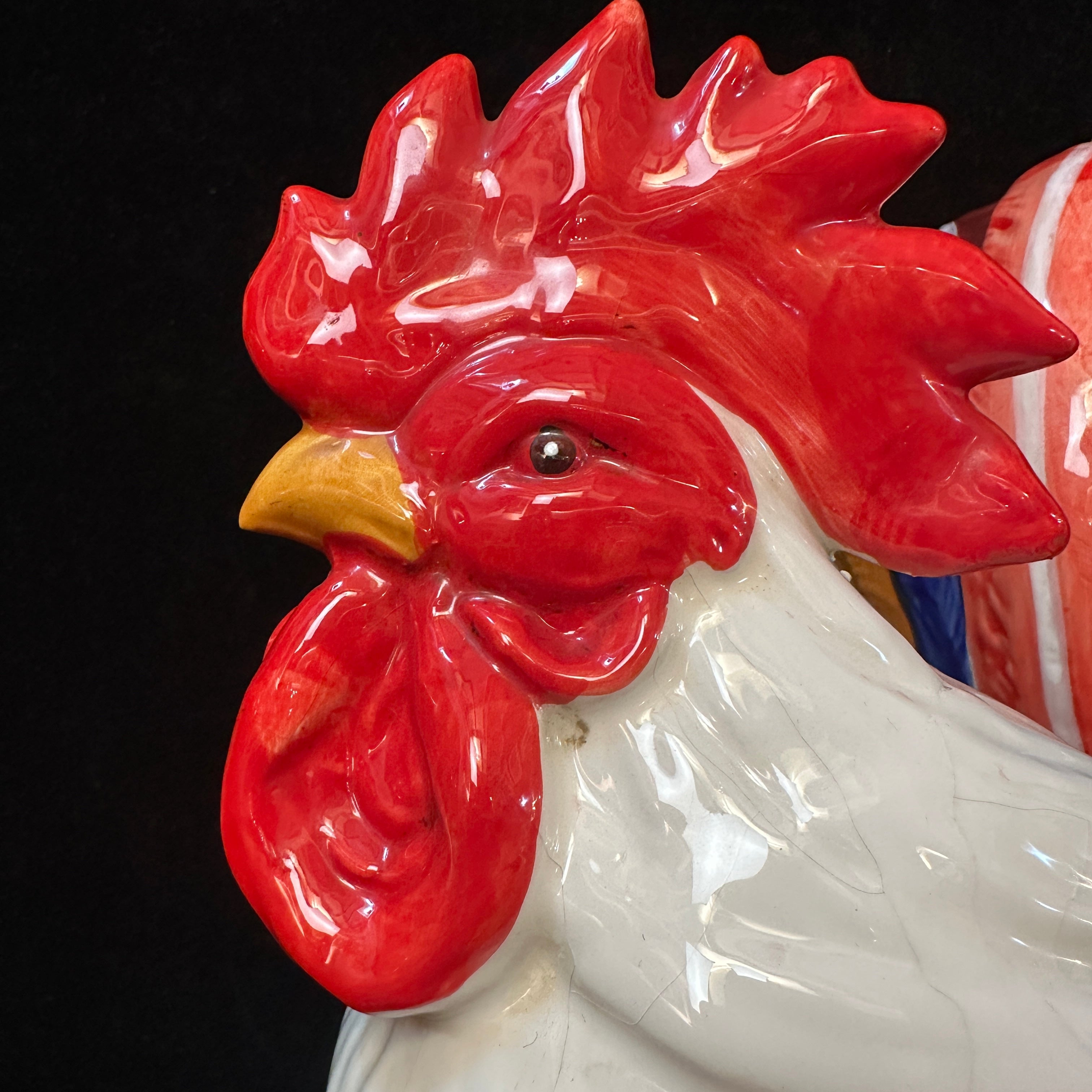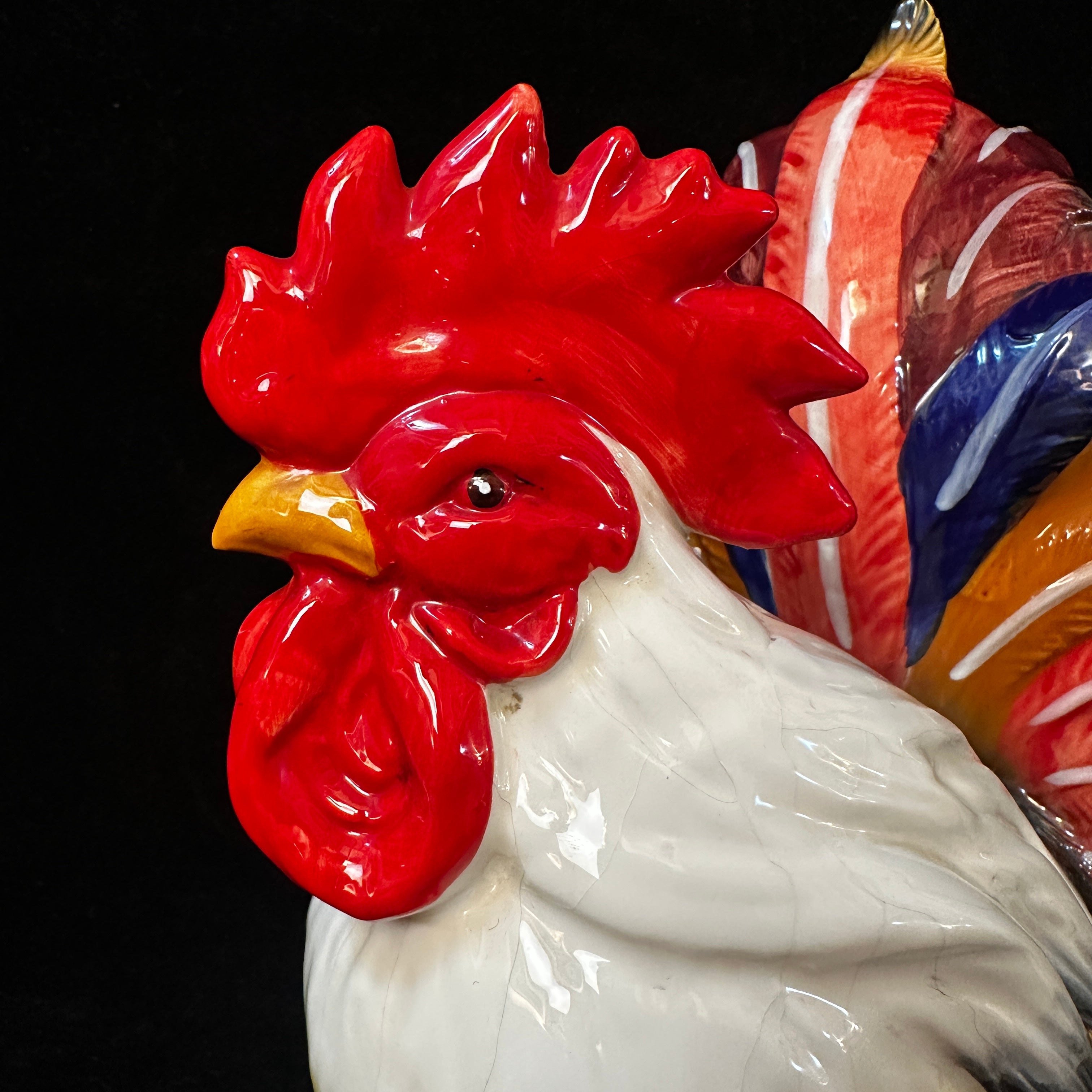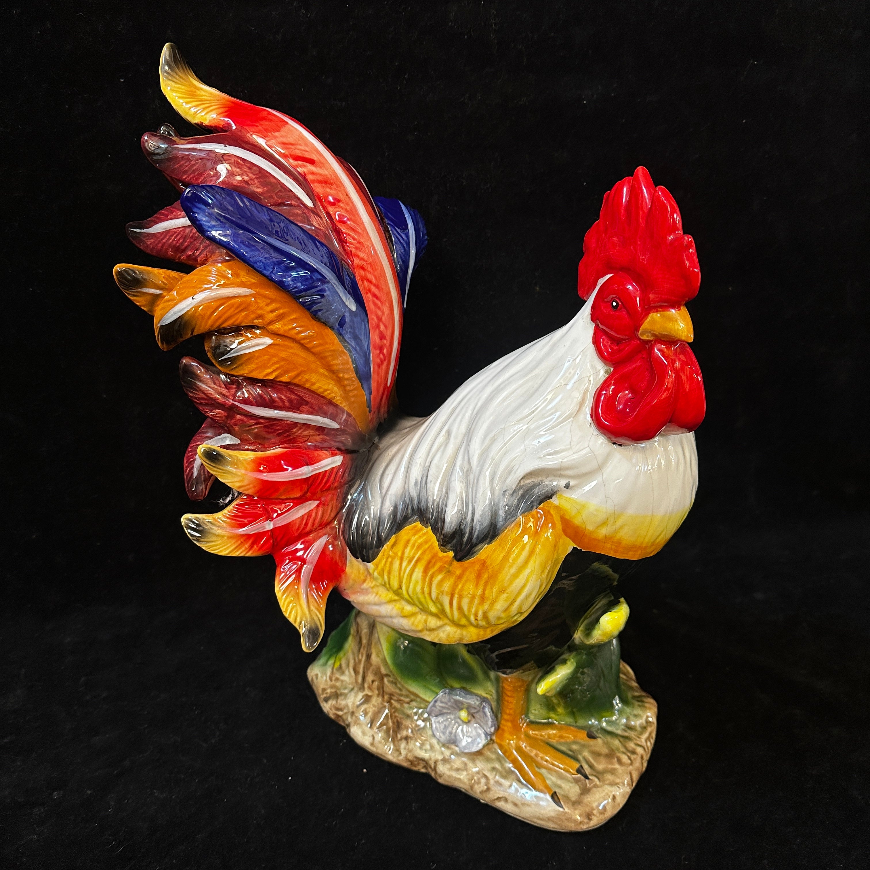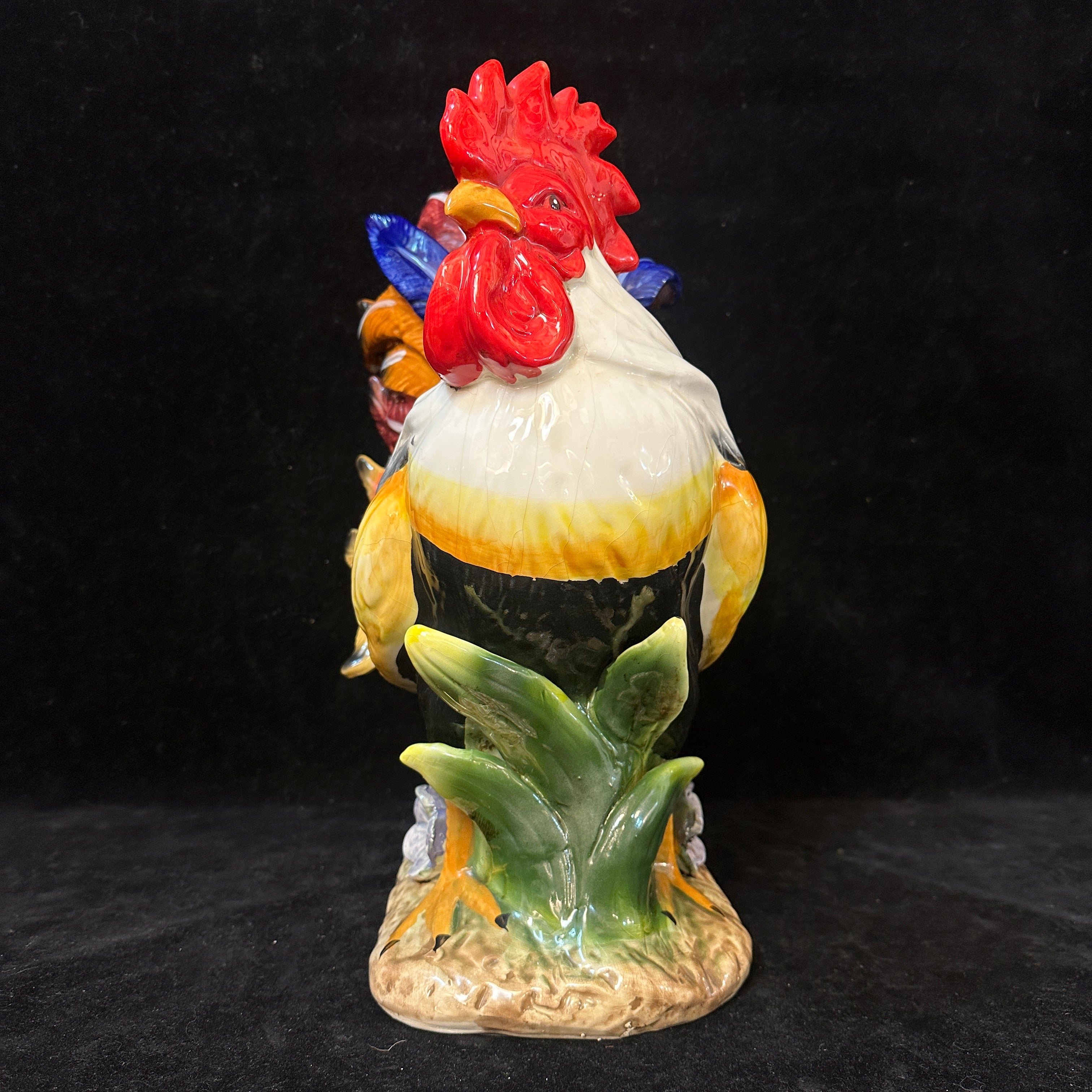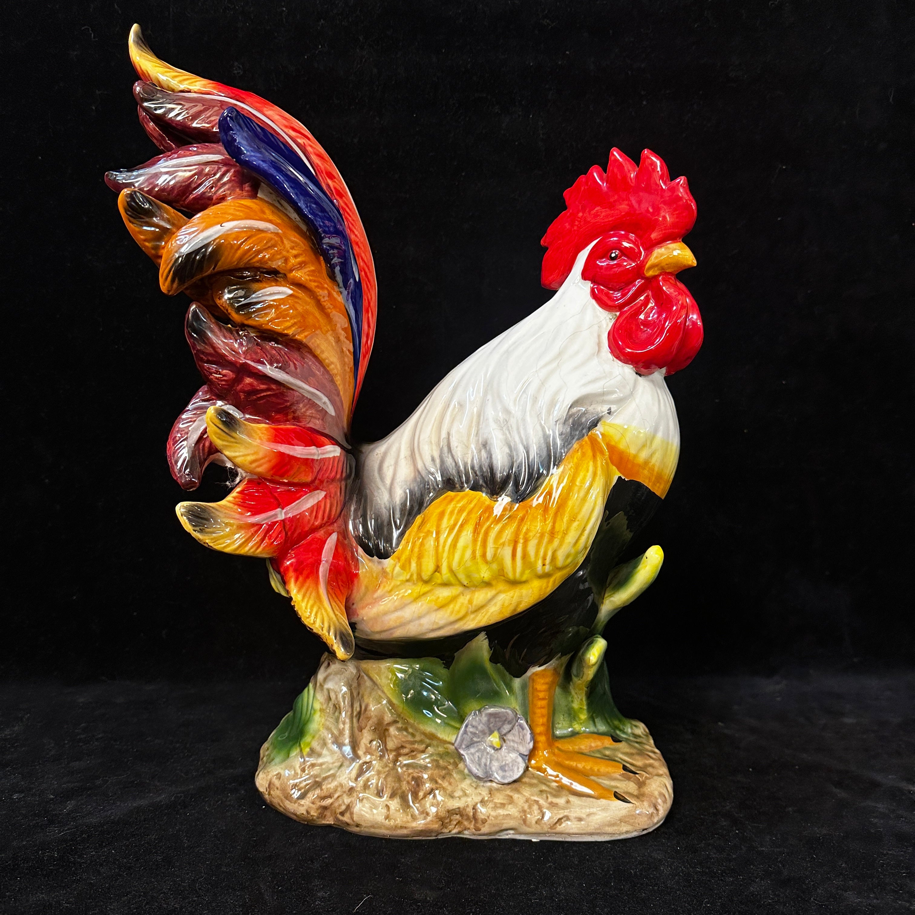 Hermosa figura de porcelana mayólica francesa representando una Gallo. El plumaje de la cola presenta intensos y variados colores, además del vivo rojo de la cresta.