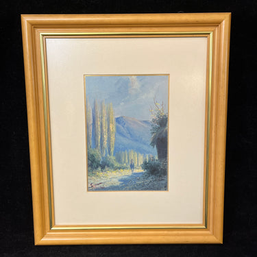 Óleo sobre tela del pintor chileno Florencio Vial (1875-1950), representando un paisaje pre cordillerano en el que un jinete atraviesa la escena en un camino de tierra y piedrecitas, seguramente el lecho de un río, con vegetación a su alrededor y la imponente cordillera de fondo. Esta obra se inserta en en la obra total del reconocido pintor, que se dedicó a capturar la zona central y la Cordillera de Los Andes de forma romántica, delicada y con cierta lejanía. La obra tiene un marco contemporáneo de madera con un decorado de borde dorado.