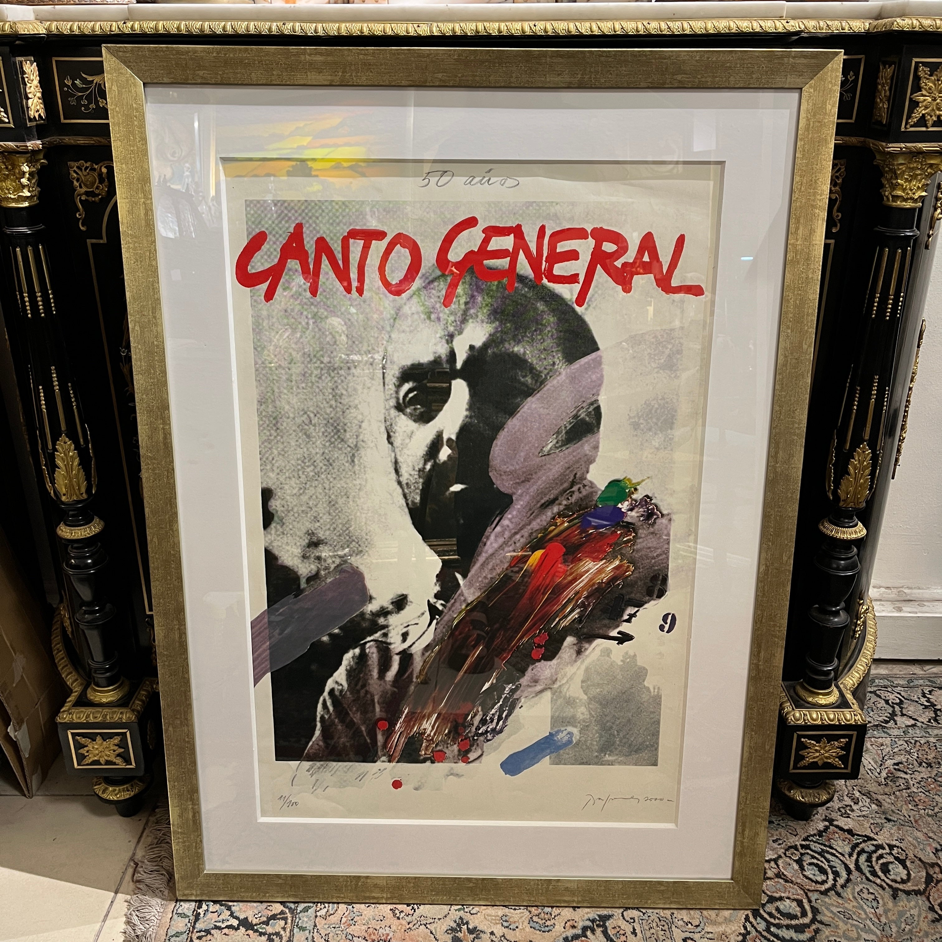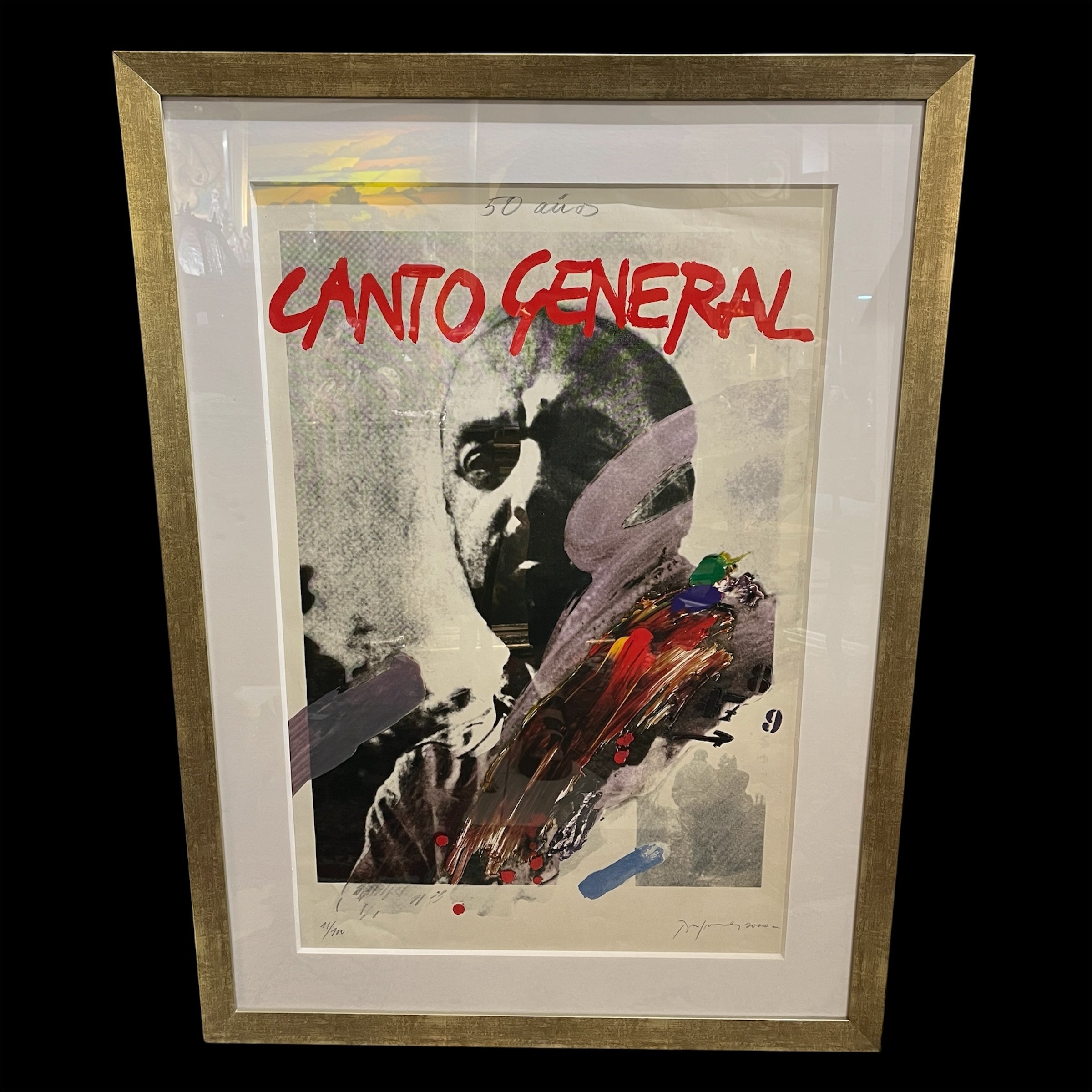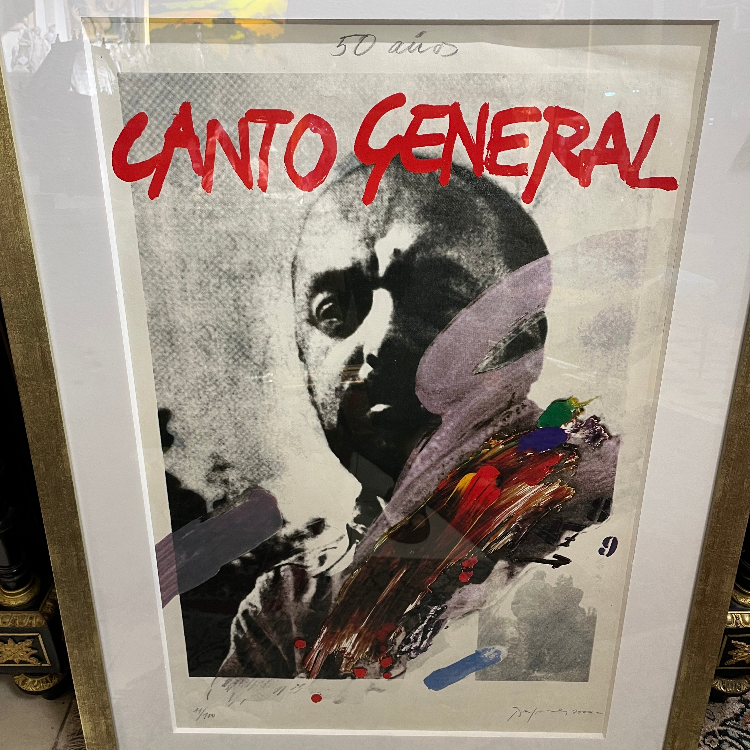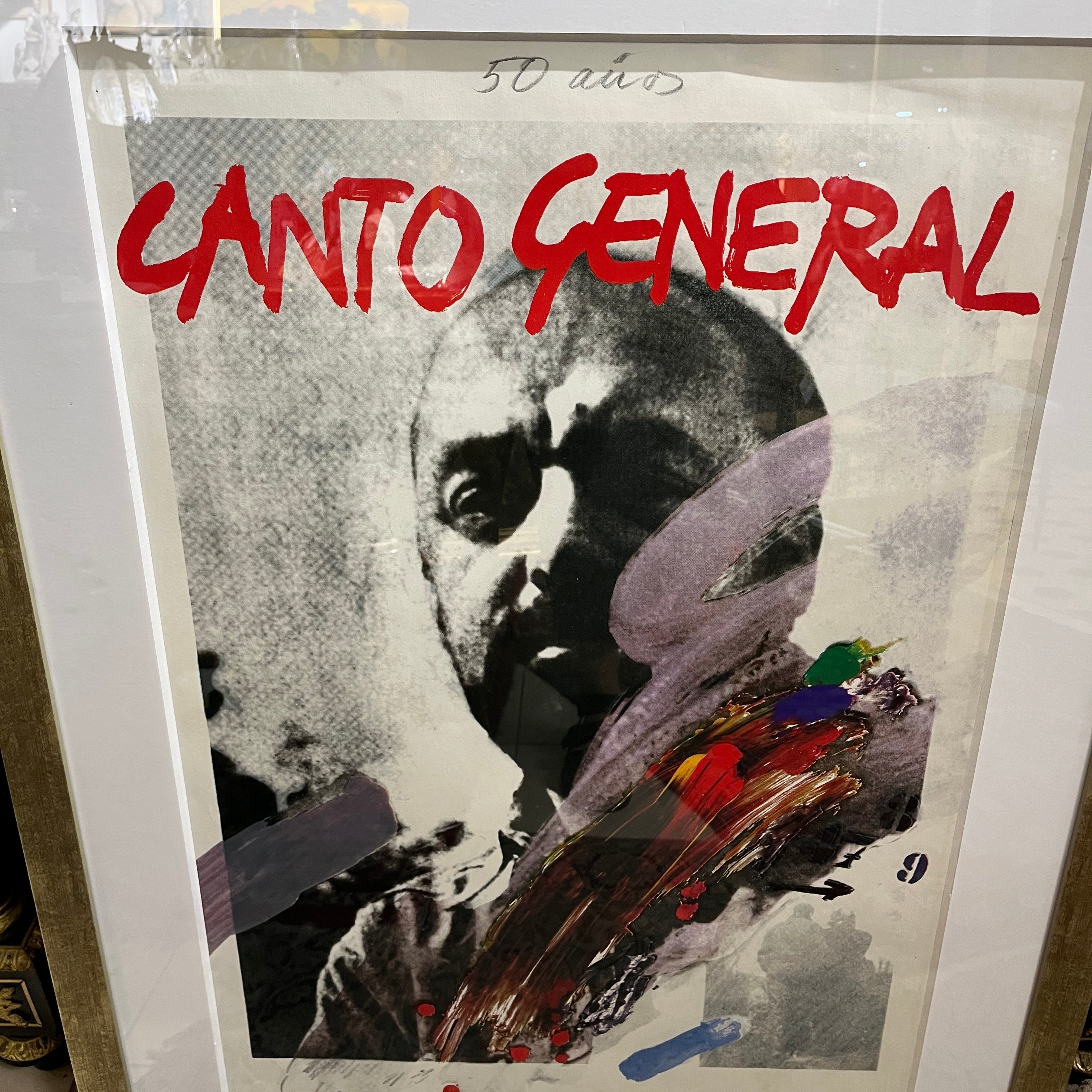 Elocuente impresión gráfica en homenaje los 50 años del 'Canto General' del gran poeta chileno y Premio Nobel Pablo Neruda, realizada por la talentosa pintora Gracia Barrios (1927-2020) junto a su esposo y compañero, el destacado pintor chileno José Balmes (1927-2016). La gráfica es parte de una serie de 180 copias firmadas por los artistas, realizadas el año 2000. En particular esta es la número 11. Es una pieza de gran valor histórico; tanto por su temática, como también por quienes la realizaron.