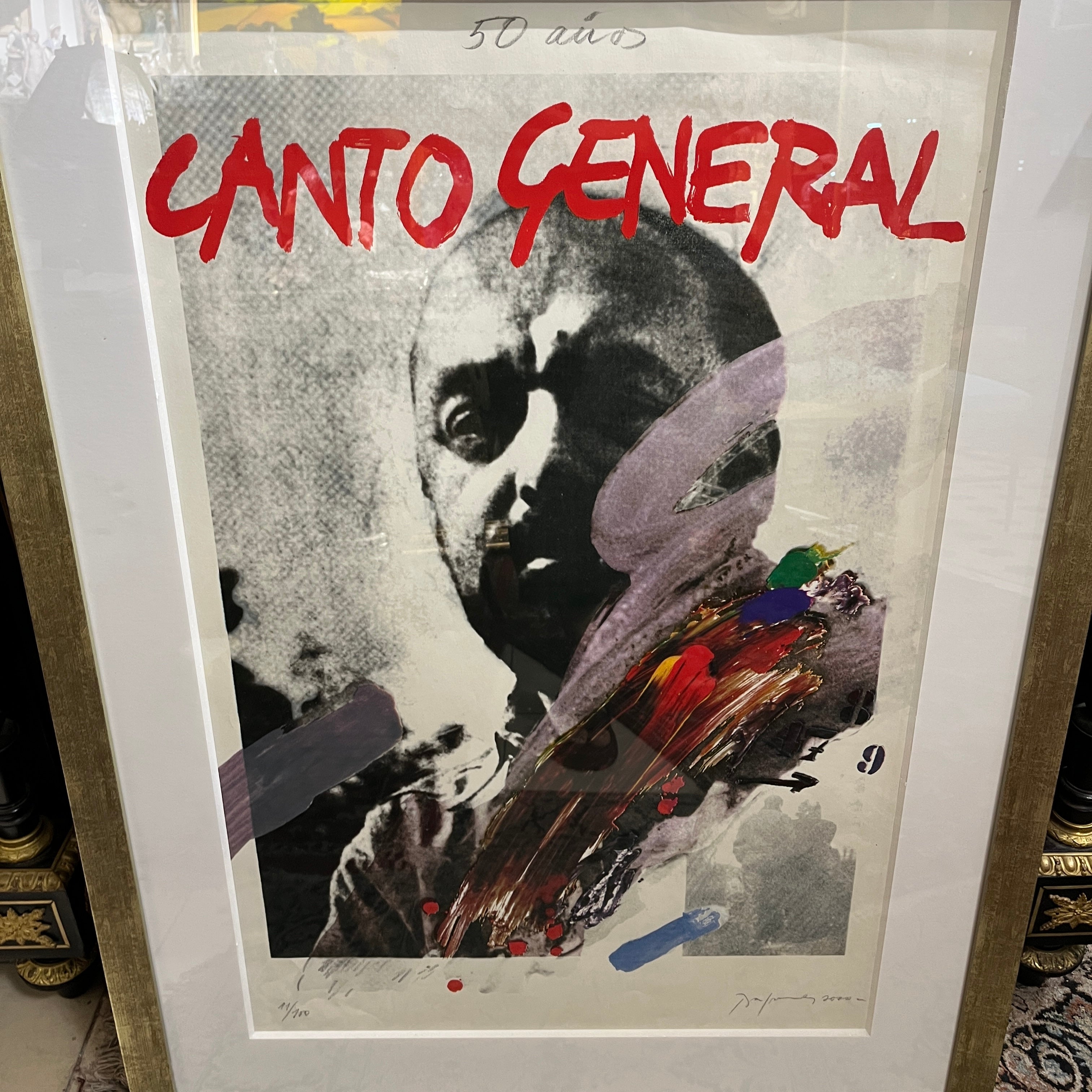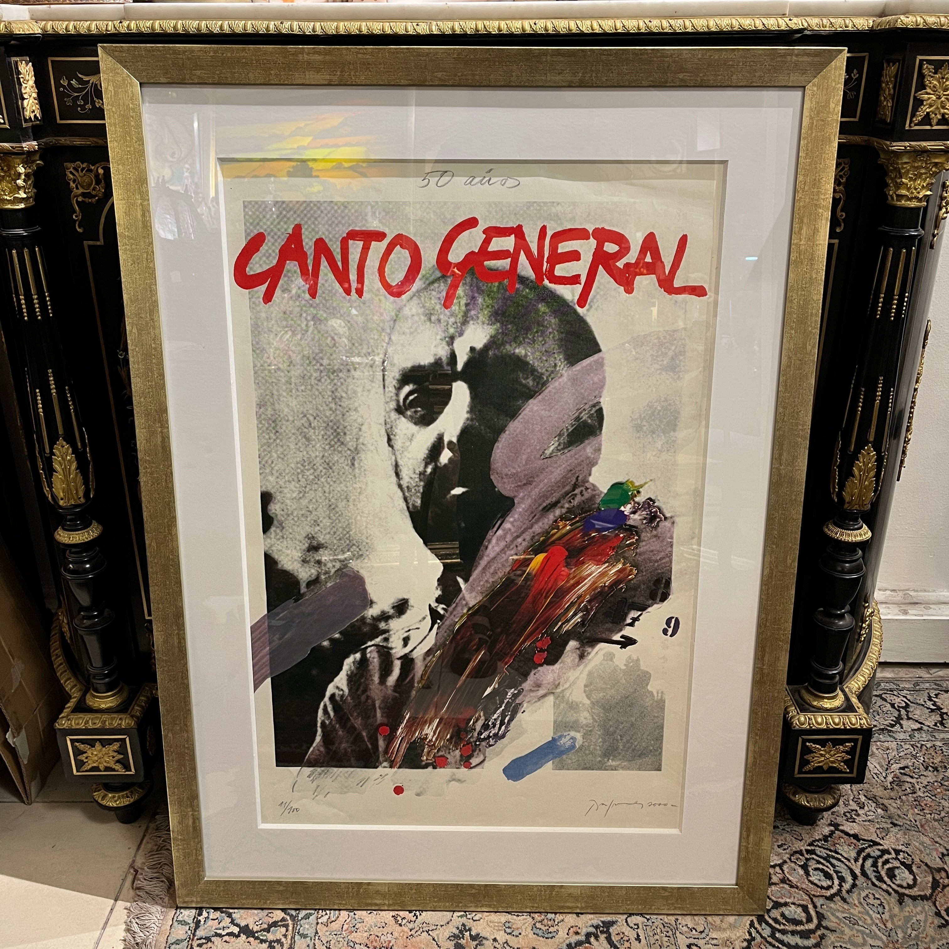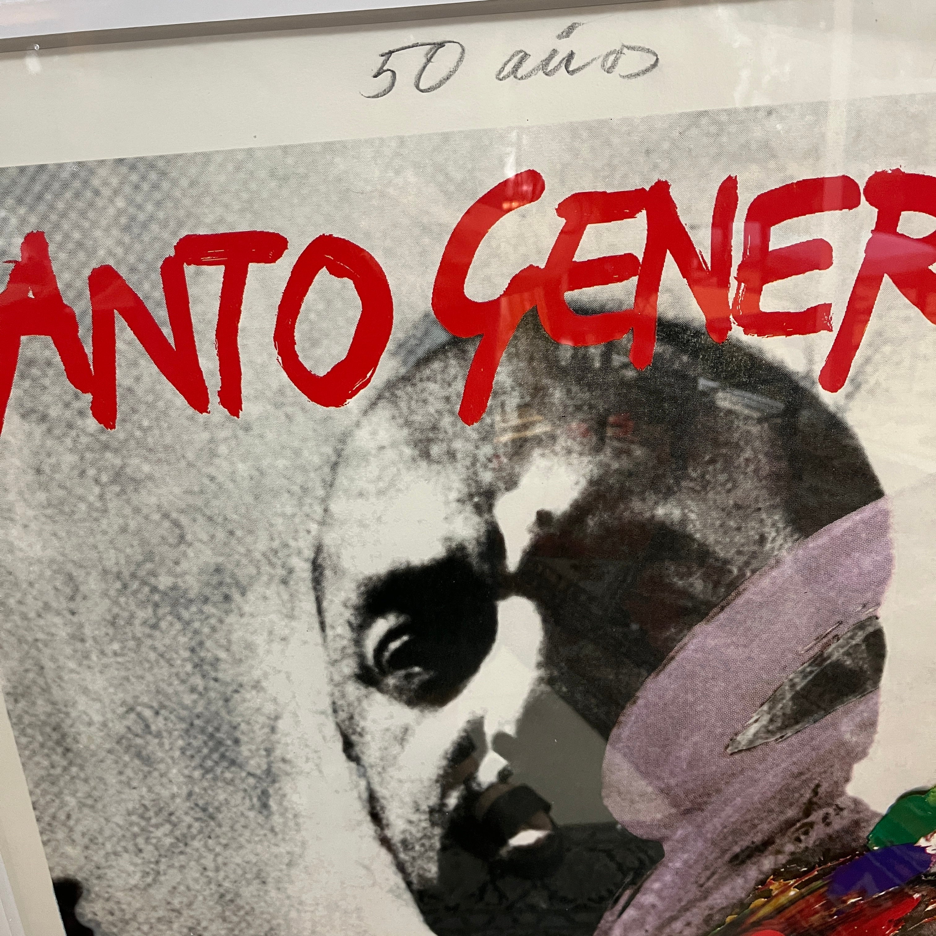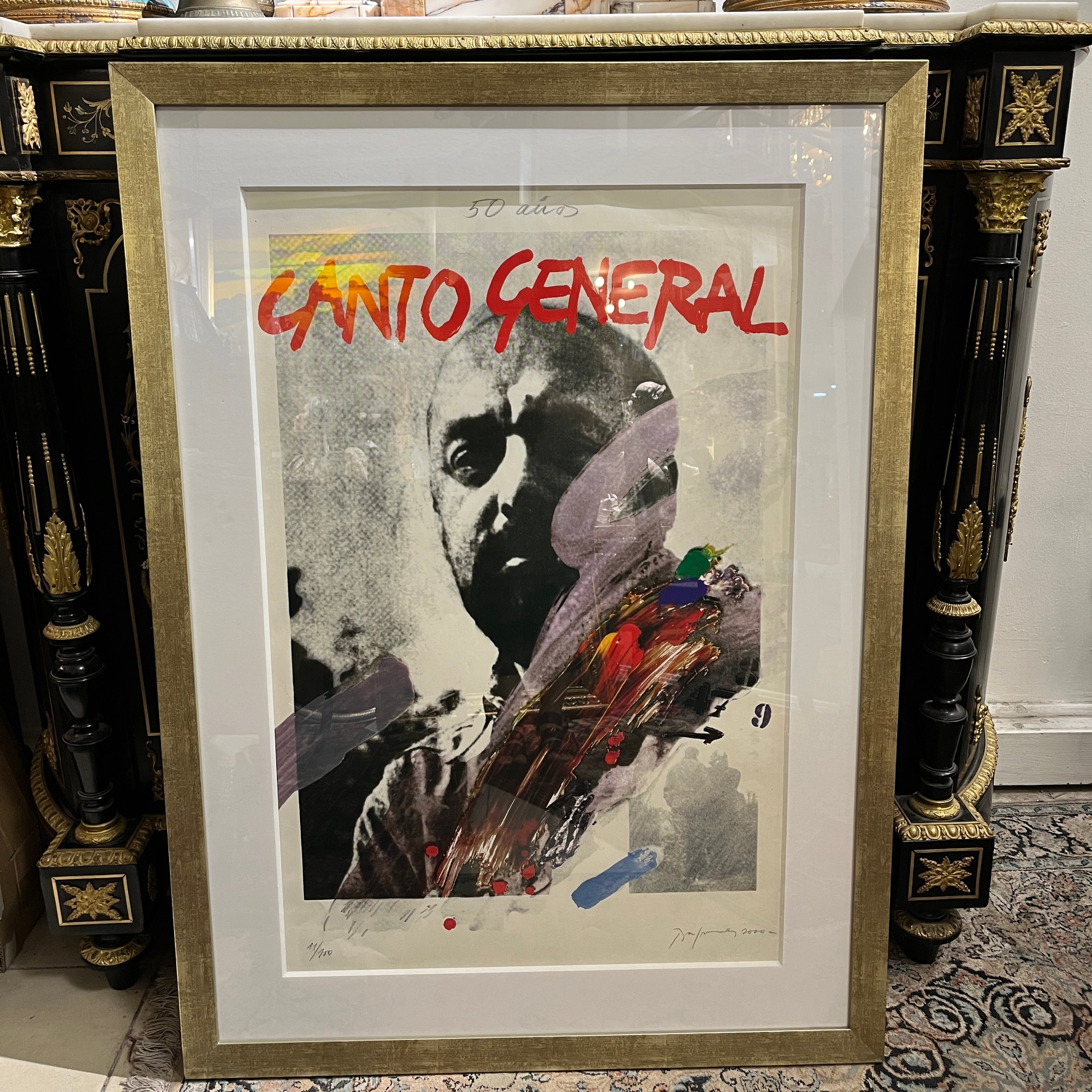Elocuente impresión gráfica en homenaje los 50 años del 'Canto General' del gran poeta chileno y Premio Nobel Pablo Neruda, realizada por la talentosa pintora Gracia Barrios (1927-2020) junto a su esposo y compañero, el destacado pintor chileno José Balmes (1927-2016). La gráfica es parte de una serie de 180 copias firmadas por los artistas, realizadas el año 2000. En particular esta es la número 11. Es una pieza de gran valor histórico; tanto por su temática, como también por quienes la realizaron.