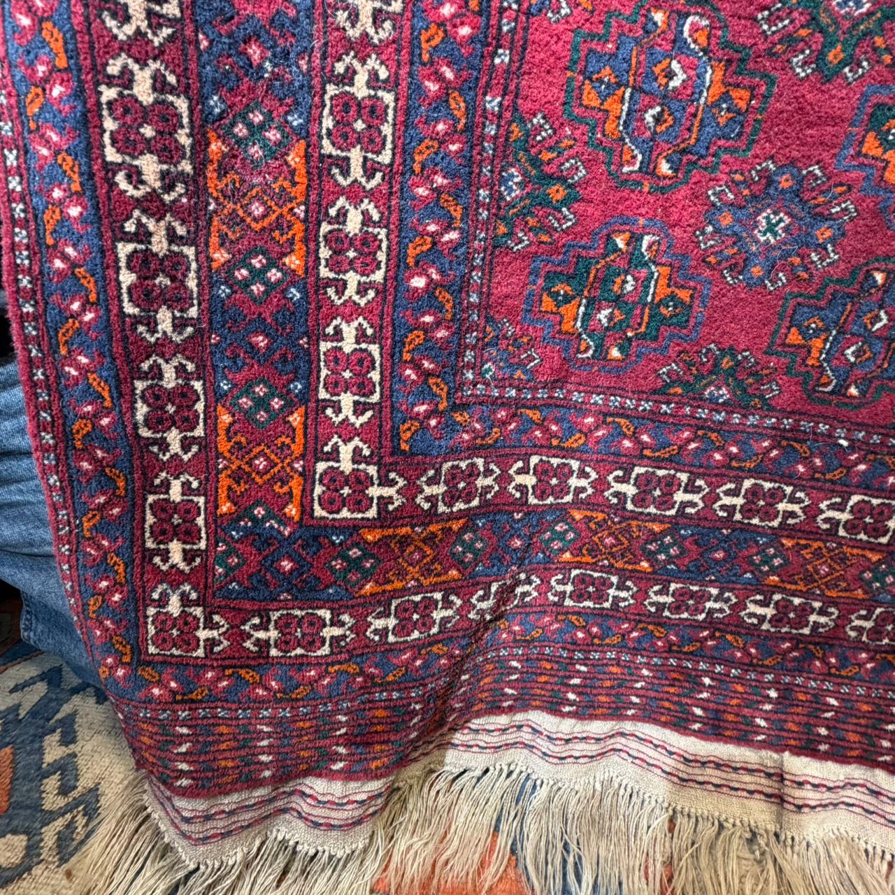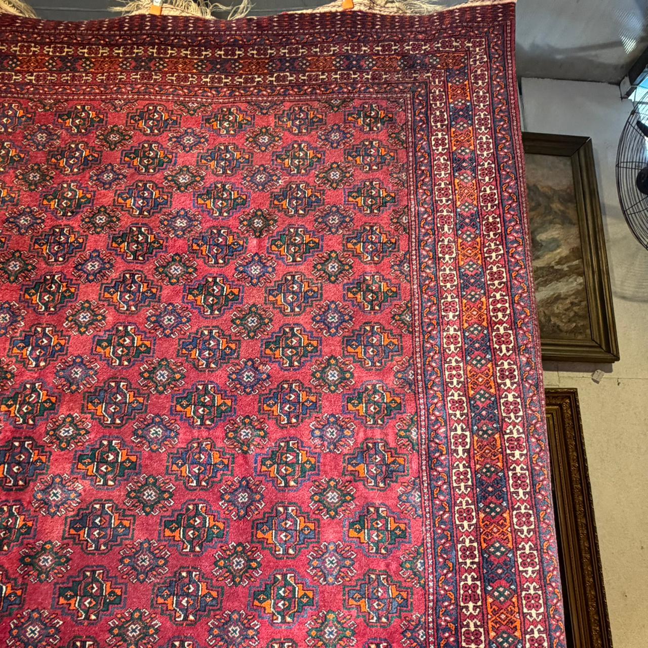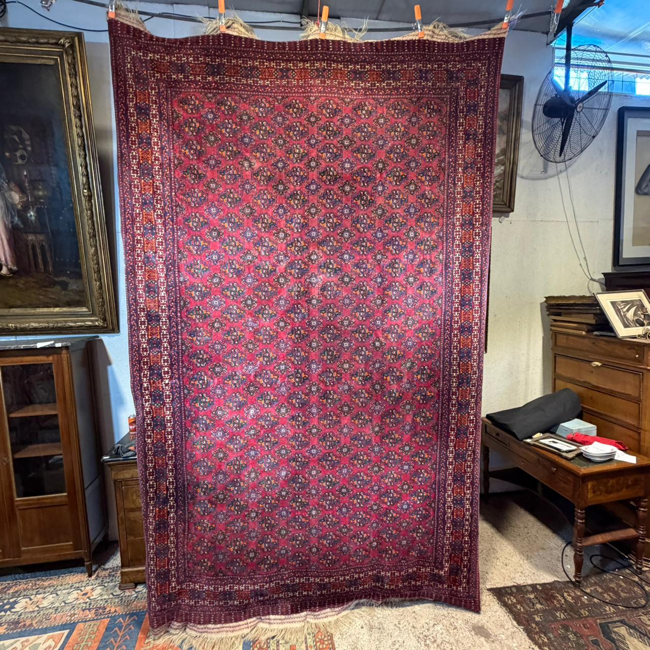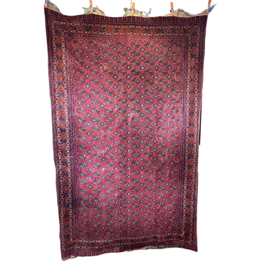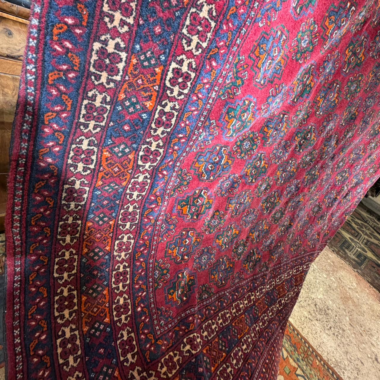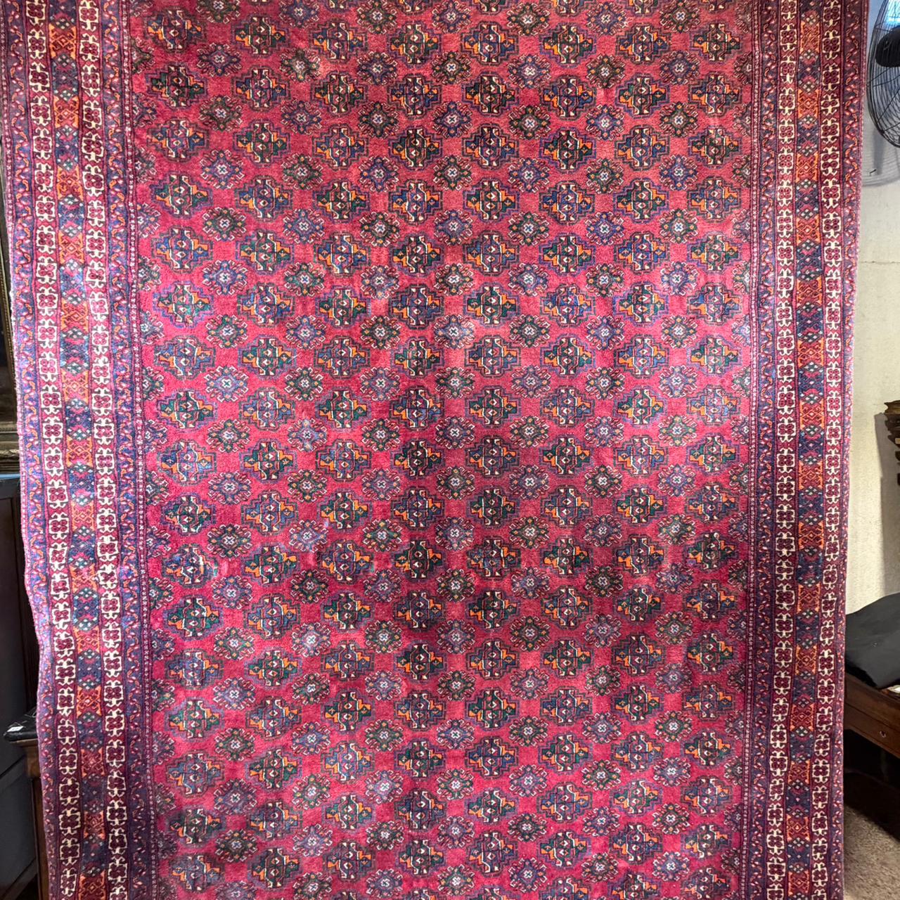 Hermosa alfombra de la tribu nómada Baluch (también se puede escribir Beluch, Balochi o Belochi) del noreste de Irán bordeando la frontera con Afganistán. Es una alfombra que se caracteriza por su especial suavidad debido a la técnica de nudaje particularmente compacto, lo que la vuelve más liviana y flexible. Se calcula que debe tener más de cuarenta años, sin embargo su excelente estado permite que pueda seguir utilizándose en salones y espacios amplios en general, donde se pueda apreciar su magnificencia. Es una reliquia manufacturada, que destaca por el uso de pigmentos naturales, predominando el rojo y con pequeñas geometrías que acompañan todo el paño. La guarda juega con tonos azul cobalto y otros terrosos.