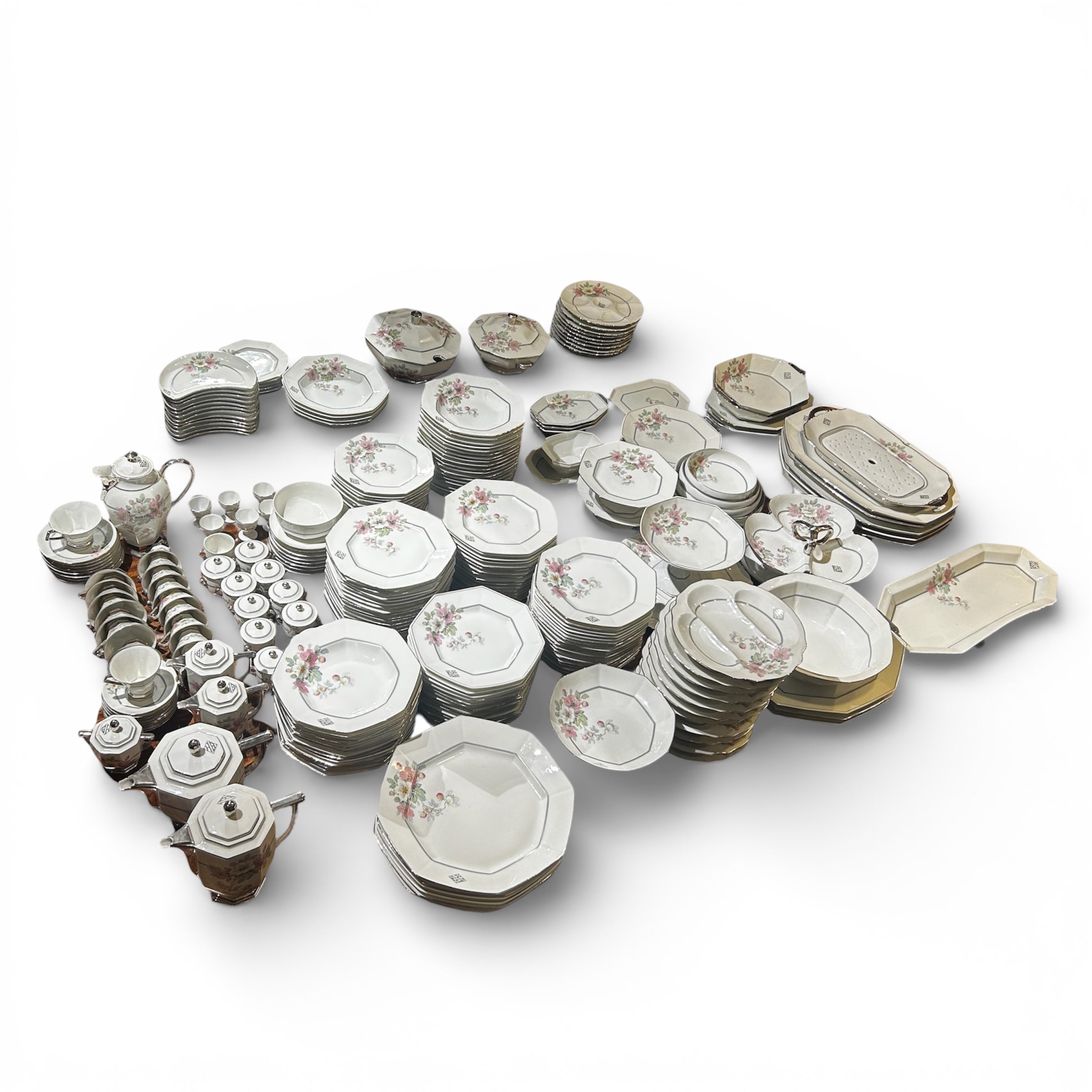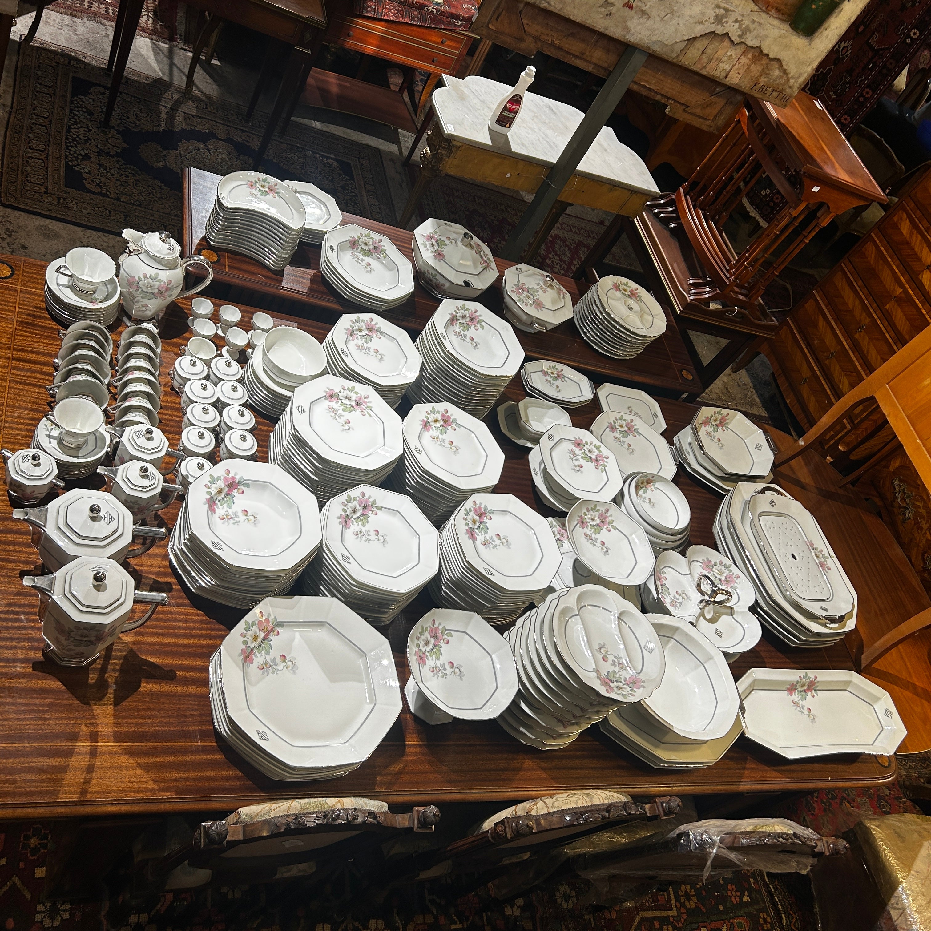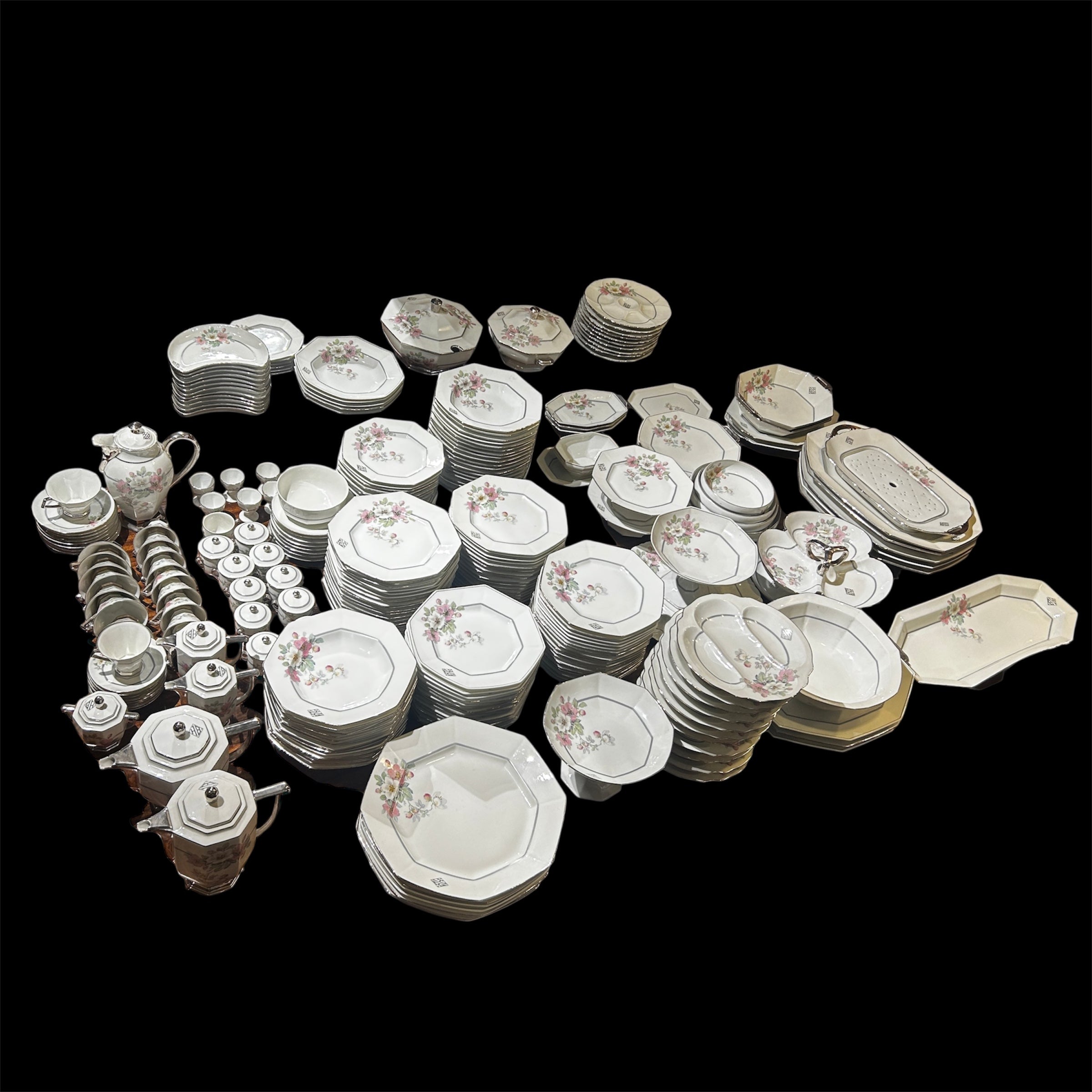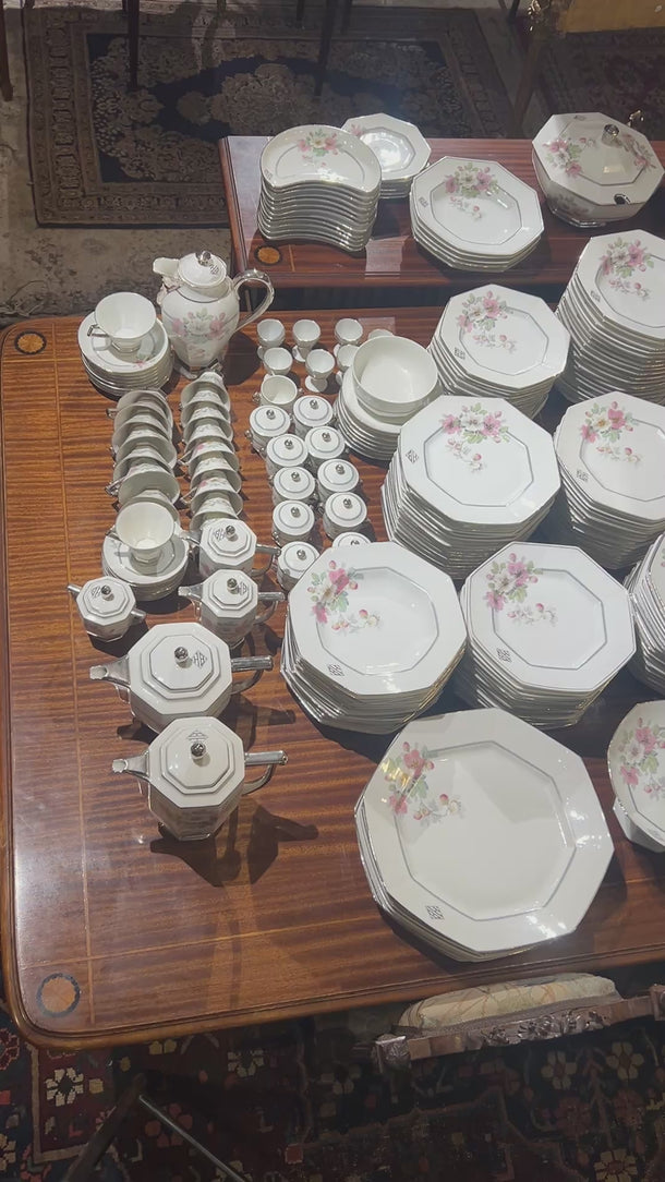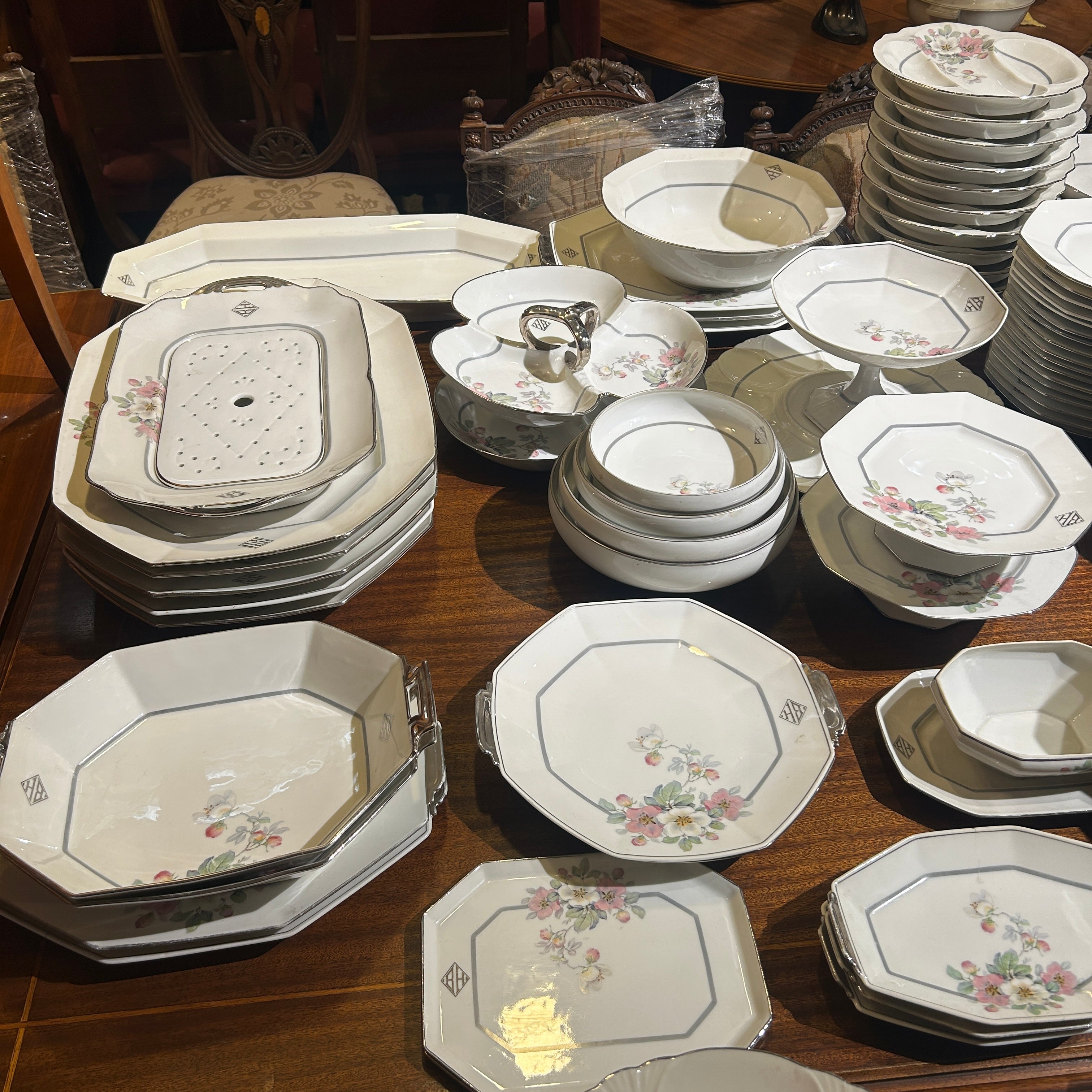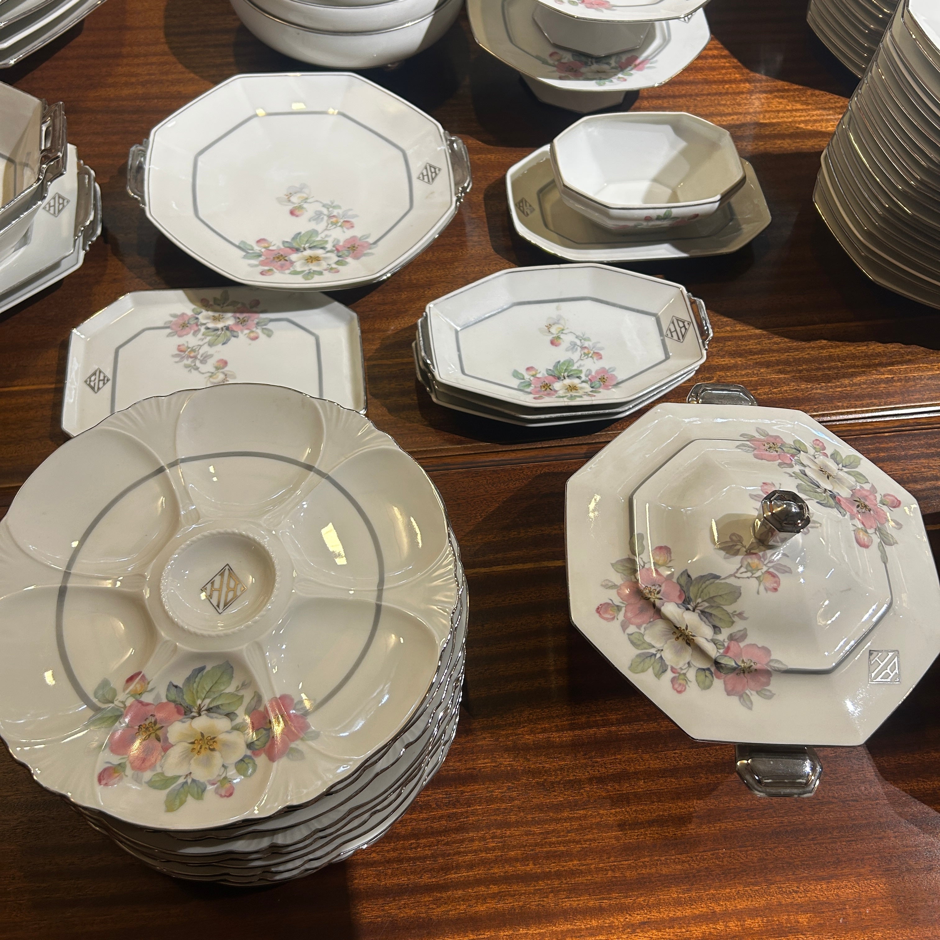 Magnífico juego de porcelana Limoges Raynaud Art Deco octagonal con delicadas terminaciones de plata y diseño floral, para 15 personas. Con piezas para doble juego de servir.