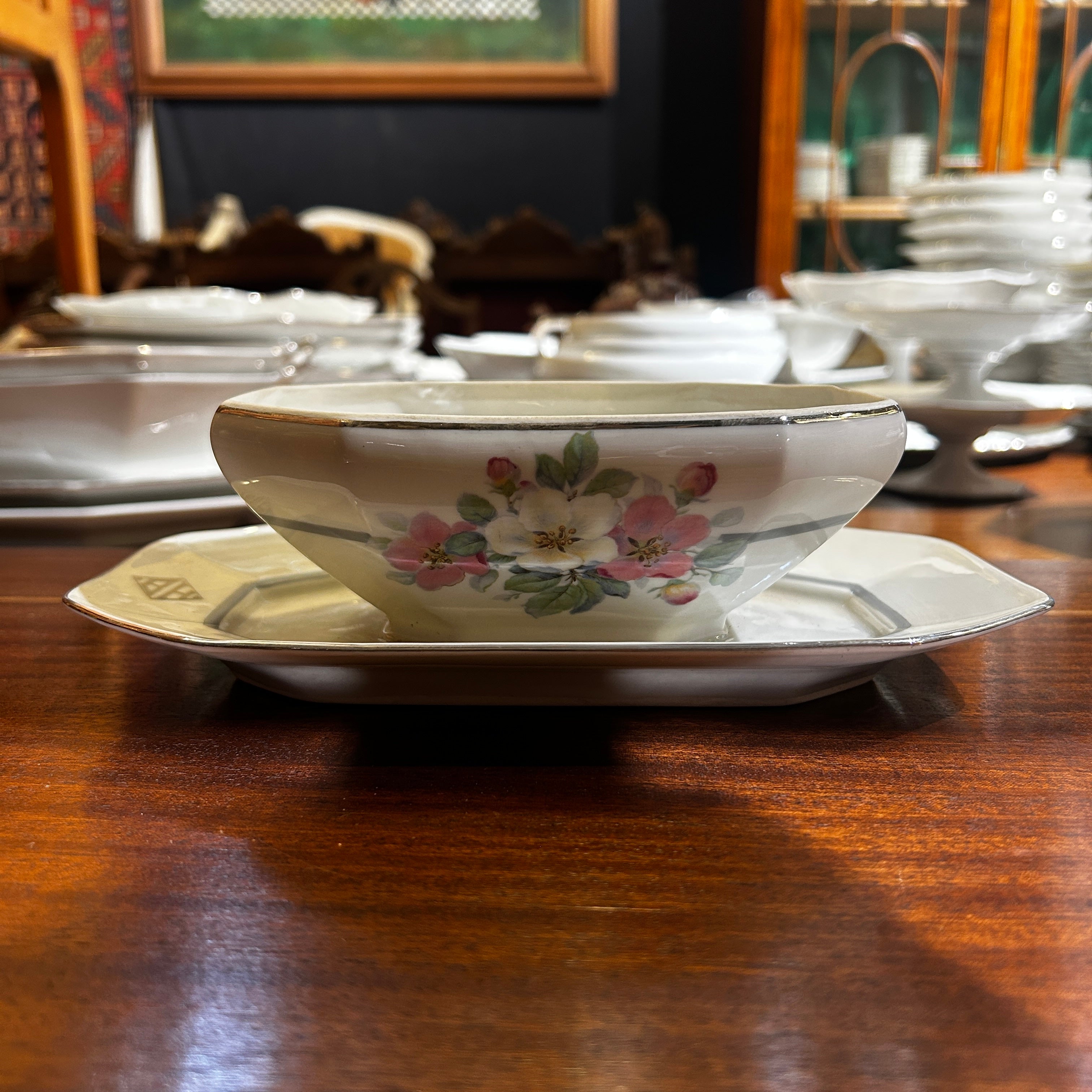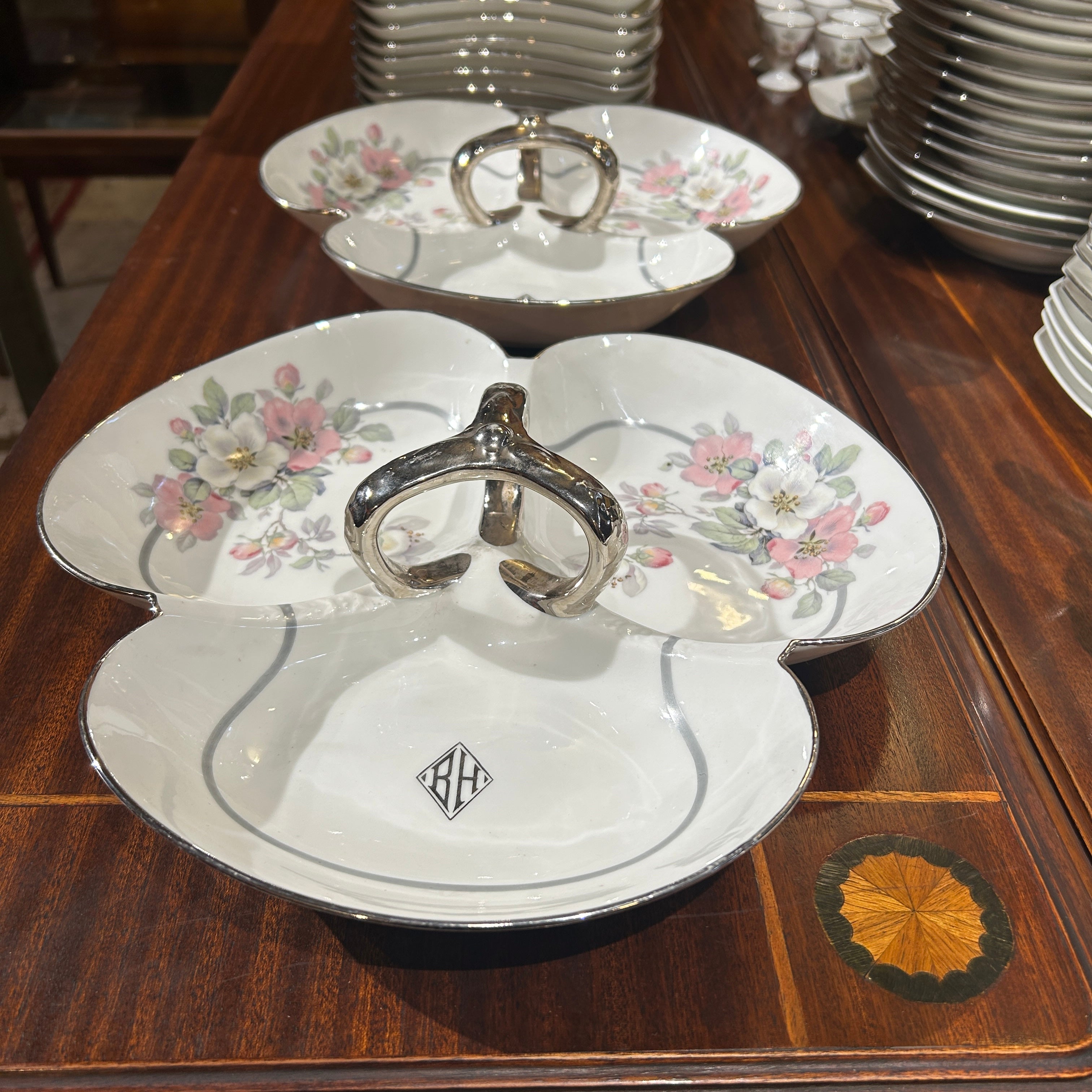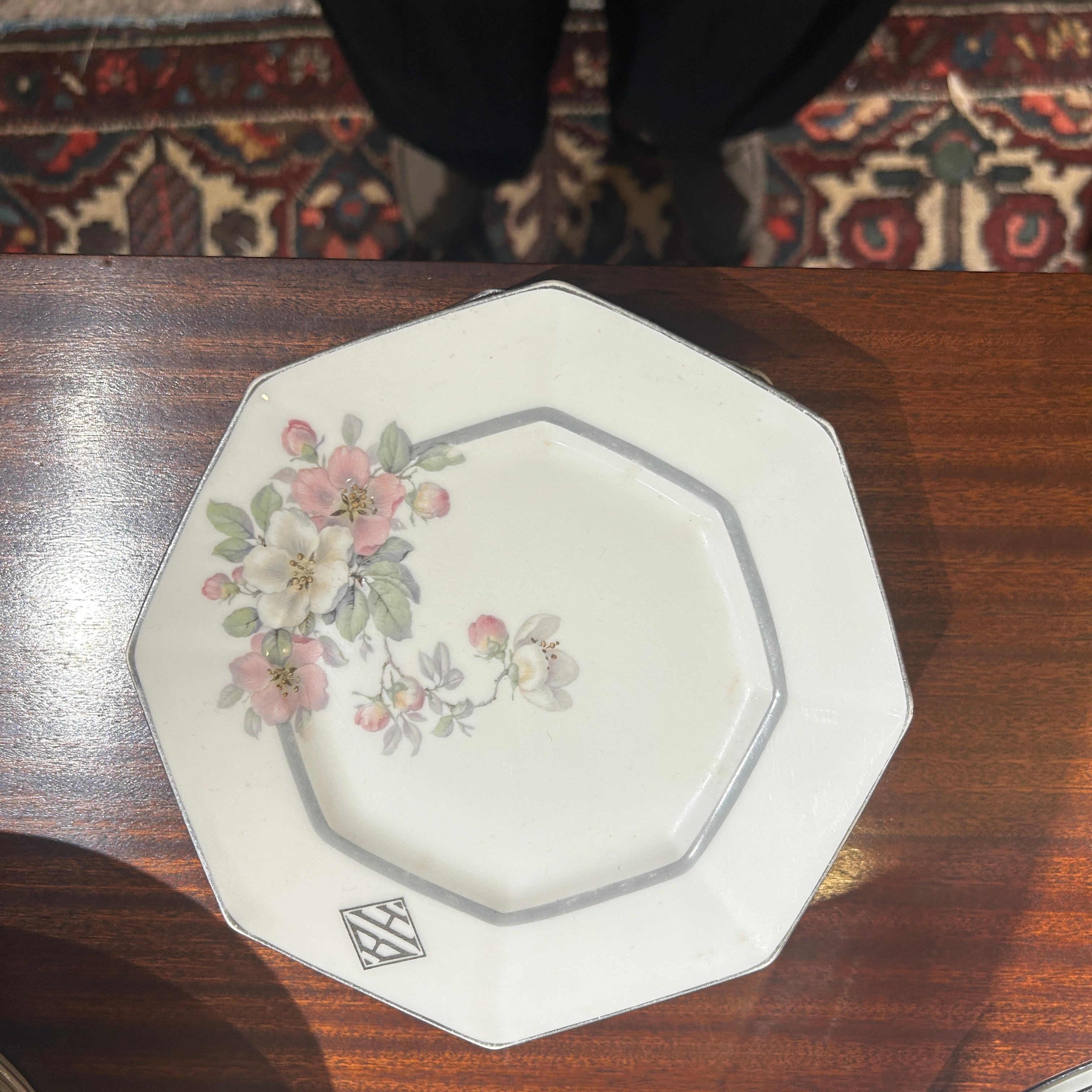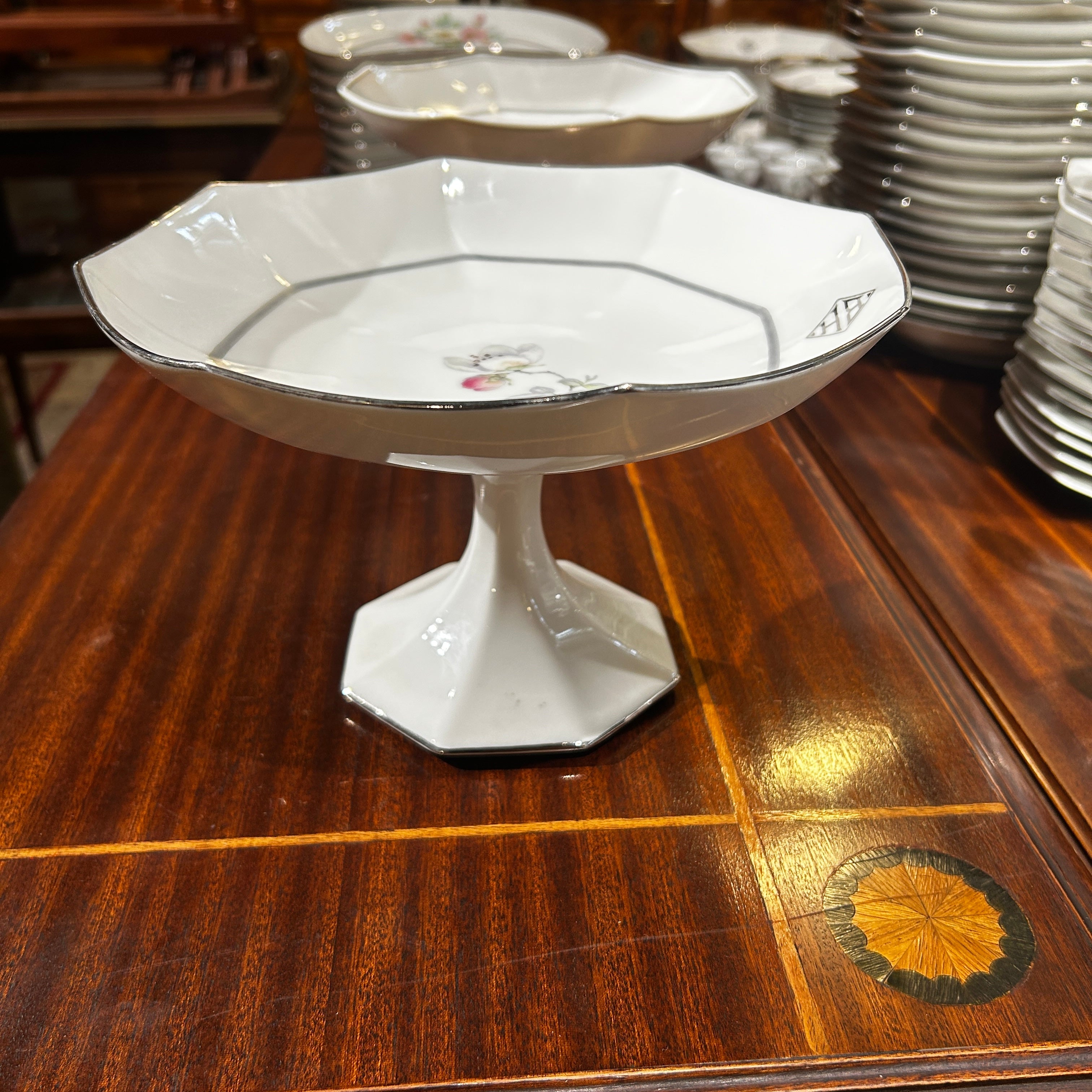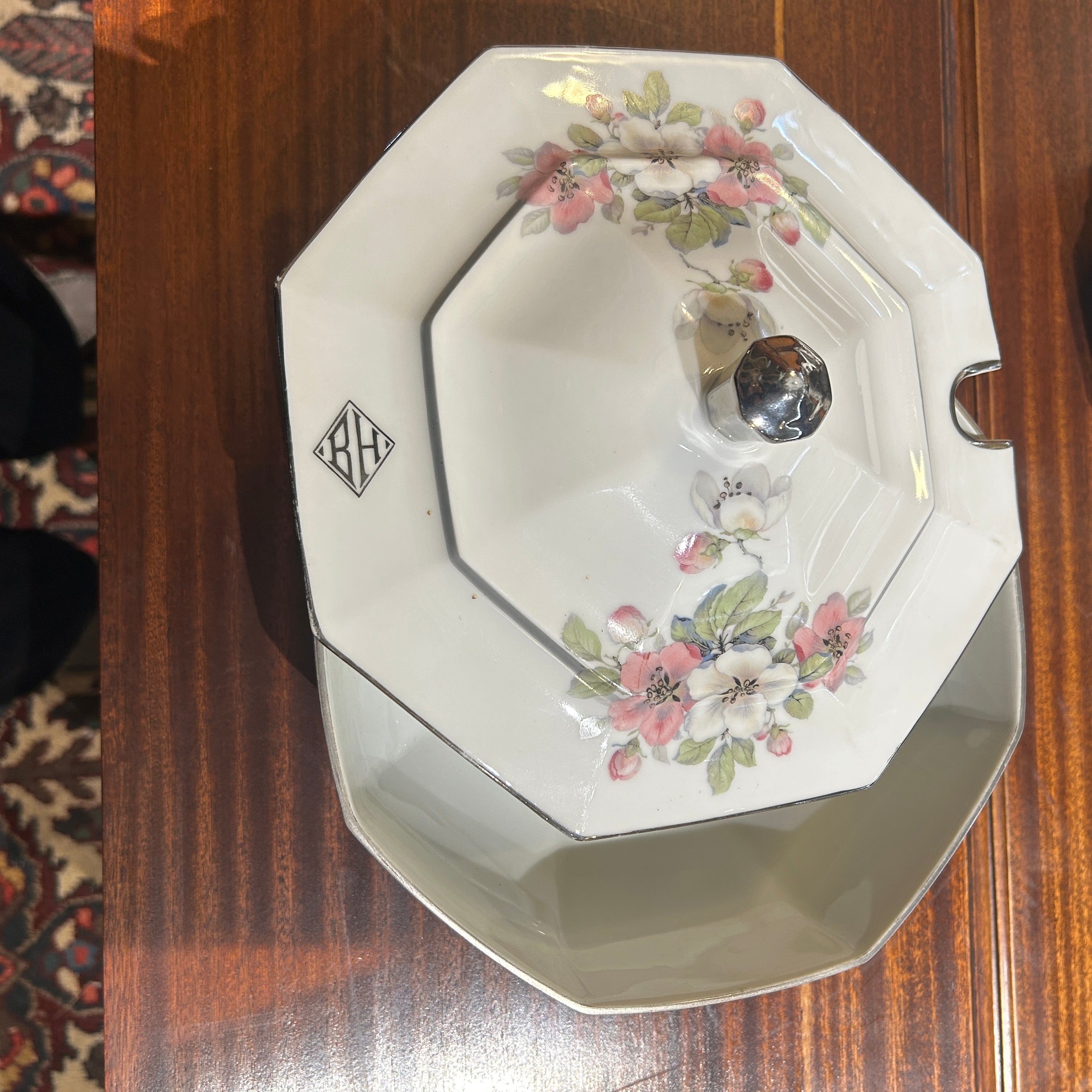 Magnífico juego de porcelana Limoges Raynaud Art Deco octagonal con delicadas terminaciones de plata y diseño floral, para 15 personas. Con piezas para doble juego de servir.