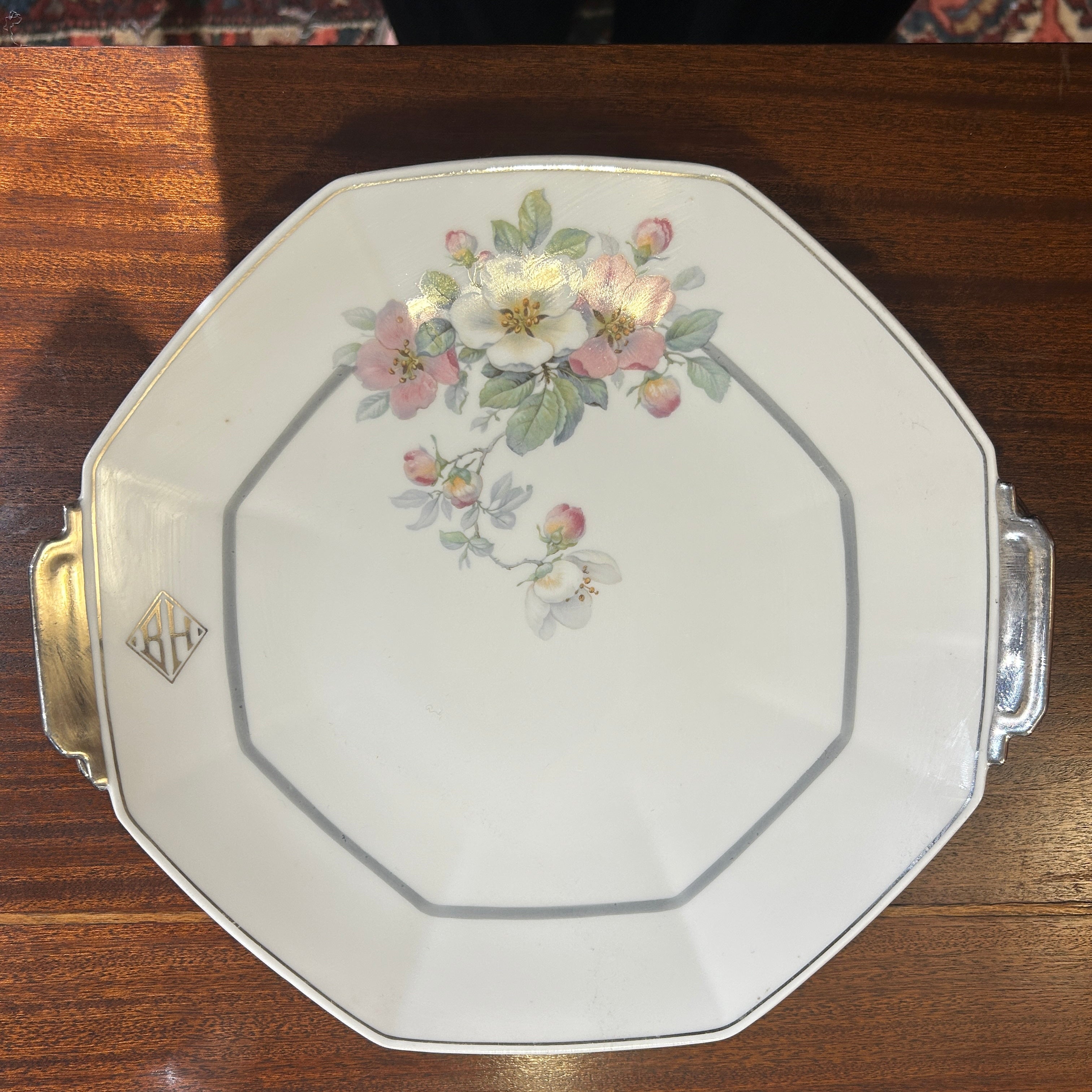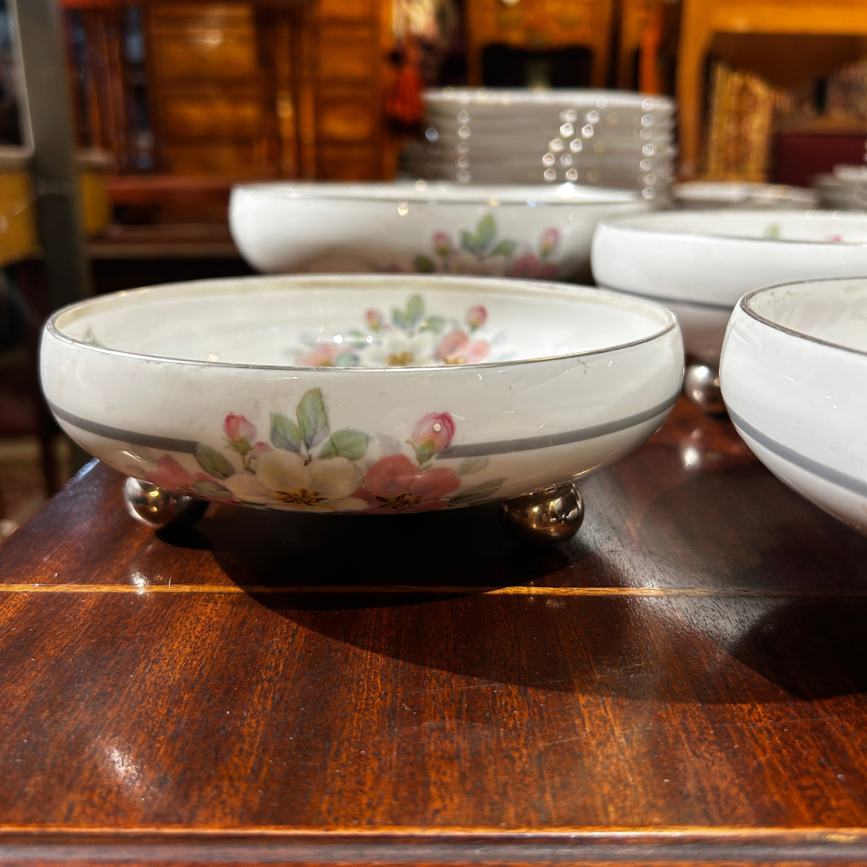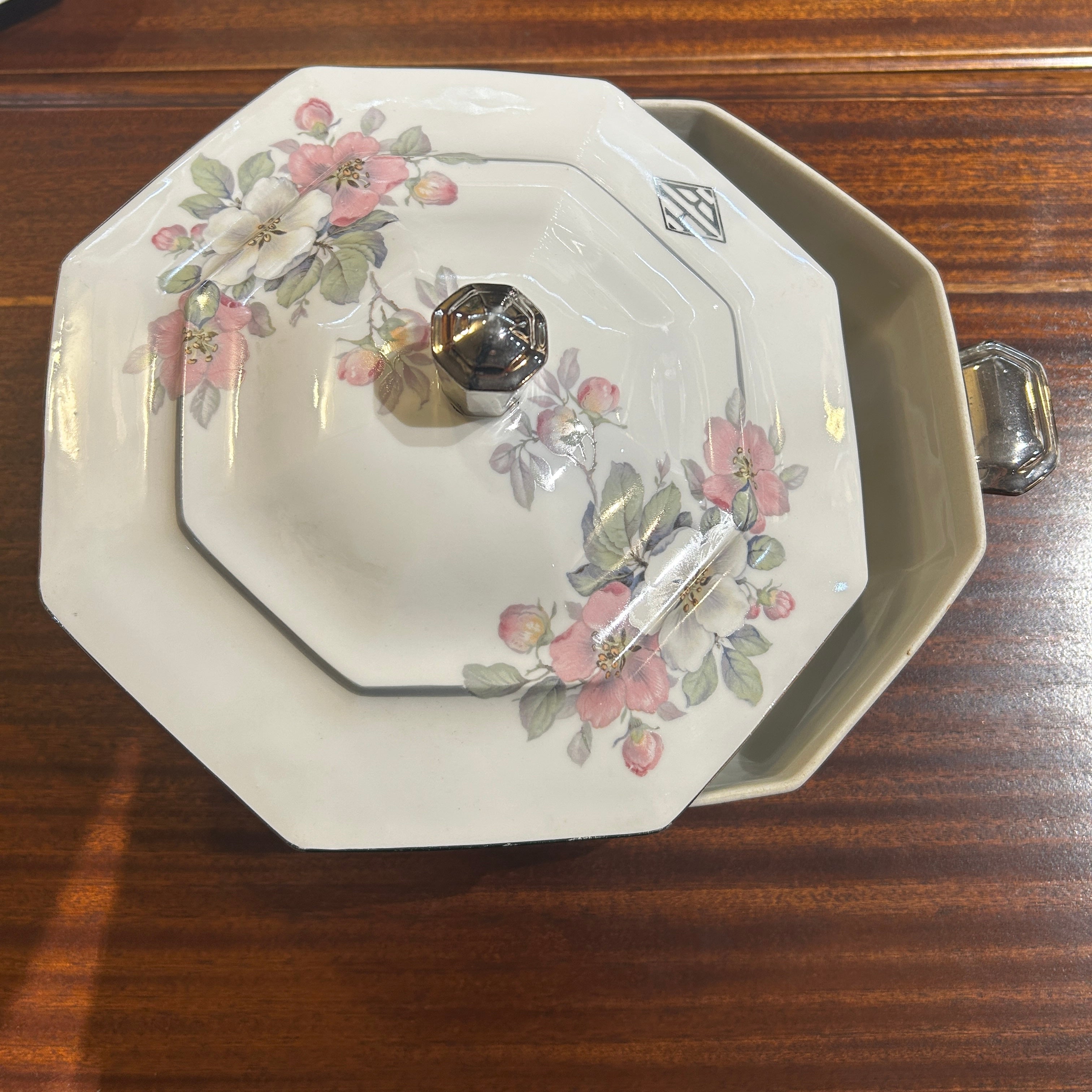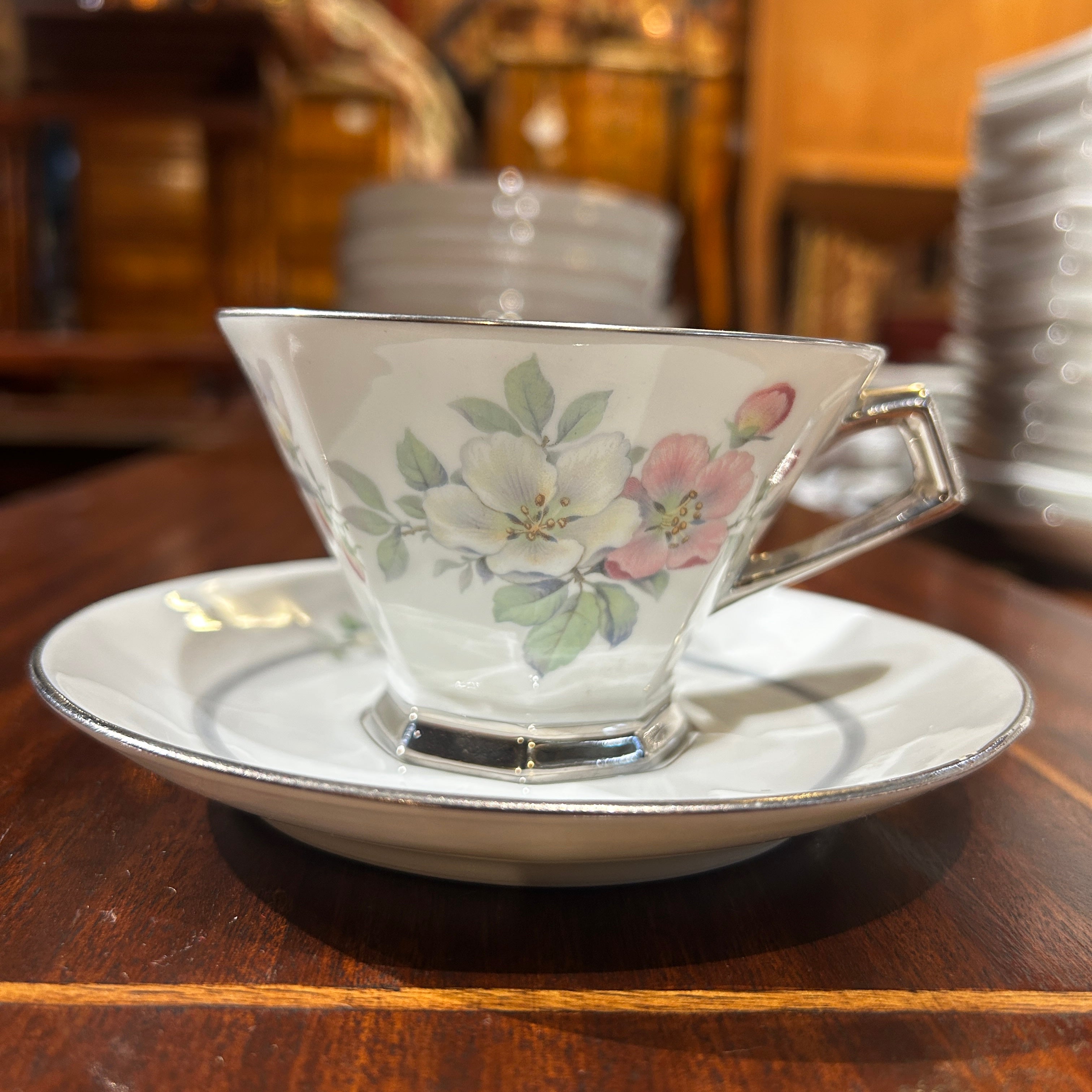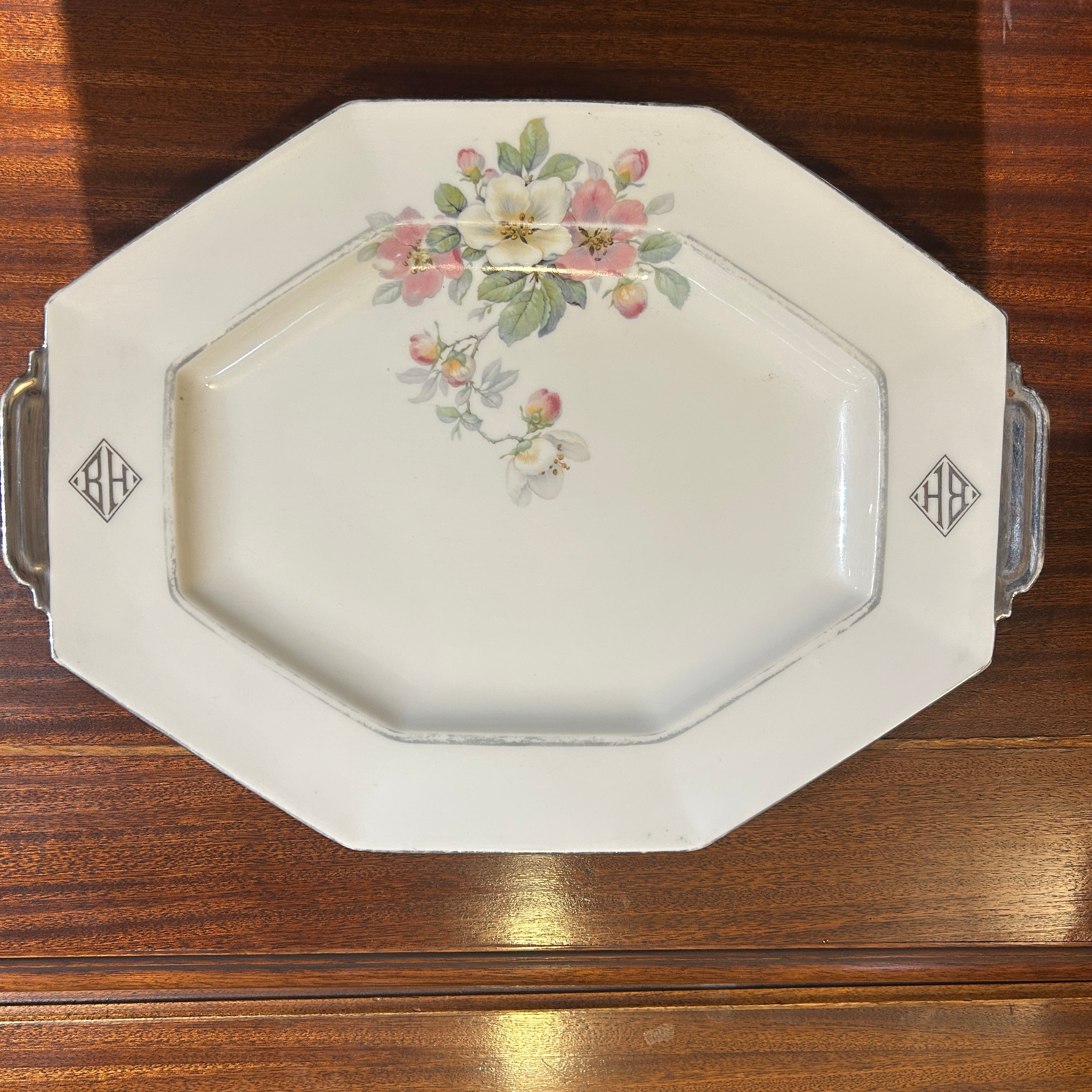 Magnífico juego de porcelana Limoges Raynaud Art Deco octagonal con delicadas terminaciones de plata y diseño floral, para 15 personas. Con piezas para doble juego de servir.