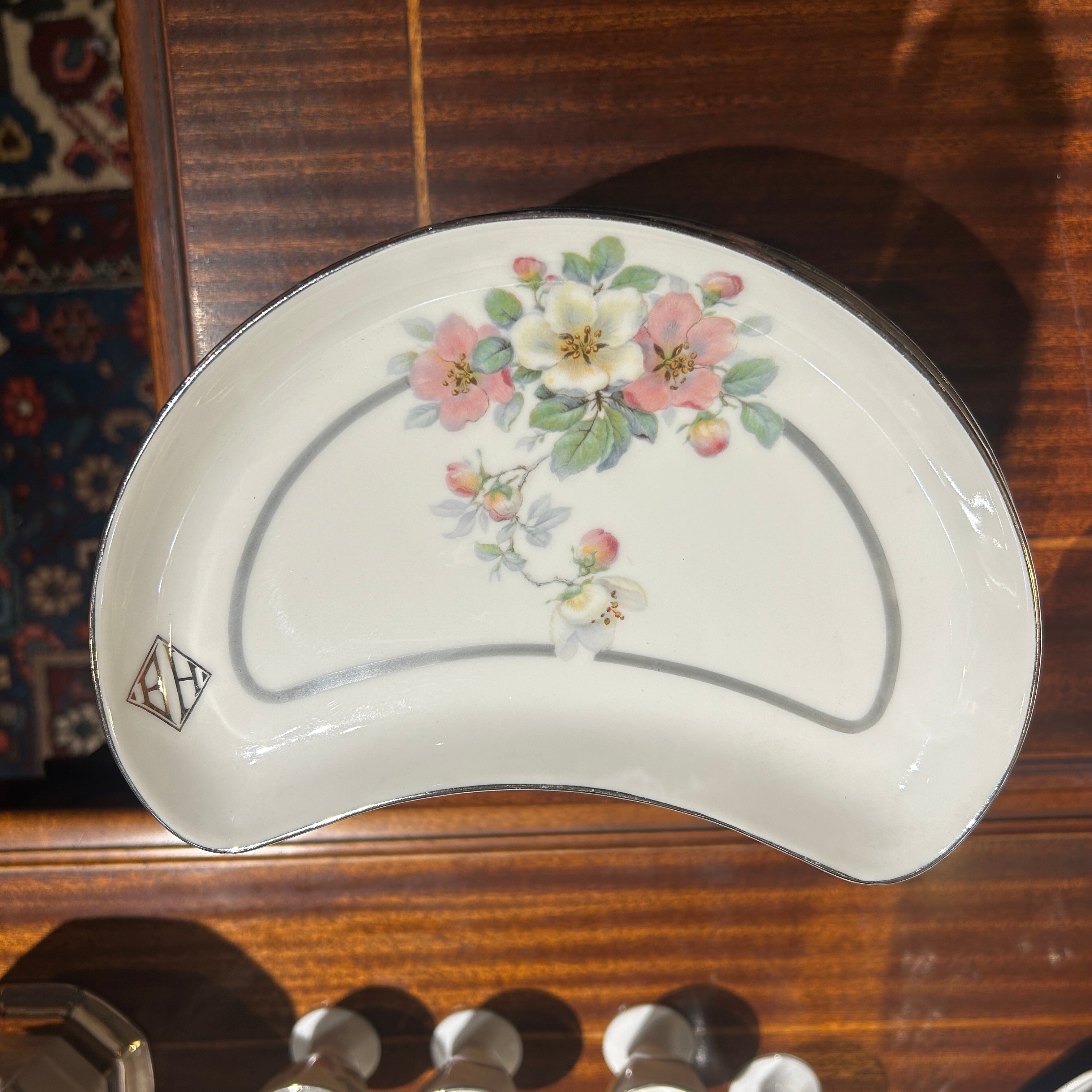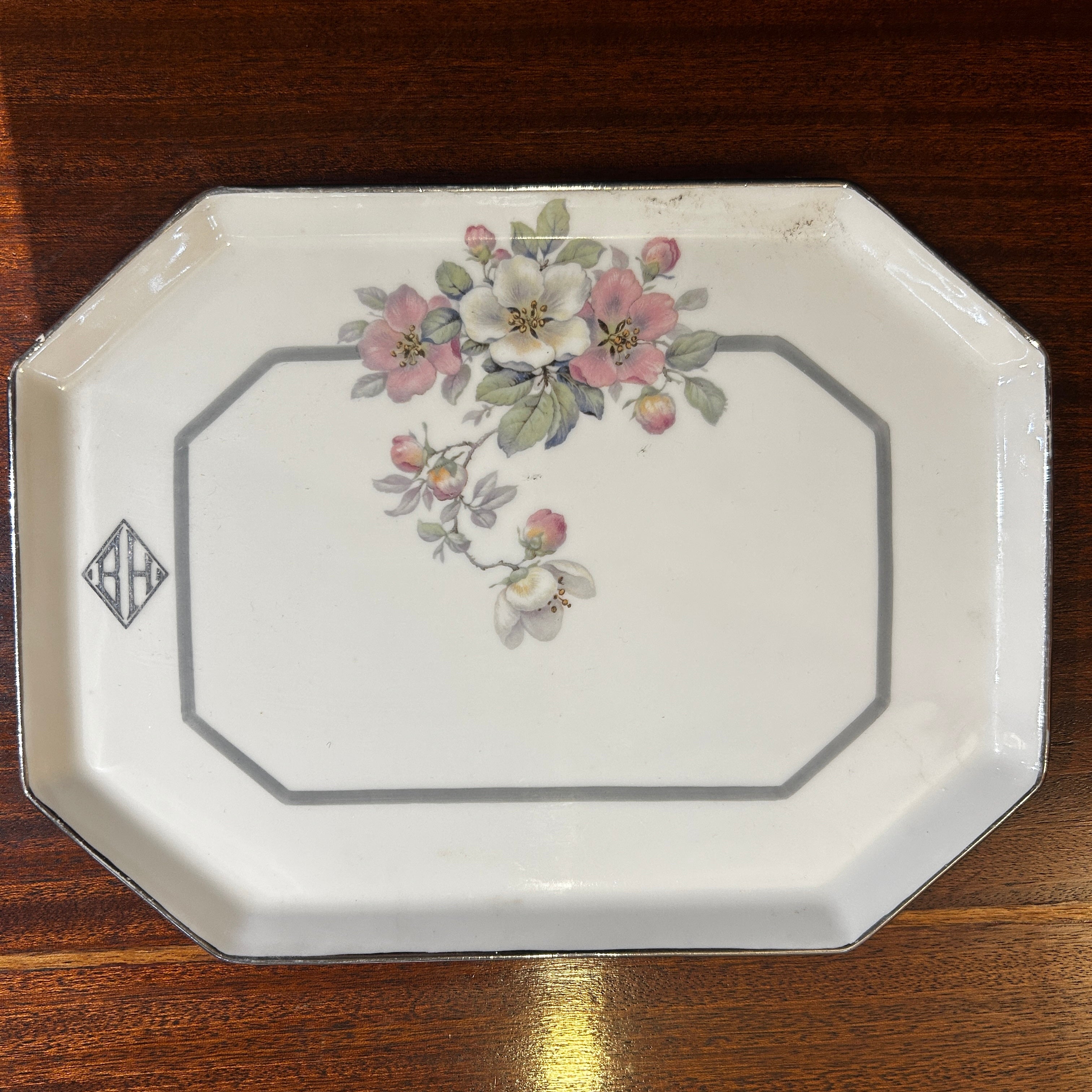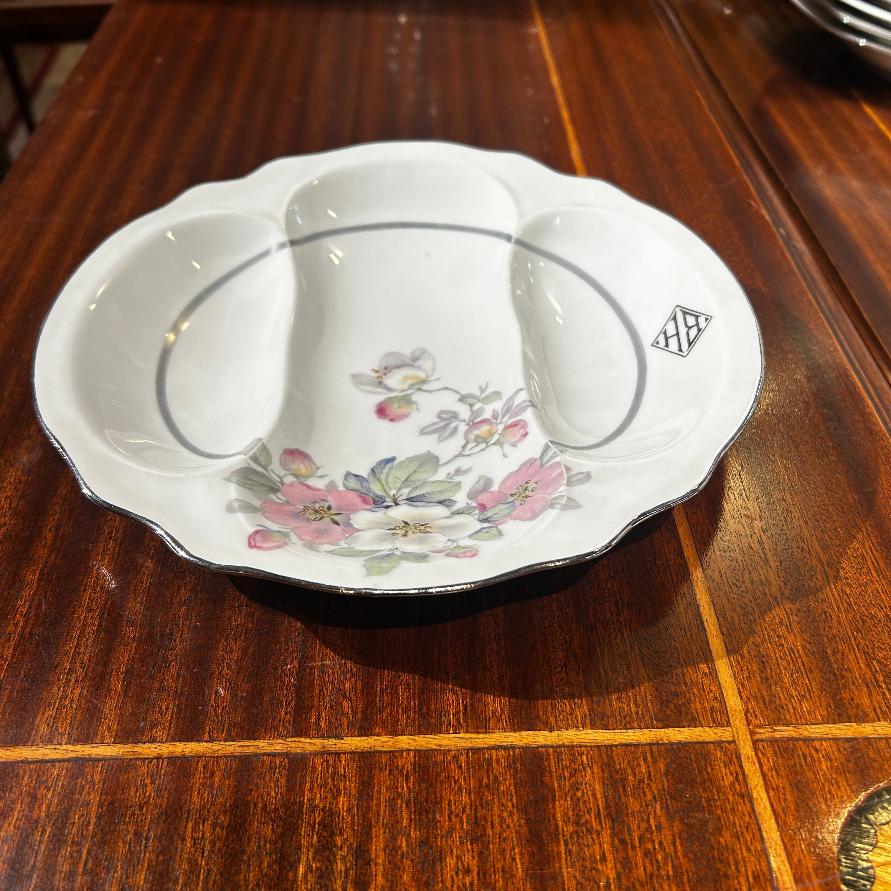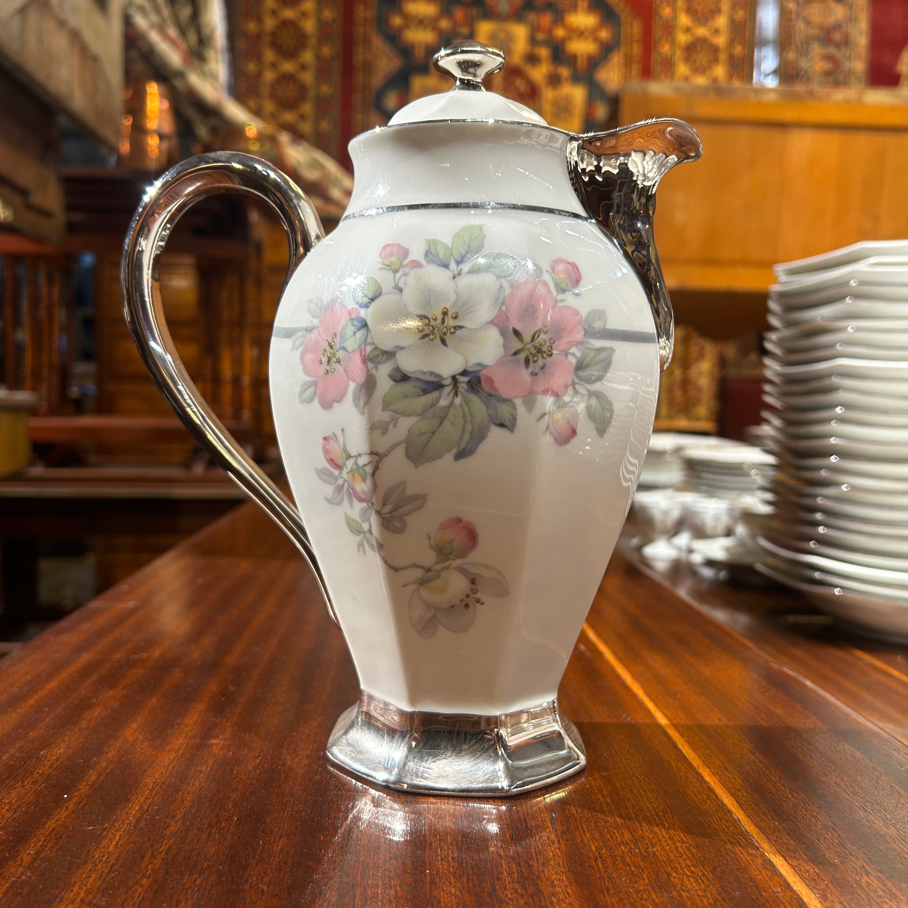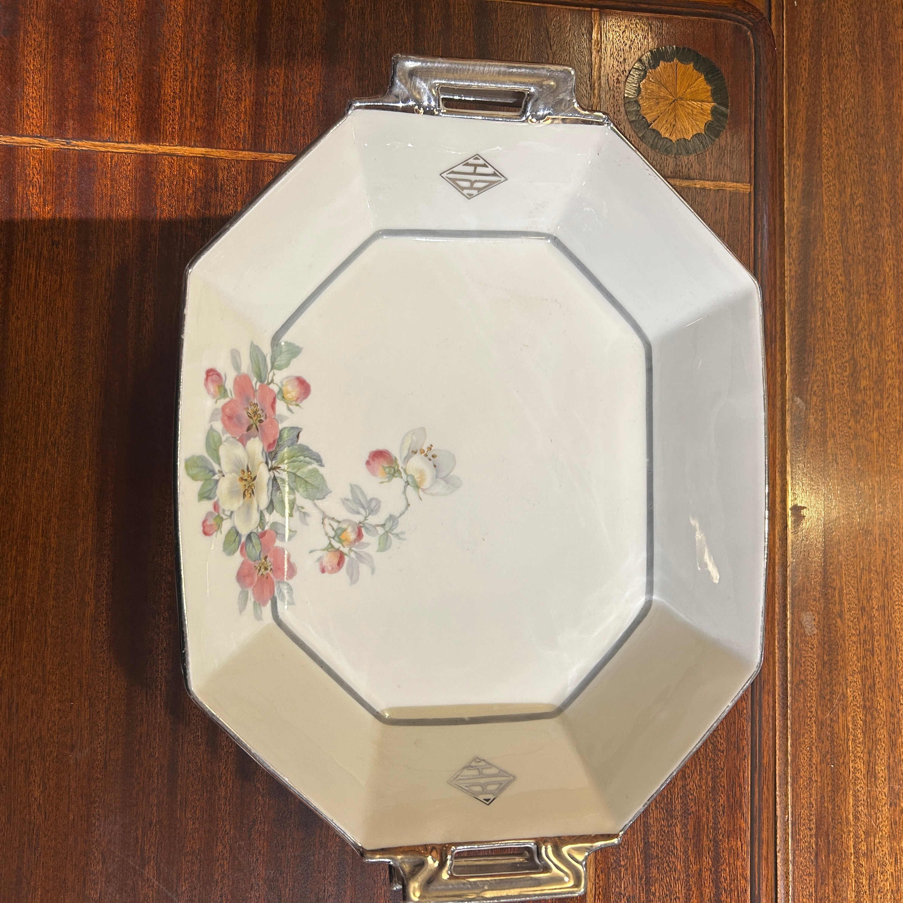 Magnífico juego de porcelana Limoges Raynaud Art Deco octagonal con delicadas terminaciones de plata y diseño floral, para 15 personas. Con piezas para doble juego de servir.