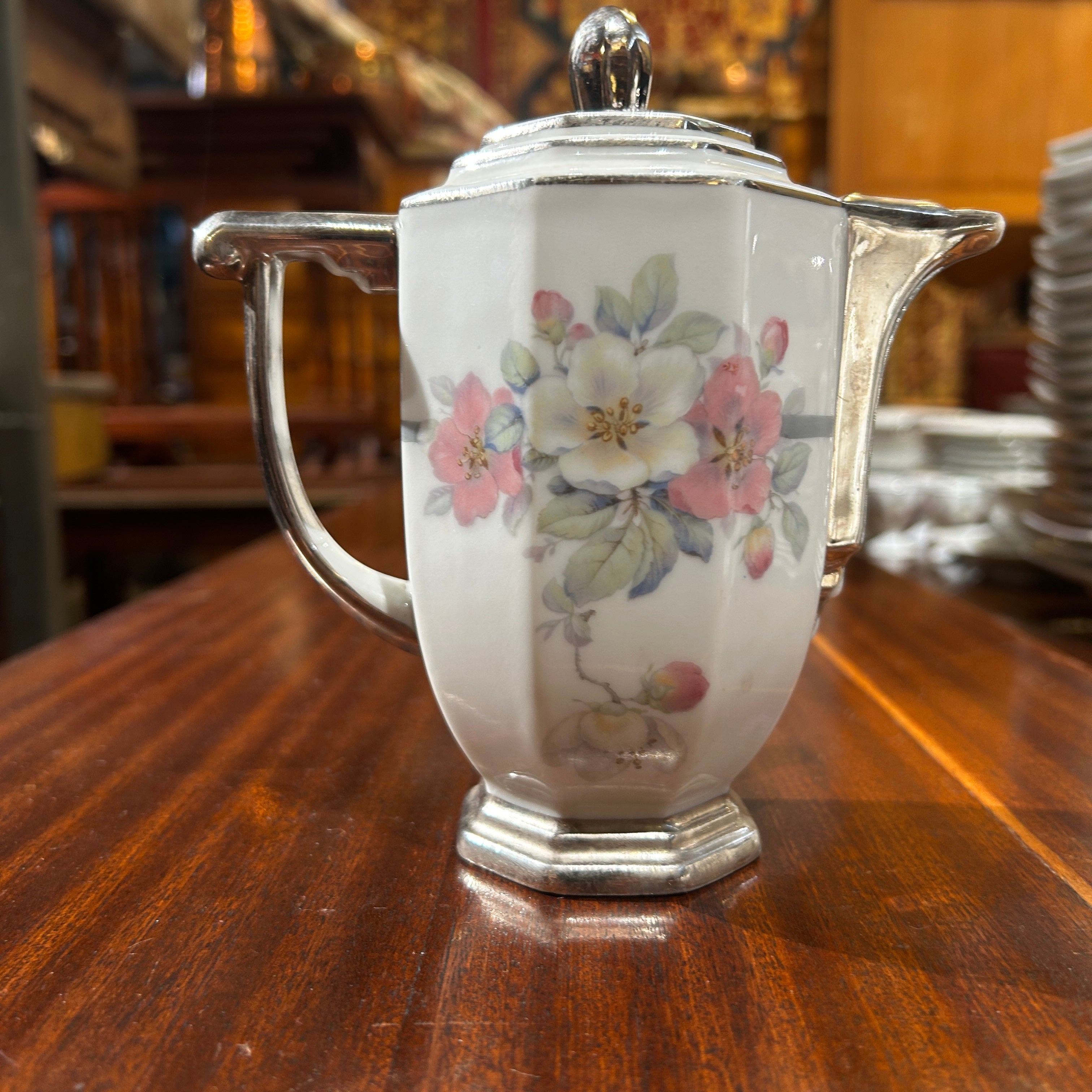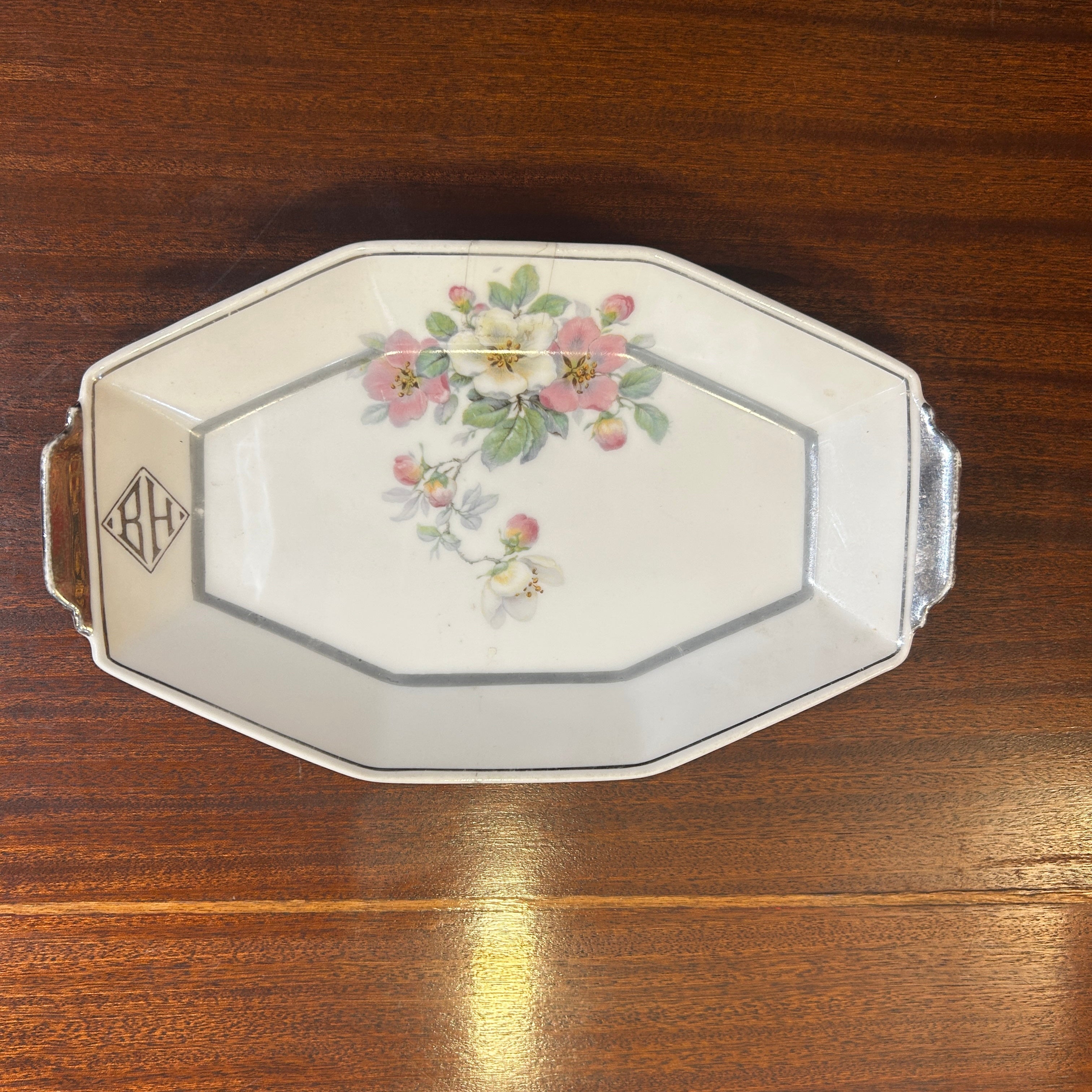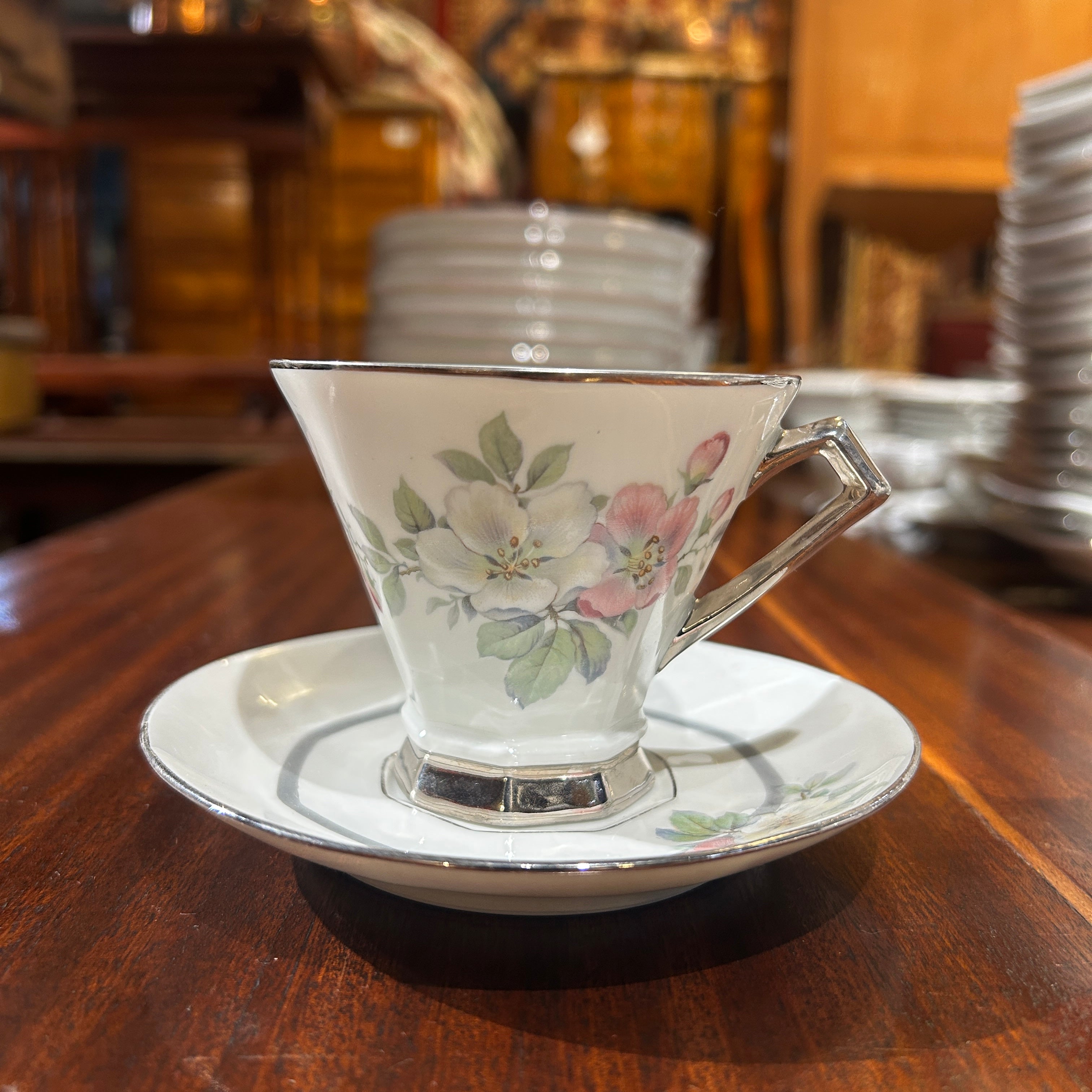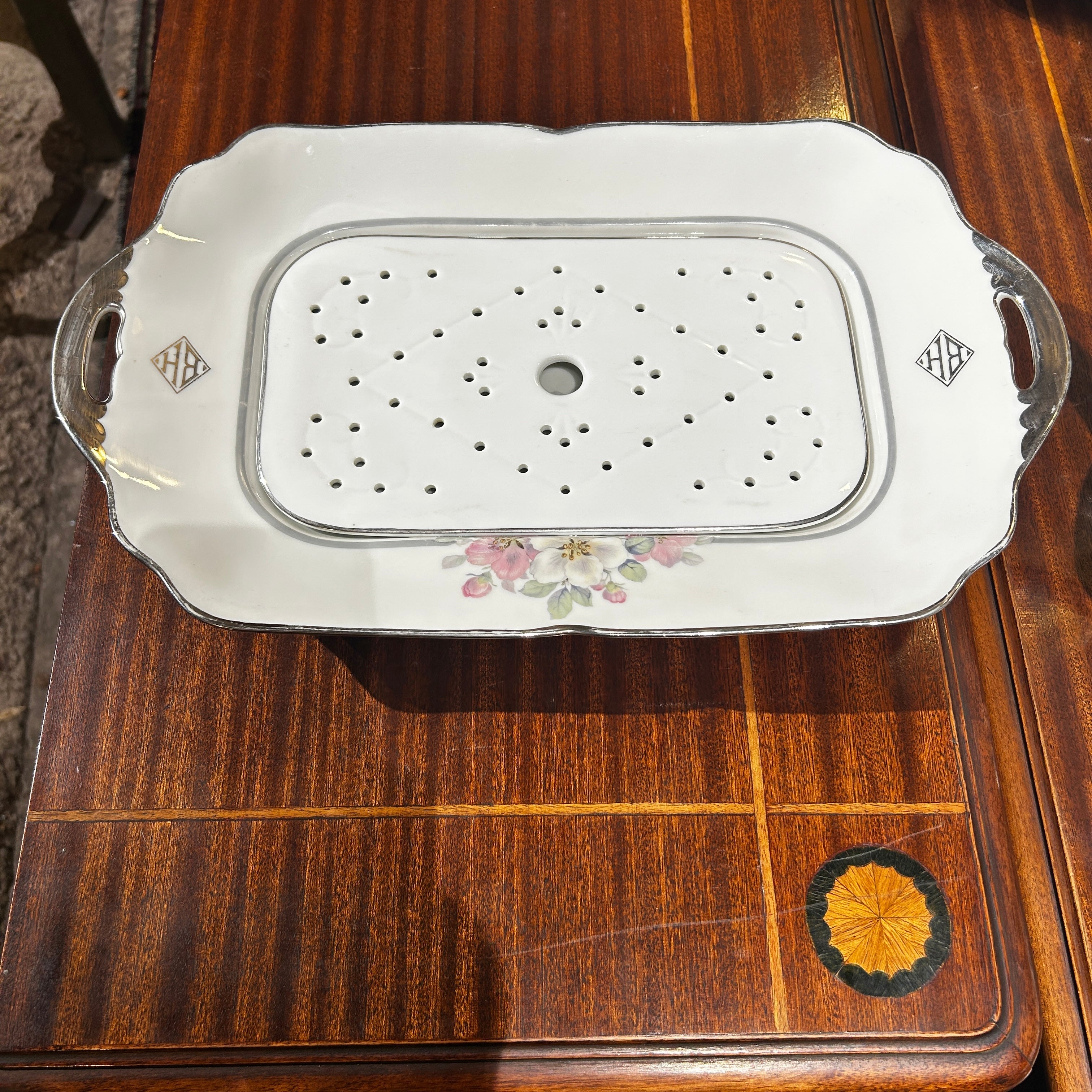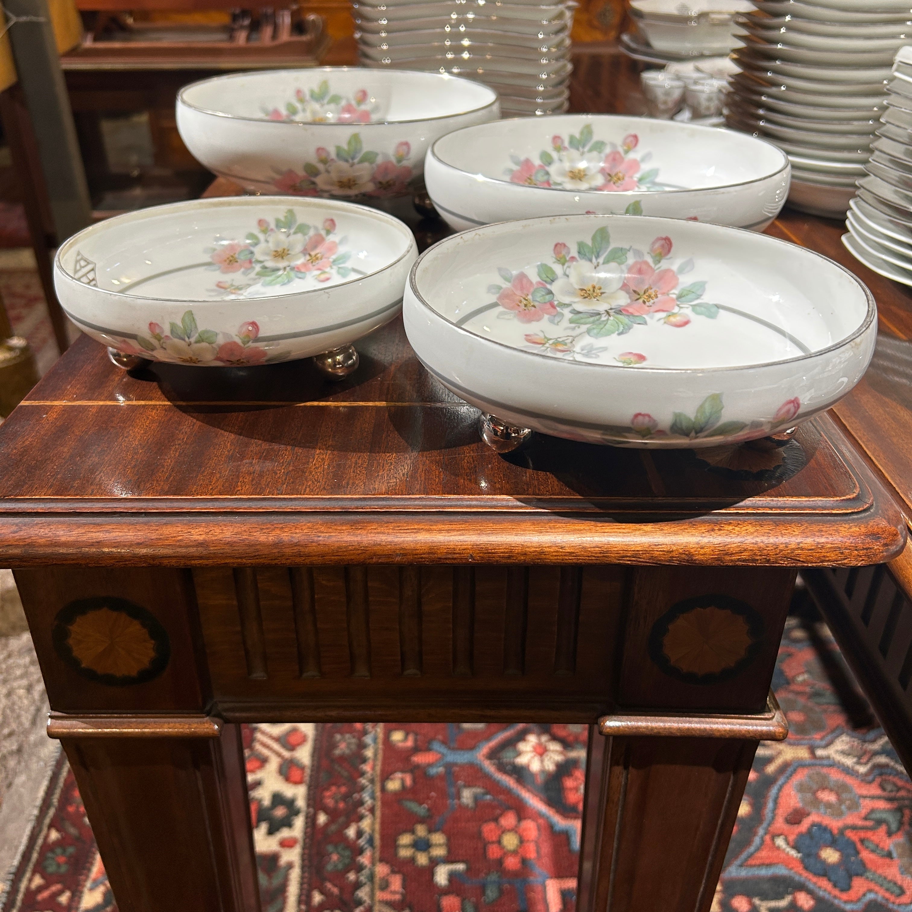 Magnífico juego de porcelana Limoges Raynaud Art Deco octagonal con delicadas terminaciones de plata y diseño floral, para 15 personas. Con piezas para doble juego de servir.