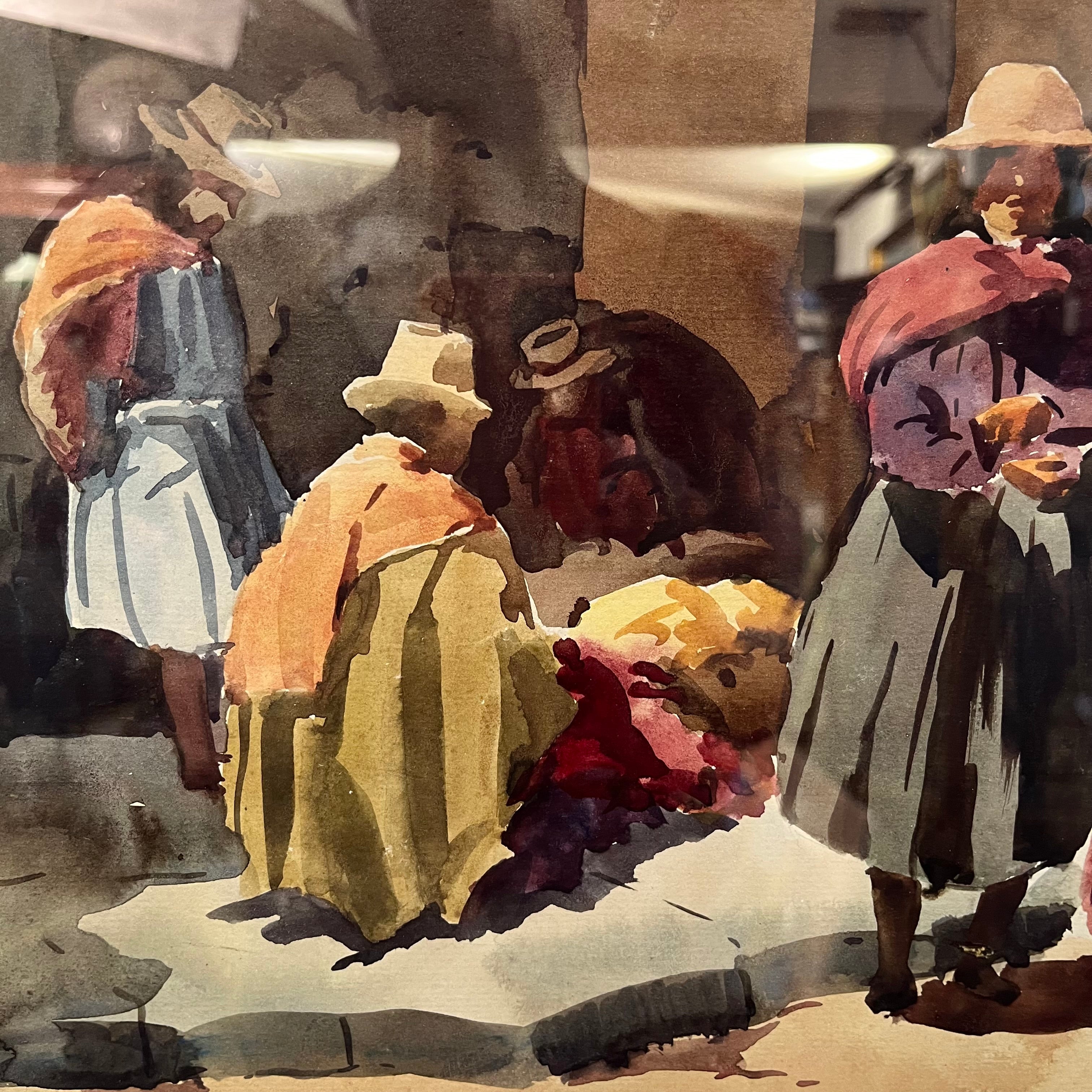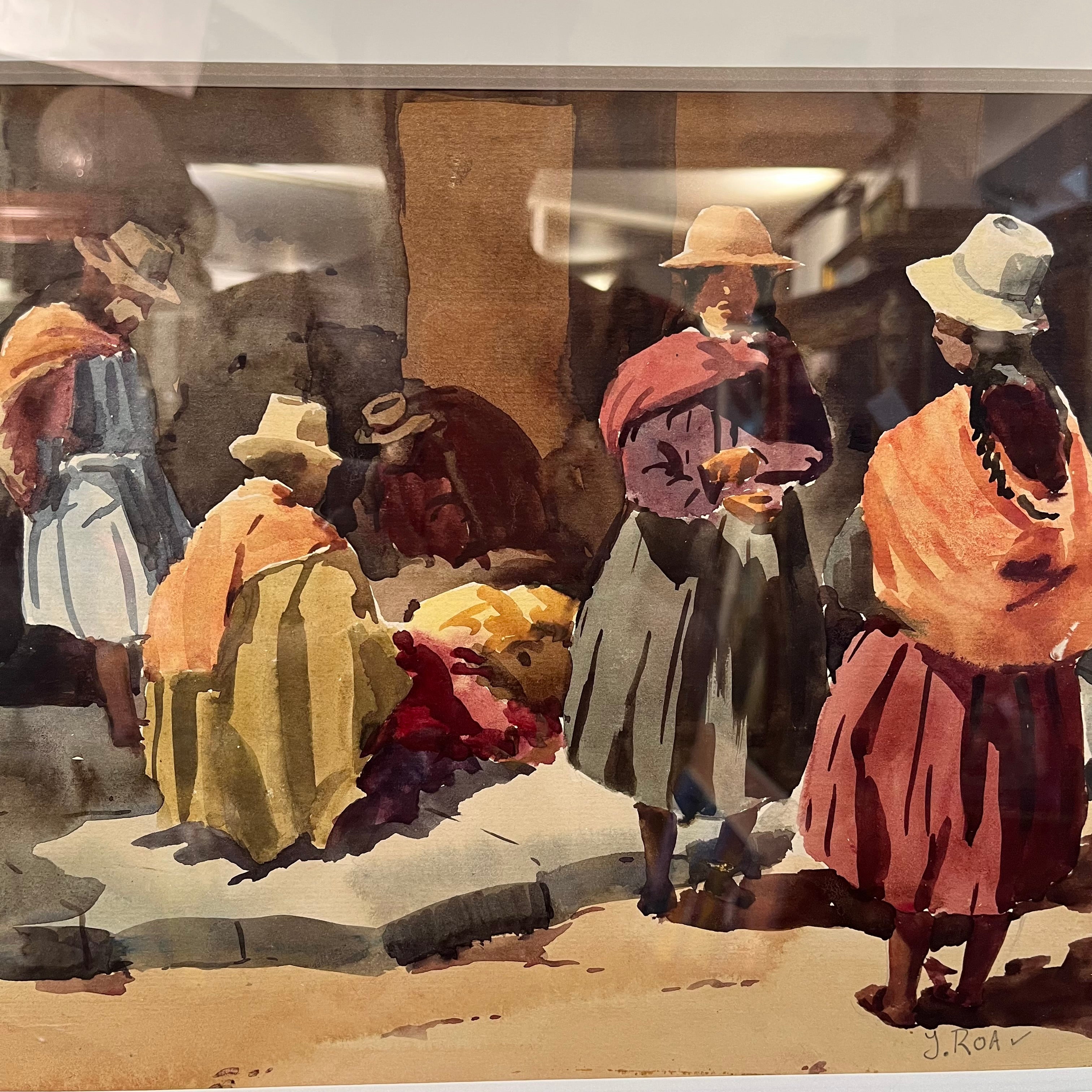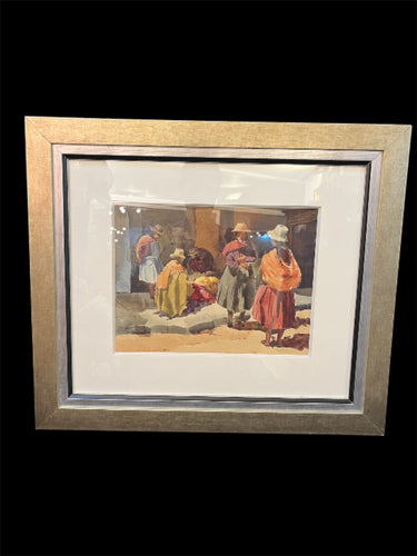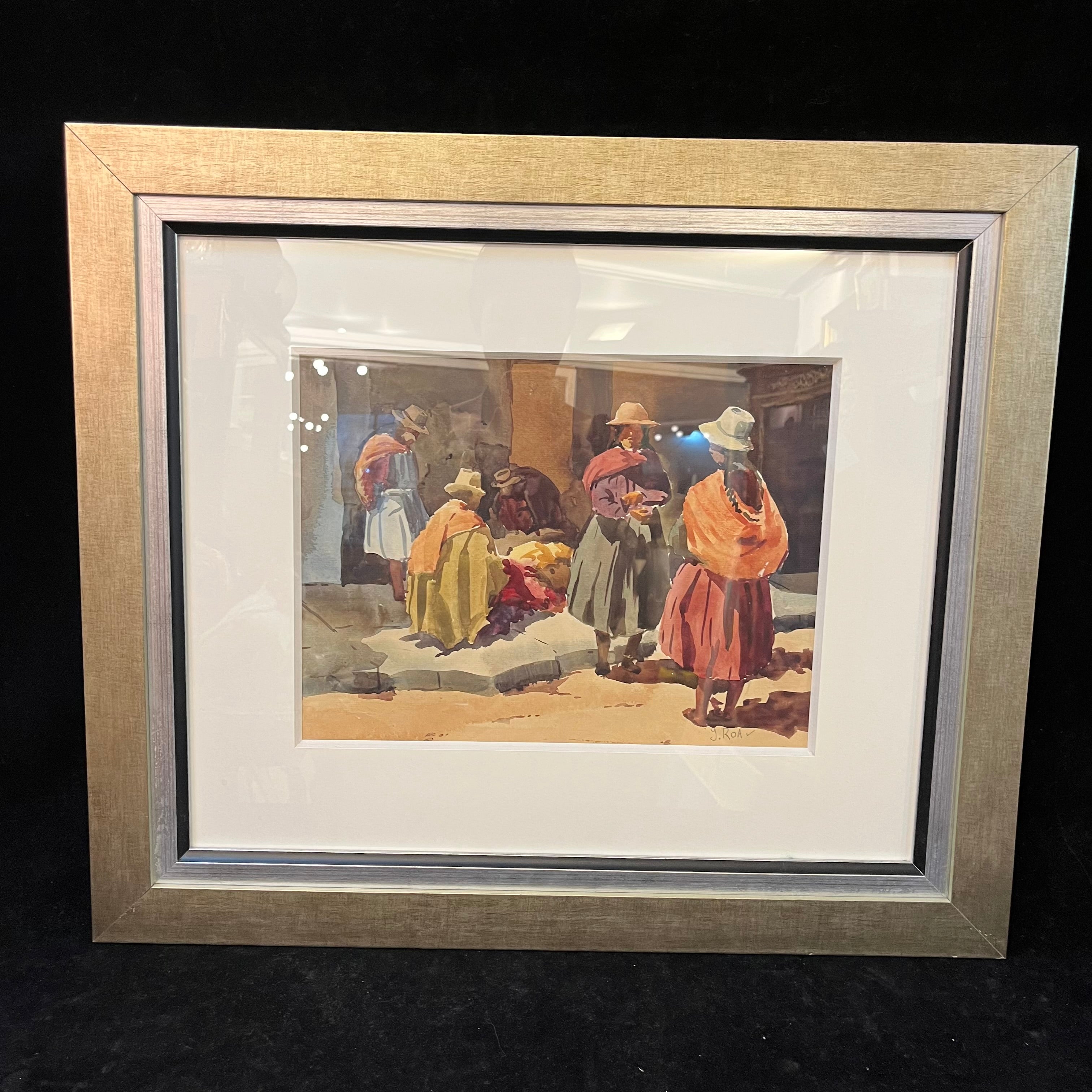 Atípica acuarela del pintor chileno Israel Roa, que retrata una hermosa escena de mujeres del norte, las clásicas cholas interactuando entre sí, en una calle. La pintura de intensos colores y marcadas siluetas encanta a primera vista con su singularidad.