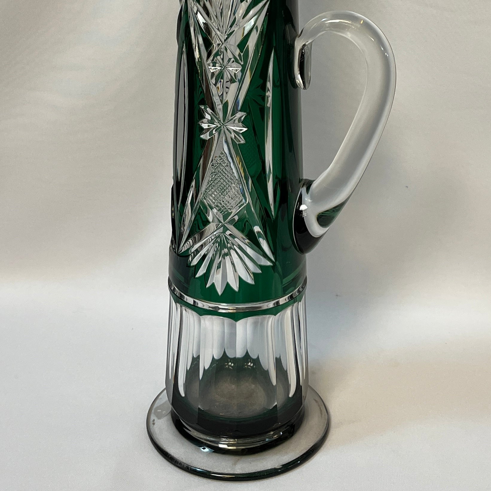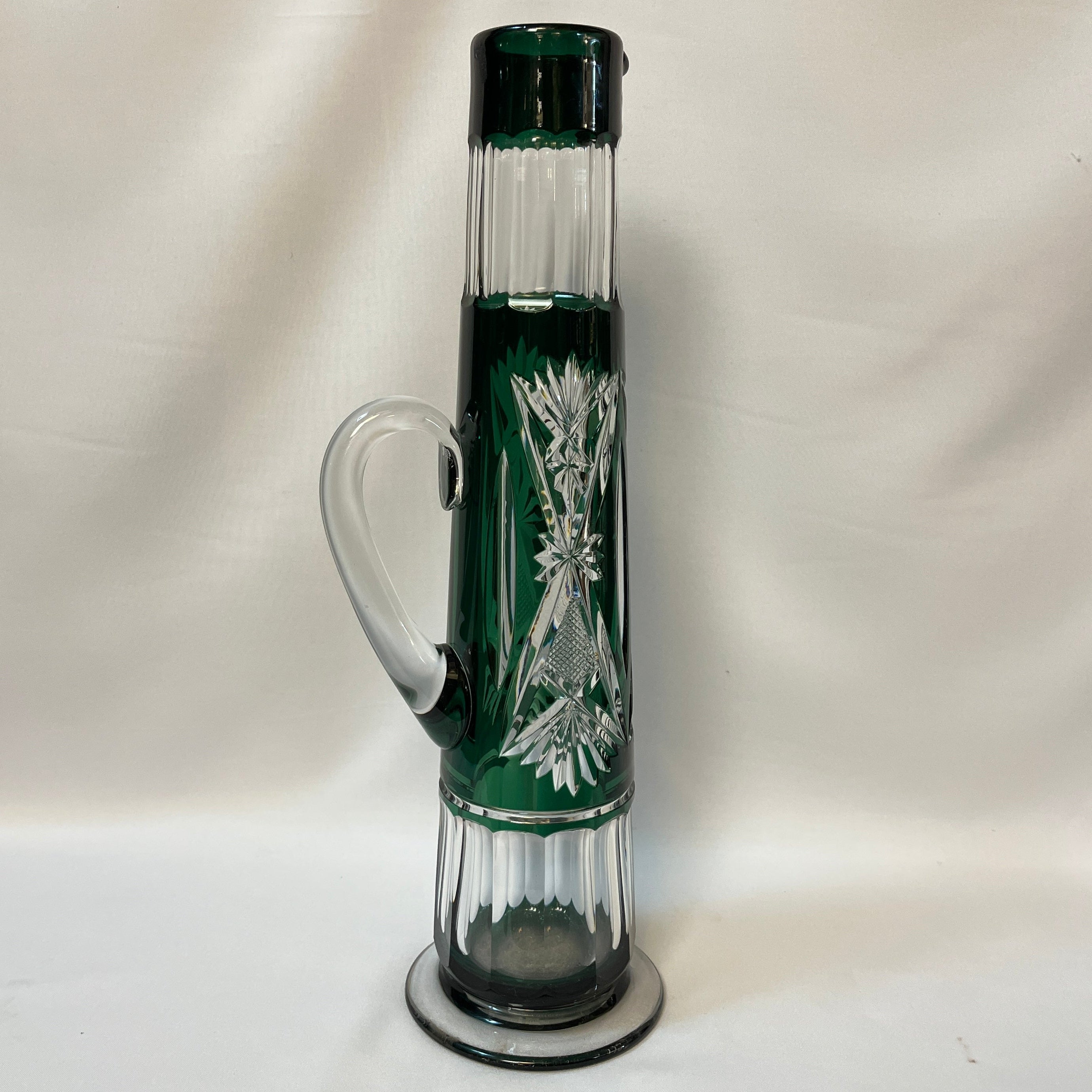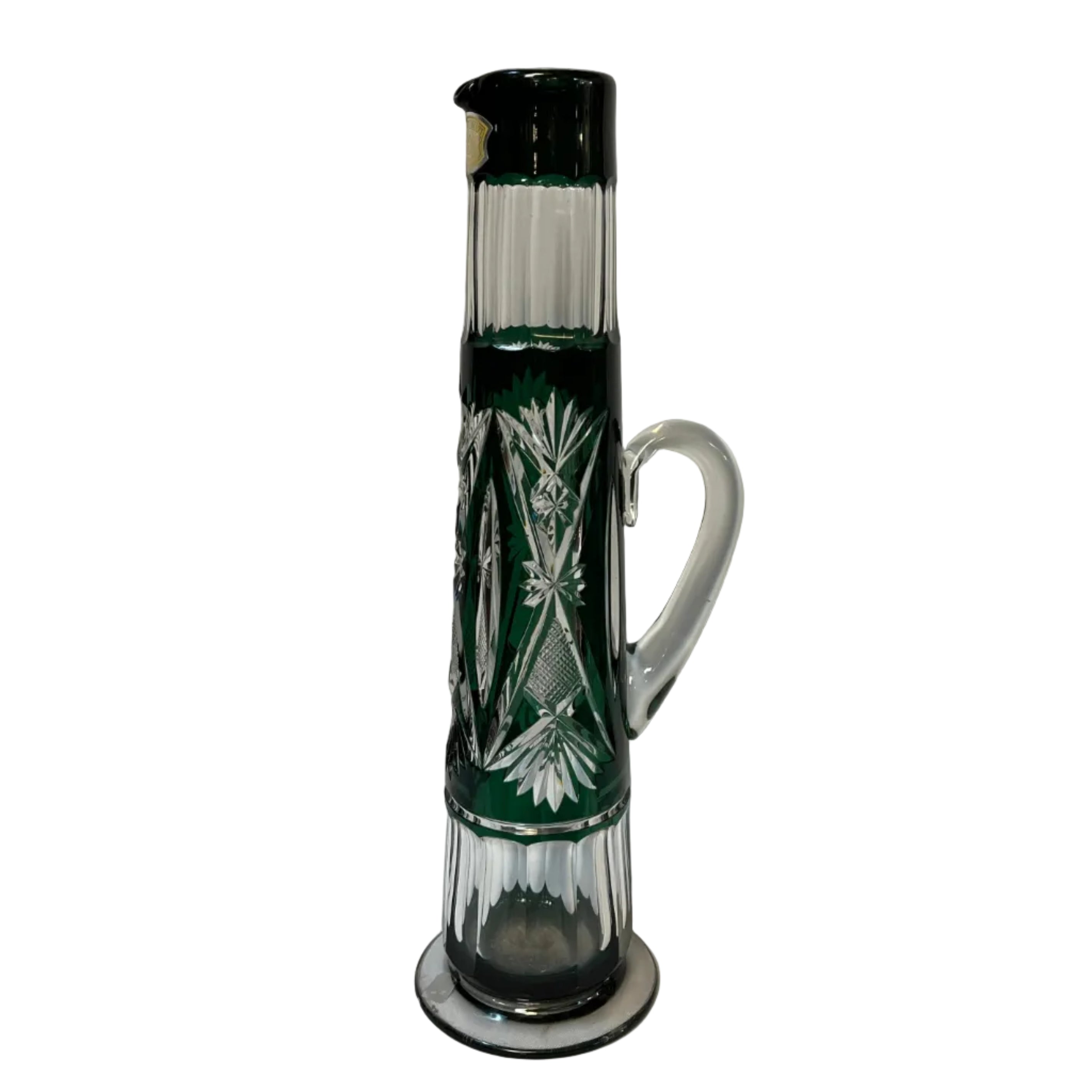 Hermosa jarra de cristal tallado y teñido de la prestigiosa firma Val Saint Lambert. Su elegante altura le otorga una presencia sofisticada, mientras que su delicado tono verde aporta frescura y distinción a cualquier espacio. La calidad del cristal y el fino trabajo de tallado reflejan la maestría característica de esta reconocida casa belga.