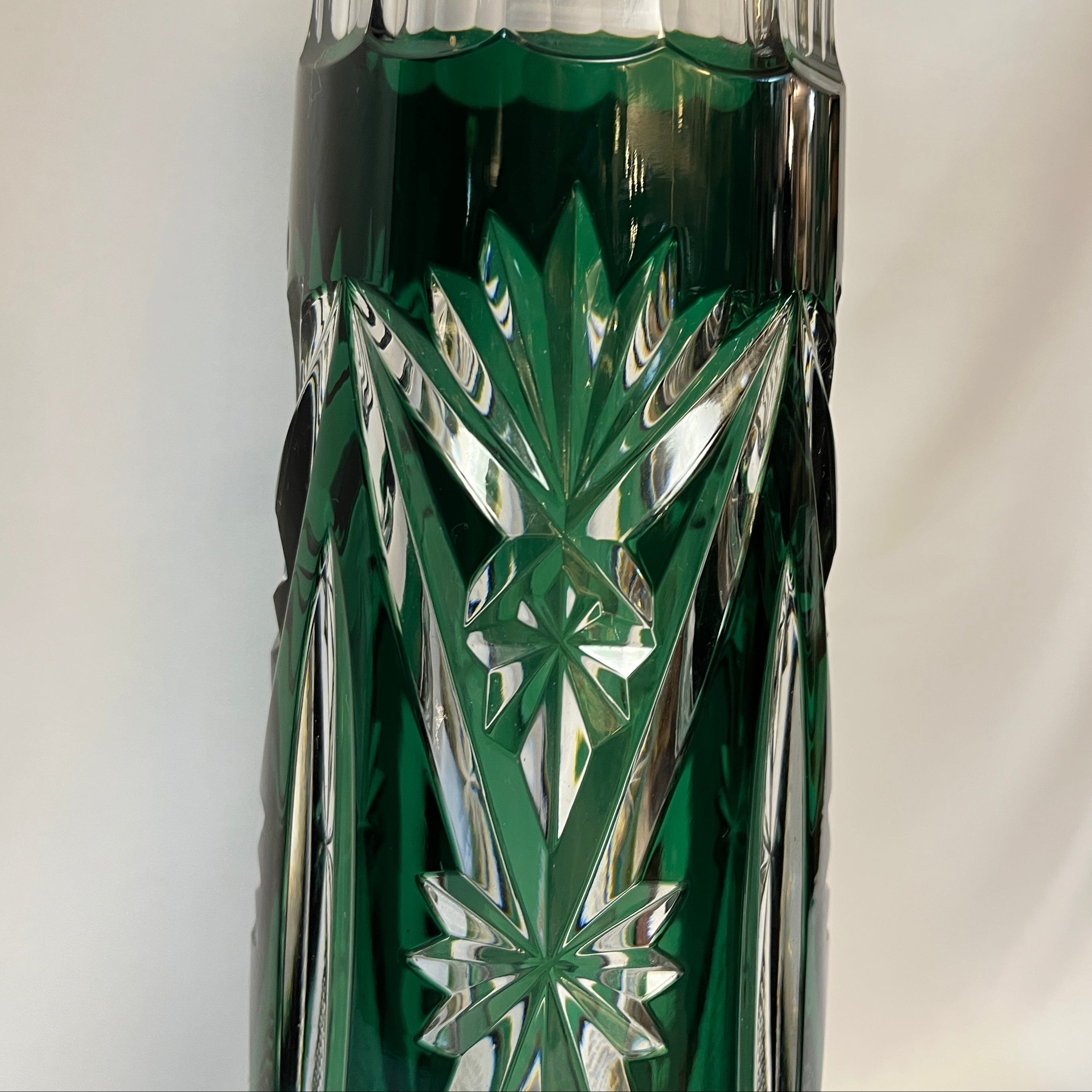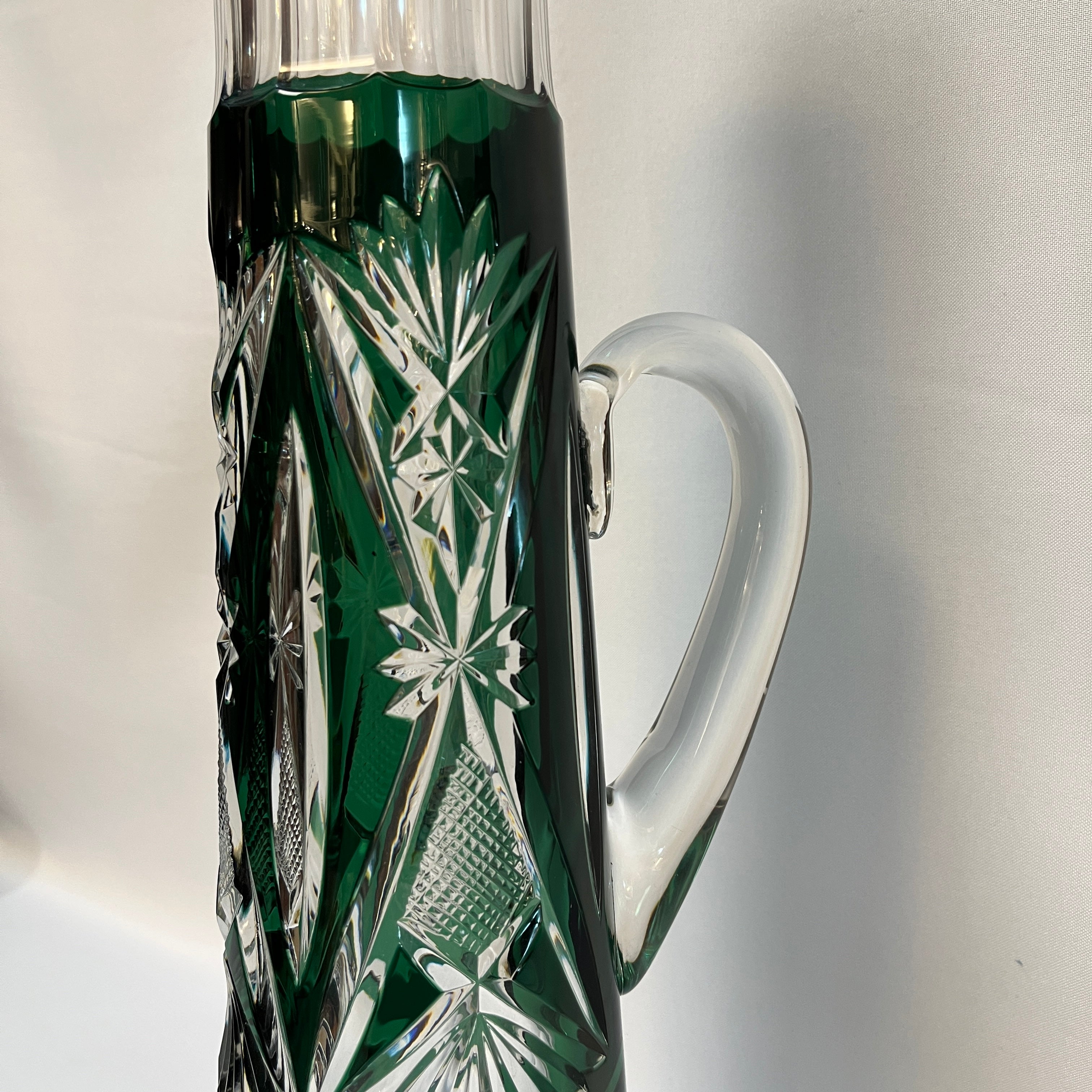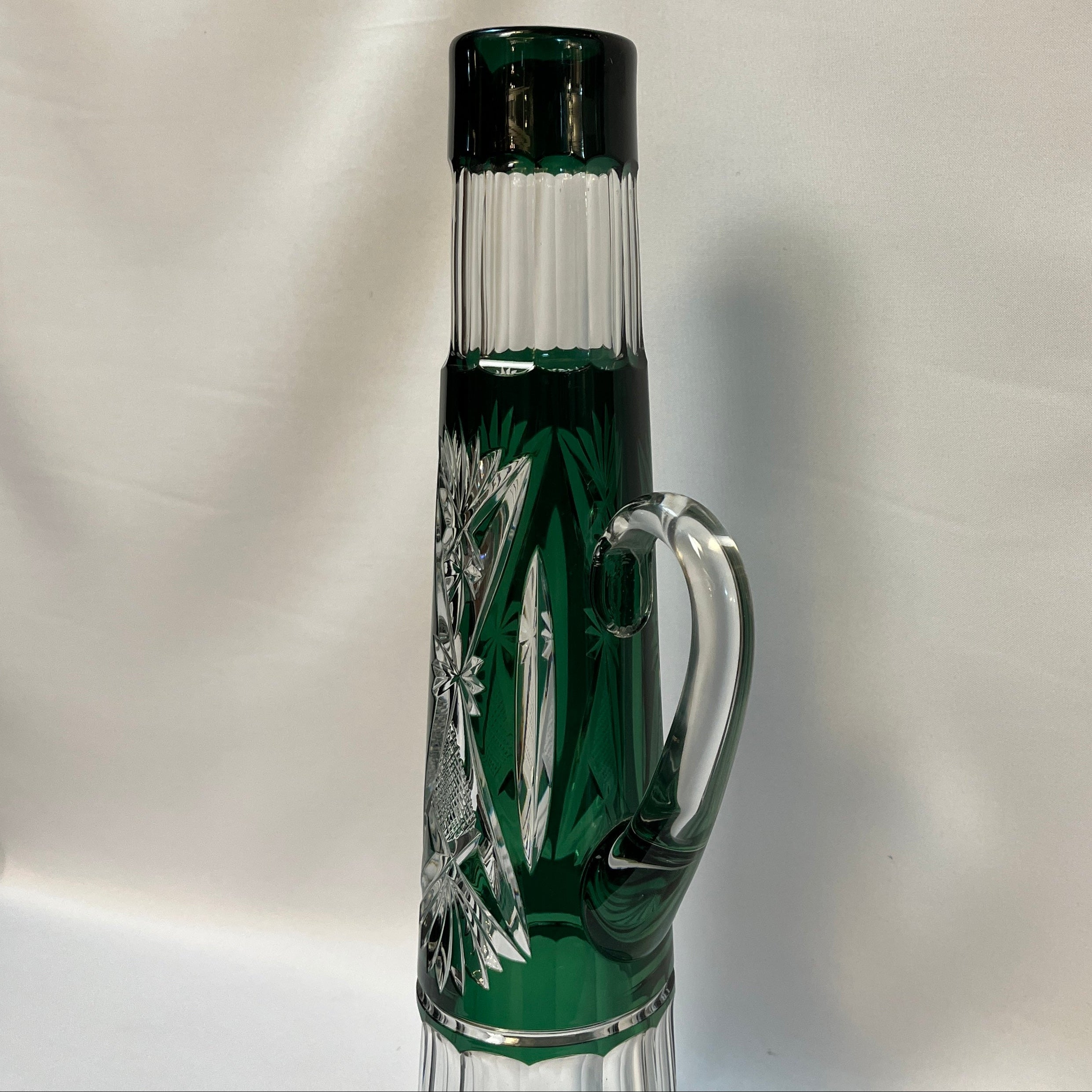 Hermosa jarra de cristal tallado y teñido de la prestigiosa firma Val Saint Lambert. Su elegante altura le otorga una presencia sofisticada, mientras que su delicado tono verde aporta frescura y distinción a cualquier espacio. La calidad del cristal y el fino trabajo de tallado reflejan la maestría característica de esta reconocida casa belga.