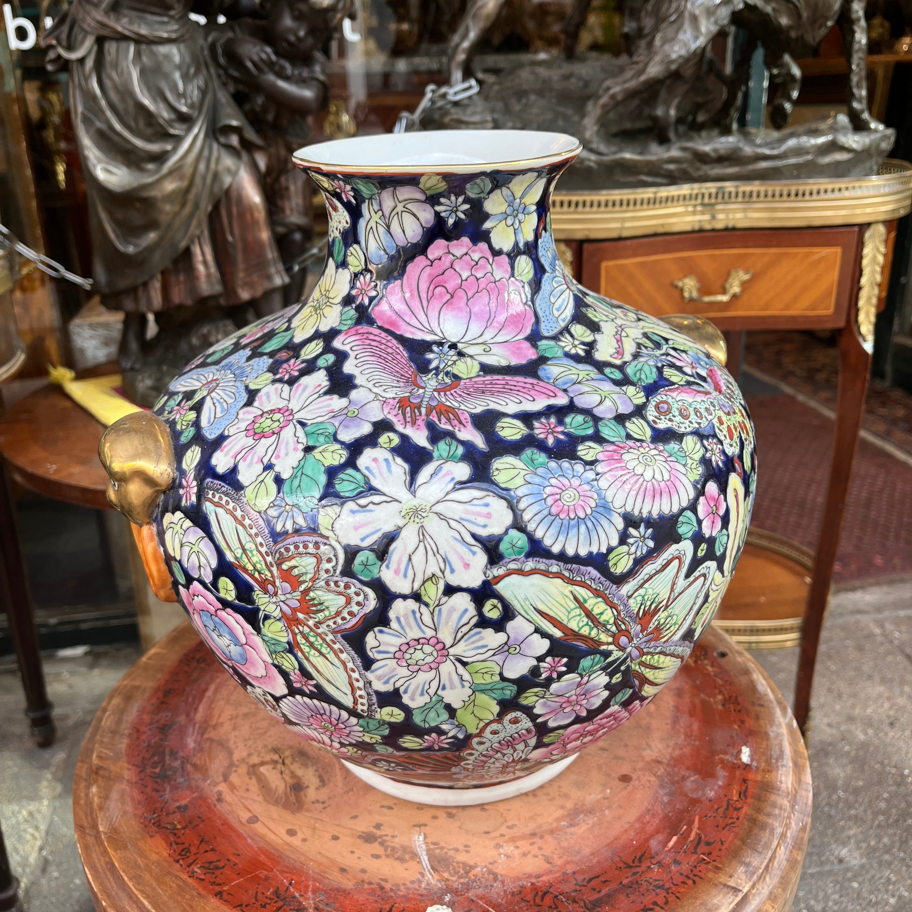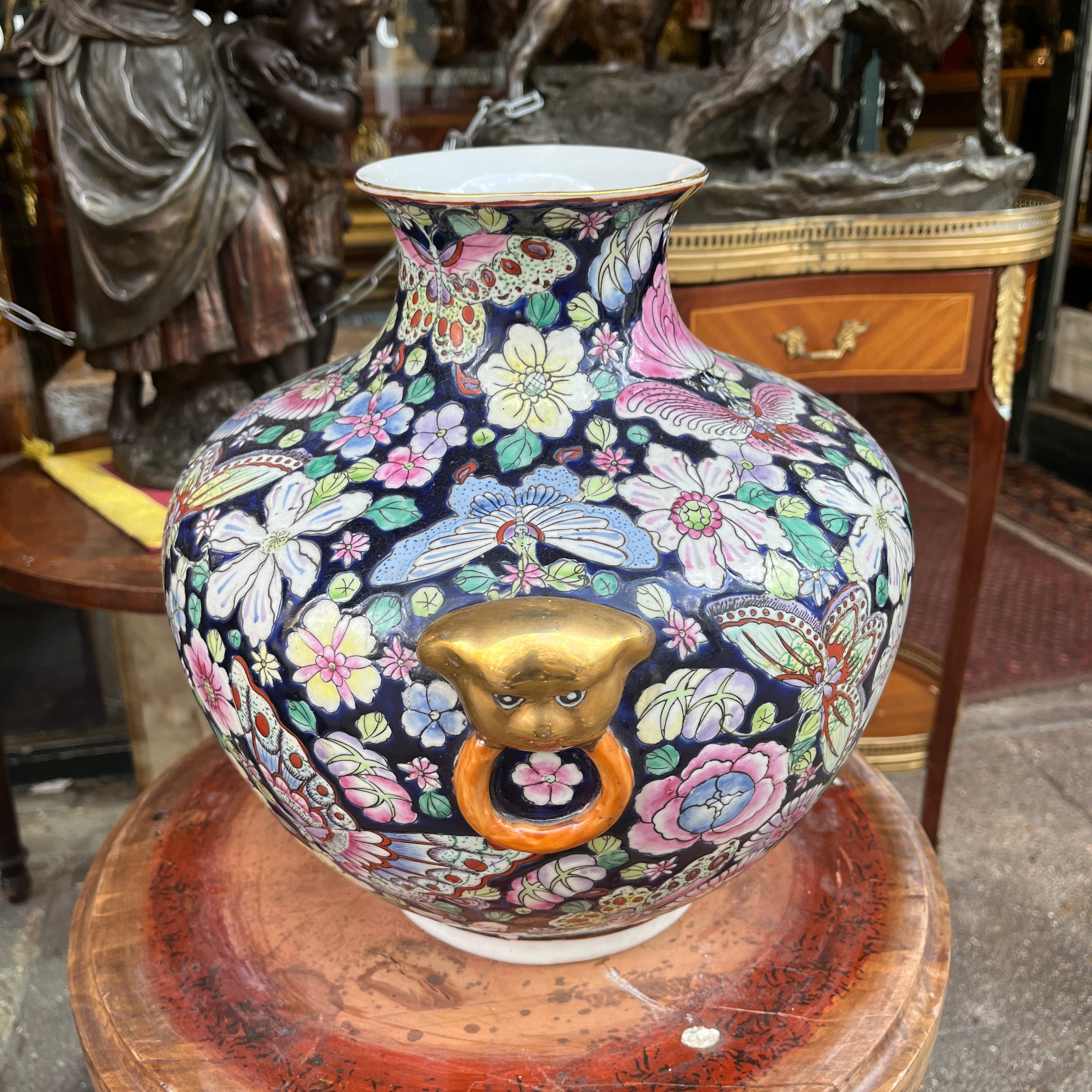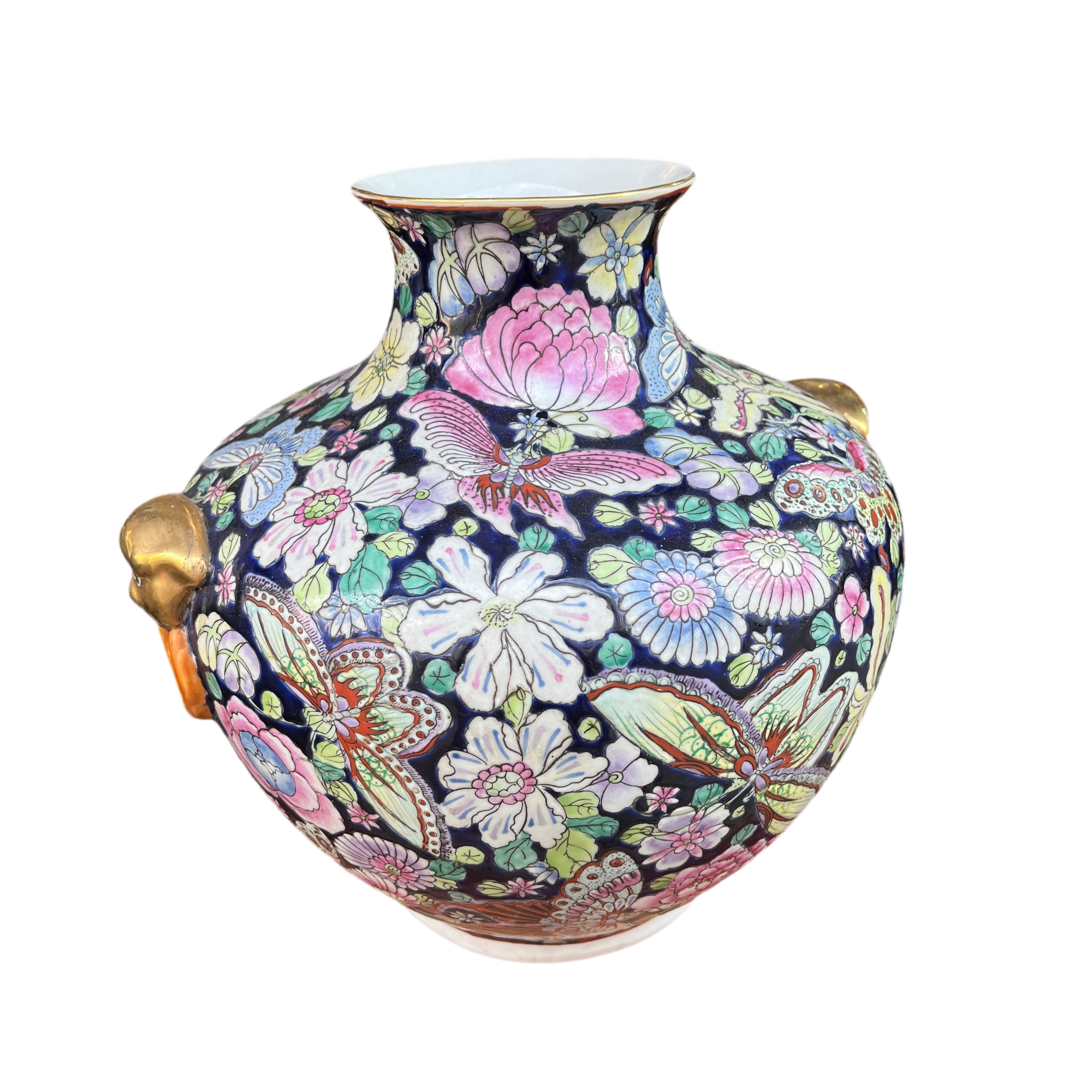 Bellísimo jarrón de porcelana de origen chino, perteneciente al estilo Famille Noir, esmaltado con finos decorados con motivos florales en blancos, rosas, verdes y violetas, acompañados de grandes mariposas de color verde y rojo. El jarrón tiene detalles en dorado en su cuello y base, además de dos asas perro Fü, también terminadas en elegante dorado.