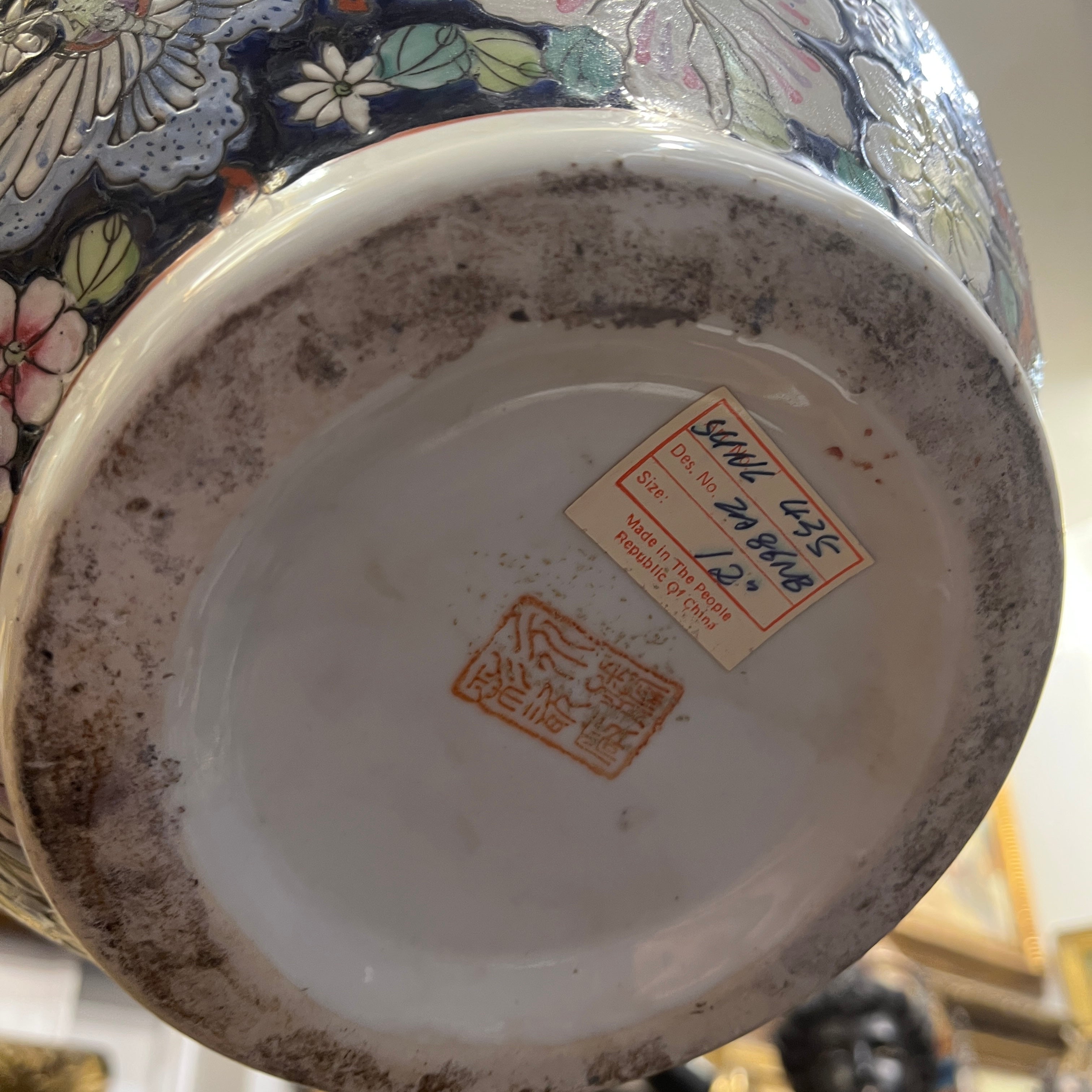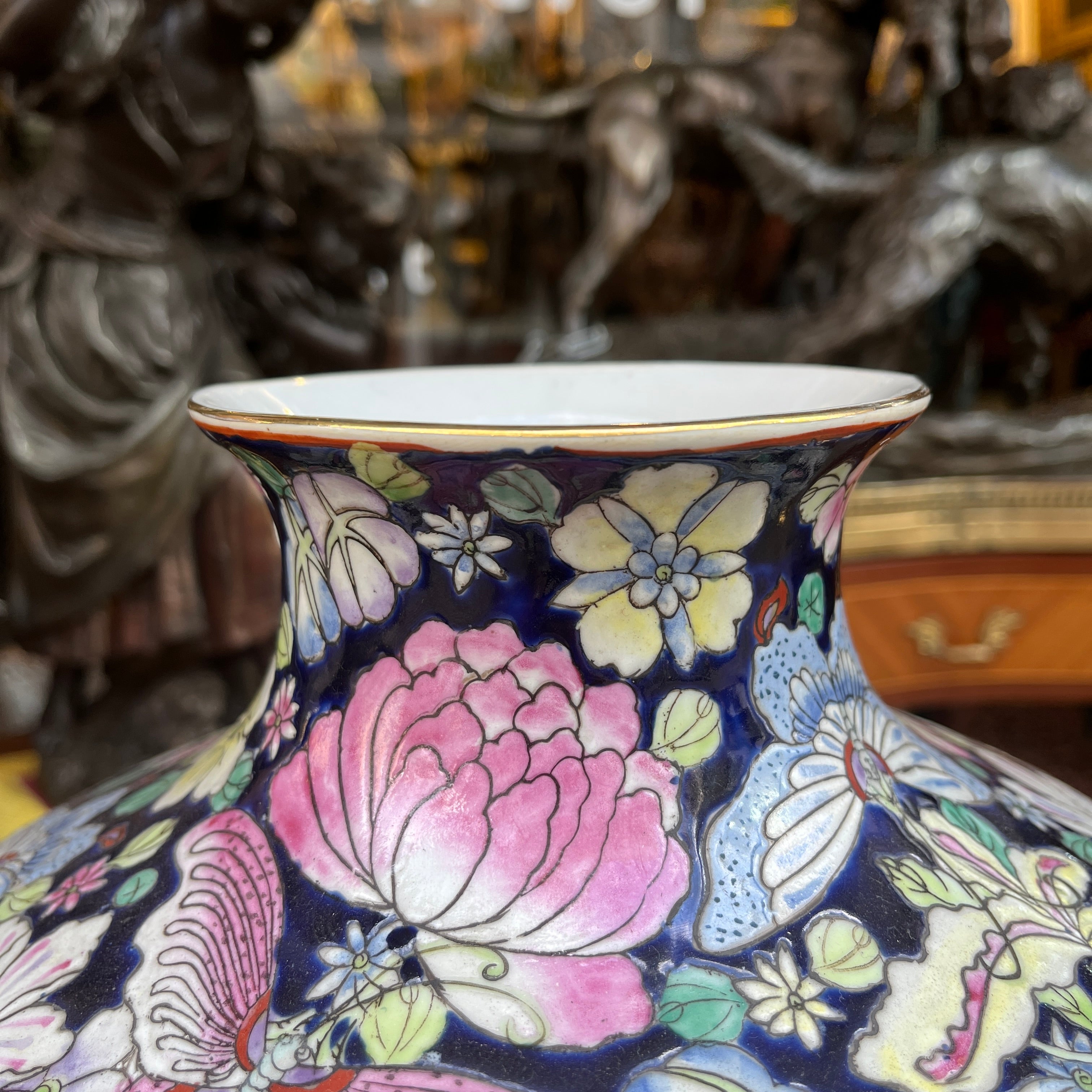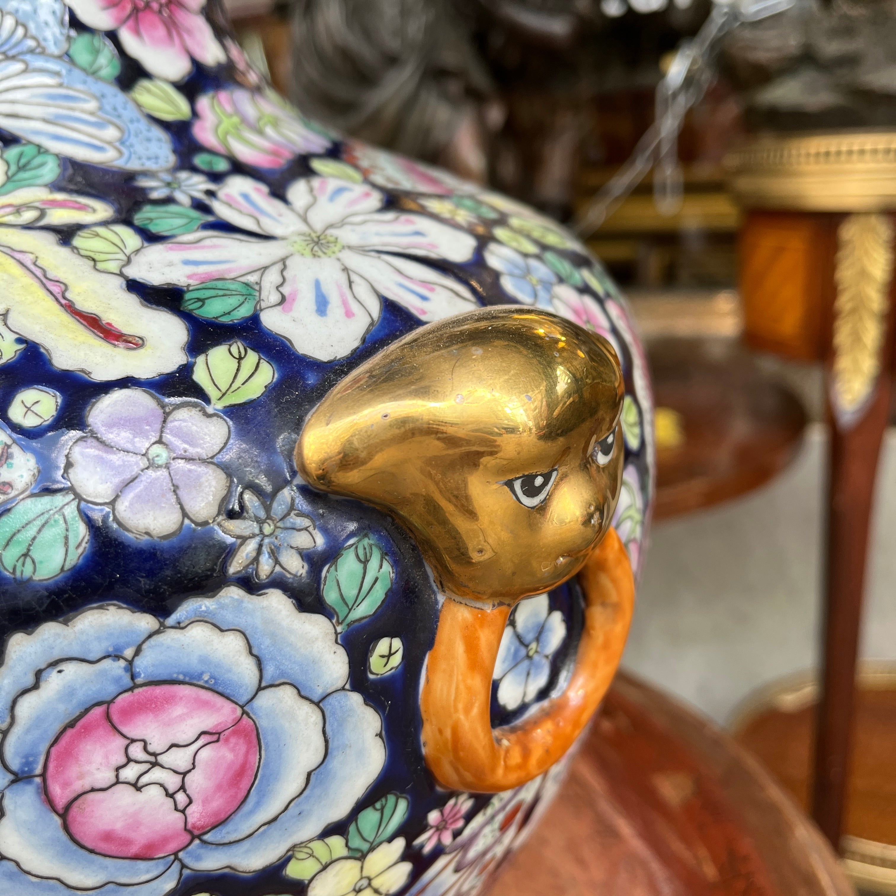 Bellísimo jarrón de porcelana de origen chino, perteneciente al estilo Famille Noir, esmaltado con finos decorados con motivos florales en blancos, rosas, verdes y violetas, acompañados de grandes mariposas de color verde y rojo. El jarrón tiene detalles en dorado en su cuello y base, además de dos asas perro Fü, también terminadas en elegante dorado.