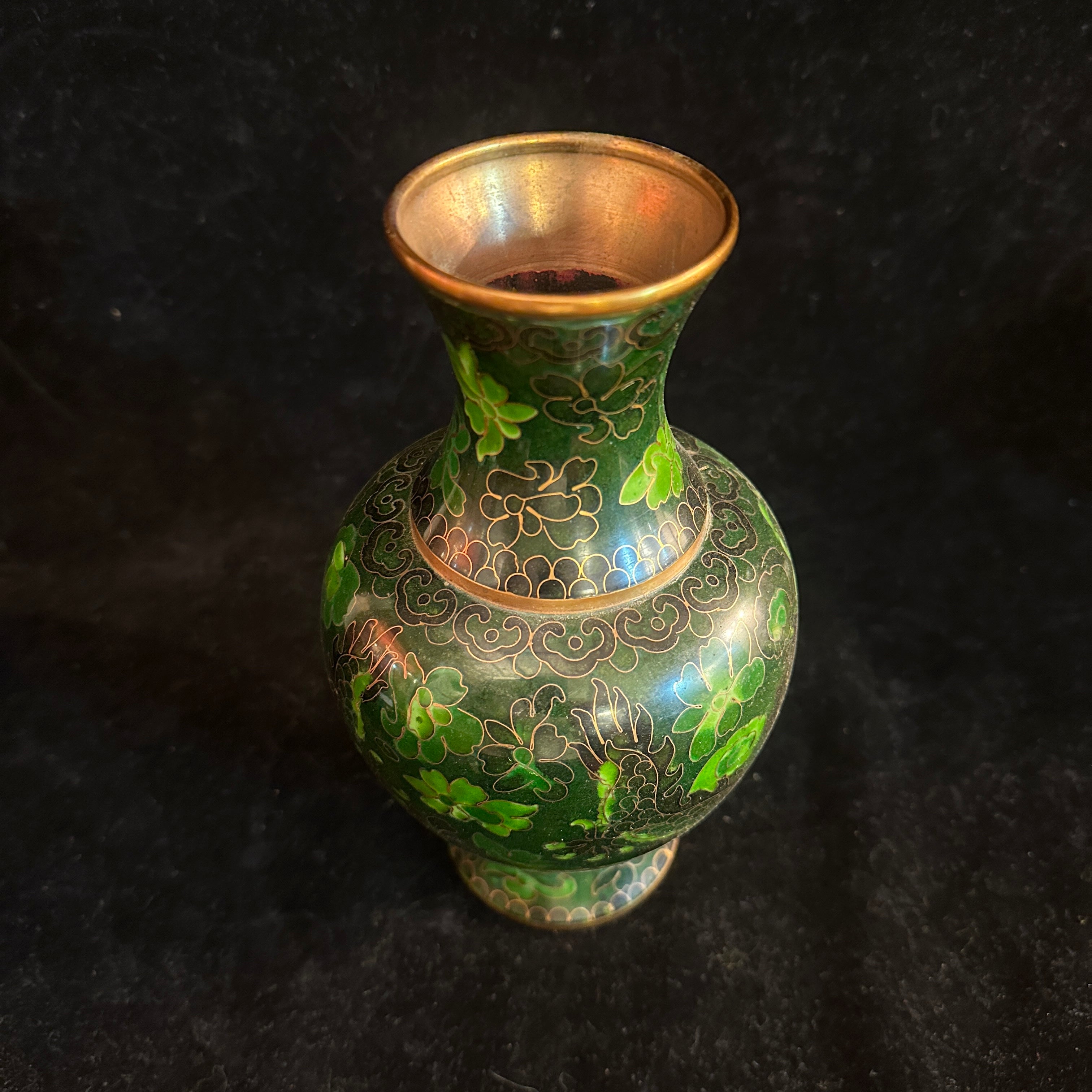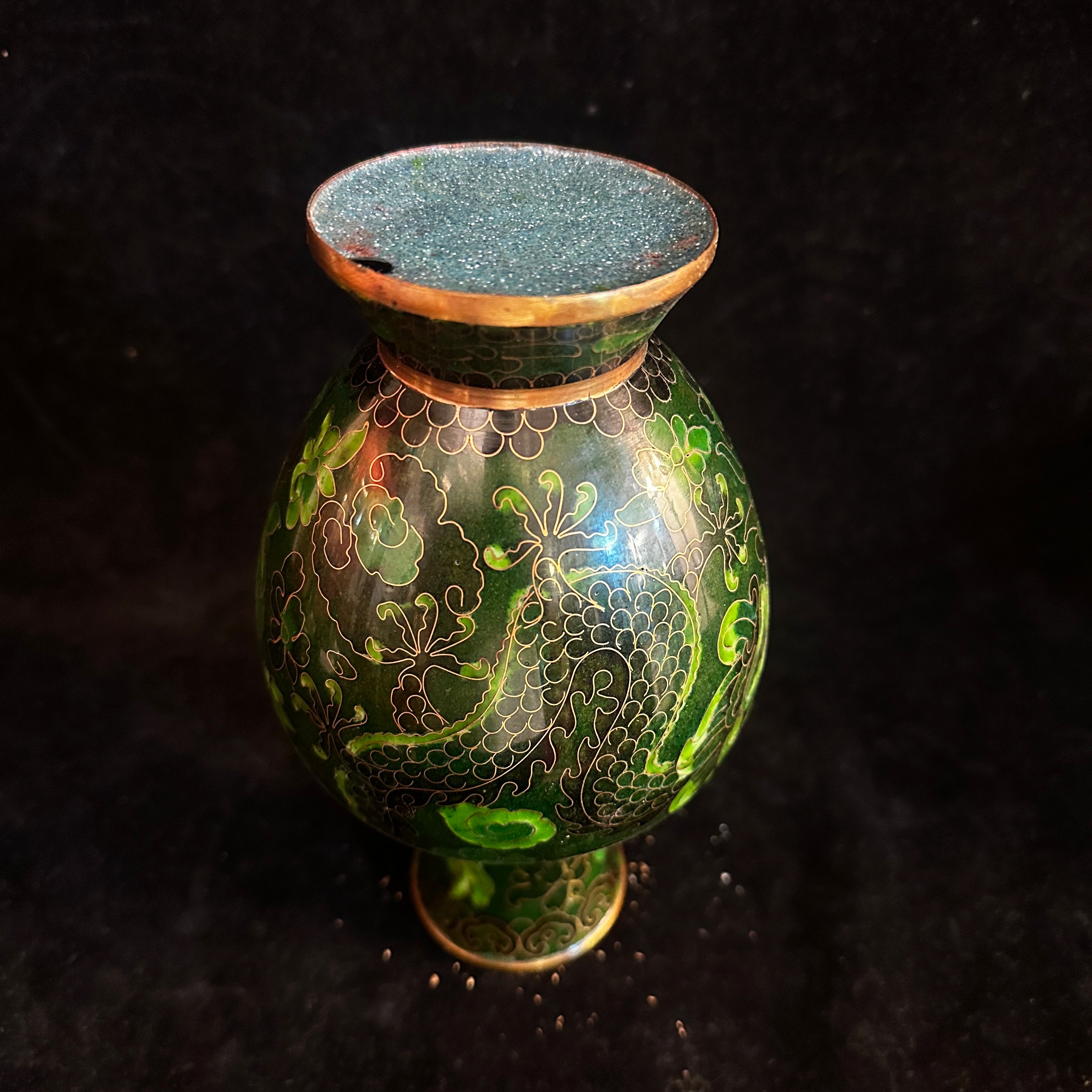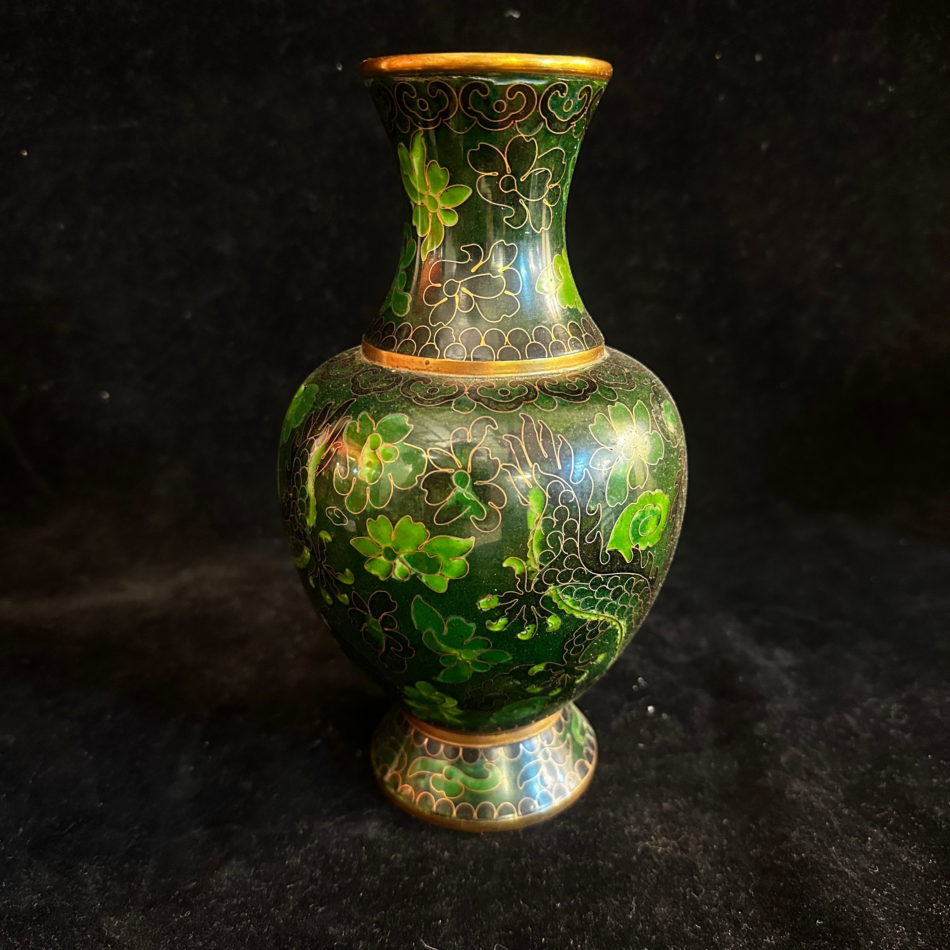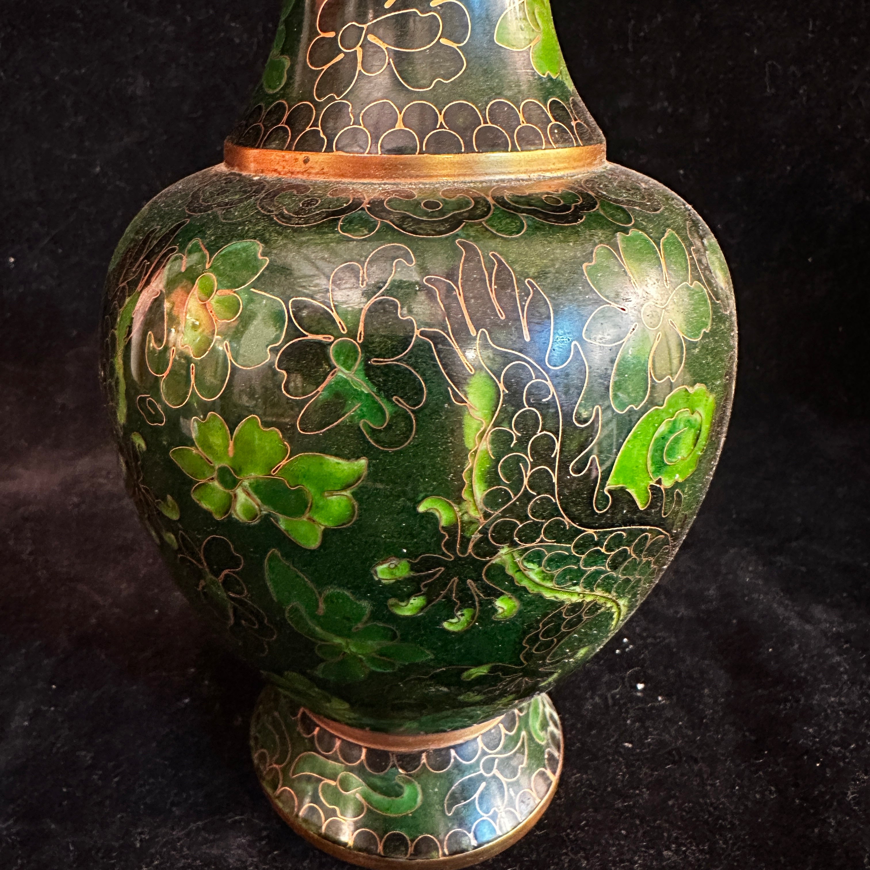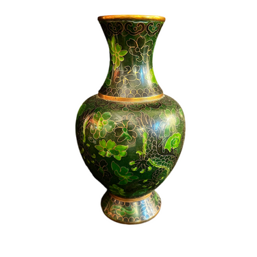 A beautiful cloissoné bronze vase of Chinese origin, featuring a gorgeous dark green enamel, gold-plated plant motifs, and two dragons as central figures running across the entire surface. Its base is finished with a light blue enamel.
