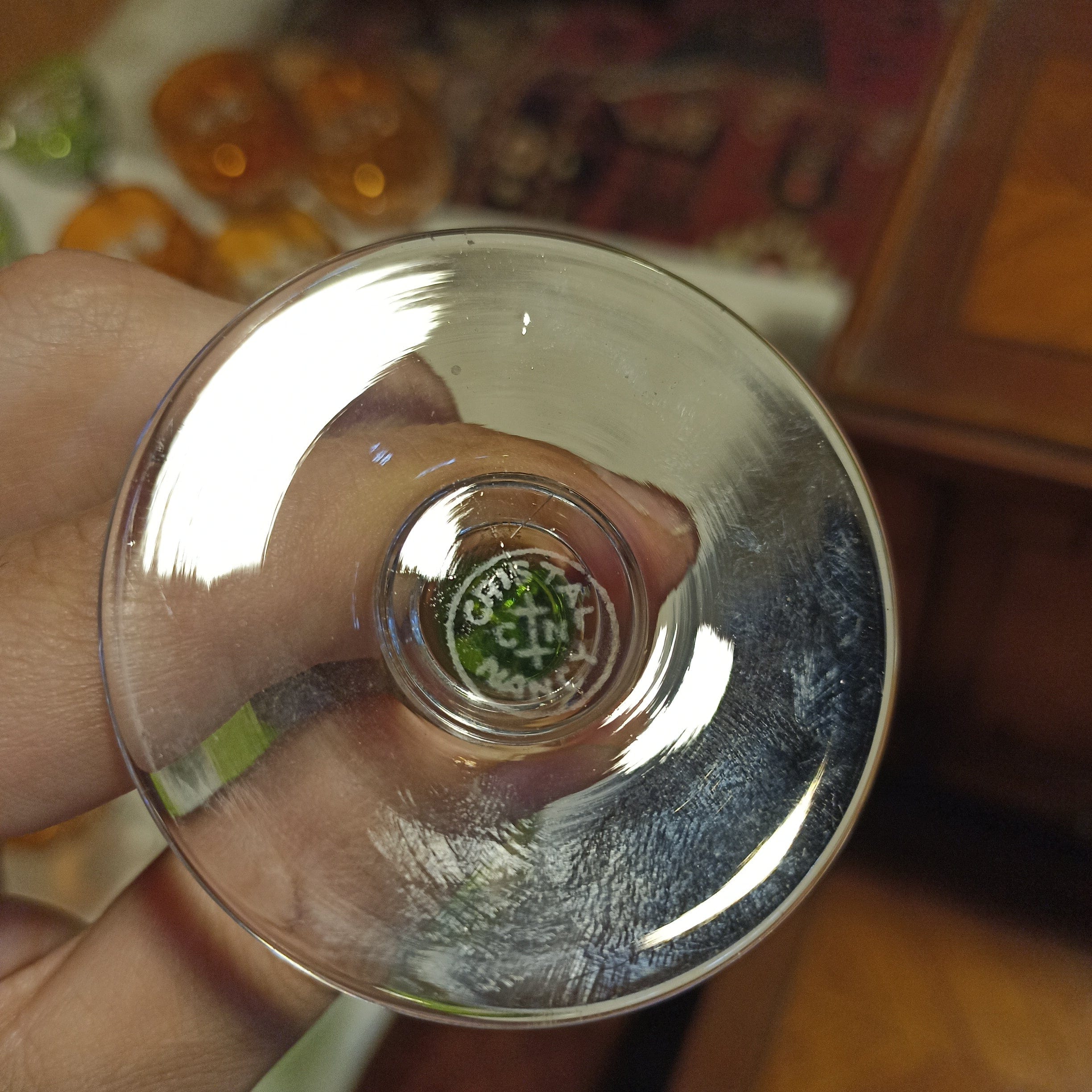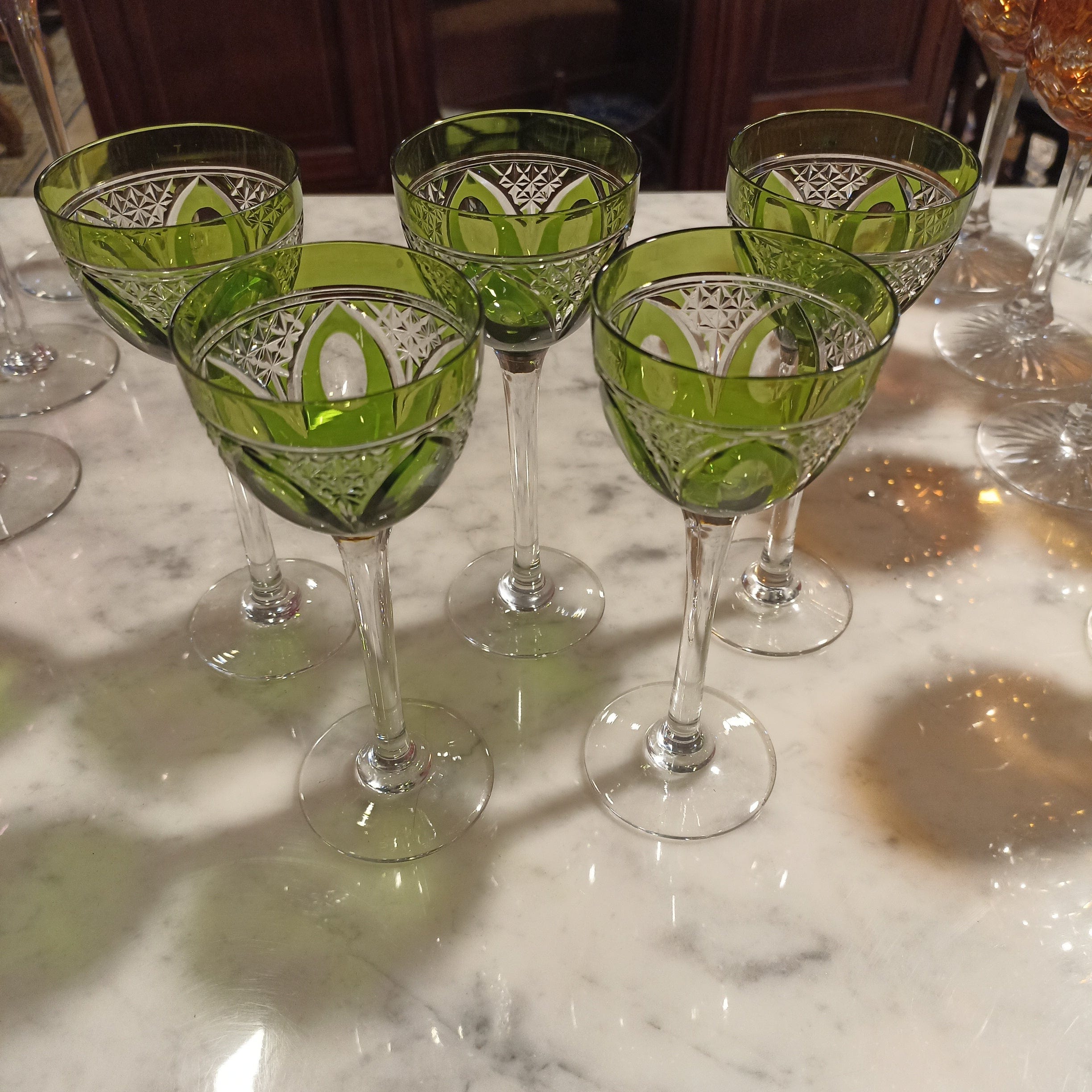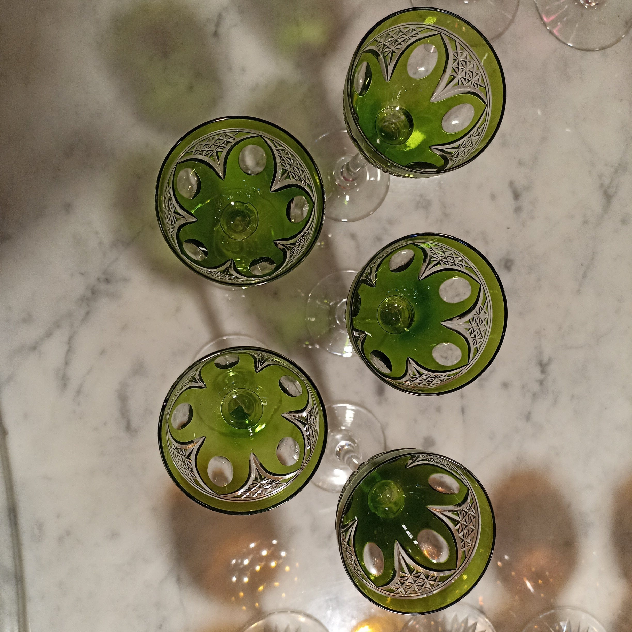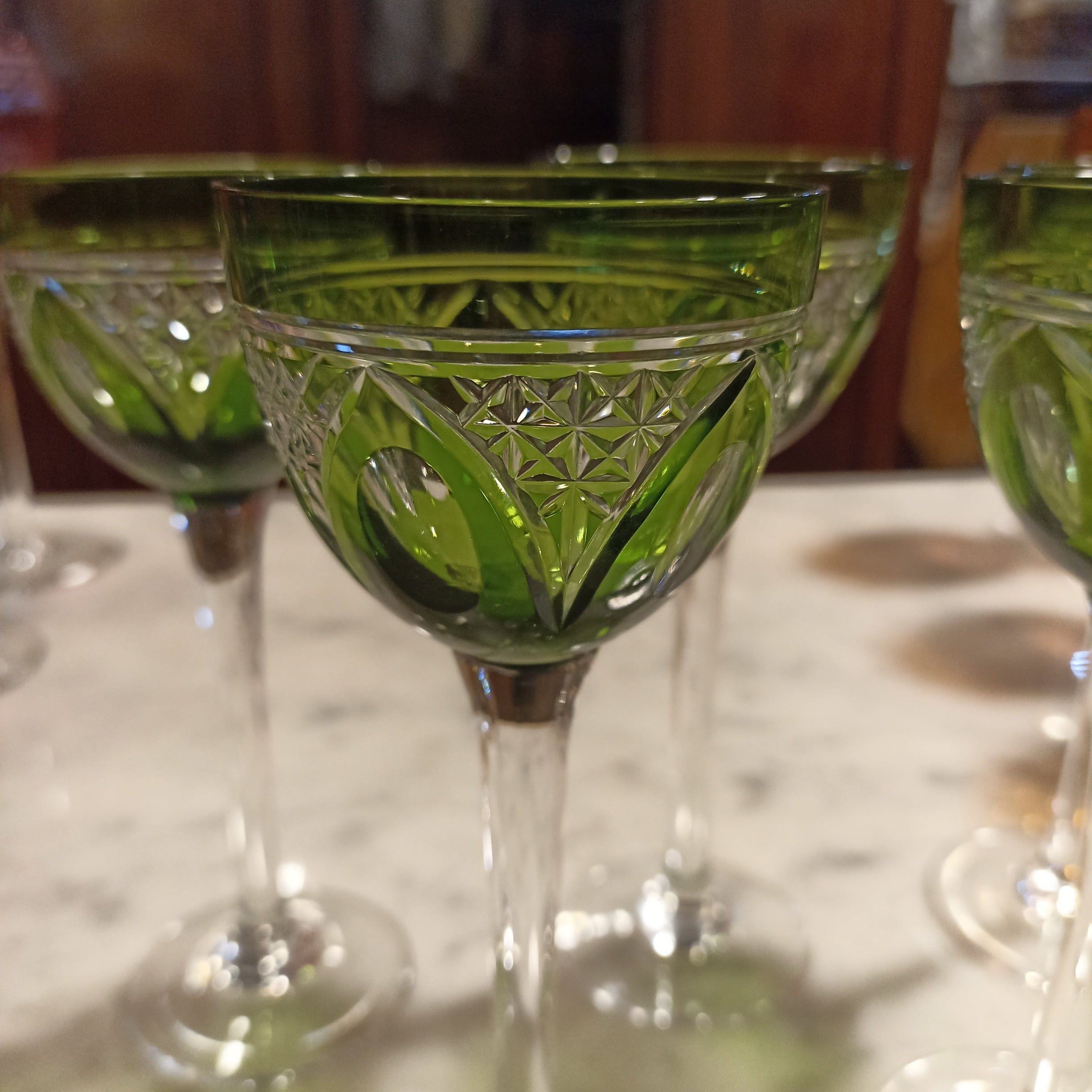 Very fine set of five Nancy cut crystal white wine glasses, French in green tone.