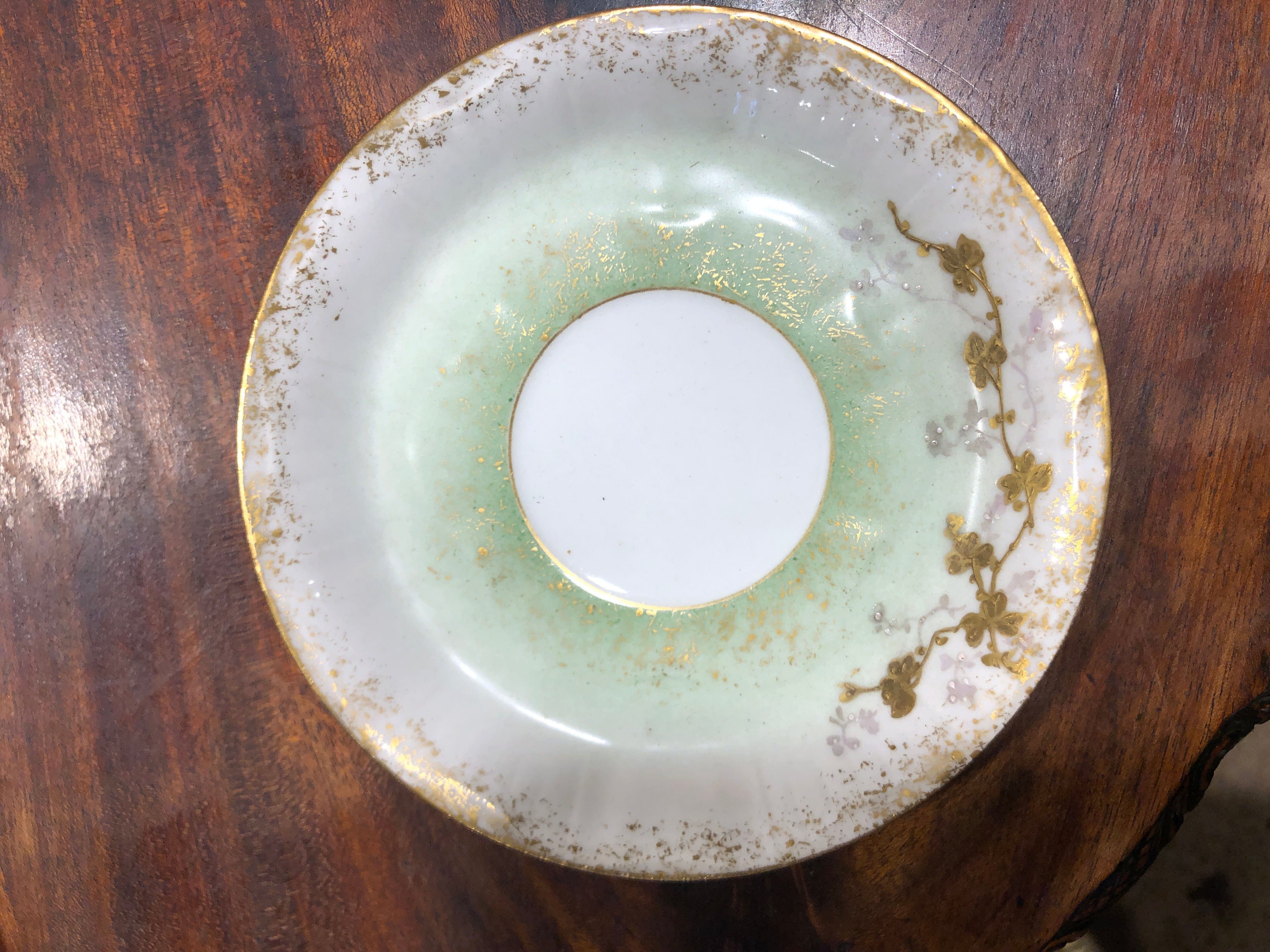 Special coffee service for twelve people with a porcelain tray, featuring exquisite hand-painted floral details in gold ormolu on a mint background. Unsigned, factory proof.