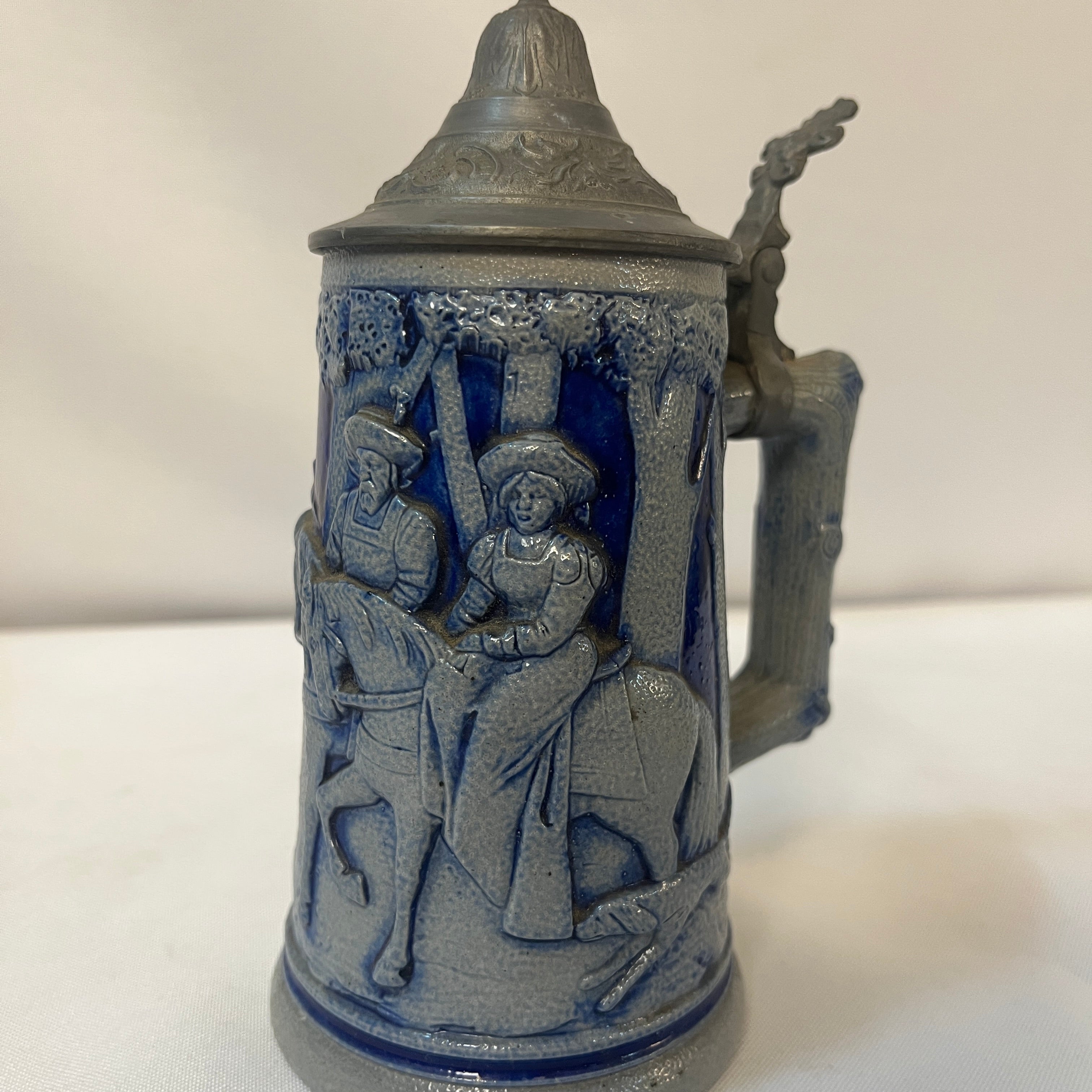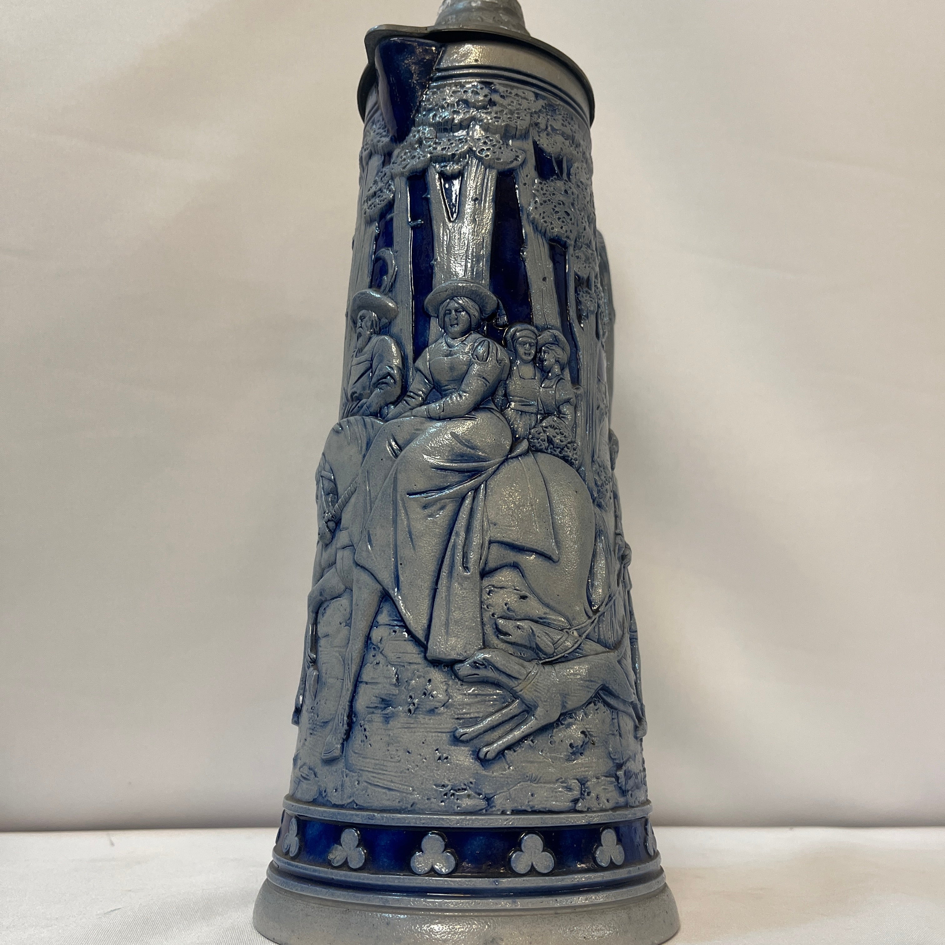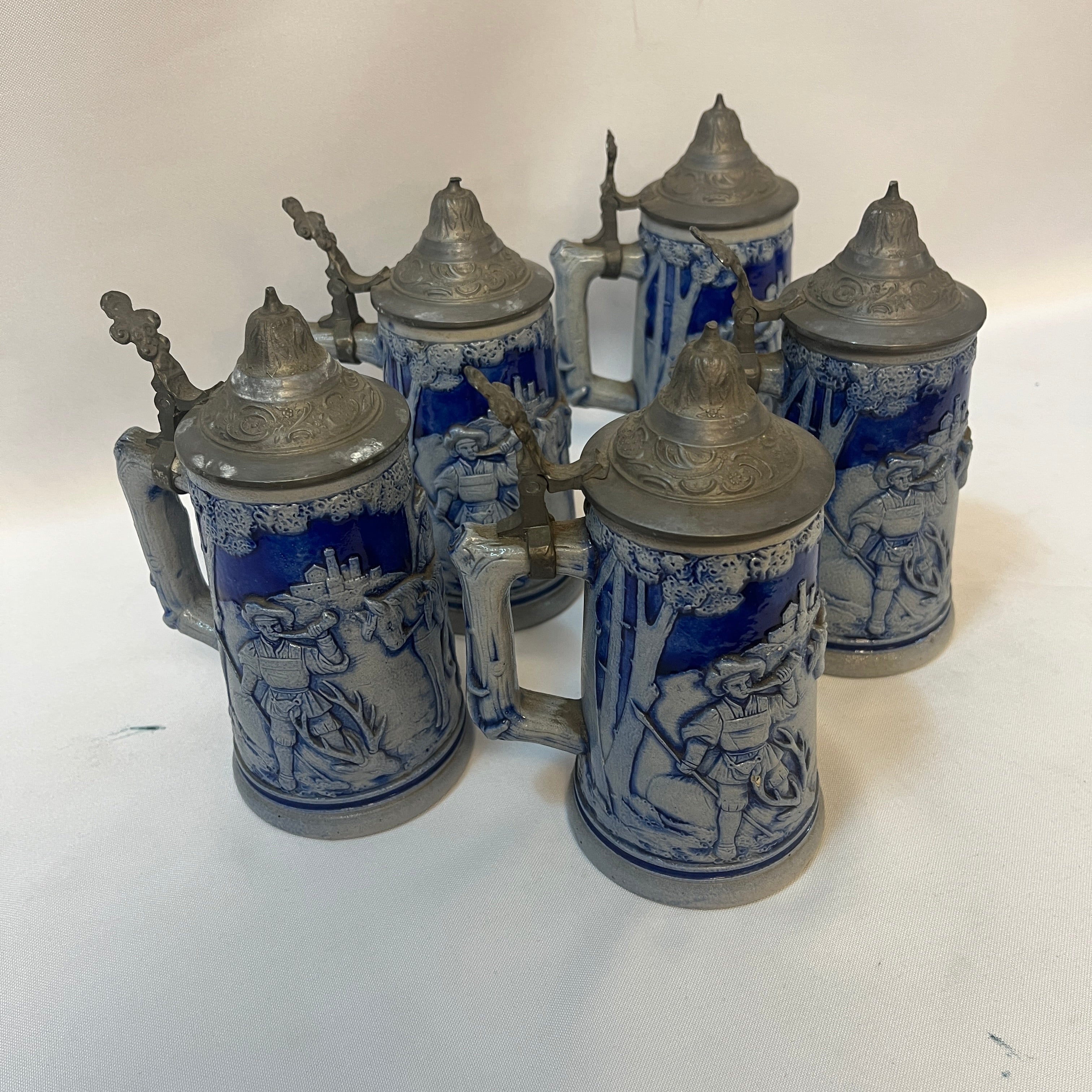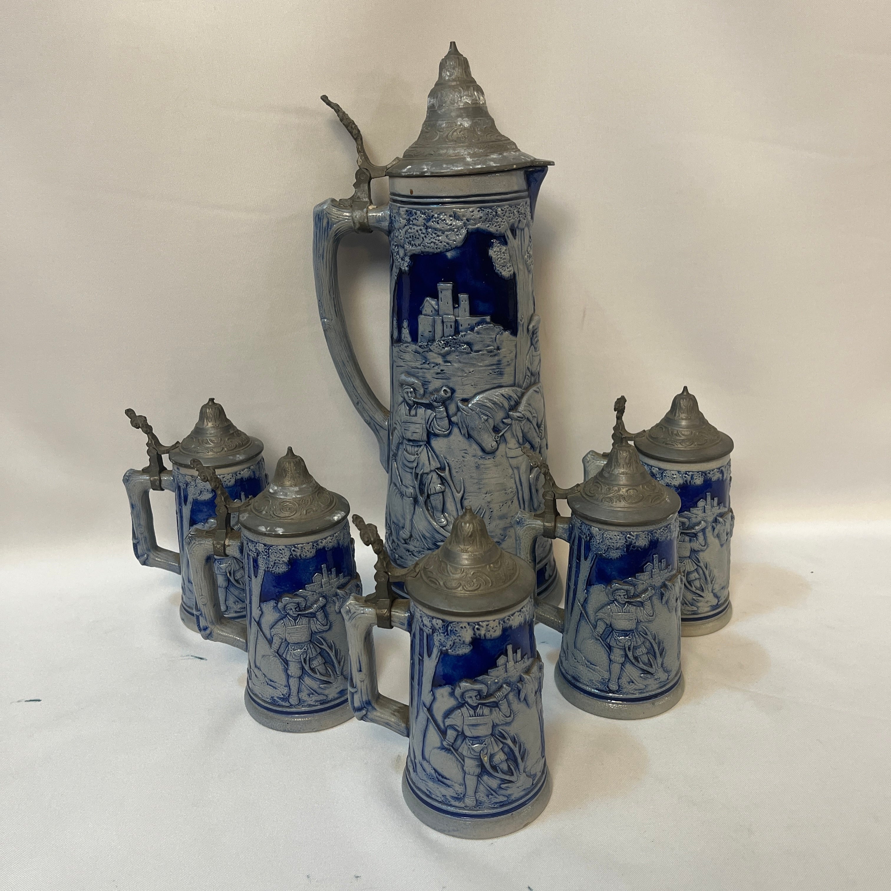 Tradicional conjunto alemán de jarras de cerveza, compuesto por una imponente jarra de gran formato con capacidad de 2 litros, acompañada por cinco jarras individuales más pequeñas de 250 ml. Las piezas están elaboradas en cerámica de gres, con un elegante acabado en azul cobalto que resalta los detalles decorativos, los cuerpos presentan escenas de la vida cotidiana modeladas en alto relieve. Cada jarra incorpora tapa abatible de peltre ornamentado.